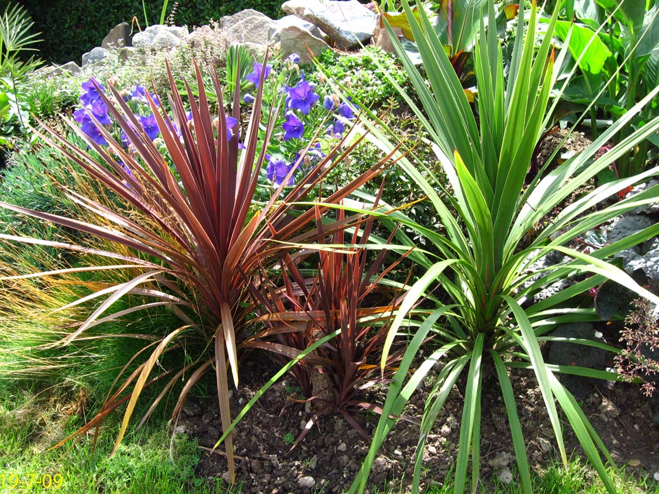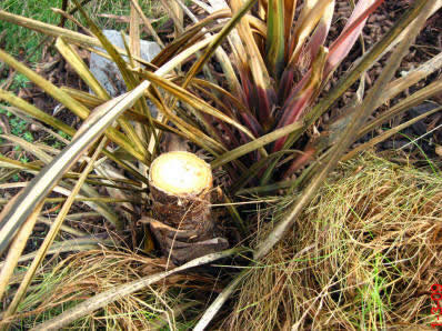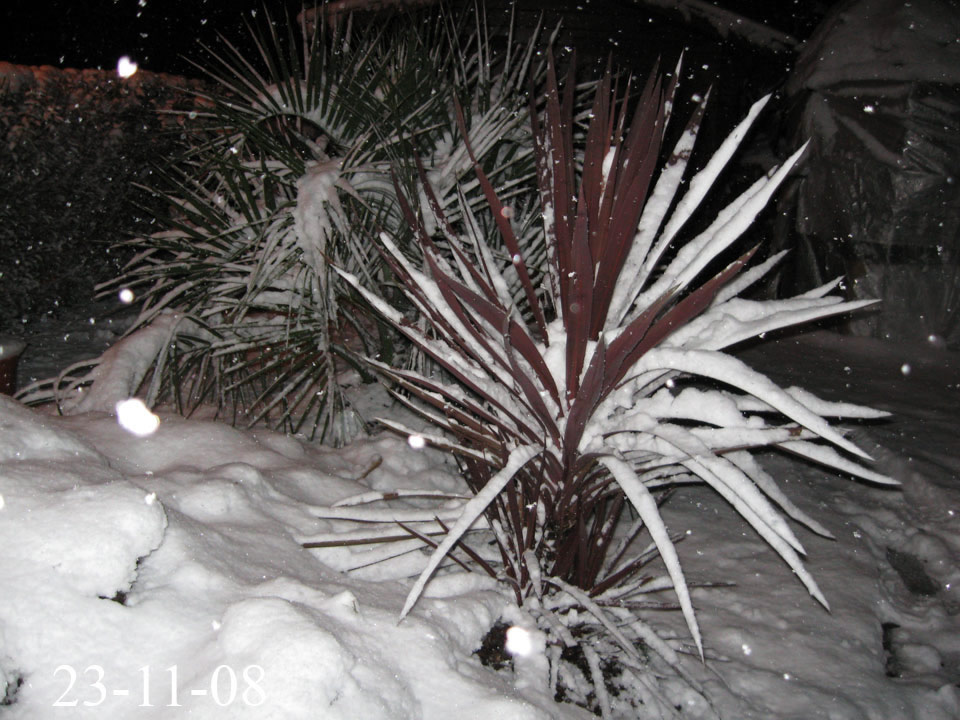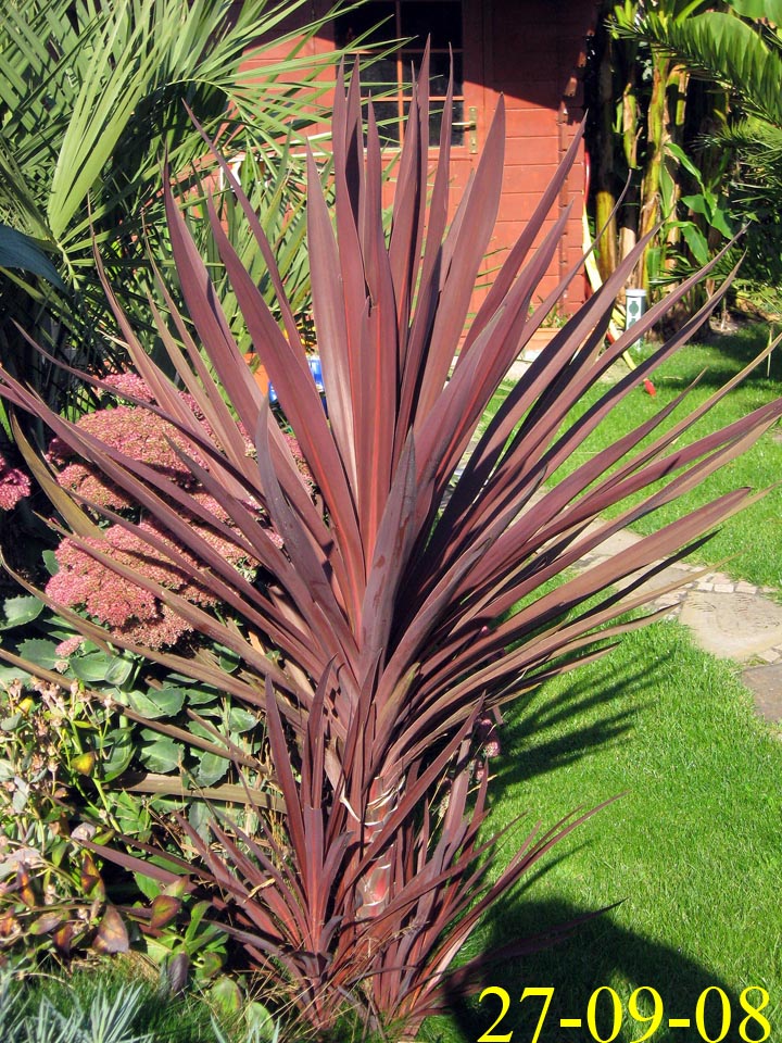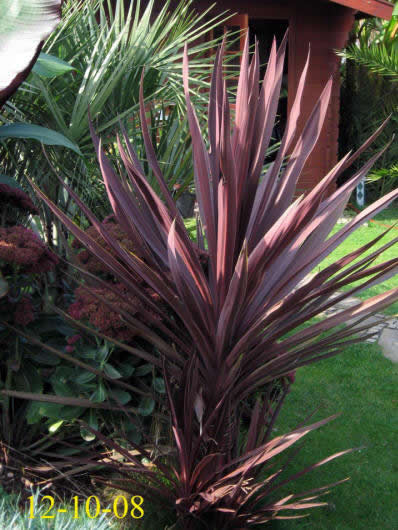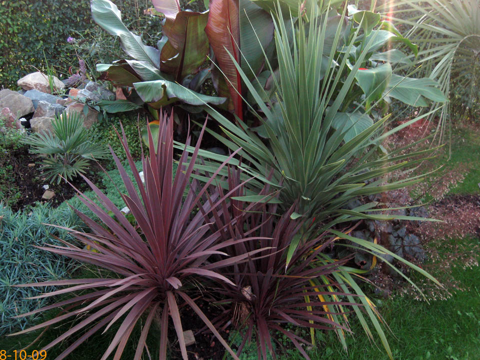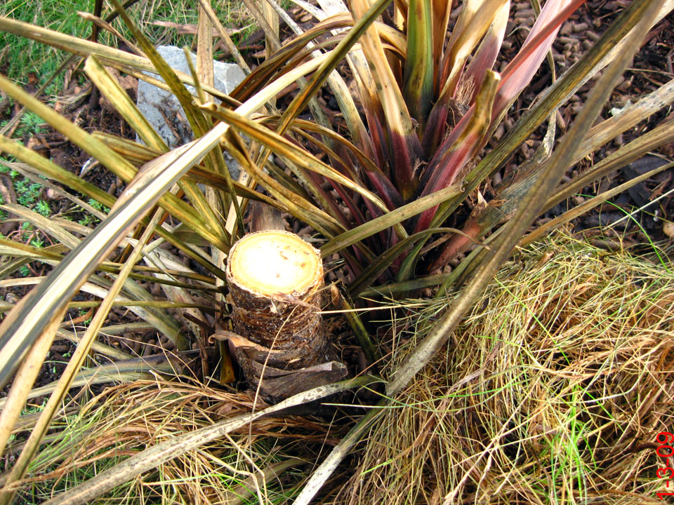 CordylineCordyline australis "Red Star" (Rote Keulenlilie)diese rote Form der Keulenlilie stammt aus Neuseeland und ist völlig unproblematisch zu halten. In Neuseeland gibt es mehrere hundert Jahre alte Exemplare, die gigantische Ausmaße annehmen können. Ihre Winterhärte liegt unterhalb der der grünen Cordyline und wird meist mit -5 bis -8°C angegeben.Hier ein Link zu Cordylines in Neuseeland: http://www.nzplantpics.com/sfeature_galleries/cordyline_gallery.htm Meine Cordyline australis "Red star" habe ich im Frühjahr 2007 in Holland für sage und schreibe 3€ gekauft und gleich im Garten ausgepflanzt, obwohl ich natürlich schon wusste, dass dies ein gewisses Risiko darstellen würde, da sie doch um einiges weniger Frost vertragen sollte, als z.B. die grüne Cordyline. Dennoch dachte ich mir, zu diesem Preis könne man das ruhig probieren... So habe ich sie nicht einmal im ersten Winter geschützt, obwohl die Blätter zum Teil sicher aus einem Gewächshaus stammten. Lediglich in den kältesten Nächten (kurzzeitig -9°C in den Morgenstunden) habe ich sie mit einem Vlies umwickelt, Nächte mit -4 bis -5°C musste sie ohne Schutz überstehen und hat das auch blendend geschafft, lediglich einige Risse in den Blättern waren zu sehen. Im Frühjahr 2008 habe ich sie einmalig mit Auxin gegossen, worauf sie prompt mit vielen kleinen Ablegern reagierte. Den Winter 2008/2009 hat die Cordyline leider nicht überstanden, da sie bei Temperaturen bis -16,5°C und mehreren Tagen Dauerfrost im zweistelligen Minusbereich lediglich in ein Vlies eingewickelt war. Mal sehen ob sie im Frühjahr noch einmal austreibt, aber ich denke, die Chancen stehen nicht gut. Da ich mir die Stummel nicht länger ansehen wollte habe ich neue Cordies neben den alten gepflanzt. So haben die erfrorenen Cordies weiter die Chance neu auszutreiben... Und siehe da, Anfang Mai zeigt sich an der roten Cordyline wieder Leben. Mehrere Triebe sind zu sehen... Die rote Cordyline wurde gleichzeitig in gleicher Größe mit der grünen Cordyline gepflanzt, wollte aber nicht so recht wachsen. Nun weiß ich auch warum, allerdings nicht wie es dazu kam..., bemerkt habe ich es erst jetzt, weil der Stamm unter Bärenfellgras normalerweise nicht zu sehen ist. 2010Im Winter 09/10 wurden die Cordies dick gemulcht und per Vlies geschützt. Als Beheizung diente etwa ein halber Lichtschlauch, der am UT-100 der Butia angeschlossen war, die ab -6°C beheizt wurde. Als es unter -10°C kalt wurde, habe ich zusätzlich eine Gewebeplane über das Vlies geworfen. Resultat ist, dass die rote Cordy auch dieses Jahr wieder bodeneben zurückgefroren ist- mein Fazit: Rote Cordies sind nur mit einem beheizten Vollschutz zu überwintern. Mehr als -6°C sollte man ihr bei länger anhaltenden Kaltphasen nicht zumuten. Dennoch entpuppen sich die Cordies (sowohl red wie auch green) als Stehaufmännchen. Auch dieses Jahr treiben sie wieder aus. Da sie aber auf diese Weise nur vor sich hindümpeln, habe ich die Auspflanzung von Cordyline erst einmal auf Eis gelegt bis ich einen geeigneteren Standort zur Verfügung habe. 4.10.12 - Im Sommer 2011 habe ich dann mein Braheabeet neu gestaltet und dadurch wurde dann ein Plätzchen für einen neuen Versuch mit der roten Corsy frei. An dieser Stelle wird das komplette Beet im Winter geschützt, da dort die Brahea, eine Parajubaea und zwei C. revoluta gepflanzt wurden. Also ein gutes Plätzchen für die rote Cordy. Die rote Cordy steht ein wenig im Schatten der Brahea und wächst deshalb nicht ganz so kräftig wie mein früheres Exemplar am Bachlauf. Nicht schlimm, von mir aus kann sie sich Zeit lassen... Winterschäden gab es bei Beheizung ab -4°C natürlich keine. Cordyline australis (green)20082009Die grüne Cordyline hat den Winter 2008/2009 nicht geschafft - wurde allerdings auch nicht geschützt. Vielleicht treibt sie ja wieder aus, aber auch hier mache ich mir keine großen Hoffnungen. 2010Auch die grüne Cordyline hat den langen Winter 09/10 wieder nicht geschafft. Zunächst sah sie noch ganz gut aus, später knickte die Spitze ein und man konnte die Neutriebe aus dem Wachstumszentrum herausziehen. Ich denke allerdings, dass sie sich wieder erholen wird. 5.10.12 - Die grüne Cory hat einige Seitentriebe gebildet und führt nun seit 2010 ein Schattendasein hinter der Butia. Ich hatte sie dort so gepflanzt, dass sie gerade eben noch mit in den Winterschutz der Butia passt, andererseits aber dort recht unauffällig bleibt bis sie wieder einigermaßen aussieht. Die Regeneration dauert nun bereits recht lange, aber immerhin, sie wächst und sieht zumindest immer besser aus.