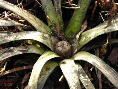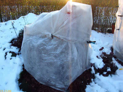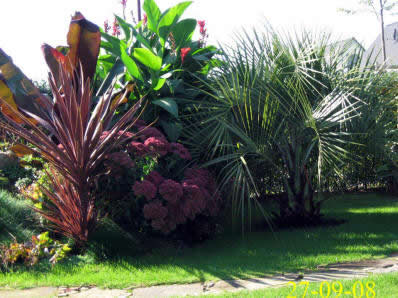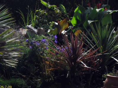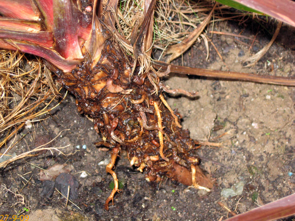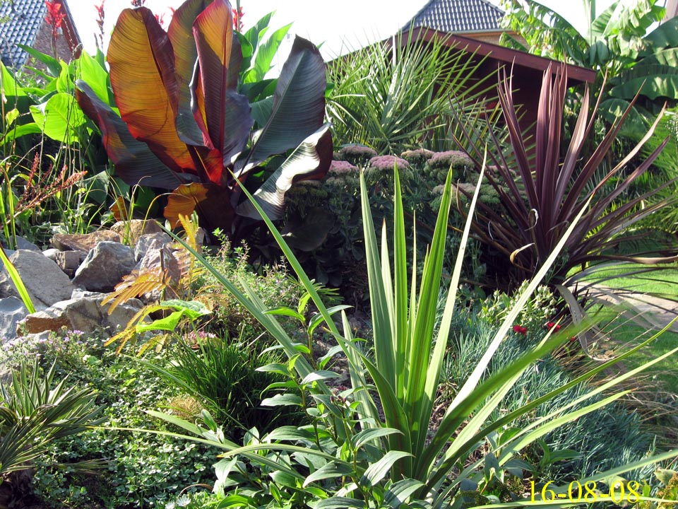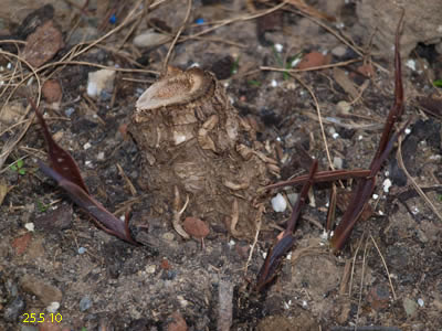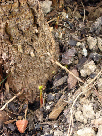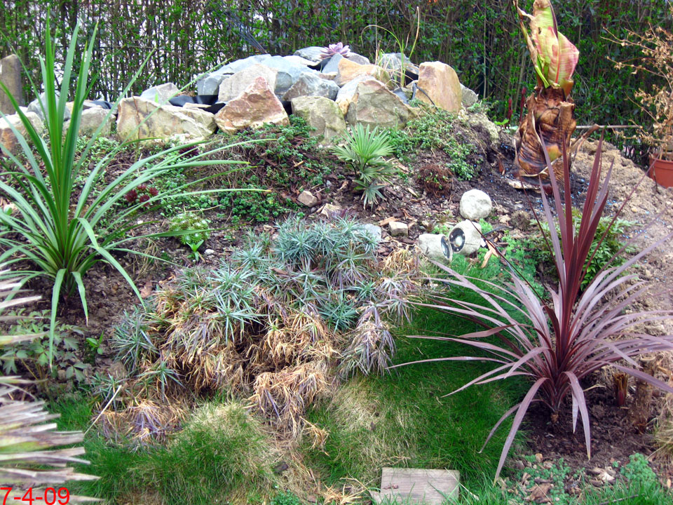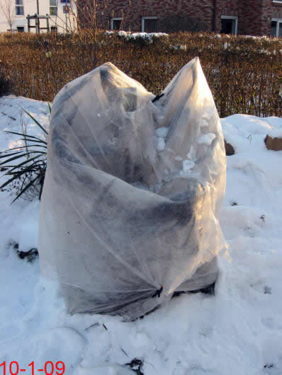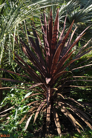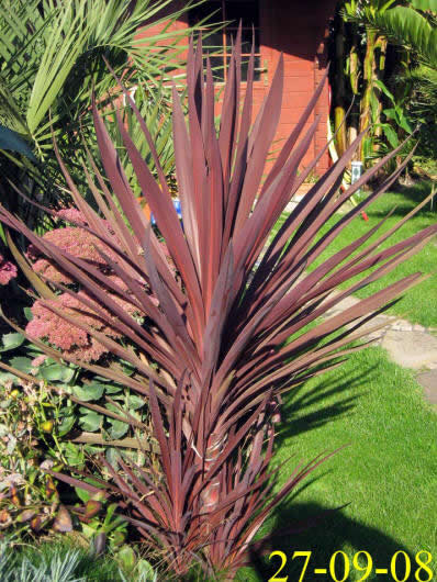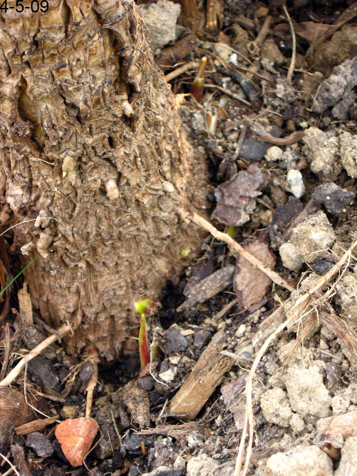 CordylineCordyline australis "Red Star" (Rote Keulenlilie)diese rote Form der Keulenlilie stammt aus Neuseeland und ist völlig unproblematisch zu halten. In Neuseeland gibt es mehrere hundert Jahre alte Exemplare, die gigantische Ausmaße annehmen können. Ihre Winterhärte liegt unterhalb der der grünen Cordyline und wird meist mit -5 bis -8°C angegeben.Hier ein Link zu Cordylines in Neuseeland: http://www.nzplantpics.com/sfeature_galleries/cordyline_gallery.htm Meine Cordyline australis "Red star" habe ich im Frühjahr 2007 in Holland für sage und schreibe 3€ gekauft und gleich im Garten ausgepflanzt, obwohl ich natürlich schon wusste, dass dies ein gewisses Risiko darstellen würde, da sie doch um einiges weniger Frost vertragen sollte, als z.B. die grüne Cordyline. Dennoch dachte ich mir, zu diesem Preis könne man das ruhig probieren... So habe ich sie nicht einmal im ersten Winter geschützt, obwohl die Blätter zum Teil sicher aus einem Gewächshaus stammten. Lediglich in den kältesten Nächten (kurzzeitig -9°C in den Morgenstunden) habe ich sie mit einem Vlies umwickelt, Nächte mit -4 bis -5°C musste sie ohne Schutz überstehen und hat das auch blendend geschafft, lediglich einige Risse in den Blättern waren zu sehen. Im Frühjahr 2008 habe ich sie einmalig mit Auxin gegossen, worauf sie prompt mit vielen kleinen Ablegern reagierte. Den Winter 2008/2009 hat die Cordyline leider nicht überstanden, da sie bei Temperaturen bis -16,5°C und mehreren Tagen Dauerfrost im zweistelligen Minusbereich lediglich in ein Vlies eingewickelt war. Mal sehen ob sie im Frühjahr noch einmal austreibt, aber ich denke, die Chancen stehen nicht gut. Da ich mir die Stummel nicht länger ansehen wollte habe ich neue Cordies neben den alten gepflanzt. So haben die erfrorenen Cordies weiter die Chance neu auszutreiben... Und siehe da, Anfang Mai zeigt sich an der roten Cordyline wieder Leben. Mehrere Triebe sind zu sehen... Die rote Cordyline wurde gleichzeitig in gleicher Größe mit der grünen Cordyline gepflanzt, wollte aber nicht so recht wachsen. Nun weiß ich auch warum, allerdings nicht wie es dazu kam..., bemerkt habe ich es erst jetzt, weil der Stamm unter Bärenfellgras normalerweise nicht zu sehen ist. 2010Im Winter 09/10 wurden die Cordies dick gemulcht und per Vlies geschützt. Als Beheizung diente etwa ein halber Lichtschlauch, der am UT-100 der Butia angeschlossen war, die ab -6°C beheizt wurde. Als es unter -10°C kalt wurde, habe ich zusätzlich eine Gewebeplane über das Vlies geworfen. Resultat ist, dass die rote Cordy auch dieses Jahr wieder bodeneben zurückgefroren ist- mein Fazit: Rote Cordies sind nur mit einem beheizten Vollschutz zu überwintern. Mehr als -6°C sollte man ihr bei länger anhaltenden Kaltphasen nicht zumuten. Dennoch entpuppen sich die Cordies (sowohl red wie auch green) als Stehaufmännchen. Auch dieses Jahr treiben sie wieder aus. Da sie aber auf diese Weise nur vor sich hindümpeln, habe ich die Auspflanzung von Cordyline erst einmal auf Eis gelegt bis ich einen geeigneteren Standort zur Verfügung habe. 4.10.12 - Im Sommer 2011 habe ich dann mein Braheabeet neu gestaltet und dadurch wurde dann ein Plätzchen für einen neuen Versuch mit der roten Corsy frei. An dieser Stelle wird das komplette Beet im Winter geschützt, da dort die Brahea, eine Parajubaea und zwei C. revoluta gepflanzt wurden. Also ein gutes Plätzchen für die rote Cordy. Die rote Cordy steht ein wenig im Schatten der Brahea und wächst deshalb nicht ganz so kräftig wie mein früheres Exemplar am Bachlauf. Nicht schlimm, von mir aus kann sie sich Zeit lassen... Winterschäden gab es bei Beheizung ab -4°C natürlich keine. Cordyline australis (green)20082009Die grüne Cordyline hat den Winter 2008/2009 nicht geschafft - wurde allerdings auch nicht geschützt. Vielleicht treibt sie ja wieder aus, aber auch hier mache ich mir keine großen Hoffnungen. 2010Auch die grüne Cordyline hat den langen Winter 09/10 wieder nicht geschafft. Zunächst sah sie noch ganz gut aus, später knickte die Spitze ein und man konnte die Neutriebe aus dem Wachstumszentrum herausziehen. Ich denke allerdings, dass sie sich wieder erholen wird. 5.10.12 - Die grüne Cory hat einige Seitentriebe gebildet und führt nun seit 2010 ein Schattendasein hinter der Butia. Ich hatte sie dort so gepflanzt, dass sie gerade eben noch mit in den Winterschutz der Butia passt, andererseits aber dort recht unauffällig bleibt bis sie wieder einigermaßen aussieht. Die Regeneration dauert nun bereits recht lange, aber immerhin, sie wächst und sieht zumindest immer besser aus.
