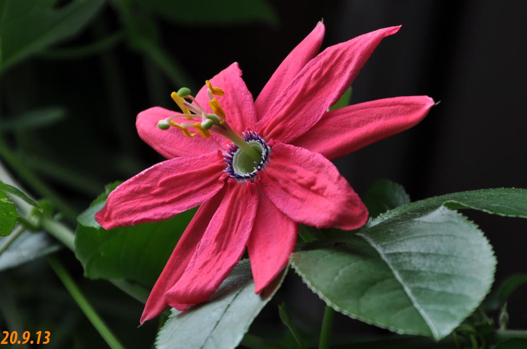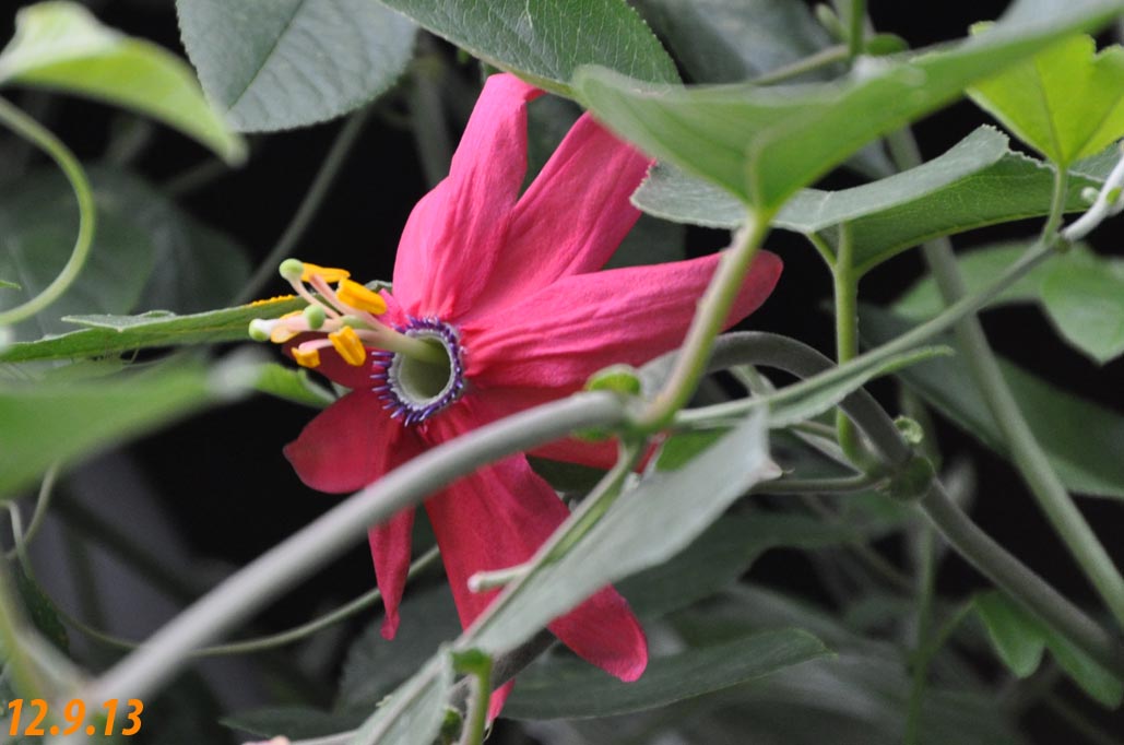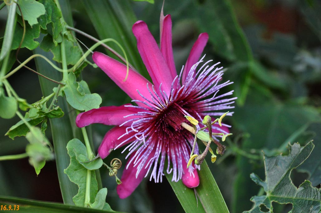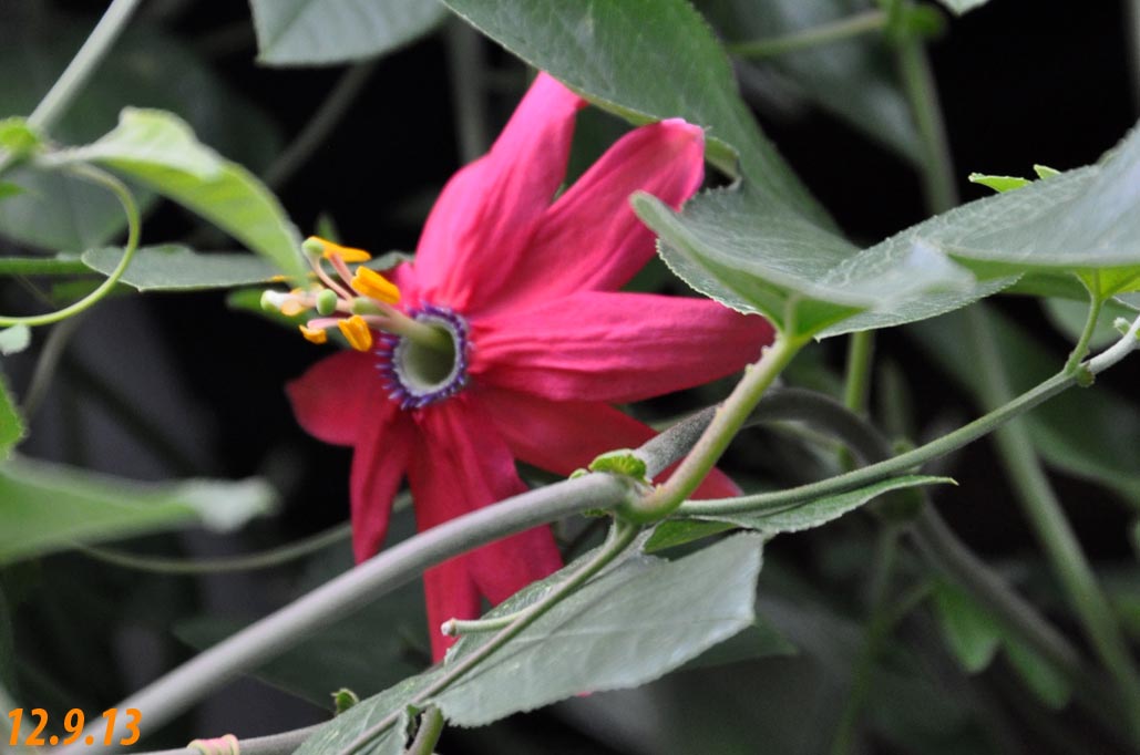 Passiflora "Amethyst"Hierbei handelt es sich um eine Kreuzung aus P. caerulea und P. kermesina. Sie liebt einen sonnigen, warmen Standort und ist sehr wuchs- und blühfreudig. Überwintert wird sie bei 5-10°C, toleriert aber auch kurzzeitig leichten Frost und kann deshalb lange draußen im Freien bleiben. Passiflora manicataSie stammt aus Hochlagen von Venezuela, Kolumbien, Ecuador und Peru, wo sie in Höhen zwischen 2500-3000m wächst. Sie soll schattige, aber durchaus warme Standorte bevorzugen. Leider ist sie äußerst schwierig zur Blüte zu bewegen - mir ist es bisher leider nicht gelungen. Die Pflanze wächst enorm und bildet unzählige Blätter und erreicht schwindelerregende Höhen - nur blühen will sie bisher nicht. 12.9.2013 Ich kann es nicht glauben. Im vierten Jahr - während alle übrigen Passifloras in diesem Jahr eher blühfaul sind - entschließt sich meine P. manicata trotz herbstlichem Wetter zu ihrer ersten Blüte. Wunderschön! Leider allerdings in luftigen Höhen, nahe der Regenrinne am Hausdach, weshalb die Fotos auch nicht so sehr gelungen sind.