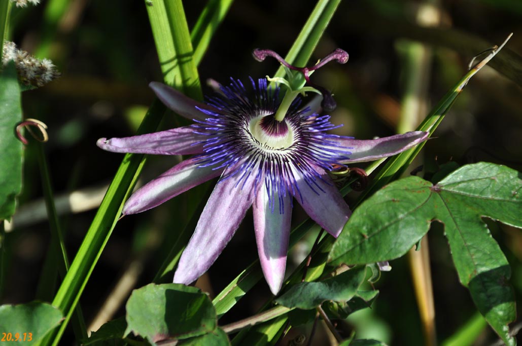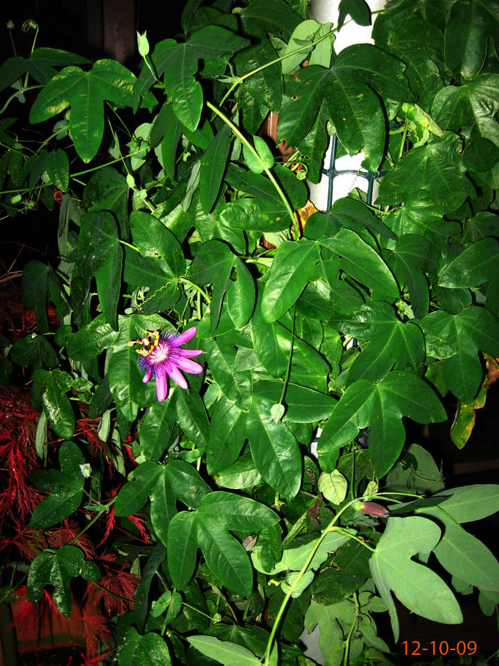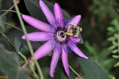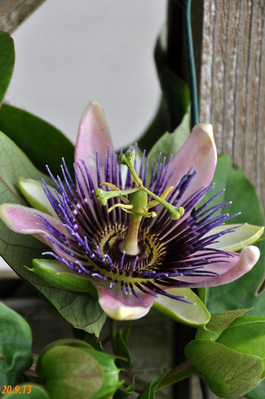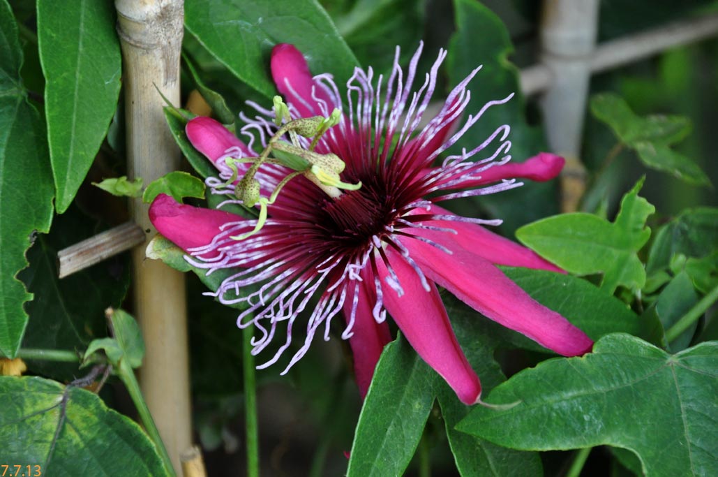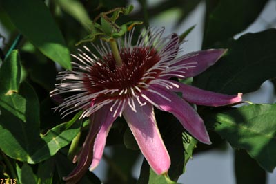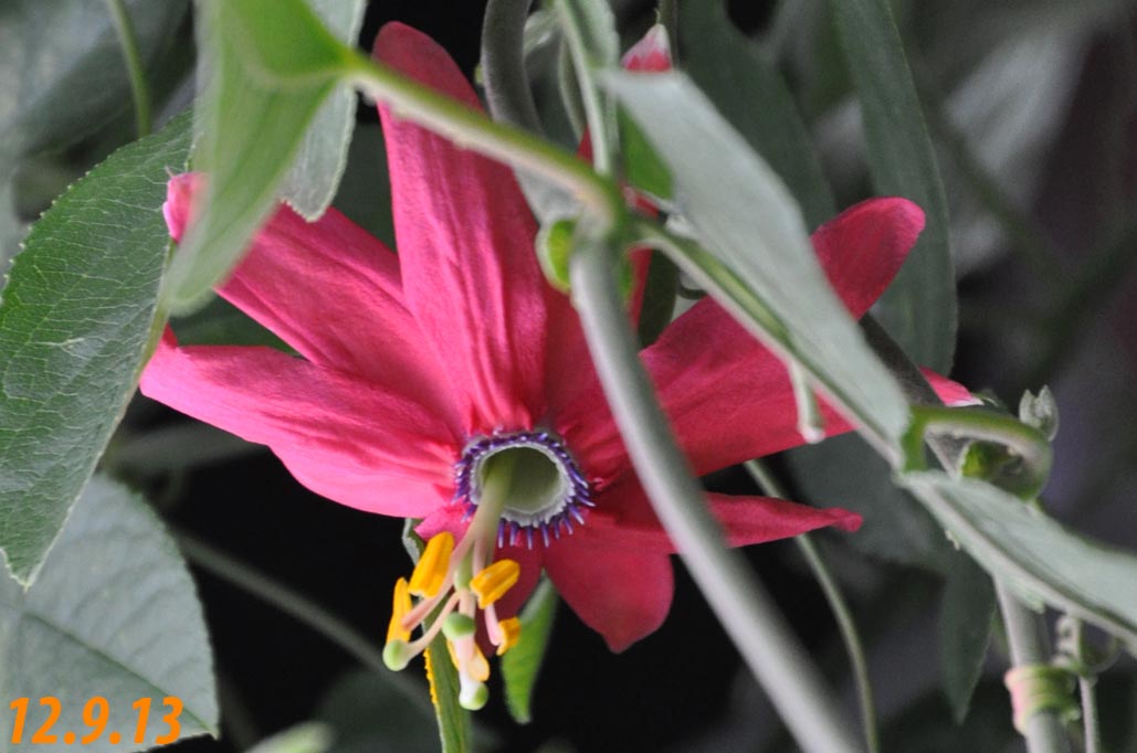 Passiflora "Amethyst"Hierbei handelt es sich um eine Kreuzung aus P. caerulea und P. kermesina. Sie liebt einen sonnigen, warmen Standort und ist sehr wuchs- und blühfreudig. Überwintert wird sie bei 5-10°C, toleriert aber auch kurzzeitig leichten Frost und kann deshalb lange draußen im Freien bleiben. Passiflora manicataSie stammt aus Hochlagen von Venezuela, Kolumbien, Ecuador und Peru, wo sie in Höhen zwischen 2500-3000m wächst. Sie soll schattige, aber durchaus warme Standorte bevorzugen. Leider ist sie äußerst schwierig zur Blüte zu bewegen - mir ist es bisher leider nicht gelungen. Die Pflanze wächst enorm und bildet unzählige Blätter und erreicht schwindelerregende Höhen - nur blühen will sie bisher nicht. 12.9.2013 Ich kann es nicht glauben. Im vierten Jahr - während alle übrigen Passifloras in diesem Jahr eher blühfaul sind - entschließt sich meine P. manicata trotz herbstlichem Wetter zu ihrer ersten Blüte. Wunderschön! Leider allerdings in luftigen Höhen, nahe der Regenrinne am Hausdach, weshalb die Fotos auch nicht so sehr gelungen sind.