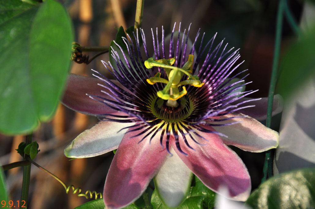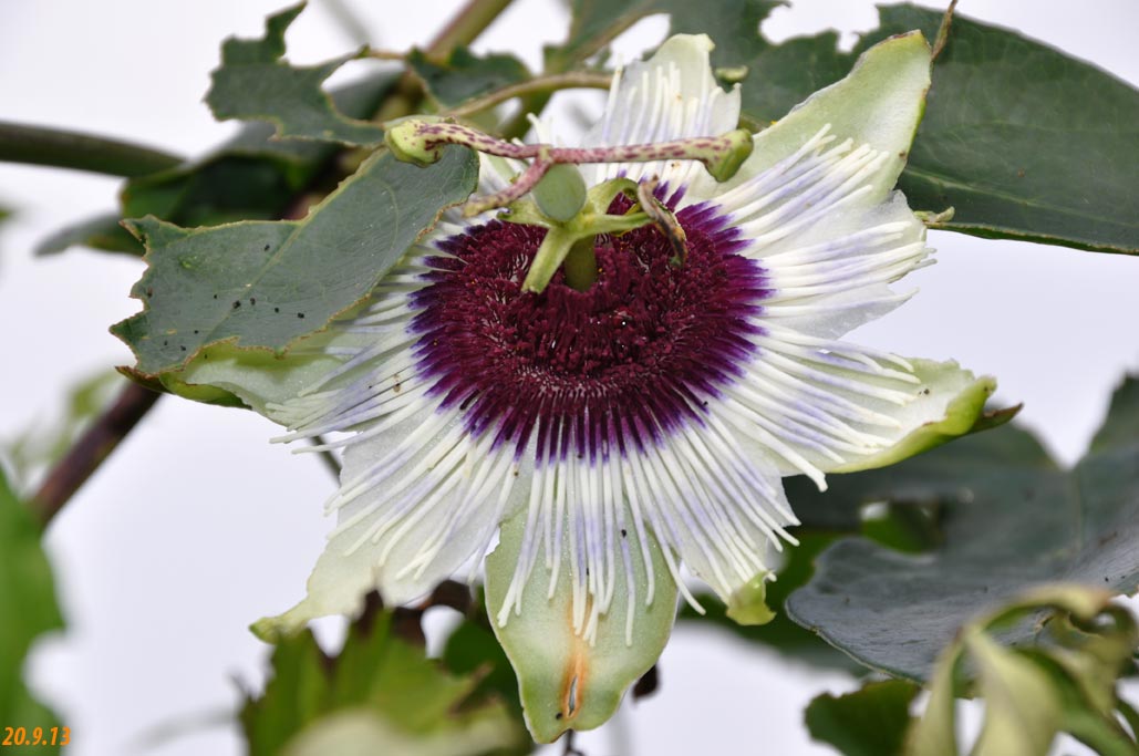 Passiflora "Empress Eugenie"Für diese pflegeleichte Passiflora gelten die üblichen Pflegebedingungen. Auch sie sollte bei 5-10°C überwintert werden, kurzfristiger leichter Frost wird toleriert. Sie wächst sehr gut und ist sehr blühwillig. Passiflora "Panda"erste Blüte, leider von Grashüpfern zerfressen...