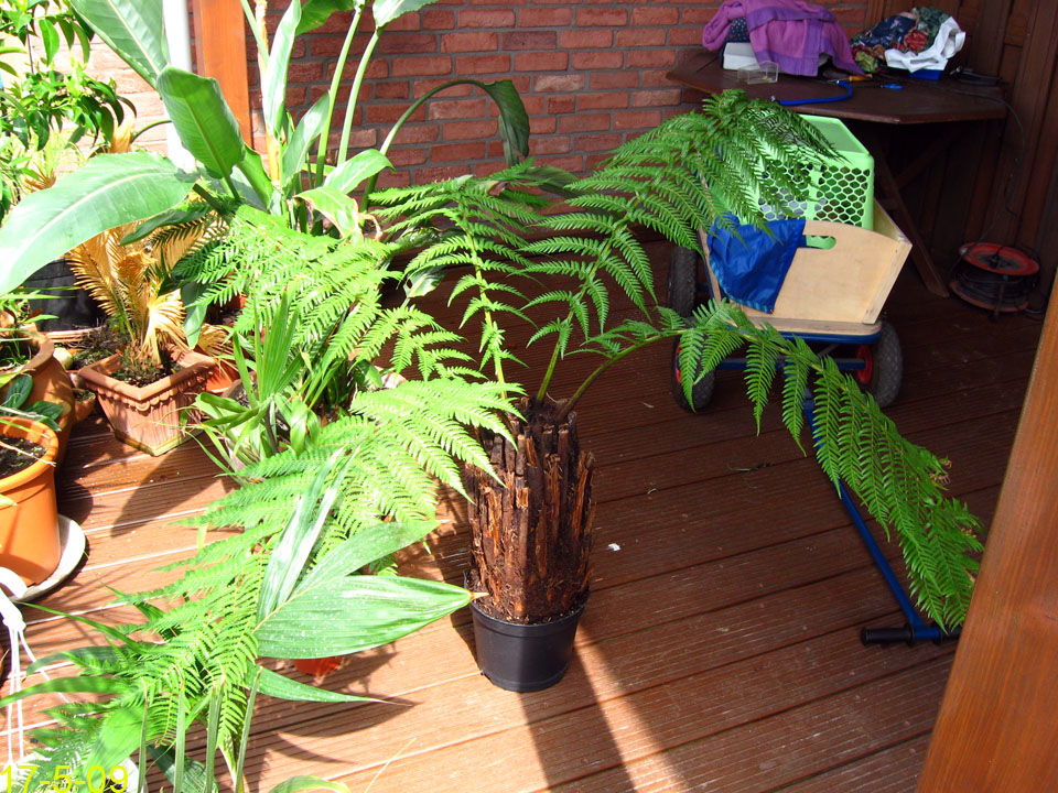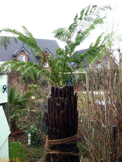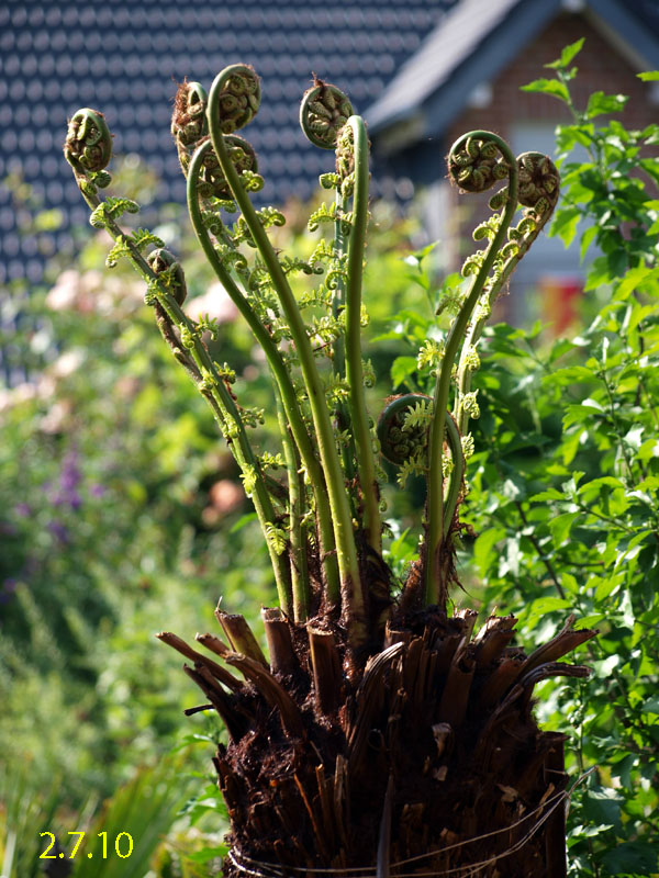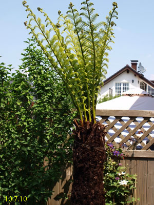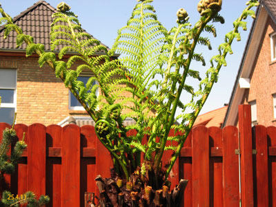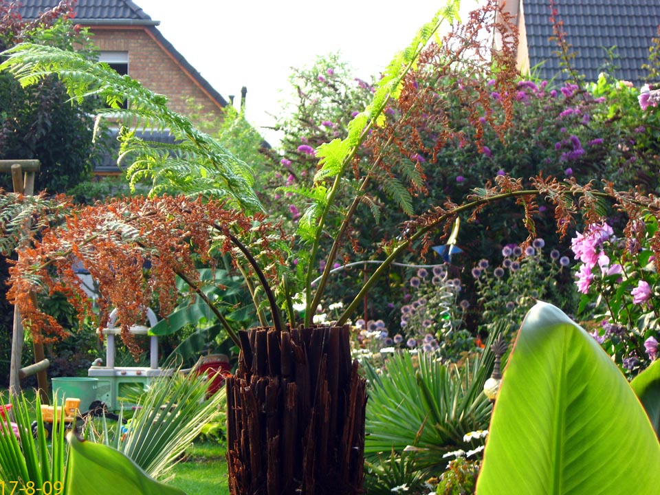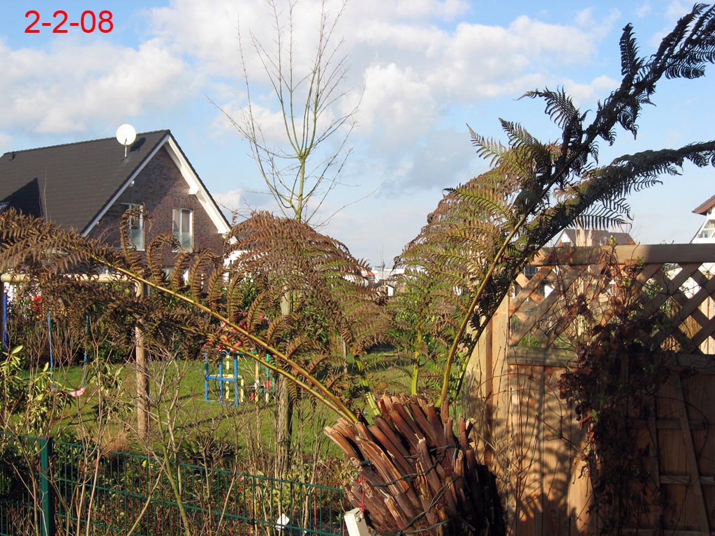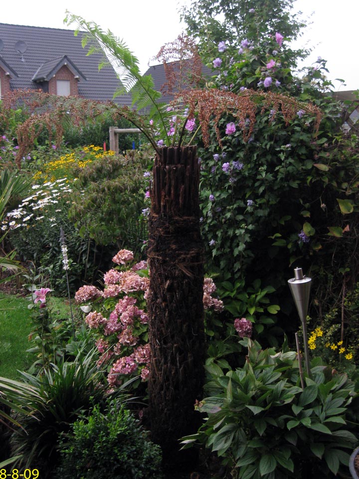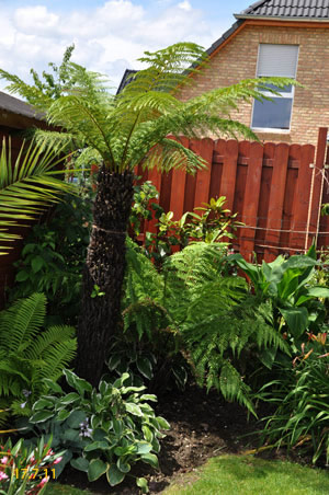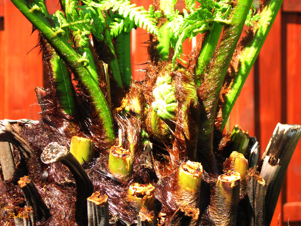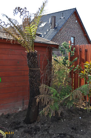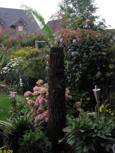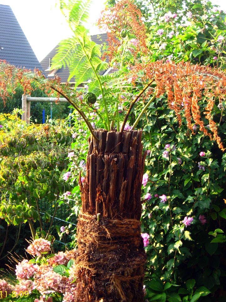 BAUMFARNDICKSONIA ANTARCTICAUrsprünglich stammt dieser Baumfarn aus ostaustralischen Bergwäldern, Tasmanien und einigen subantarktischen Inseln. In der Natur kann er 6m Stammhöhe erreichen und eine aus bis zu 60 Wedeln bestehende Krone bilden. Die Blattwedel können es dabei auf eine Länge von 4m schaffen. Das Stammwachstum ist eher gering und erreicht kaum mehr als max. 5cm pro Jahr, dabei kann der Stamm aber einen Durchmesser von 40cm erreichen. Der Stamm besteht zum großen Teil aus einem Wurzelgeflecht, welches maßgeblich an der Versorgung der Pflanze mit Wasser beteiligt ist. Baumfarne dürfen niemals austrocknen! (Die unterirdischen Wurzeln sind sehr hart und haben größtenteils Haltefunktion. Ob diese Wurzeln auch zur Versorgung des Farns beitragen ist nicht eindeutig geklärt. So werden manche Baumfarne sogar in Beton gegossen und überstehen selbst diesen völligen Einschluss der Wurzeln. Ich persönlich denke dennoch, dass die unterirdischen Wurzeln zumindest einen Teil zur Versorgung der Pflanze beitragen.) Nach meinen inzwischen gemachten Erfahrungen (siehe weiter unten) muss ich den vorigen Abschnitt revidieren! Inzwischen bin ich überzeugt, dass die Aussage "Bodenwurzeln hätten nur Haltefunktion" ein Märchen ist. Wie sich zeigt, kümmern Baumfarne ohne funktionierende Bodenwurzeln. Ich würde aus heutiger Sicht unbedingt empfehlen Baumfarne direkt im Garten auszupflanzen und im Winter notfalls zu beheizen (entgegen der weit verbreiteten Ansicht Baumfarne dürften nicht beheizt werden zeigte sich bei mir, dass eine leichte Beheizung völlig problemlos funktioniert). Baumfarne fühlen sich am wohlsten in schattigen bis halbschattigen Lagen mit ausreichend Feuchtigkeit und mäßigen Temperaturen. Da der Baumfarn niemals austrocknen darf, muss er regelmäßig gegossen werden, besonders wenn er zu sonnig steht. Am besten ist es, den Baumfarn komplett mit einem Gartenschlauch durchdringend abzuspritzen. Am einfachsten funktioniert das, wenn man zunächst den Stamm nur leicht befeuchtet und dann erst durchdringend abspritzt, da das Wasser zunächst abperlt. Ist der Stamm jedoch erstmal feucht, saugt er das Wasser gierig auf. Wenn es mal schnell gehen muss, gieße ich den Baumfarn auch mal per Gießkanne von oben in die Stammöffnung. Überschüssiges Wasser läuft dann am Stamm herab bis auf den Boden. Über den Nährstoffbedarf von Baumfarnen gibt es unterschiedliche Ansichten. Die einen sagen er komme ohne zusätzlichen Dünger aus, andere empfehlen ihn wie jede andere Grünpflanze auch zu düngen. Ich selbst dünge ihn regelmäßig, allerdings wie alle meine anderen Pflanzen auch eher sparsam. Dicksonia antarctica braucht keine hohen Temperaturen zum wachsen. Am wohlsten fühlt er sich bei Temperaturen um 20°C. Zur Frostverträglichkeit gibt es unterschiedliche Ansichten, meistens werden Werte um -10°C angegeben, allerdings erfrieren die Blätter in der Regel bereits bei Temperaturen um -5°C. 2007Meinen Baumfarn habe ich April 2007 gekauft und gleich ausgepflanzt, nachdem ich ihn zunächst ordentlich gewässert habe, indem ich den Stamm einfach in den Teich gelegt habe, so dass er sich ordentlich voll Wasser saugen konnte. Ende Mai zeigten sich dann die ersten "Röllchen" der künftigen Blätter, die sich dann auch rasch entrollten. Im ersten Jahr brachte er es dann auf 7 oder 8 Wedel. 2008Den Winter 2007/2008 hat der Baumfarn so gut wie ungeschützt draußen im Freien verbracht. Lediglich in einer besonders kalten Nacht hab ich ihn mit einem Winterschutzvlies abgedeckt. Bei Tiefsttemperaturen von -9°C verlor er zwar die Blätter, hat den Winter aber gut überstanden und im Frühjahr schnell einen Kranz neuer Blätter gebildet. Leider wurden dann durch einen Hagelschauer mehrere Wedel abgebrochen, die aber im Laufe des Sommers ersetzt wurden. 2009Die Kältephase Anfang 2009 dürfte ein echter Härtetest für den Baumfarn gewesen sein. -16,5°C in 2m gemessene Lufttemperatur musste er ertragen, während nur die Blätter in Vlies eingewickelt waren. Zusätzlich hatte ich den Stamm von oben zwischen den Blattstielen mit Rindenmulch abgedeckt. Erst nach zwei sehr kalten Nächten mit -15,4°C und -16,5°C wickelte ich einen Lichtschlauch zur Beheizung um den Stamm und wickelte ihn zusätzlich in eine Wolldecke. Sofort nach Beendigung der Frostphase habe ich den Stamm ausgiebig gegossen. Ich bin gespannt, ob der Baumfarn diese Tortour überstanden hat und im Frühjahr wieder austreibt.... Die Temperaturen die der Baumfarn ertragen mussten waren wohl zuviel des Guten. Da wo sich eigentlich nun langsam (Ende April) die neuen Röllchen der Blätter entwickeln sollten brodelt es. Innerhalb des Stammes scheint es zu faulen. Da hilft nur abwarten, ob er noch neue Blätter entwickelt, oder stirbt. Am Rand scheint noch ein Fünkchen Leben im Baumfarn zu stecken. In der Mitte ist es aber faulig und matschig. Mal sehen ob er noch ein paar Blätter schafft. Bin gespannt.... nach endlosem hin und her hab ich mich heute entschlossen meinem wintergeschädigten Baumfarn einen neuen "Kopf" aufzusetzen. Konnte mich ewig nicht entscheiden, ob ich dem Baumfarn weiterhin noch eine Chance gebe neu auszutreiben, ob ich ihm einen heimischen Farn, oder eben wieder eine D. antarctica aufsetze. Na, aber dieses Bild sah mir nicht so aus, als könne ich mir noch Hoffnung auf einen Austrieb machen. Seit Monaten faulte es nun in der Wachstumsöffnung, zwischenzeitlich warf der Farn regelrecht Blasen. Ich entschied mich nun doch wieder einen D. antarctica aufzusetzen. Leider sind dem zu diesem Zweck bereits vor einigen Monaten gekauften kleineren Baumfarn während meines Urlaubs sämtliche Blätter vertrocknet. Allerdings schiebt er aktuell drei neue Blätter, so das ich hoffe, dass er bald wieder okay ist. Da die Spize meines alten Baumfarns schon immer sehr schief gewachsen war, konnte ich dort den neuen kleineren Baumfarn nicht drauf befestigen, also sägte ich die Spitze ab. Tja, zu meinem Erstaun