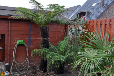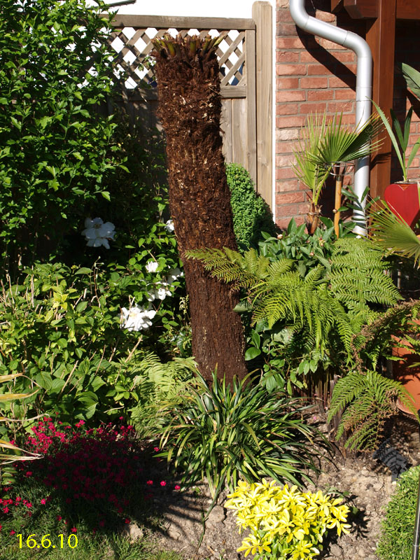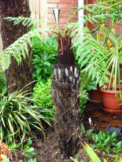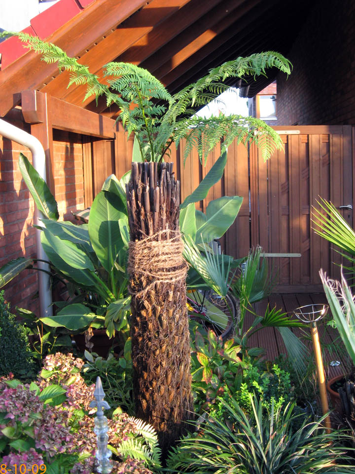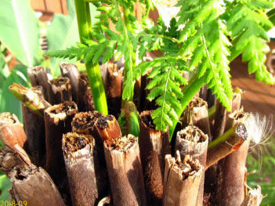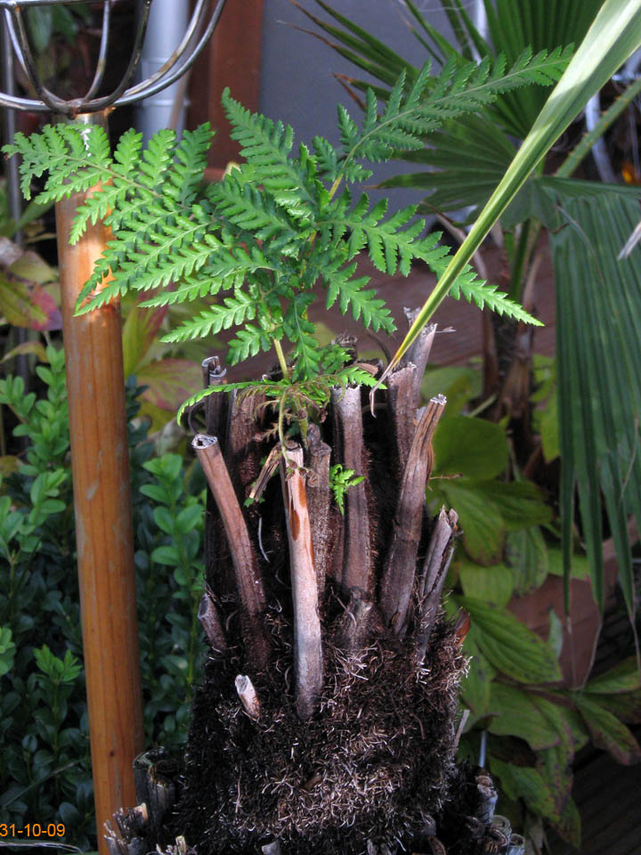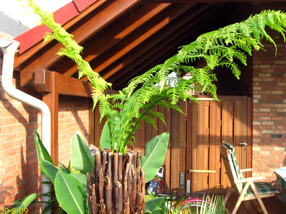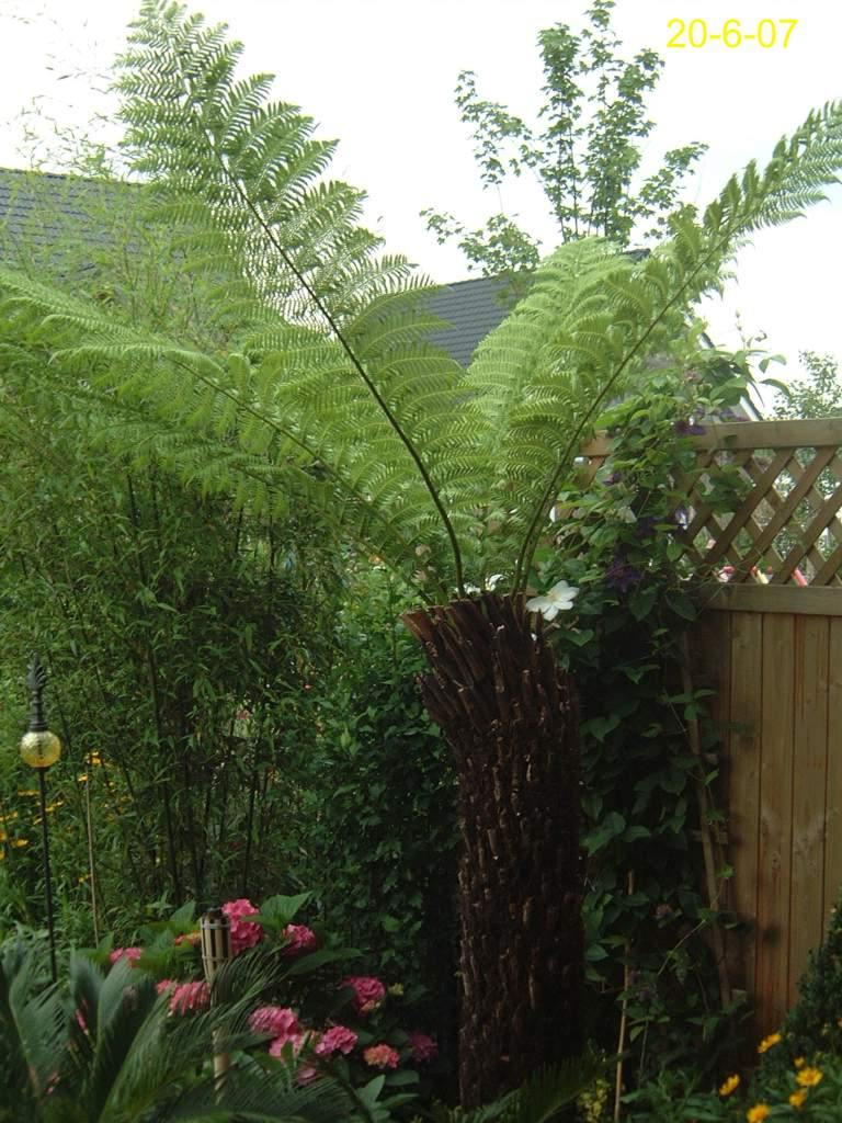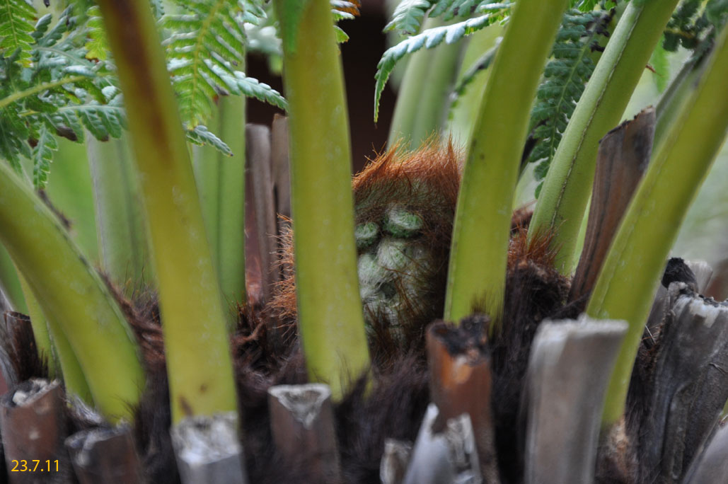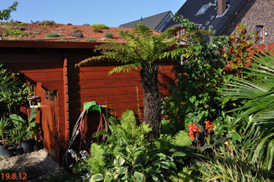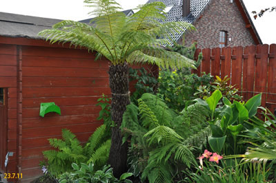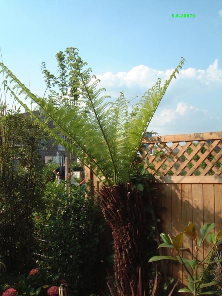 BAUMFARNDICKSONIA ANTARCTICAUrsprünglich stammt dieser Baumfarn aus ostaustralischen Bergwäldern, Tasmanien und einigen subantarktischen Inseln. In der Natur kann er 6m Stammhöhe erreichen und eine aus bis zu 60 Wedeln bestehende Krone bilden. Die Blattwedel können es dabei auf eine Länge von 4m schaffen. Das Stammwachstum ist eher gering und erreicht kaum mehr als max. 5cm pro Jahr, dabei kann der Stamm aber einen Durchmesser von 40cm erreichen. Der Stamm besteht zum großen Teil aus einem Wurzelgeflecht, welches maßgeblich an der Versorgung der Pflanze mit Wasser beteiligt ist. Baumfarne dürfen niemals austrocknen! (Die unterirdischen Wurzeln sind sehr hart und haben größtenteils Haltefunktion. Ob diese Wurzeln auch zur Versorgung des Farns beitragen ist nicht eindeutig geklärt. So werden manche Baumfarne sogar in Beton gegossen und überstehen selbst diesen völligen Einschluss der Wurzeln. Ich persönlich denke dennoch, dass die unterirdischen Wurzeln zumindest einen Teil zur Versorgung der Pflanze beitragen.) Nach meinen inzwischen gemachten Erfahrungen (siehe weiter unten) muss ich den vorigen Abschnitt revidieren! Inzwischen bin ich überzeugt, dass die Aussage "Bodenwurzeln hätten nur Haltefunktion" ein Märchen ist. Wie sich zeigt, kümmern Baumfarne ohne funktionierende Bodenwurzeln. Ich würde aus heutiger Sicht unbedingt empfehlen Baumfarne direkt im Garten auszupflanzen und im Winter notfalls zu beheizen (entgegen der weit verbreiteten Ansicht Baumfarne dürften nicht beheizt werden zeigte sich bei mir, dass eine leichte Beheizung völlig problemlos funktioniert). Baumfarne fühlen sich am wohlsten in schattigen bis halbschattigen Lagen mit ausreichend Feuchtigkeit und mäßigen Temperaturen. Da der Baumfarn niemals austrocknen darf, muss er regelmäßig gegossen werden, besonders wenn er zu sonnig steht. Am besten ist es, den Baumfarn komplett mit einem Gartenschlauch durchdringend abzuspritzen. Am einfachsten funktioniert das, wenn man zunächst den Stamm nur leicht befeuchtet und dann erst durchdringend abspritzt, da das Wasser zunächst abperlt. Ist der Stamm jedoch erstmal feucht, saugt er das Wasser gierig auf. Wenn es mal schnell gehen muss, gieße ich den Baumfarn auch mal per Gießkanne von oben in die Stammöffnung. Überschüssiges Wasser läuft dann am Stamm herab bis auf den Boden. Über den Nährstoffbedarf von Baumfarnen gibt es unterschiedliche Ansichten. Die einen sagen er komme ohne zusätzlichen Dünger aus, andere empfehlen ihn wie jede andere Grünpflanze auch zu düngen. Ich selbst dünge ihn regelmäßig, allerdings wie alle meine anderen Pflanzen auch eher sparsam. Dicksonia antarctica braucht keine hohen Temperaturen zum wachsen. Am wohlsten fühlt er sich bei Temperaturen um 20°C. Zur Frostverträglichkeit gibt es unterschiedliche Ansichten, meistens werden Werte um -10°C angegeben, allerdings erfrieren die Blätter in der Regel bereits bei Temperaturen um -5°C. 2007Meinen Baumfarn habe ich April 2007 gekauft und gleich ausgepflanzt, nachdem ich ihn zunächst ordentlich gewässert habe, indem ich den Stamm einfach in den Teich gelegt habe, so dass er sich ordentlich voll Wasser saugen konnte. Ende Mai zeigten sich dann die ersten "Röllchen" der künftigen Blätter, die sich dann auch rasch entrollten. Im ersten Jahr brachte er es dann auf 7 oder 8 Wedel. 2008Den Winter 2007/2008 hat der Baumfarn so gut wie ungeschützt draußen im Freien verbracht. Lediglich in einer besonders kalten Nacht hab ich ihn mit einem Winterschutzvlies abgedeckt. Bei Tiefsttemperaturen von -9°C verlor er zwar die Blätter, hat den Winter aber gut überstanden und im Frühjahr schnell einen Kranz neuer Blätter gebildet. Leider wurden dann durch einen Hagelschauer mehrere Wedel abgebrochen, die aber im Laufe des Sommers ersetzt wurden. 2009Die Kältephase Anfang 2009 dürfte ein echter Härtetest für den Baumfarn gewesen sein. -16,5°C in 2m gemessene Lufttemperatur musste er ertragen, während nur die Blätter in Vlies eingewickelt waren. Zusätzlich hatte ich den Stamm von oben zwischen den Blattstielen mit Rindenmulch abgedeckt. Erst nach zwei sehr kalten Nächten mit -15,4°C und -16,5°C wickelte ich einen Lichtschlauch zur Beheizung um den Stamm und wickelte ihn zusätzlich in eine Wolldecke. Sofort nach Beendigung der Frostphase habe ich den Stamm ausgiebig gegossen. Ich bin gespannt, ob der Baumfarn diese Tortour überstanden hat und im Frühjahr wieder austreibt.... Die Temperaturen die der Baumfarn ertragen mussten waren wohl zuviel des Guten. Da wo sich eigentlich nun langsam (Ende April) die neuen Röllchen der Blätter entwickeln sollten brodelt es. Innerhalb des Stammes scheint es zu faulen. Da hilft nur abwarten, ob er noch neue Blätter entwickelt, oder stirbt. Am Rand scheint noch ein Fünkchen Leben im Baumfarn zu stecken. In der Mitte ist es aber faulig und matschig. Mal sehen ob er noch ein paar Blätter schafft. Bin gespannt.... nach endlosem hin und her hab ich mich heute entschlossen meinem wintergeschädigten Baumfarn einen neuen "Kopf" aufzusetzen. Konnte mich ewig nicht entscheiden, ob ich dem Baumfarn weiterhin noch eine Chance gebe neu auszutreiben, ob ich ihm einen heimischen Farn, oder eben wieder eine D. antarctica aufsetze. Na, aber dieses Bild sah mir nicht so aus, als könne ich mir noch Hoffnung auf einen Austrieb machen. Seit Monaten faulte es nun in der Wachstumsöffnung, zwischenzeitlich warf der Farn regelrecht Blasen. Ich entschied mich nun doch wieder einen D. antarctica aufzusetzen. Leider sind dem zu diesem Zweck bereits vor einigen Monaten gekauften kleineren Baumfarn während meines Urlaubs sämtliche Blätter vertrocknet. Allerdings schiebt er aktuell drei neue Blätter, so das ich hoffe, dass er bald wieder okay ist. Da die Spize meines alten Baumfarns schon immer sehr schief gewachsen war, konnte ich dort den neuen kleineren Baumfarn nicht drauf befestigen, also sägte ich die Spitze ab. Tja, zu meinem Erstaun