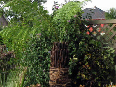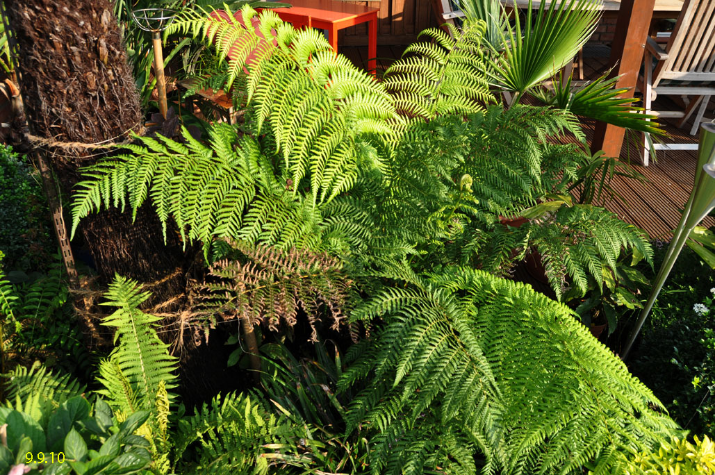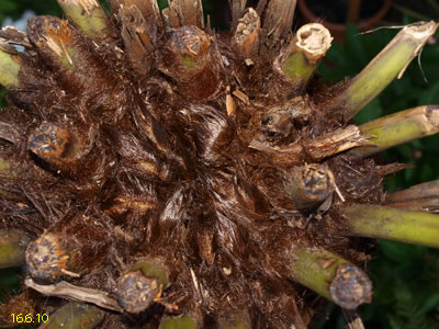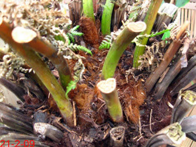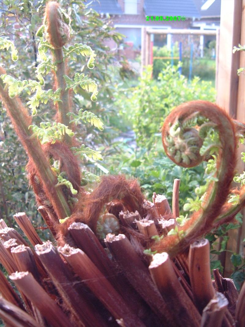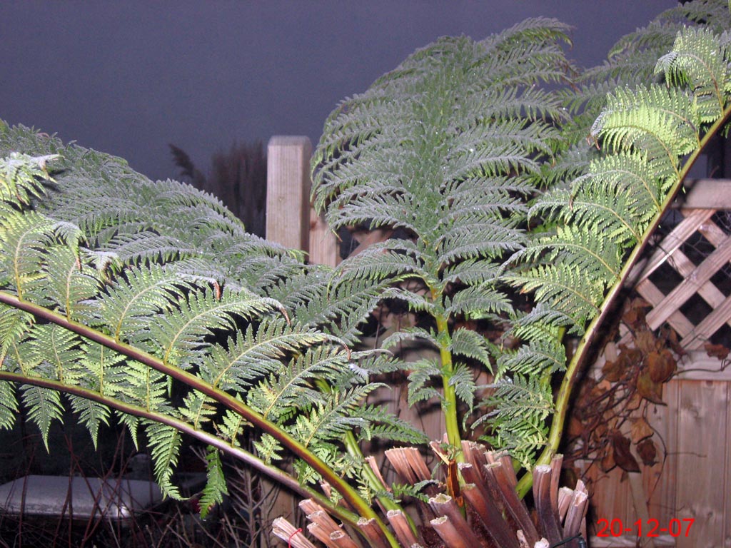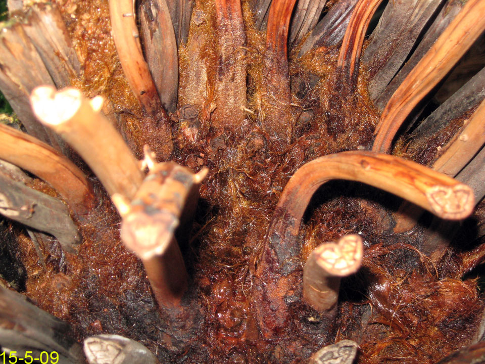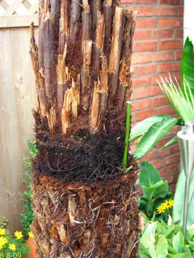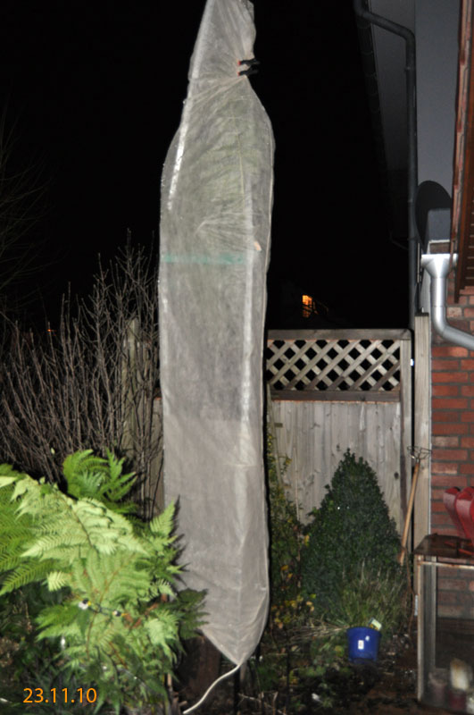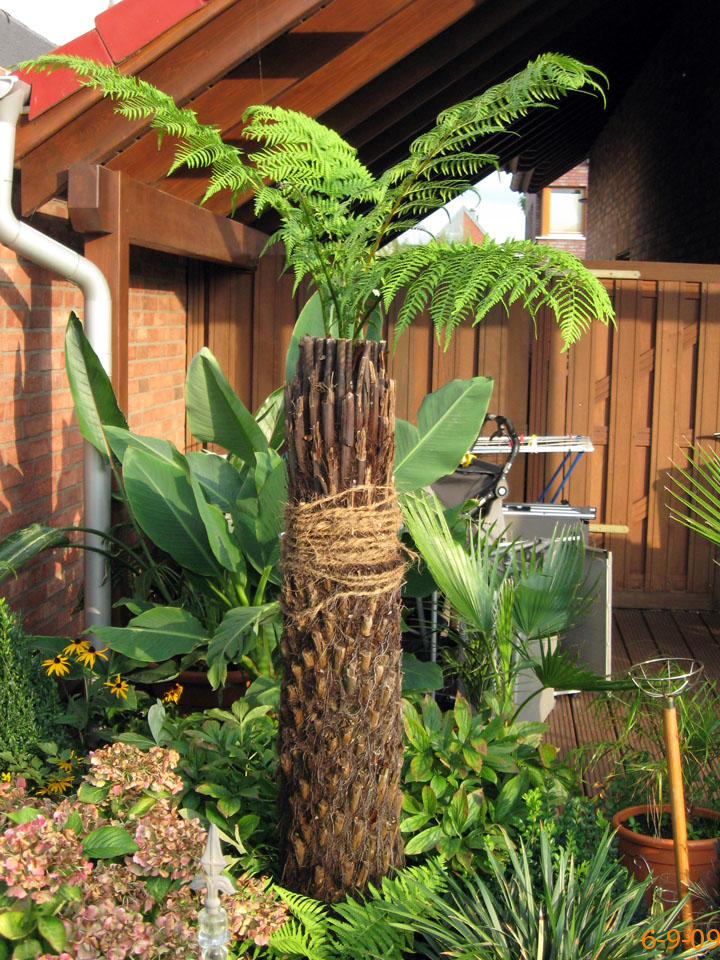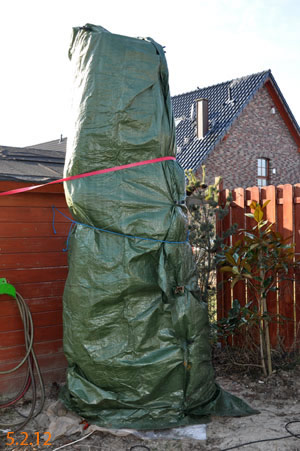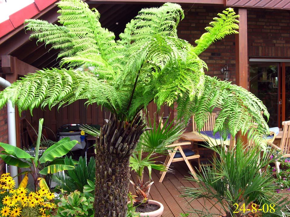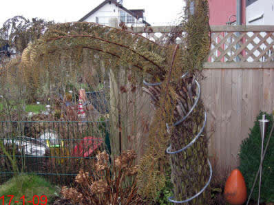 BAUMFARNDICKSONIA ANTARCTICAUrsprünglich stammt dieser Baumfarn aus ostaustralischen Bergwäldern, Tasmanien und einigen subantarktischen Inseln. In der Natur kann er 6m Stammhöhe erreichen und eine aus bis zu 60 Wedeln bestehende Krone bilden. Die Blattwedel können es dabei auf eine Länge von 4m schaffen. Das Stammwachstum ist eher gering und erreicht kaum mehr als max. 5cm pro Jahr, dabei kann der Stamm aber einen Durchmesser von 40cm erreichen. Der Stamm besteht zum großen Teil aus einem Wurzelgeflecht, welches maßgeblich an der Versorgung der Pflanze mit Wasser beteiligt ist. Baumfarne dürfen niemals austrocknen! (Die unterirdischen Wurzeln sind sehr hart und haben größtenteils Haltefunktion. Ob diese Wurzeln auch zur Versorgung des Farns beitragen ist nicht eindeutig geklärt. So werden manche Baumfarne sogar in Beton gegossen und überstehen selbst diesen völligen Einschluss der Wurzeln. Ich persönlich denke dennoch, dass die unterirdischen Wurzeln zumindest einen Teil zur Versorgung der Pflanze beitragen.) Nach meinen inzwischen gemachten Erfahrungen (siehe weiter unten) muss ich den vorigen Abschnitt revidieren! Inzwischen bin ich überzeugt, dass die Aussage "Bodenwurzeln hätten nur Haltefunktion" ein Märchen ist. Wie sich zeigt, kümmern Baumfarne ohne funktionierende Bodenwurzeln. Ich würde aus heutiger Sicht unbedingt empfehlen Baumfarne direkt im Garten auszupflanzen und im Winter notfalls zu beheizen (entgegen der weit verbreiteten Ansicht Baumfarne dürften nicht beheizt werden zeigte sich bei mir, dass eine leichte Beheizung völlig problemlos funktioniert). Baumfarne fühlen sich am wohlsten in schattigen bis halbschattigen Lagen mit ausreichend Feuchtigkeit und mäßigen Temperaturen. Da der Baumfarn niemals austrocknen darf, muss er regelmäßig gegossen werden, besonders wenn er zu sonnig steht. Am besten ist es, den Baumfarn komplett mit einem Gartenschlauch durchdringend abzuspritzen. Am einfachsten funktioniert das, wenn man zunächst den Stamm nur leicht befeuchtet und dann erst durchdringend abspritzt, da das Wasser zunächst abperlt. Ist der Stamm jedoch erstmal feucht, saugt er das Wasser gierig auf. Wenn es mal schnell gehen muss, gieße ich den Baumfarn auch mal per Gießkanne von oben in die Stammöffnung. Überschüssiges Wasser läuft dann am Stamm herab bis auf den Boden. Über den Nährstoffbedarf von Baumfarnen gibt es unterschiedliche Ansichten. Die einen sagen er komme ohne zusätzlichen Dünger aus, andere empfehlen ihn wie jede andere Grünpflanze auch zu düngen. Ich selbst dünge ihn regelmäßig, allerdings wie alle meine anderen Pflanzen auch eher sparsam. Dicksonia antarctica braucht keine hohen Temperaturen zum wachsen. Am wohlsten fühlt er sich bei Temperaturen um 20°C. Zur Frostverträglichkeit gibt es unterschiedliche Ansichten, meistens werden Werte um -10°C angegeben, allerdings erfrieren die Blätter in der Regel bereits bei Temperaturen um -5°C. 2007Meinen Baumfarn habe ich April 2007 gekauft und gleich ausgepflanzt, nachdem ich ihn zunächst ordentlich gewässert habe, indem ich den Stamm einfach in den Teich gelegt habe, so dass er sich ordentlich voll Wasser saugen konnte. Ende Mai zeigten sich dann die ersten "Röllchen" der künftigen Blätter, die sich dann auch rasch entrollten. Im ersten Jahr brachte er es dann auf 7 oder 8 Wedel. 2008Den Winter 2007/2008 hat der Baumfarn so gut wie ungeschützt draußen im Freien verbracht. Lediglich in einer besonders kalten Nacht hab ich ihn mit einem Winterschutzvlies abgedeckt. Bei Tiefsttemperaturen von -9°C verlor er zwar die Blätter, hat den Winter aber gut überstanden und im Frühjahr schnell einen Kranz neuer Blätter gebildet. Leider wurden dann durch einen Hagelschauer mehrere Wedel abgebrochen, die aber im Laufe des Sommers ersetzt wurden. 2009Die Kältephase Anfang 2009 dürfte ein echter Härtetest für den Baumfarn gewesen sein. -16,5°C in 2m gemessene Lufttemperatur musste er ertragen, während nur die Blätter in Vlies eingewickelt waren. Zusätzlich hatte ich den Stamm von oben zwischen den Blattstielen mit Rindenmulch abgedeckt. Erst nach zwei sehr kalten Nächten mit -15,4°C und -16,5°C wickelte ich einen Lichtschlauch zur Beheizung um den Stamm und wickelte ihn zusätzlich in eine Wolldecke. Sofort nach Beendigung der Frostphase habe ich den Stamm ausgiebig gegossen. Ich bin gespannt, ob der Baumfarn diese Tortour überstanden hat und im Frühjahr wieder austreibt.... Die Temperaturen die der Baumfarn ertragen mussten waren wohl zuviel des Guten. Da wo sich eigentlich nun langsam (Ende April) die neuen Röllchen der Blätter entwickeln sollten brodelt es. Innerhalb des Stammes scheint es zu faulen. Da hilft nur abwarten, ob er noch neue Blätter entwickelt, oder stirbt. Am Rand scheint noch ein Fünkchen Leben im Baumfarn zu stecken. In der Mitte ist es aber faulig und matschig. Mal sehen ob er noch ein paar Blätter schafft. Bin gespannt.... nach endlosem hin und her hab ich mich heute entschlossen meinem wintergeschädigten Baumfarn einen neuen "Kopf" aufzusetzen. Konnte mich ewig nicht entscheiden, ob ich dem Baumfarn weiterhin noch eine Chance gebe neu auszutreiben, ob ich ihm einen heimischen Farn, oder eben wieder eine D. antarctica aufsetze. Na, aber dieses Bild sah mir nicht so aus, als könne ich mir noch Hoffnung auf einen Austrieb machen. Seit Monaten faulte es nun in der Wachstumsöffnung, zwischenzeitlich warf der Farn regelrecht Blasen. Ich entschied mich nun doch wieder einen D. antarctica aufzusetzen. Leider sind dem zu diesem Zweck bereits vor einigen Monaten gekauften kleineren Baumfarn während meines Urlaubs sämtliche Blätter vertrocknet. Allerdings schiebt er aktuell drei neue Blätter, so das ich hoffe, dass er bald wieder okay ist. Da die Spize meines alten Baumfarns schon immer sehr schief gewachsen war, konnte ich dort den neuen kleineren Baumfarn nicht drauf befestigen, also sägte ich die Spitze ab. Tja, zu meinem Erstaun