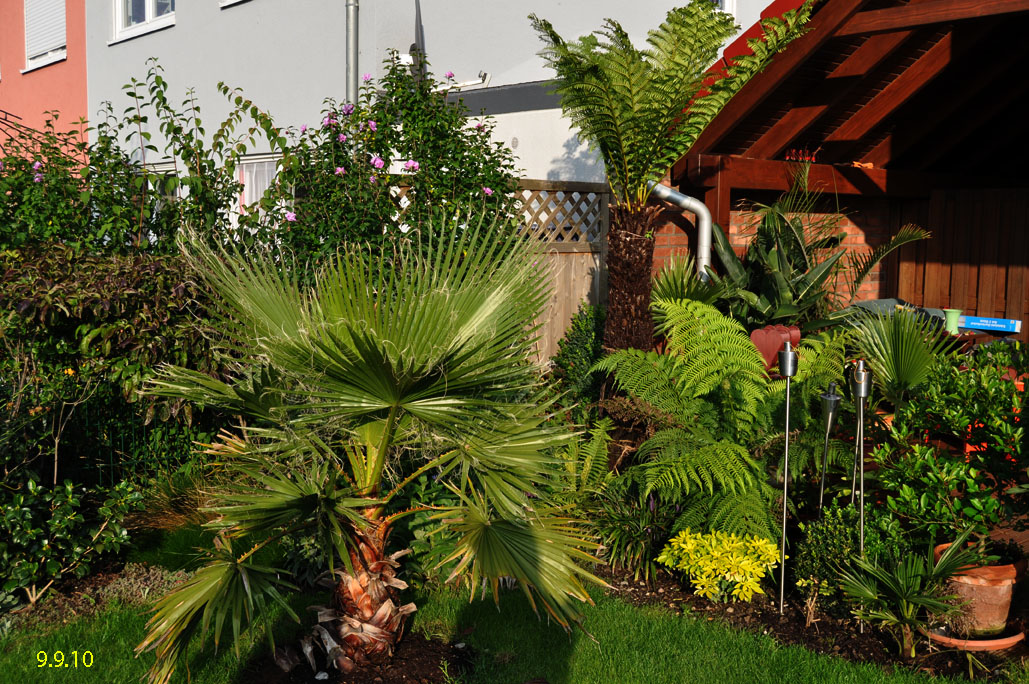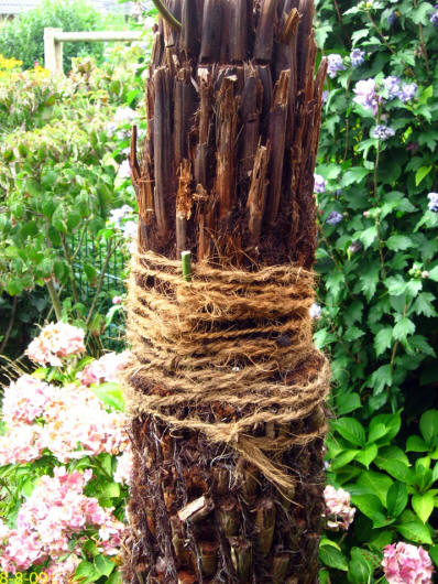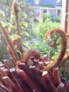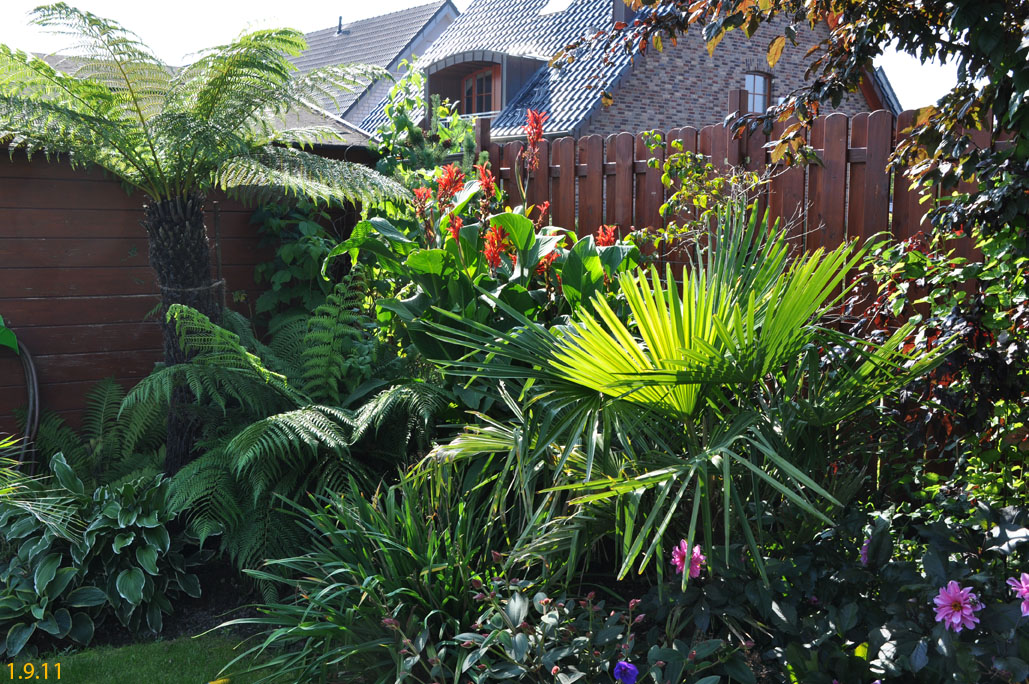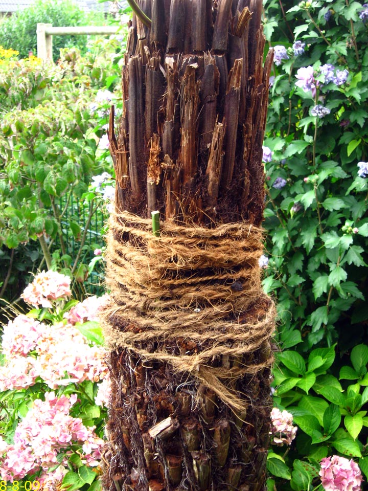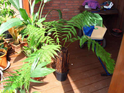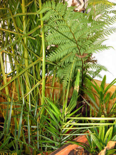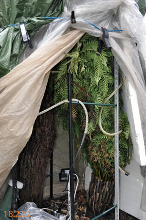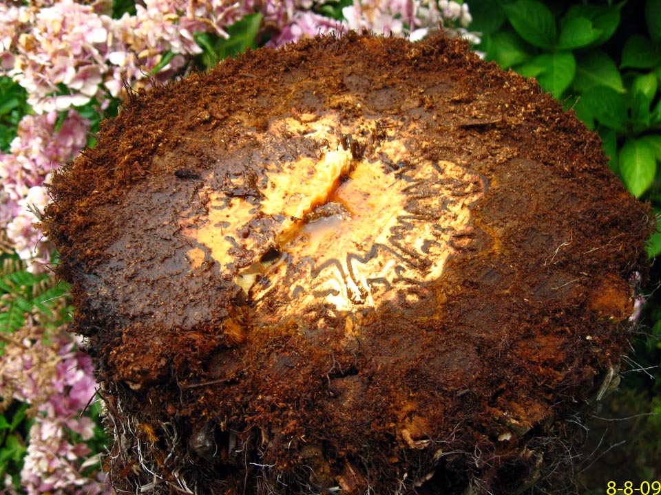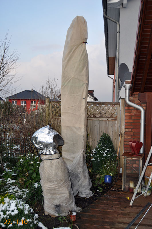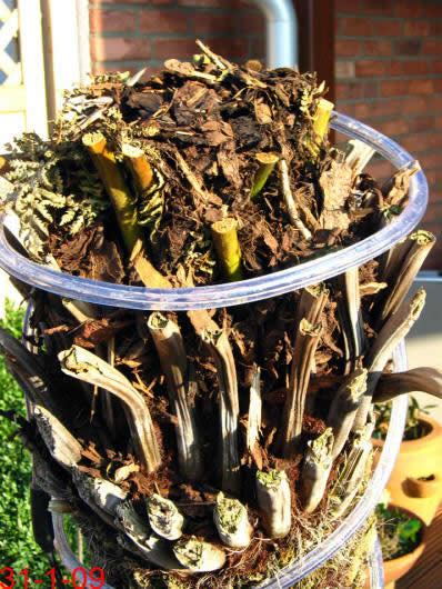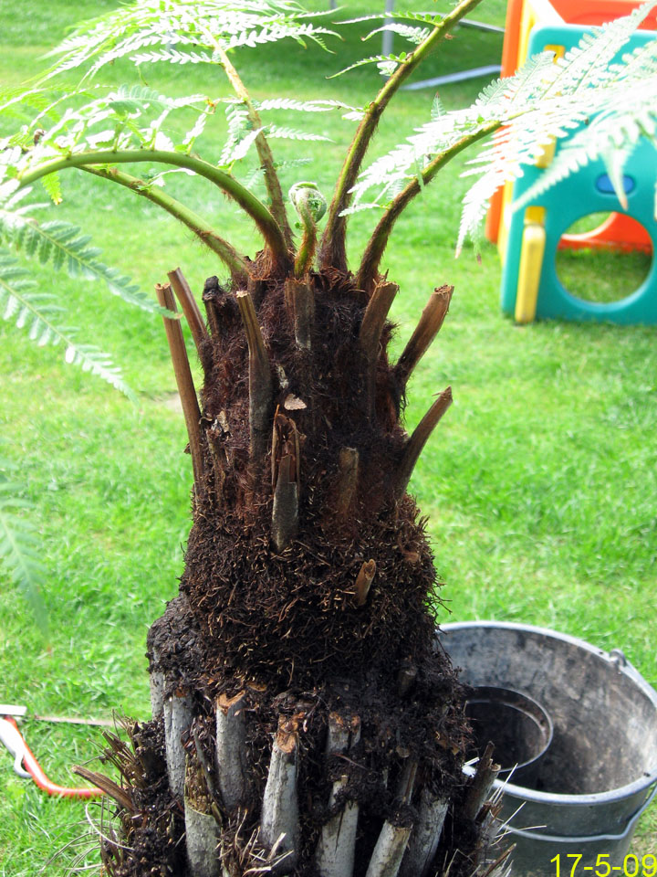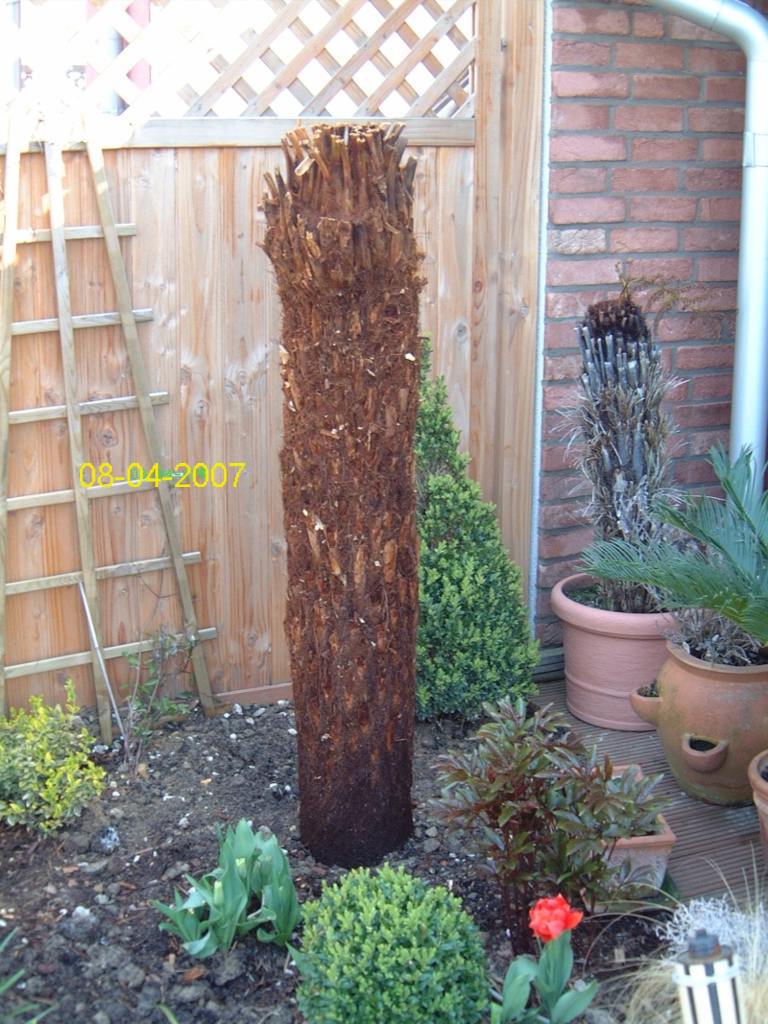 BAUMFARNDICKSONIA ANTARCTICAUrsprünglich stammt dieser Baumfarn aus ostaustralischen Bergwäldern, Tasmanien und einigen subantarktischen Inseln. In der Natur kann er 6m Stammhöhe erreichen und eine aus bis zu 60 Wedeln bestehende Krone bilden. Die Blattwedel können es dabei auf eine Länge von 4m schaffen. Das Stammwachstum ist eher gering und erreicht kaum mehr als max. 5cm pro Jahr, dabei kann der Stamm aber einen Durchmesser von 40cm erreichen. Der Stamm besteht zum großen Teil aus einem Wurzelgeflecht, welches maßgeblich an der Versorgung der Pflanze mit Wasser beteiligt ist. Baumfarne dürfen niemals austrocknen! (Die unterirdischen Wurzeln sind sehr hart und haben größtenteils Haltefunktion. Ob diese Wurzeln auch zur Versorgung des Farns beitragen ist nicht eindeutig geklärt. So werden manche Baumfarne sogar in Beton gegossen und überstehen selbst diesen völligen Einschluss der Wurzeln. Ich persönlich denke dennoch, dass die unterirdischen Wurzeln zumindest einen Teil zur Versorgung der Pflanze beitragen.) Nach meinen inzwischen gemachten Erfahrungen (siehe weiter unten) muss ich den vorigen Abschnitt revidieren! Inzwischen bin ich überzeugt, dass die Aussage "Bodenwurzeln hätten nur Haltefunktion" ein Märchen ist. Wie sich zeigt, kümmern Baumfarne ohne funktionierende Bodenwurzeln. Ich würde aus heutiger Sicht unbedingt empfehlen Baumfarne direkt im Garten auszupflanzen und im Winter notfalls zu beheizen (entgegen der weit verbreiteten Ansicht Baumfarne dürften nicht beheizt werden zeigte sich bei mir, dass eine leichte Beheizung völlig problemlos funktioniert). Baumfarne fühlen sich am wohlsten in schattigen bis halbschattigen Lagen mit ausreichend Feuchtigkeit und mäßigen Temperaturen. Da der Baumfarn niemals austrocknen darf, muss er regelmäßig gegossen werden, besonders wenn er zu sonnig steht. Am besten ist es, den Baumfarn komplett mit einem Gartenschlauch durchdringend abzuspritzen. Am einfachsten funktioniert das, wenn man zunächst den Stamm nur leicht befeuchtet und dann erst durchdringend abspritzt, da das Wasser zunächst abperlt. Ist der Stamm jedoch erstmal feucht, saugt er das Wasser gierig auf. Wenn es mal schnell gehen muss, gieße ich den Baumfarn auch mal per Gießkanne von oben in die Stammöffnung. Überschüssiges Wasser läuft dann am Stamm herab bis auf den Boden. Über den Nährstoffbedarf von Baumfarnen gibt es unterschiedliche Ansichten. Die einen sagen er komme ohne zusätzlichen Dünger aus, andere empfehlen ihn wie jede andere Grünpflanze auch zu düngen. Ich selbst dünge ihn regelmäßig, allerdings wie alle meine anderen Pflanzen auch eher sparsam. Dicksonia antarctica braucht keine hohen Temperaturen zum wachsen. Am wohlsten fühlt er sich bei Temperaturen um 20°C. Zur Frostverträglichkeit gibt es unterschiedliche Ansichten, meistens werden Werte um -10°C angegeben, allerdings erfrieren die Blätter in der Regel bereits bei Temperaturen um -5°C. 2007Meinen Baumfarn habe ich April 2007 gekauft und gleich ausgepflanzt, nachdem ich ihn zunächst ordentlich gewässert habe, indem ich den Stamm einfach in den Teich gelegt habe, so dass er sich ordentlich voll Wasser saugen konnte. Ende Mai zeigten sich dann die ersten "Röllchen" der künftigen Blätter, die sich dann auch rasch entrollten. Im ersten Jahr brachte er es dann auf 7 oder 8 Wedel. 2008Den Winter 2007/2008 hat der Baumfarn so gut wie ungeschützt draußen im Freien verbracht. Lediglich in einer besonders kalten Nacht hab ich ihn mit einem Winterschutzvlies abgedeckt. Bei Tiefsttemperaturen von -9°C verlor er zwar die Blätter, hat den Winter aber gut überstanden und im Frühjahr schnell einen Kranz neuer Blätter gebildet. Leider wurden dann durch einen Hagelschauer mehrere Wedel abgebrochen, die aber im Laufe des Sommers ersetzt wurden. 2009Die Kältephase Anfang 2009 dürfte ein echter Härtetest für den Baumfarn gewesen sein. -16,5°C in 2m gemessene Lufttemperatur musste er ertragen, während nur die Blätter in Vlies eingewickelt waren. Zusätzlich hatte ich den Stamm von oben zwischen den Blattstielen mit Rindenmulch abgedeckt. Erst nach zwei sehr kalten Nächten mit -15,4°C und -16,5°C wickelte ich einen Lichtschlauch zur Beheizung um den Stamm und wickelte ihn zusätzlich in eine Wolldecke. Sofort nach Beendigung der Frostphase habe ich den Stamm ausgiebig gegossen. Ich bin gespannt, ob der Baumfarn diese Tortour überstanden hat und im Frühjahr wieder austreibt.... Die Temperaturen die der Baumfarn ertragen mussten waren wohl zuviel des Guten. Da wo sich eigentlich nun langsam (Ende April) die neuen Röllchen der Blätter entwickeln sollten brodelt es. Innerhalb des Stammes scheint es zu faulen. Da hilft nur abwarten, ob er noch neue Blätter entwickelt, oder stirbt. Am Rand scheint noch ein Fünkchen Leben im Baumfarn zu stecken. In der Mitte ist es aber faulig und matschig. Mal sehen ob er noch ein paar Blätter schafft. Bin gespannt.... nach endlosem hin und her hab ich mich heute entschlossen meinem wintergeschädigten Baumfarn einen neuen "Kopf" aufzusetzen. Konnte mich ewig nicht entscheiden, ob ich dem Baumfarn weiterhin noch eine Chance gebe neu auszutreiben, ob ich ihm einen heimischen Farn, oder eben wieder eine D. antarctica aufsetze. Na, aber dieses Bild sah mir nicht so aus, als könne ich mir noch Hoffnung auf einen Austrieb machen. Seit Monaten faulte es nun in der Wachstumsöffnung, zwischenzeitlich warf der Farn regelrecht Blasen. Ich entschied mich nun doch wieder einen D. antarctica aufzusetzen. Leider sind dem zu diesem Zweck bereits vor einigen Monaten gekauften kleineren Baumfarn während meines Urlaubs sämtliche Blätter vertrocknet. Allerdings schiebt er aktuell drei neue Blätter, so das ich hoffe, dass er bald wieder okay ist. Da die Spize meines alten Baumfarns schon immer sehr schief gewachsen war, konnte ich dort den neuen kleineren Baumfarn nicht drauf befestigen, also sägte ich die Spitze ab. Tja, zu meinem Erstaun