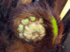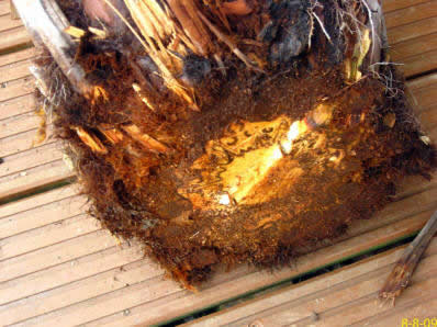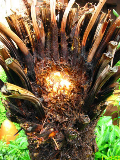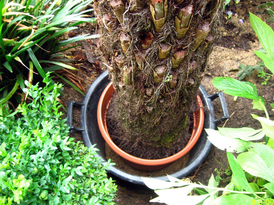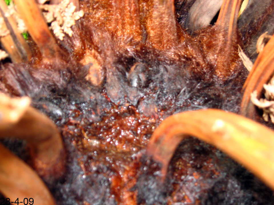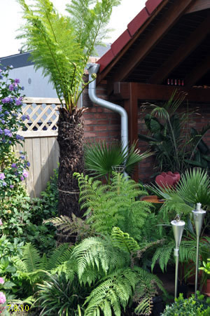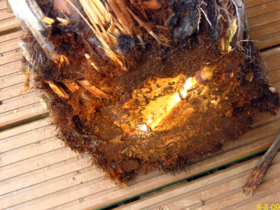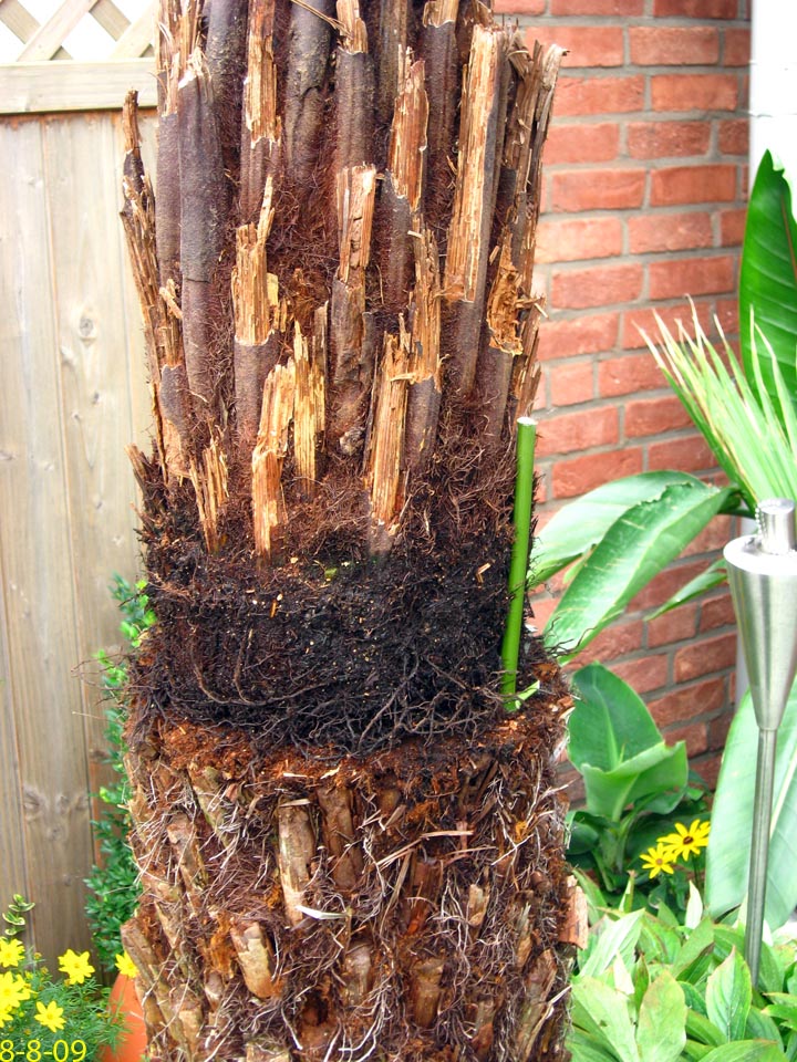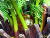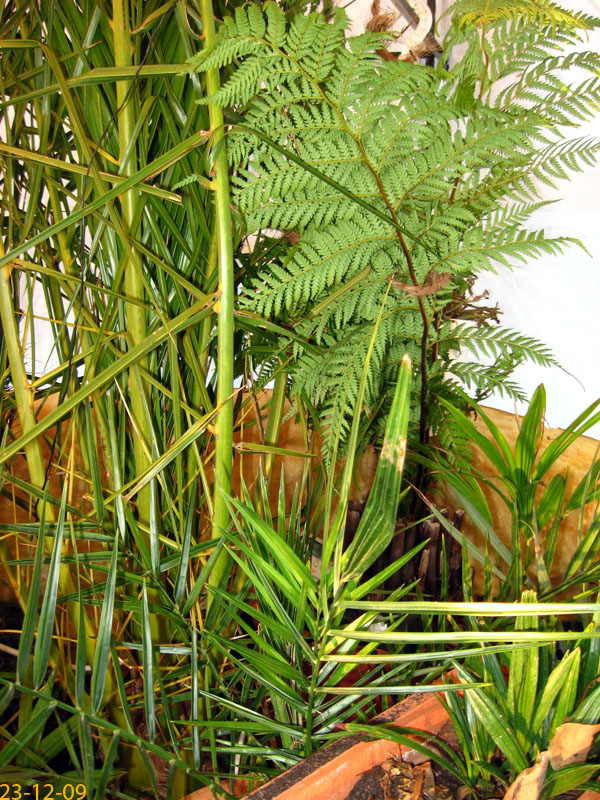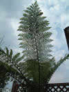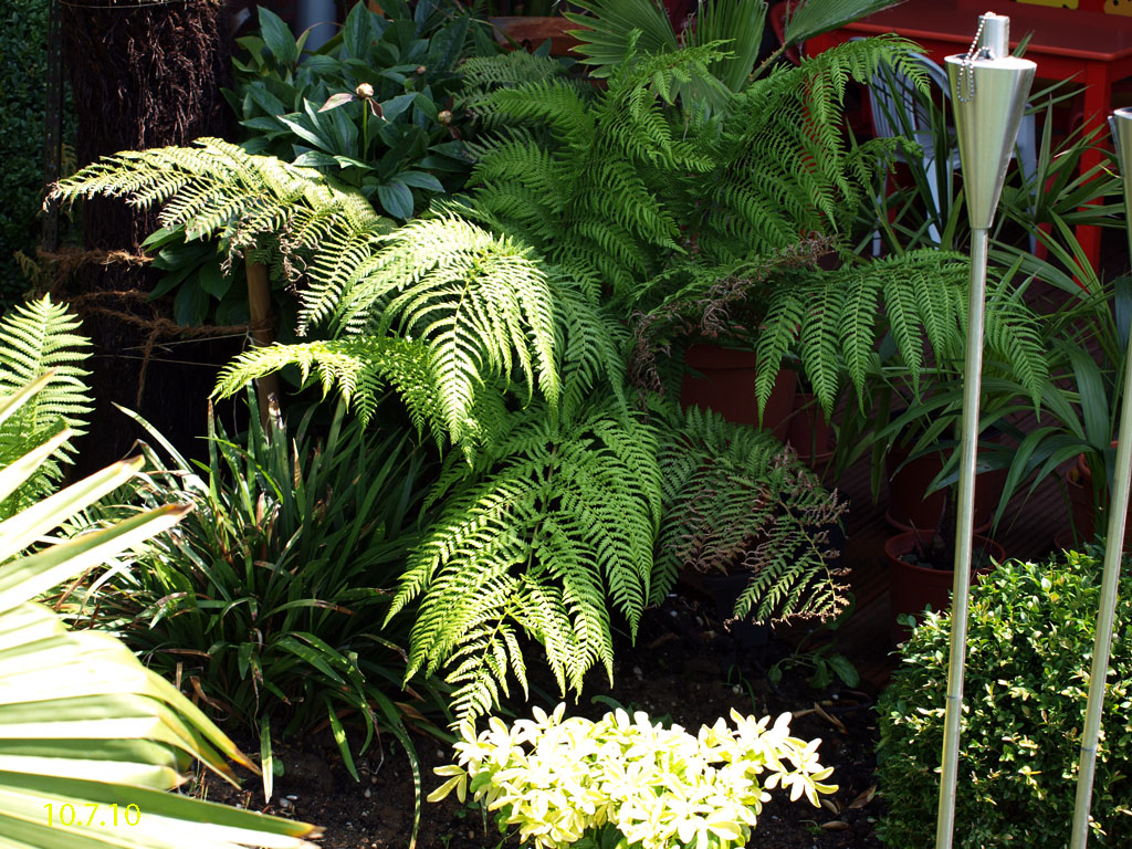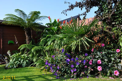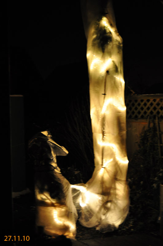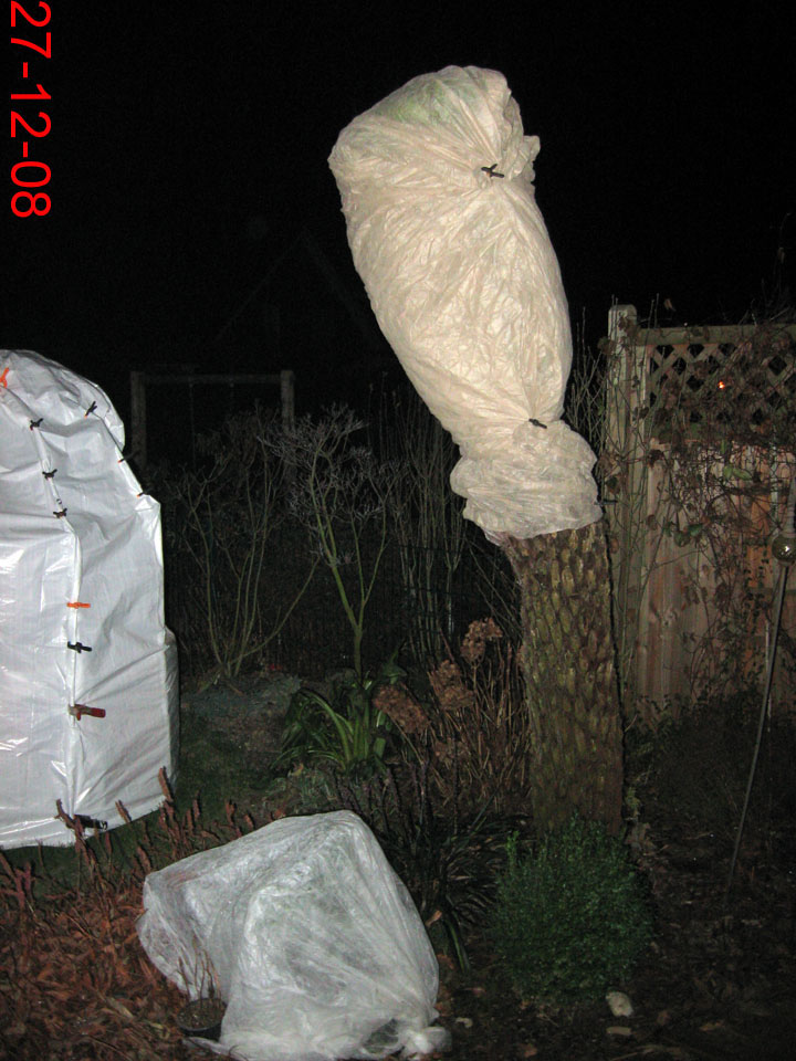 BAUMFARNDICKSONIA ANTARCTICAUrsprünglich stammt dieser Baumfarn aus ostaustralischen Bergwäldern, Tasmanien und einigen subantarktischen Inseln. In der Natur kann er 6m Stammhöhe erreichen und eine aus bis zu 60 Wedeln bestehende Krone bilden. Die Blattwedel können es dabei auf eine Länge von 4m schaffen. Das Stammwachstum ist eher gering und erreicht kaum mehr als max. 5cm pro Jahr, dabei kann der Stamm aber einen Durchmesser von 40cm erreichen. Der Stamm besteht zum großen Teil aus einem Wurzelgeflecht, welches maßgeblich an der Versorgung der Pflanze mit Wasser beteiligt ist. Baumfarne dürfen niemals austrocknen! (Die unterirdischen Wurzeln sind sehr hart und haben größtenteils Haltefunktion. Ob diese Wurzeln auch zur Versorgung des Farns beitragen ist nicht eindeutig geklärt. So werden manche Baumfarne sogar in Beton gegossen und überstehen selbst diesen völligen Einschluss der Wurzeln. Ich persönlich denke dennoch, dass die unterirdischen Wurzeln zumindest einen Teil zur Versorgung der Pflanze beitragen.) Nach meinen inzwischen gemachten Erfahrungen (siehe weiter unten) muss ich den vorigen Abschnitt revidieren! Inzwischen bin ich überzeugt, dass die Aussage "Bodenwurzeln hätten nur Haltefunktion" ein Märchen ist. Wie sich zeigt, kümmern Baumfarne ohne funktionierende Bodenwurzeln. Ich würde aus heutiger Sicht unbedingt empfehlen Baumfarne direkt im Garten auszupflanzen und im Winter notfalls zu beheizen (entgegen der weit verbreiteten Ansicht Baumfarne dürften nicht beheizt werden zeigte sich bei mir, dass eine leichte Beheizung völlig problemlos funktioniert). Baumfarne fühlen sich am wohlsten in schattigen bis halbschattigen Lagen mit ausreichend Feuchtigkeit und mäßigen Temperaturen. Da der Baumfarn niemals austrocknen darf, muss er regelmäßig gegossen werden, besonders wenn er zu sonnig steht. Am besten ist es, den Baumfarn komplett mit einem Gartenschlauch durchdringend abzuspritzen. Am einfachsten funktioniert das, wenn man zunächst den Stamm nur leicht befeuchtet und dann erst durchdringend abspritzt, da das Wasser zunächst abperlt. Ist der Stamm jedoch erstmal feucht, saugt er das Wasser gierig auf. Wenn es mal schnell gehen muss, gieße ich den Baumfarn auch mal per Gießkanne von oben in die Stammöffnung. Überschüssiges Wasser läuft dann am Stamm herab bis auf den Boden. Über den Nährstoffbedarf von Baumfarnen gibt es unterschiedliche Ansichten. Die einen sagen er komme ohne zusätzlichen Dünger aus, andere empfehlen ihn wie jede andere Grünpflanze auch zu düngen. Ich selbst dünge ihn regelmäßig, allerdings wie alle meine anderen Pflanzen auch eher sparsam. Dicksonia antarctica braucht keine hohen Temperaturen zum wachsen. Am wohlsten fühlt er sich bei Temperaturen um 20°C. Zur Frostverträglichkeit gibt es unterschiedliche Ansichten, meistens werden Werte um -10°C angegeben, allerdings erfrieren die Blätter in der Regel bereits bei Temperaturen um -5°C. 2007Meinen Baumfarn habe ich April 2007 gekauft und gleich ausgepflanzt, nachdem ich ihn zunächst ordentlich gewässert habe, indem ich den Stamm einfach in den Teich gelegt habe, so dass er sich ordentlich voll Wasser saugen konnte. Ende Mai zeigten sich dann die ersten "Röllchen" der künftigen Blätter, die sich dann auch rasch entrollten. Im ersten Jahr brachte er es dann auf 7 oder 8 Wedel. 2008Den Winter 2007/2008 hat der Baumfarn so gut wie ungeschützt draußen im Freien verbracht. Lediglich in einer besonders kalten Nacht hab ich ihn mit einem Winterschutzvlies abgedeckt. Bei Tiefsttemperaturen von -9°C verlor er zwar die Blätter, hat den Winter aber gut überstanden und im Frühjahr schnell einen Kranz neuer Blätter gebildet. Leider wurden dann durch einen Hagelschauer mehrere Wedel abgebrochen, die aber im Laufe des Sommers ersetzt wurden. 2009Die Kältephase Anfang 2009 dürfte ein echter Härtetest für den Baumfarn gewesen sein. -16,5°C in 2m gemessene Lufttemperatur musste er ertragen, während nur die Blätter in Vlies eingewickelt waren. Zusätzlich hatte ich den Stamm von oben zwischen den Blattstielen mit Rindenmulch abgedeckt. Erst nach zwei sehr kalten Nächten mit -15,4°C und -16,5°C wickelte ich einen Lichtschlauch zur Beheizung um den Stamm und wickelte ihn zusätzlich in eine Wolldecke. Sofort nach Beendigung der Frostphase habe ich den Stamm ausgiebig gegossen. Ich bin gespannt, ob der Baumfarn diese Tortour überstanden hat und im Frühjahr wieder austreibt.... Die Temperaturen die der Baumfarn ertragen mussten waren wohl zuviel des Guten. Da wo sich eigentlich nun langsam (Ende April) die neuen Röllchen der Blätter entwickeln sollten brodelt es. Innerhalb des Stammes scheint es zu faulen. Da hilft nur abwarten, ob er noch neue Blätter entwickelt, oder stirbt. Am Rand scheint noch ein Fünkchen Leben im Baumfarn zu stecken. In der Mitte ist es aber faulig und matschig. Mal sehen ob er noch ein paar Blätter schafft. Bin gespannt.... nach endlosem hin und her hab ich mich heute entschlossen meinem wintergeschädigten Baumfarn einen neuen "Kopf" aufzusetzen. Konnte mich ewig nicht entscheiden, ob ich dem Baumfarn weiterhin noch eine Chance gebe neu auszutreiben, ob ich ihm einen heimischen Farn, oder eben wieder eine D. antarctica aufsetze. Na, aber dieses Bild sah mir nicht so aus, als könne ich mir noch Hoffnung auf einen Austrieb machen. Seit Monaten faulte es nun in der Wachstumsöffnung, zwischenzeitlich warf der Farn regelrecht Blasen. Ich entschied mich nun doch wieder einen D. antarctica aufzusetzen. Leider sind dem zu diesem Zweck bereits vor einigen Monaten gekauften kleineren Baumfarn während meines Urlaubs sämtliche Blätter vertrocknet. Allerdings schiebt er aktuell drei neue Blätter, so das ich hoffe, dass er bald wieder okay ist. Da die Spize meines alten Baumfarns schon immer sehr schief gewachsen war, konnte ich dort den neuen kleineren Baumfarn nicht drauf befestigen, also sägte ich die Spitze ab. Tja, zu meinem Erstaun