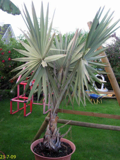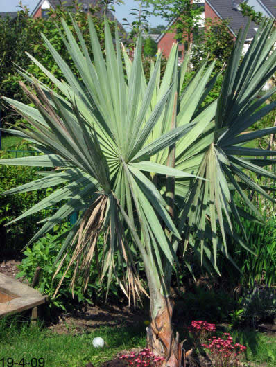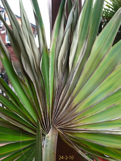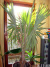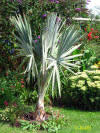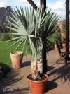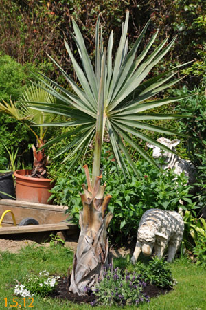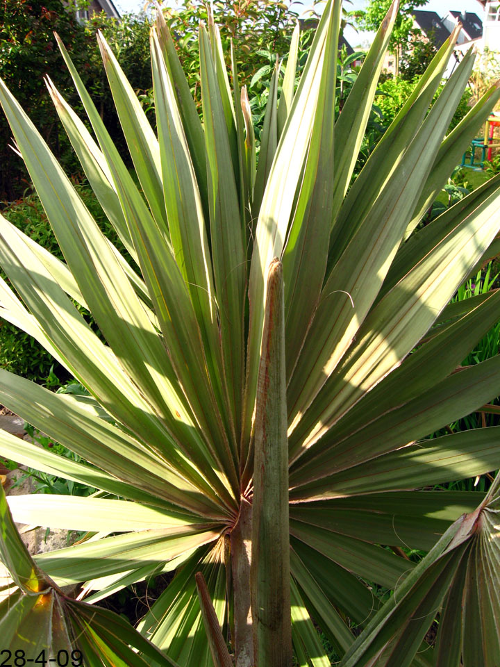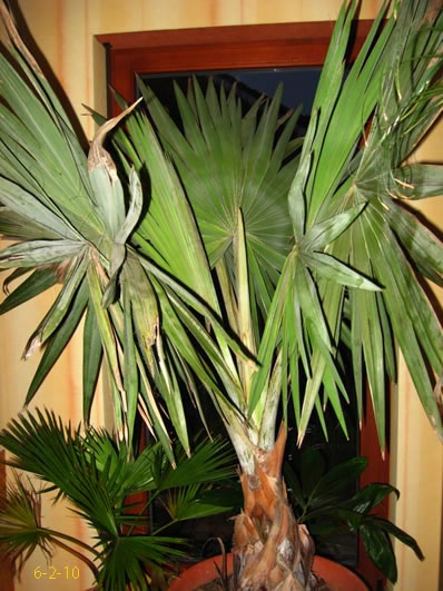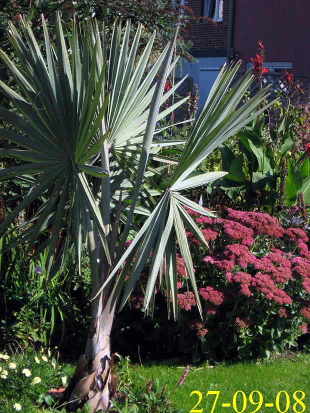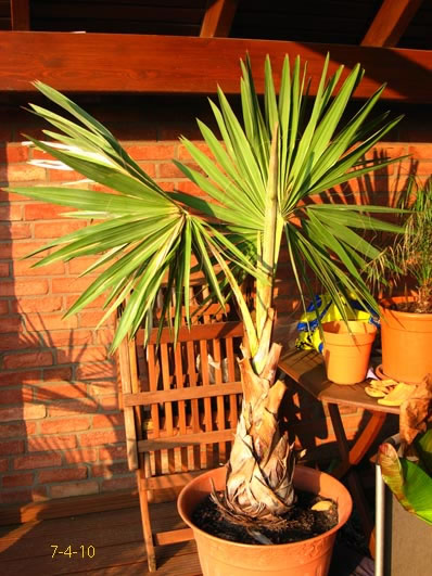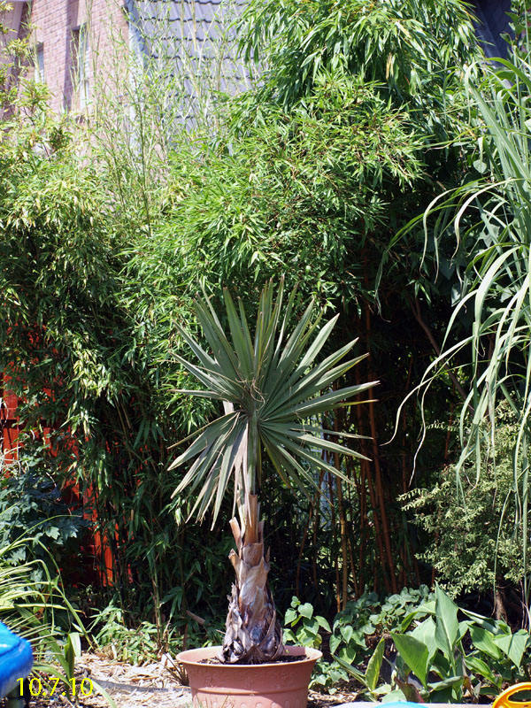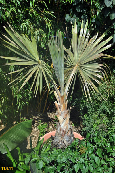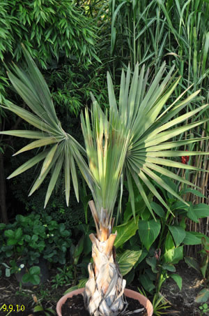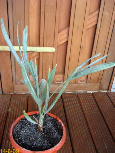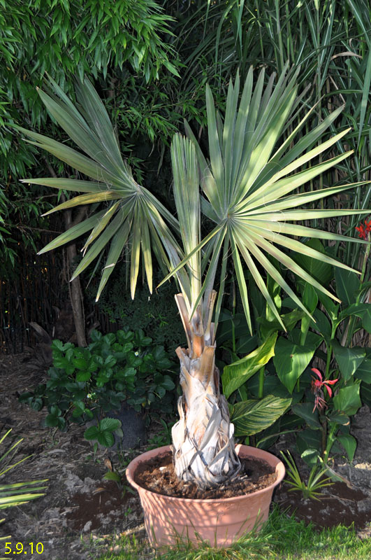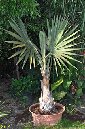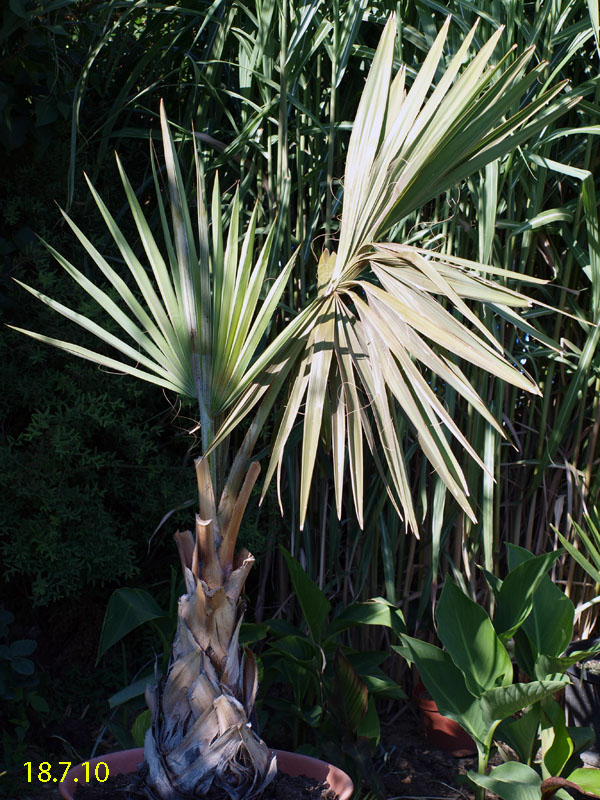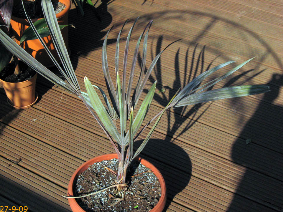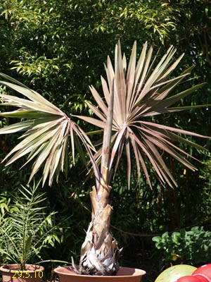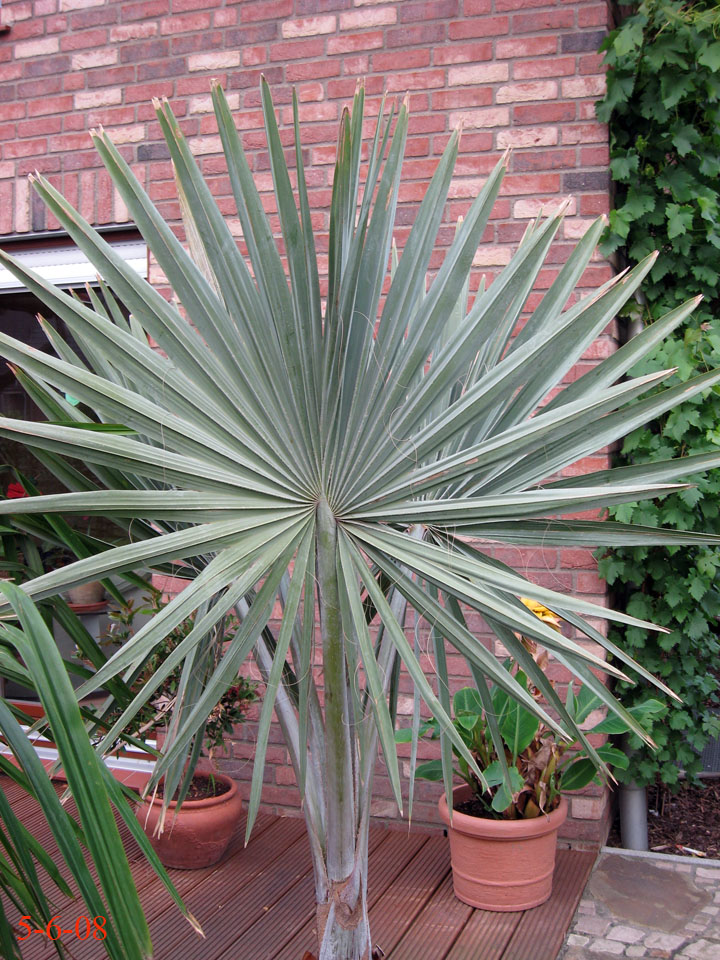 BISMARCKIA NOBILISHildebr. & H.Wendl. (Bismarckpalme) B. nobilis stammt aus Madagaskar, wo sie endemisch ist. Sie ist mit einer Blattspreite von 3m (!) Durchmesser und einer Stammhöhe von 10m sicher eine der eindrucksvollsten Palmen überhaupt - zumindest ist sie meine persönliche Lieblingspalme! Dank ihres edlen Aussehens wird sie heute überall auf der Welt kultiviert, wo sie mit den klimatischen Bedingungen zurecht kommt. Leider benötigt sie warme Temperaturen und viel, ja sehr viel Licht! Kann man ihr Temperaturen zwischen 20 und 30°C bieten (am besten ganzjährig) ist sie eine pflegeleichte, sehr schnell wachsende Palme, die auch mit Trockenheit gut zurecht kommt, da sie mit ihren sehr kräftigen Wurzeln in tiefere Bodenschichten vordringt um an Wasser zu gelangen. Interessant ist dieses Foto einer aus Samen gezogenen vierjährigen Bismarckia aus Queensland. Da kann man sich Vorstellungen vom Wuchsvermögen unter optimalen Bedingungen machen. http://www.geocities.com/palmpage2000/images/bismarckia-nobilis.html Es gibt zwei unterschiedliche Formen, "silver" mit silber-bläulichen und "green" mit grünlichen Blättern, wobei die silberne Form hitzeverträglicher sein soll, während die grüne Form auch mit kühleren Temperaturen und feuchteren Klimaten zurecht kommen soll. Hier bei uns ist diese wunderschöne Fächerpalme leider aufgrund der zu kalten Temperaturen nicht auspflanzbar, sondern kann nur im Kübel gehalten werden. Wichtig ist ein besonders großer Kübel in dem sich die starken Wurzeln ausbreiten können. Das Substrat sollte humos und gut durchlässig sein. Staunässe ist unbedingt zu vermeiden, weil die Wurzeln besonders bei kühlen Temperaturen zu Fäulnis neigen. Im Sommer bei warmen Temperaturen freut sich die Palme über reichlich Wassergaben, das Substrat darf aber zwischendurch auch mal völlig abtrocknen. Wichtig ist es, ihr den sonnigsten Platz zu bieten den man zur Verfügung hat - im Sommer am besten im Freien. Bismarckia kommt kurzzeitig auch mal mit kühleren Temperaturen zurecht - größere Pflanzen können sogar minimalen Frost vertragen - sollte aber dauerhaft warm stehen. Besonders die Wurzeln benötigen ständig warme Bodentemperaturen. Ich habe bei meiner Bismarckia festgestellt, dass sie sogar im Winter auf einer Bodenheizung bei an sich viel zu geringem Lichtangebot kräftiges Wachstum zeigt. So schob meine B.n. während des Winters drei große Fächerblätter, während sie im Freien trotz viel besserem Lichtangebot wegen der niedrigeren Bodentemperatur (in Erde versenkter Kübel) nur recht langsam wuchs. Dort zeigte sie erst im Spätsommer ordentliches Wachstum. Auf kühle Temperaturen reagiert diese Palme innerhalb kürzester Zeit mit einer deutlichen Verfärbung der Blätter und Blattstiele zunächst ins grünliche, später ins rötliche. Stellt man sie darauf schnell an einen wärmeren Ort kehrt aber in der Regel die silbrige Farbe schnell zurück. Bis auf die Temperaturbedingungen ist die Palme sehr anspruchslos und benötigt nur wenig Dünger. Auch Schädlinge wie Spinnmilben, Wollläuse & Co stellen für gesunde Pflanzen keine besondere Gefahr dar, da die Blätter sehr hart und robust sind. Einfaches Abwischen der Blätter reicht bei Befall, Pflanzenschutzmittel brauchte ich selbst bei der Überwinterung im Wohnzimmer bisher nicht. Im Frühjahr 2009 hatte ich die Bismarckia wieder im Kübel im Garten in der Erde versenkt. Ein paar Tage kühle Witterung reichen, dass die Bismarckia ihre silberblaue Färbung verliert und sich stattdessen zunächst grünlich, später rötlich färbt. Irgendwie kam die Bizzy während des Sommers nicht richtig in Fahrt und so sah ich mir, nachdem sogar einige Blätter einzutrocknen begannen und die Palme auch allgemein einen ungesunden Eindruck machte, die Wurzeln an. Dabei entdeckte ich einige Engerlinge und einen Ameisenhaufen unter dem versenkten Topf. Ich grub die Bismarckia deshalb wieder aus und stellte sie an einen möglichst sonnigen Platz. Langsam erholte sie sich wieder und sah bis zum Winter wieder ganz ordentlich aus. Während des Winters 09/10 stand sie im Wohnzimmer und erholte sich weiter. Sie schob sogar drei neue Blätter, bis sie dann im Februar plötzlich wieder einen ungesunden Eindruck machte und einige Blätter graubraune Flecken bekamen. Innerhalb weniger Tage verlor sie ein Blatt nach dem anderen und sogar die gerade erst neu gebildeten Blätter wurden braun. Meine erste Vermutung war, dass sie unter Lichtmangel litt, da sich dieser Winter durch permanent grauen Himmel und Dunkelheit auszeichnete. Trotz der immer noch sehr kühlen Temperaturen brachte ich sie deshalb auf die Terrasse. Da ich bei einer anderen Palme, die ebenfalls plötzlich zu vertrocknen begann, zwischenzeitlich Drahtwürmer im Topf entdeckte, untersuchte ich auch das Substrat der Bismarckia und entdeckte dabei mehrere dieser Drahtwürmer, die sich an den Wurzeln zu schaffen machten und sich sogar von unten in den Stamm hineinfraßen. Nachdem ich dann das Substrat wechselte und die Bizzy auch weiterhin draußen an der frischen Luft ließ, hat sich der Zustand zumindest nicht weiter verschlechtert. Leider sind ihr nur noch eineinhalb intakte Blätter geblieben, aber die Speere sehen gesund aus und so hoffe ich, dass sie sich während des Sommers wieder "berappeln" wird. Interessant ist, dass ihr die teilweise noch sehr kalten Temperaturen im Freien scheinbar nichts ausmachen. Obwohl sie inzwischen sogar leichte Nachtfröste aushalten musste zeigt sie nicht einmal die sonst so typische rötliche Färbung. Wie man auf den nachfolgenden Bildern sehen kann, hat die Bizzy trotz der kalten Temperaturen sogar den Speer ein wenig höher geschoben... Nachdem sie nun seit einigen Wochen im Freien steht und sogar Temperaturen von bis zu -3/4°C ertragen musste, dazu einen ungewöhnlich kalten und nassen Mai, verfärbten sich die Blätter doch wieder sehr rot. Dennoch, der Zustand hat sich nicht weiter verschlechtert, die Bizzy wäch