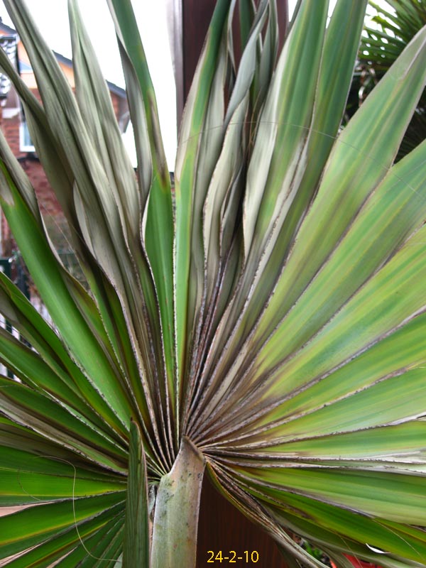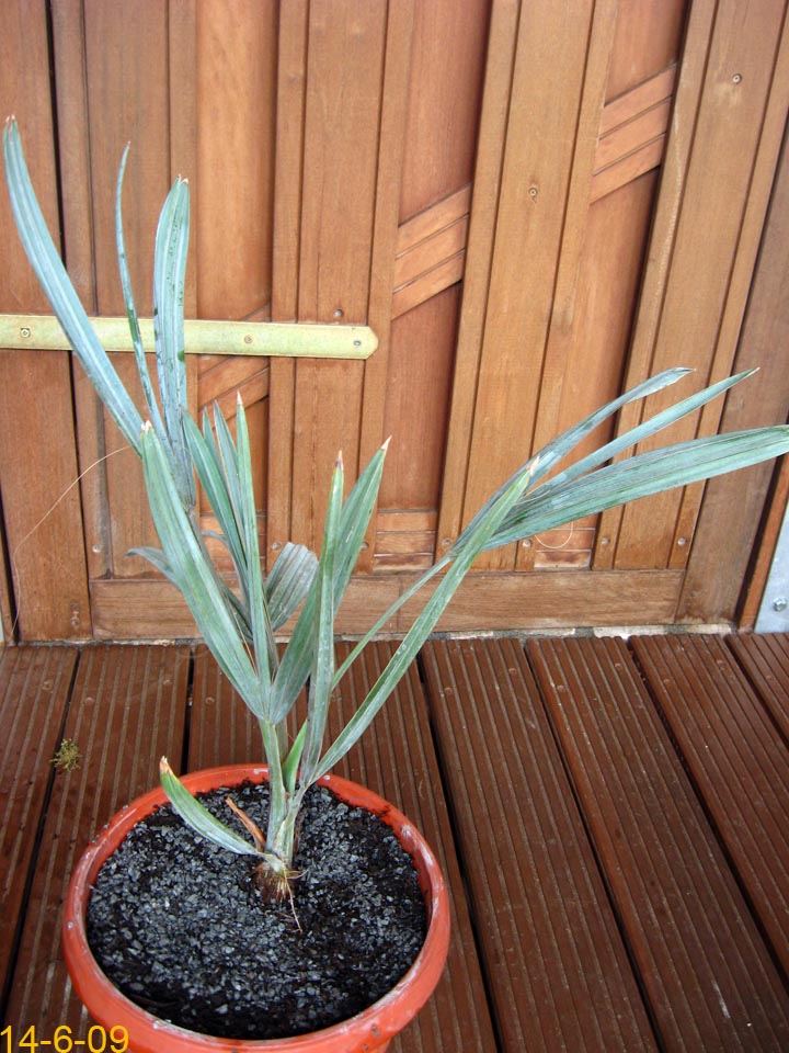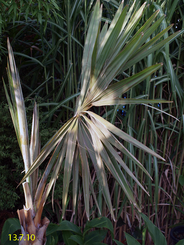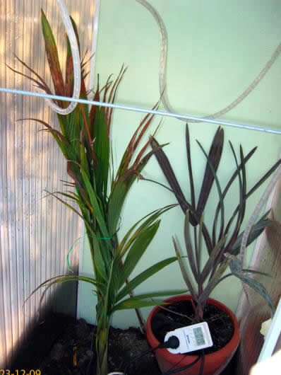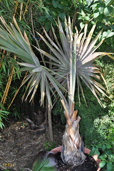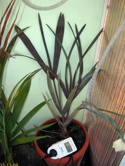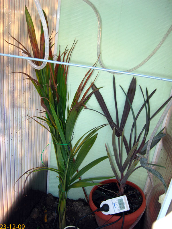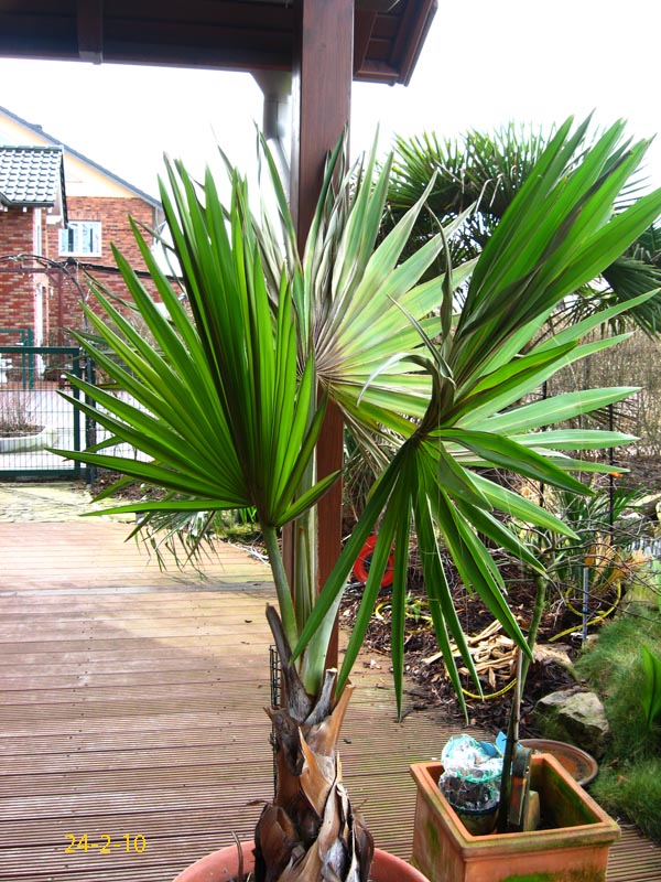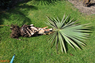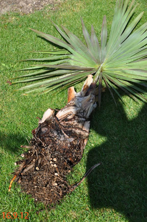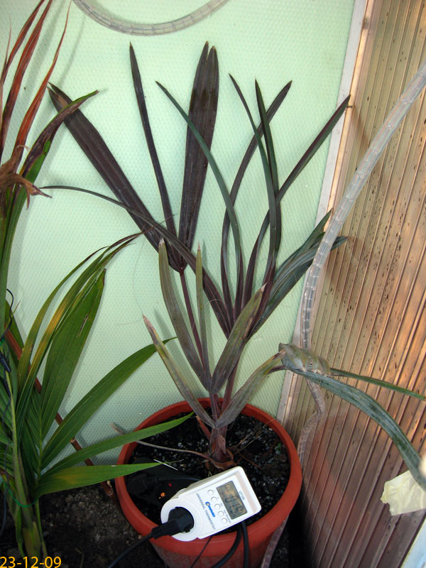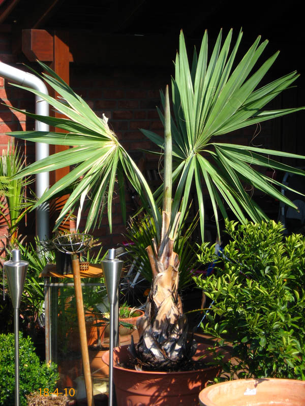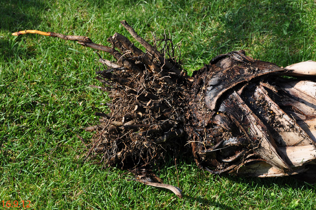 Diese kleine Bismarckia habe ich zu Testzwecken in einem ab -1°C beheizten Winterschutz einer anderen Palme untergebracht. Abgeschaltet wird die Beheizung bereits wieder bei 0°C. Bin gespannt, ob und wenn ja wie die Bismarckia diese Überwinterung verkraftet. Mit steigenden Temperaturn im April vertrockneten die Blätter und der Speer ließ sich ziehen. Ein Blick auf die Wurzeln zeigte einen Totalschaden, sämtliche Wurzeln waren abgestorben.