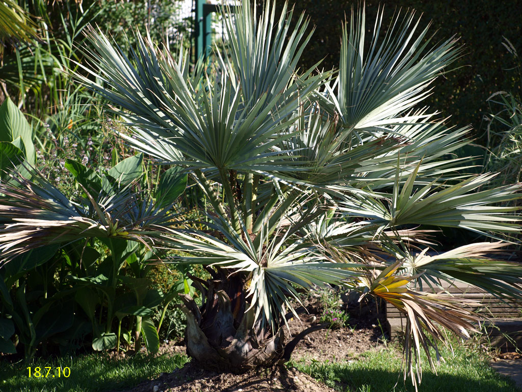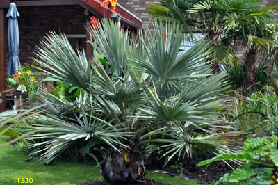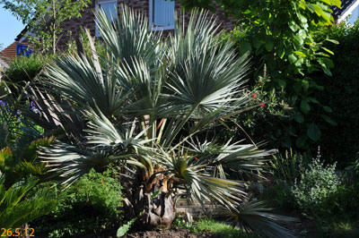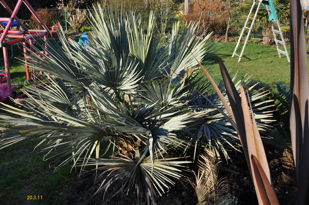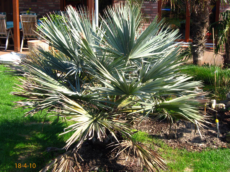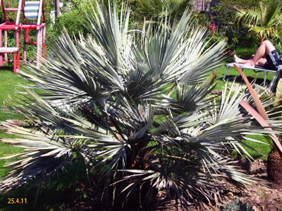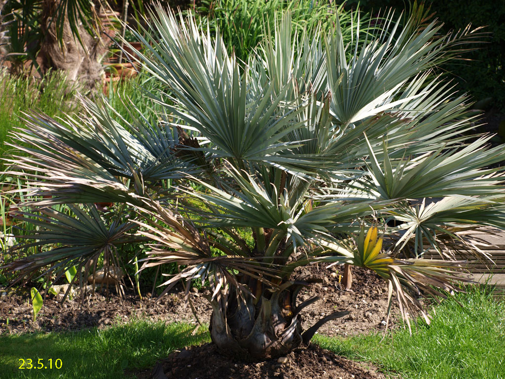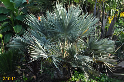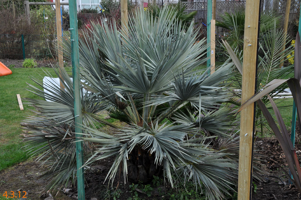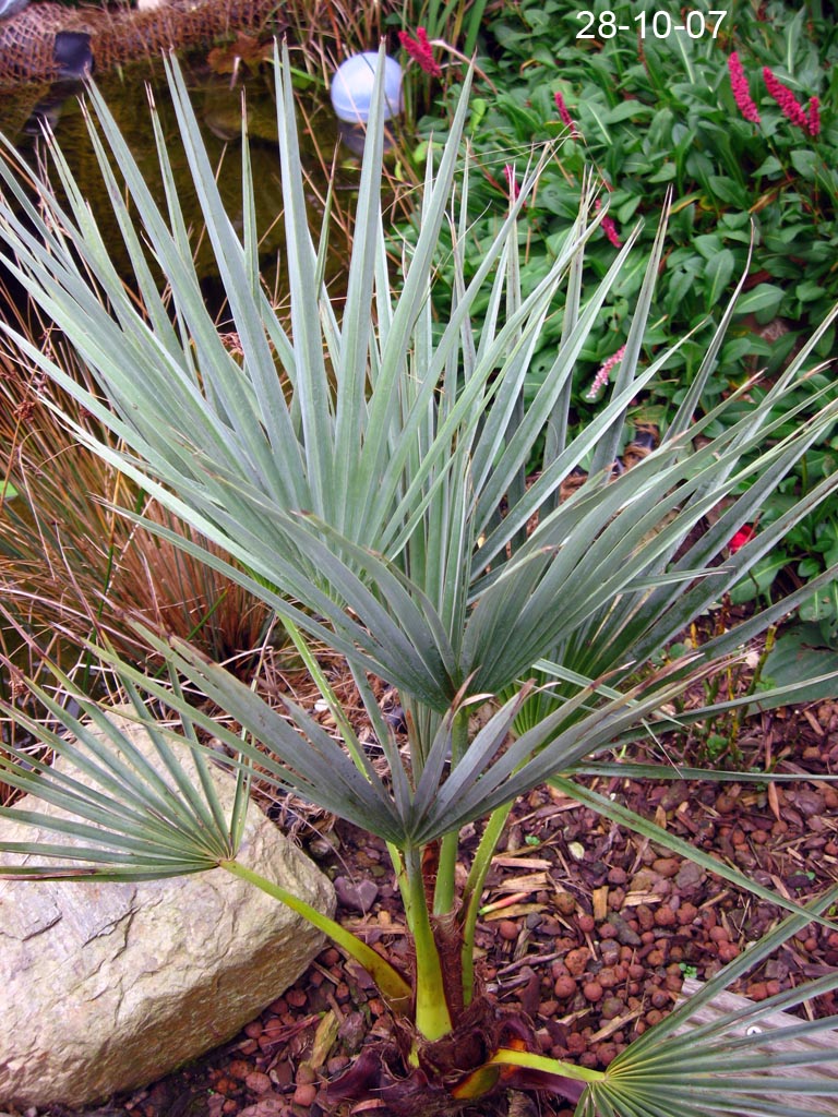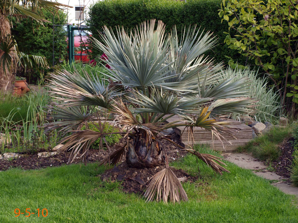 Brahea decumbensKlein bleibende Braheaart, die wenn überhaupt nur einen kleinen Stamm ausbildet. Während die Blätter der Jungpflanzen noch grün sind, entwickeln sie später mit zunehmendem Alter sehr schöne silberblaue Blätter. Diese Palme wächst überwiegend auf kalkhaltigen, steinigen Böden im Nordosten Mexikos und verträgt Kälte und Frost sehr gut (auf verschiedenen Internetseiten ist von bis zu -12°C die Rede). Wie alle Braheaarten bevorzugt sie volle Sonne. Das Wachstum soll sehr langsam sein. Fotos und Beschreibung siehe: http://www.pacsoa.org.au/palms/Brahea/decumbens.html 20092010Auch die B. decumbens hat bei -1,5°C überwintert. Auch ihr schadete ein Heizungsausfall mit kurzzeitig -11°C nicht. 2011Inzwischen habe ich die Decumbens ausgepflanzt Sie ist seitlich unter der großen Brahea gepflanzt und wird so künfig innerhalb des Winterschutzes stehen.