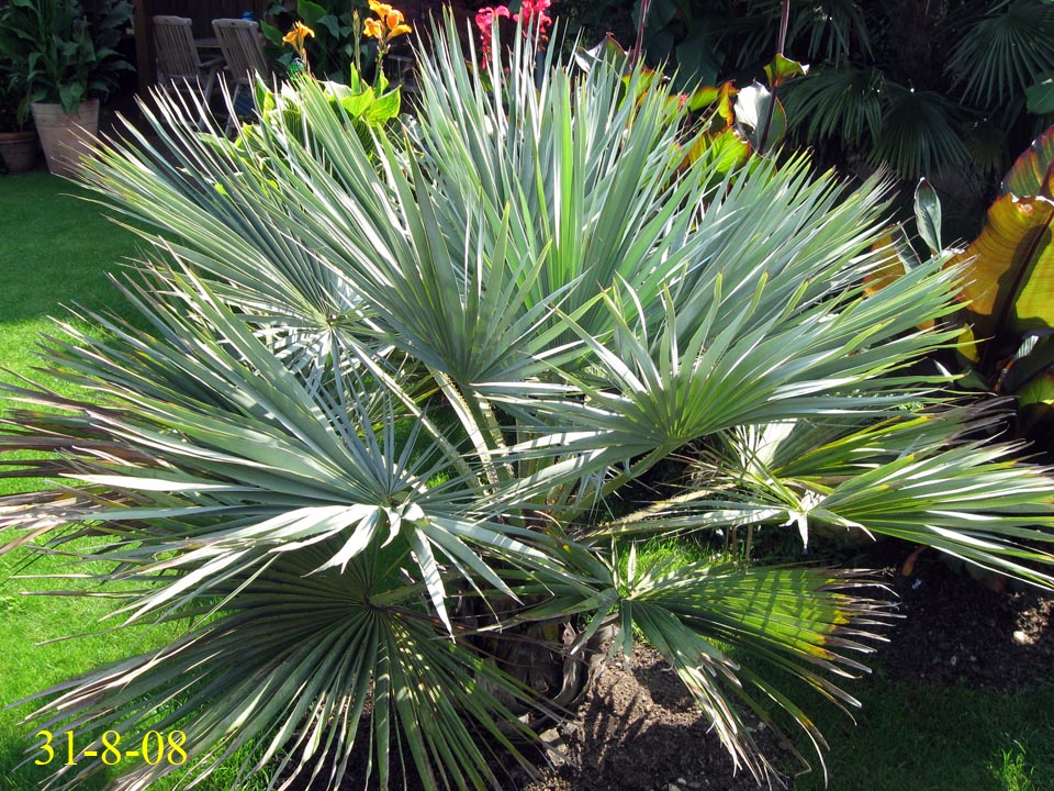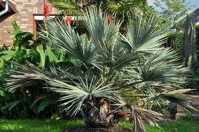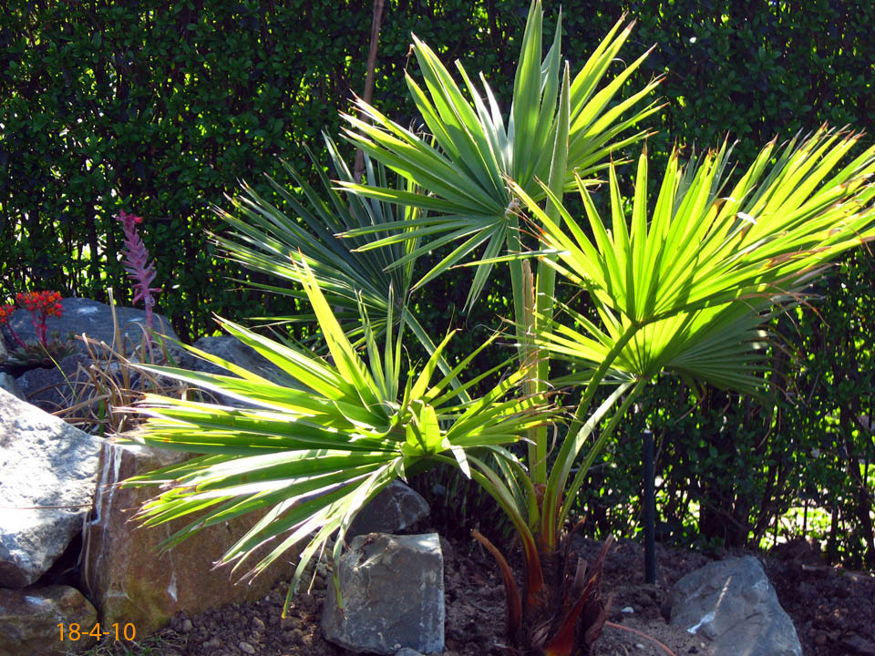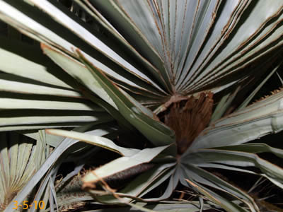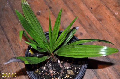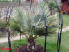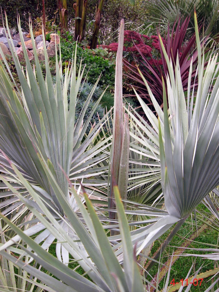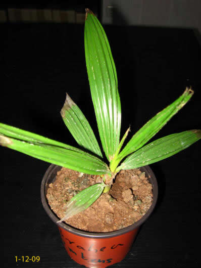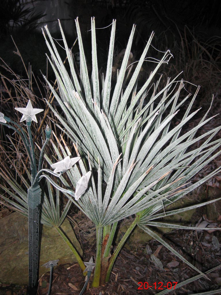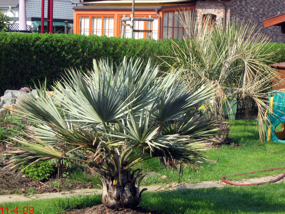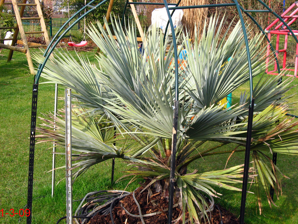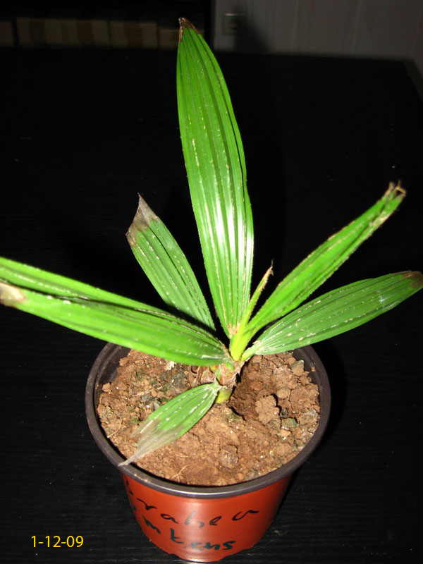 Brahea decumbensKlein bleibende Braheaart, die wenn überhaupt nur einen kleinen Stamm ausbildet. Während die Blätter der Jungpflanzen noch grün sind, entwickeln sie später mit zunehmendem Alter sehr schöne silberblaue Blätter. Diese Palme wächst überwiegend auf kalkhaltigen, steinigen Böden im Nordosten Mexikos und verträgt Kälte und Frost sehr gut (auf verschiedenen Internetseiten ist von bis zu -12°C die Rede). Wie alle Braheaarten bevorzugt sie volle Sonne. Das Wachstum soll sehr langsam sein. Fotos und Beschreibung siehe: http://www.pacsoa.org.au/palms/Brahea/decumbens.html 20092010Auch die B. decumbens hat bei -1,5°C überwintert. Auch ihr schadete ein Heizungsausfall mit kurzzeitig -11°C nicht. 2011Inzwischen habe ich die Decumbens ausgepflanzt Sie ist seitlich unter der großen Brahea gepflanzt und wird so künfig innerhalb des Winterschutzes stehen.
