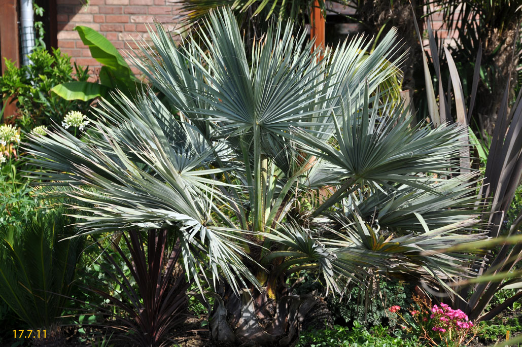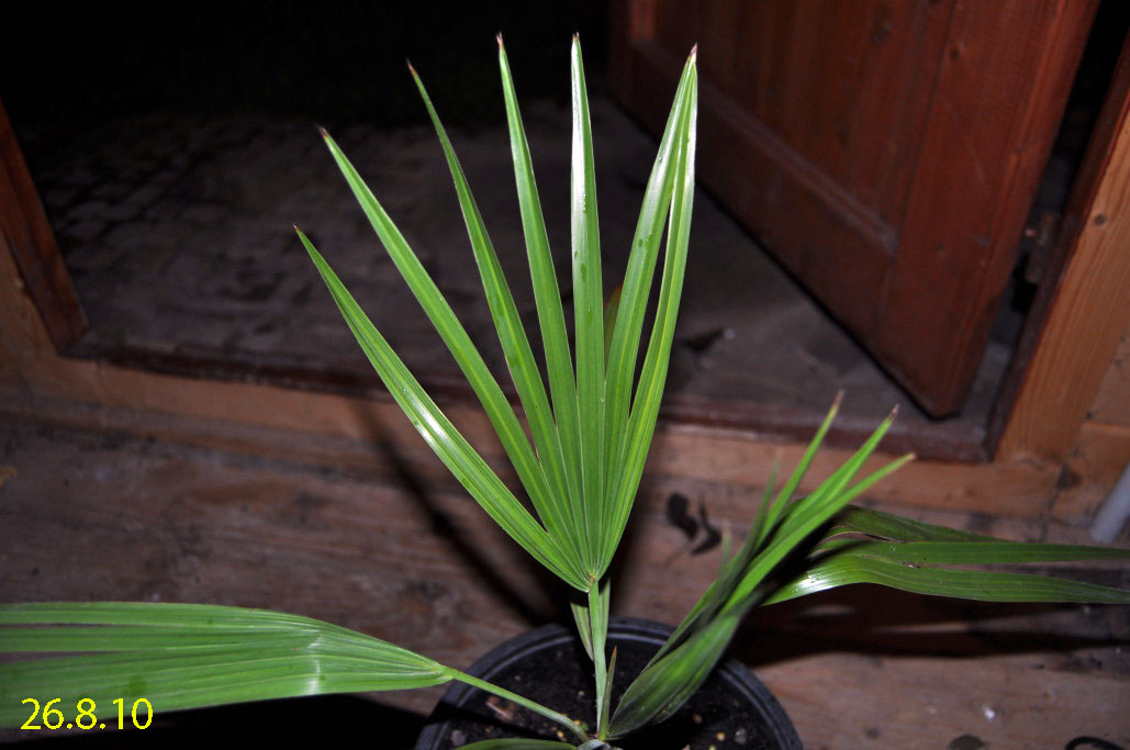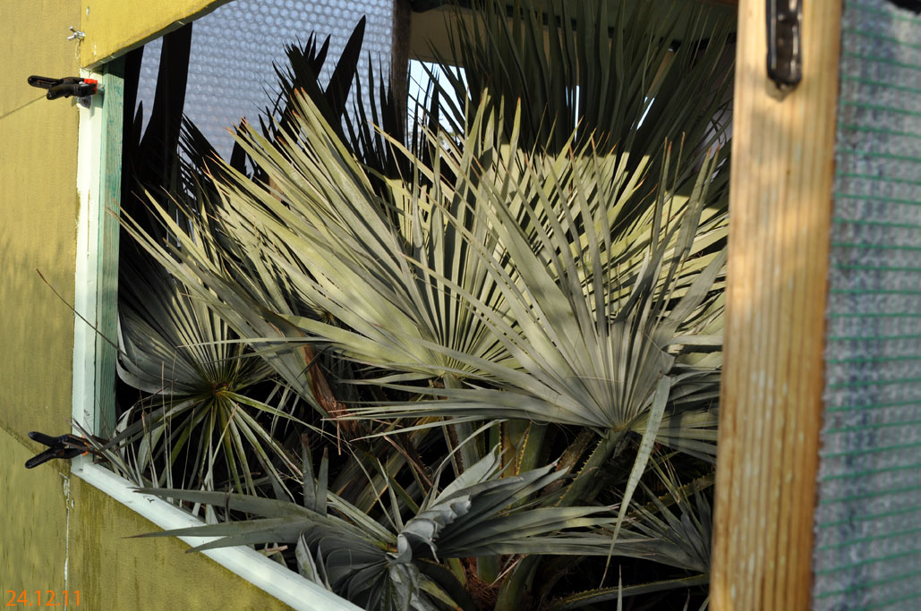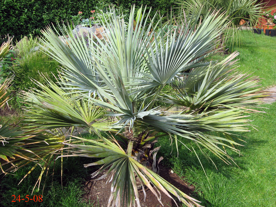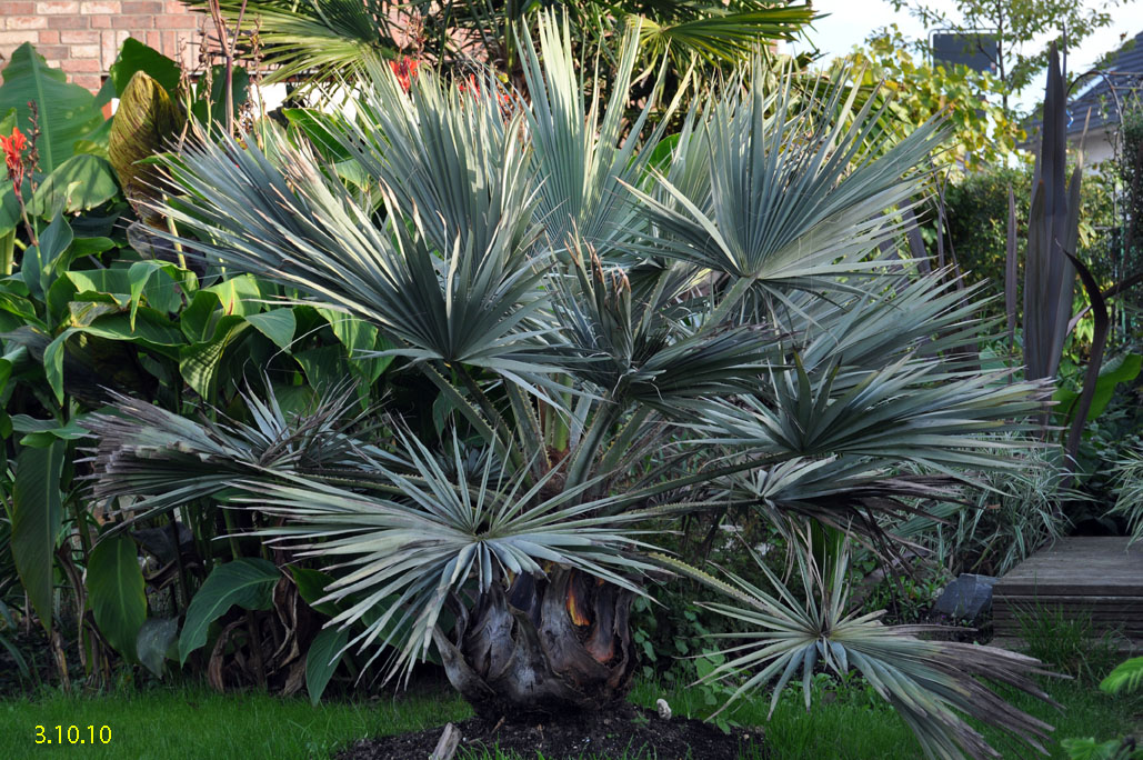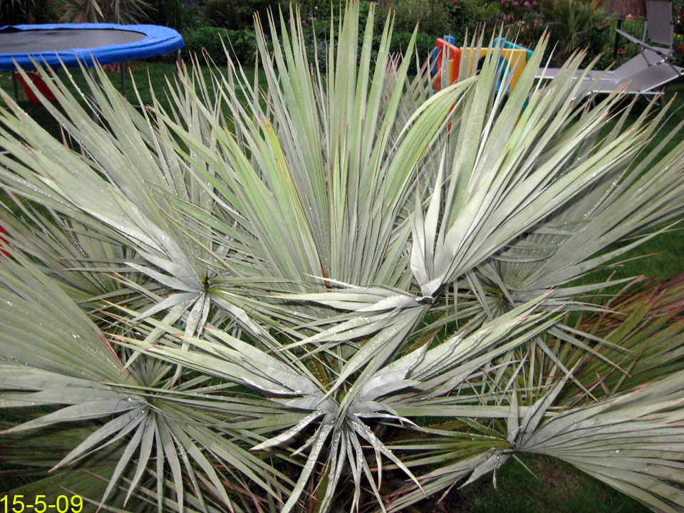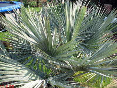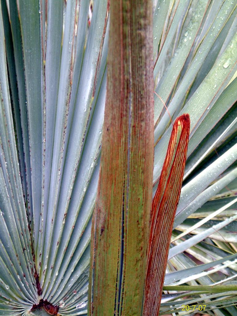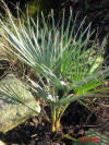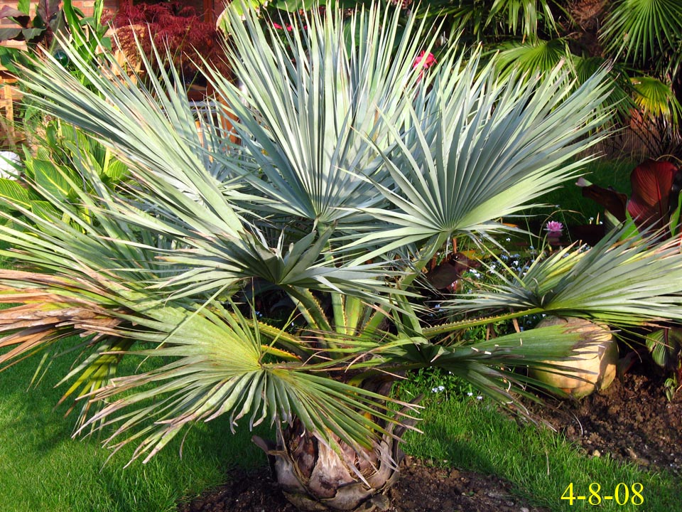Brahea decumbensKlein bleibende Braheaart, die wenn überhaupt nur einen kleinen Stamm ausbildet. Während die Blätter der Jungpflanzen noch grün sind, entwickeln sie später mit zunehmendem Alter sehr schöne silberblaue Blätter. Diese Palme wächst überwiegend auf kalkhaltigen, steinigen Böden im Nordosten Mexikos und verträgt Kälte und Frost sehr gut (auf verschiedenen Internetseiten ist von bis zu -12°C die Rede). Wie alle Braheaarten bevorzugt sie volle Sonne. Das Wachstum soll sehr langsam sein. Fotos und Beschreibung siehe: http://www.pacsoa.org.au/palms/Brahea/decumbens.html 20092010Auch die B. decumbens hat bei -1,5°C überwintert. Auch ihr schadete ein Heizungsausfall mit kurzzeitig -11°C nicht. 2011Inzwischen habe ich die Decumbens ausgepflanzt Sie ist seitlich unter der großen Brahea gepflanzt und wird so künfig innerhalb des Winterschutzes stehen.