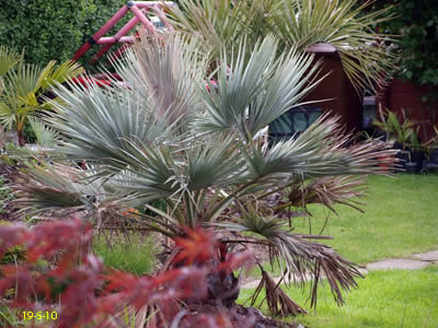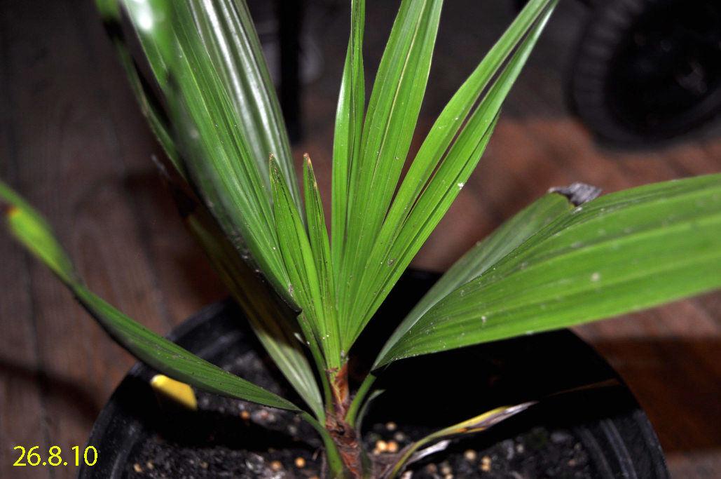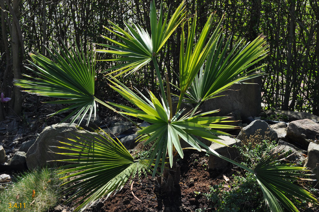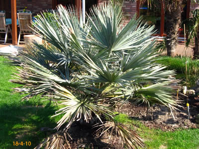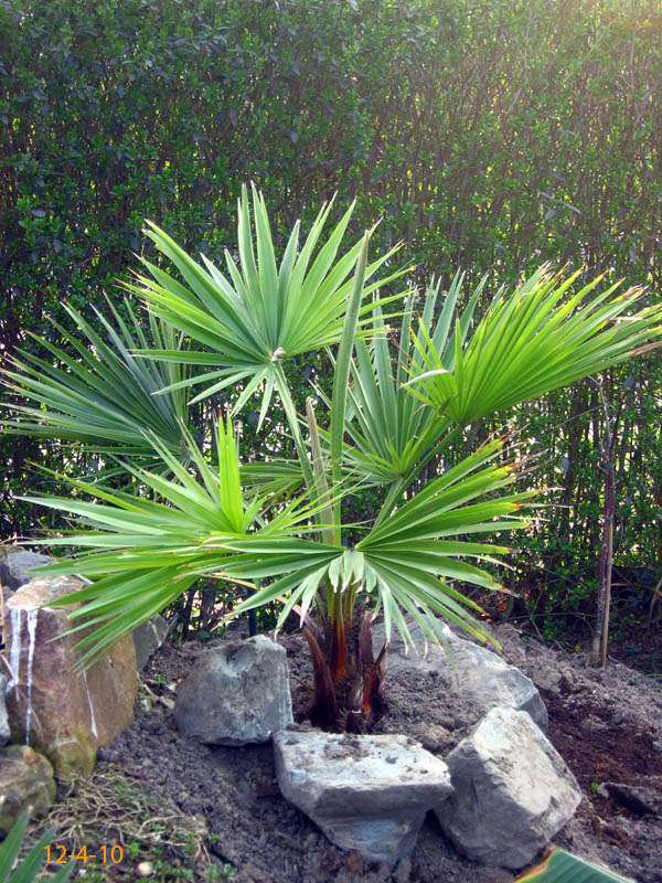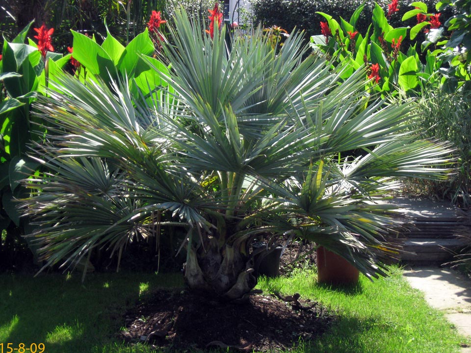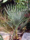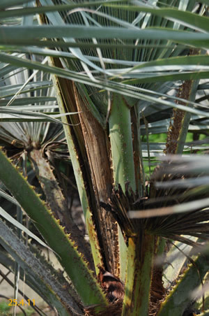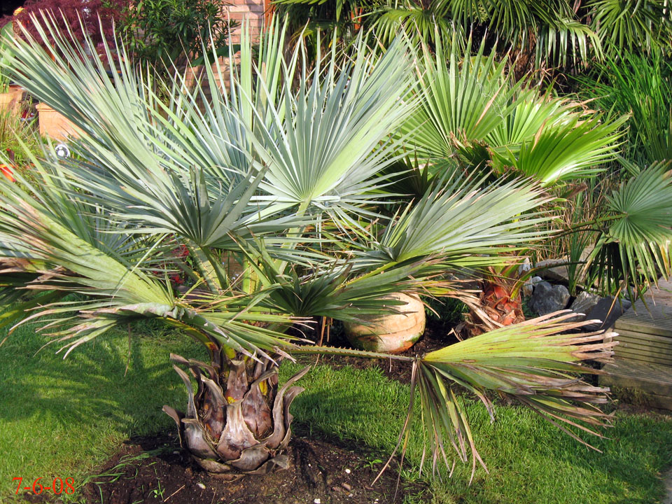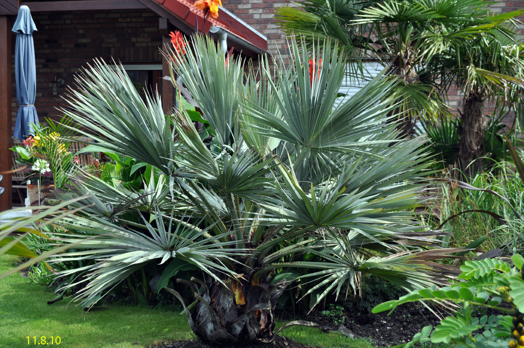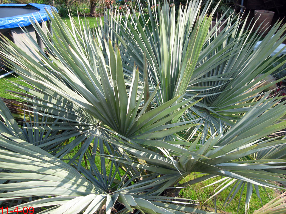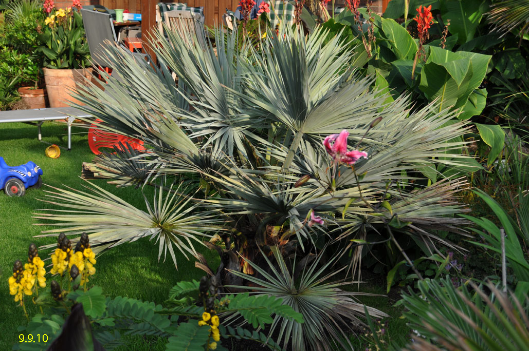 Brahea decumbensKlein bleibende Braheaart, die wenn überhaupt nur einen kleinen Stamm ausbildet. Während die Blätter der Jungpflanzen noch grün sind, entwickeln sie später mit zunehmendem Alter sehr schöne silberblaue Blätter. Diese Palme wächst überwiegend auf kalkhaltigen, steinigen Böden im Nordosten Mexikos und verträgt Kälte und Frost sehr gut (auf verschiedenen Internetseiten ist von bis zu -12°C die Rede). Wie alle Braheaarten bevorzugt sie volle Sonne. Das Wachstum soll sehr langsam sein. Fotos und Beschreibung siehe: http://www.pacsoa.org.au/palms/Brahea/decumbens.html 20092010Auch die B. decumbens hat bei -1,5°C überwintert. Auch ihr schadete ein Heizungsausfall mit kurzzeitig -11°C nicht. 2011Inzwischen habe ich die Decumbens ausgepflanzt Sie ist seitlich unter der großen Brahea gepflanzt und wird so künfig innerhalb des Winterschutzes stehen.