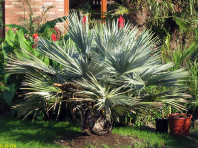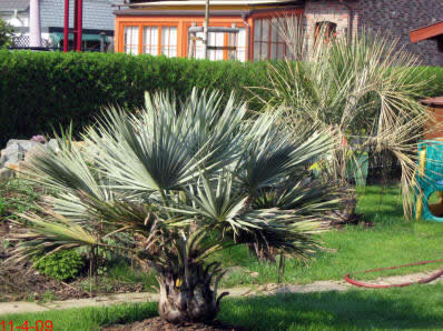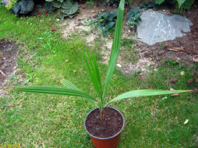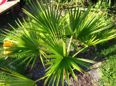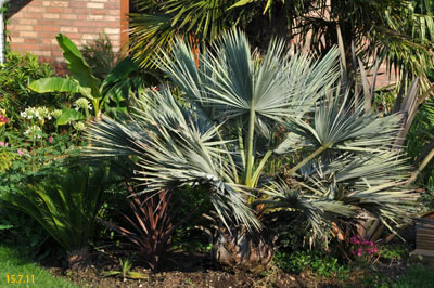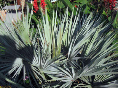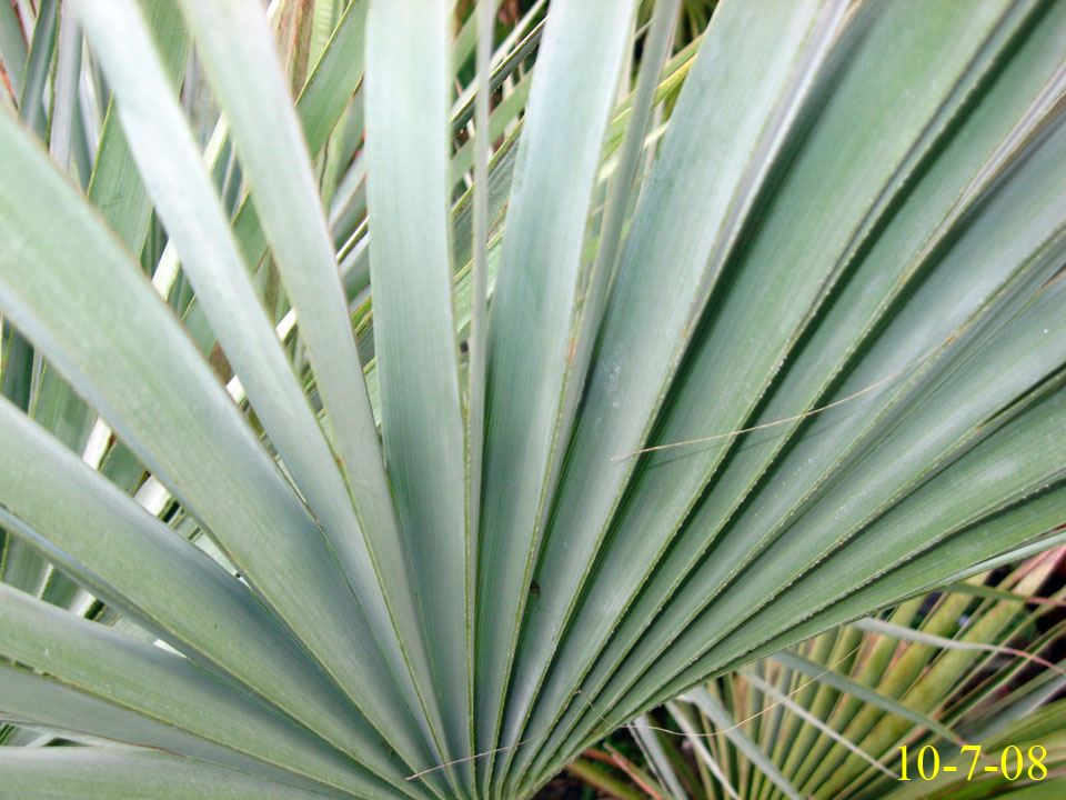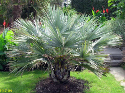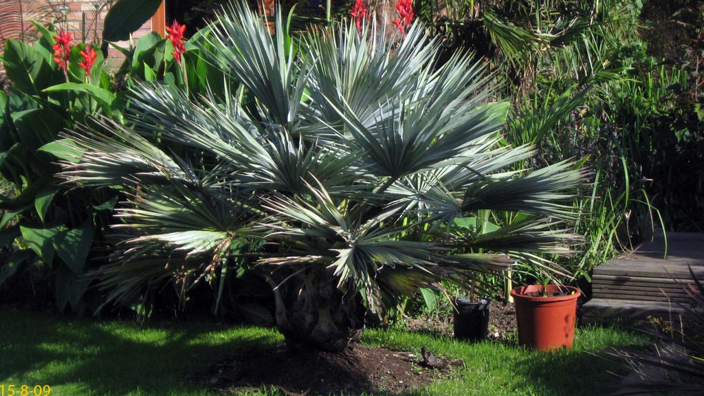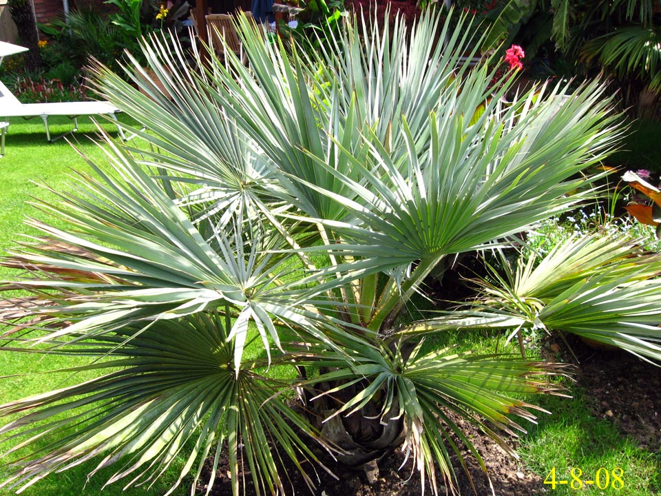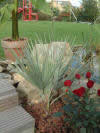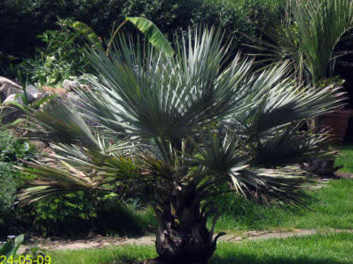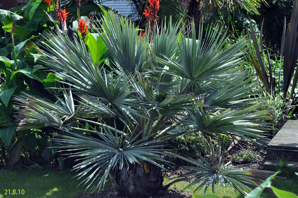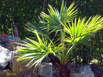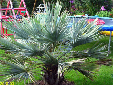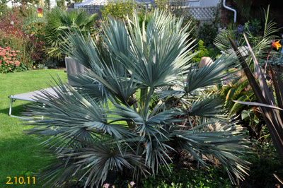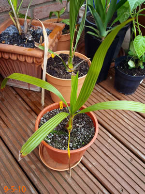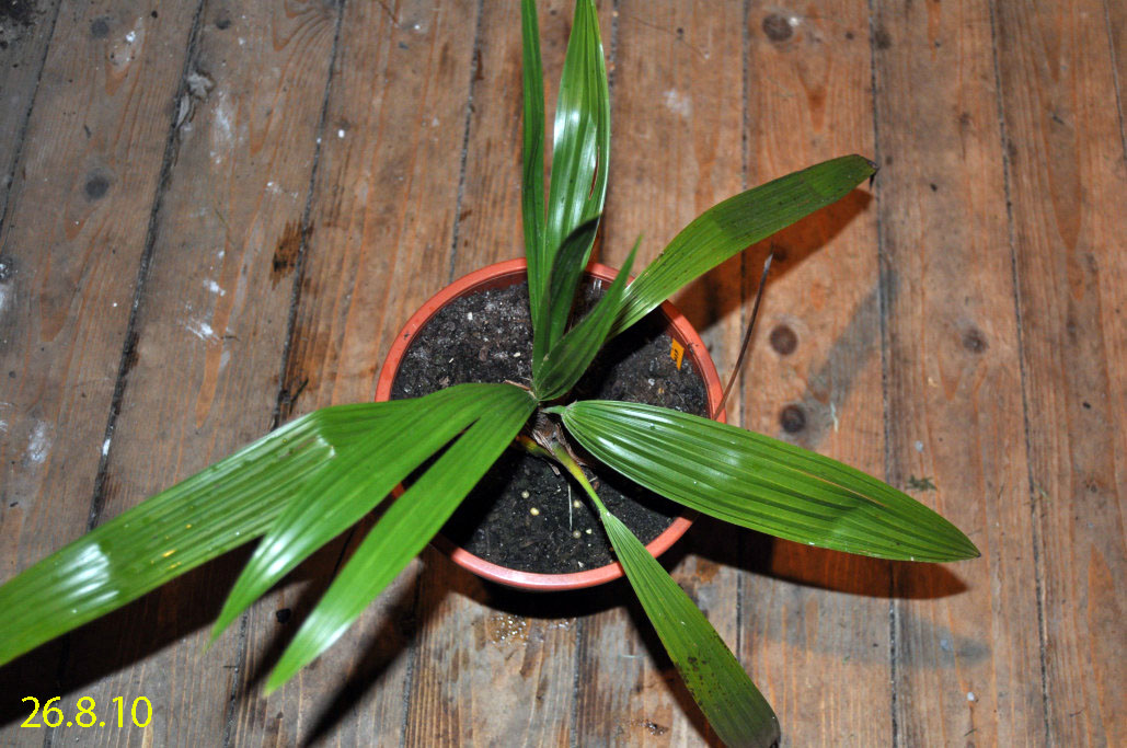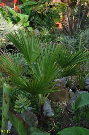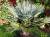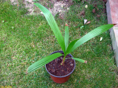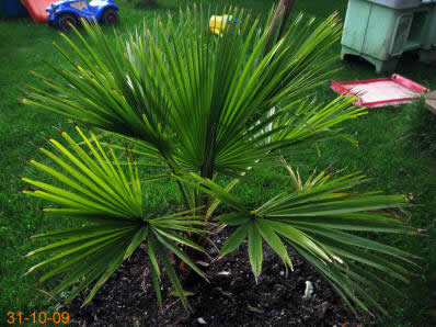 Brahea decumbensKlein bleibende Braheaart, die wenn überhaupt nur einen kleinen Stamm ausbildet. Während die Blätter der Jungpflanzen noch grün sind, entwickeln sie später mit zunehmendem Alter sehr schöne silberblaue Blätter. Diese Palme wächst überwiegend auf kalkhaltigen, steinigen Böden im Nordosten Mexikos und verträgt Kälte und Frost sehr gut (auf verschiedenen Internetseiten ist von bis zu -12°C die Rede). Wie alle Braheaarten bevorzugt sie volle Sonne. Das Wachstum soll sehr langsam sein. Fotos und Beschreibung siehe: http://www.pacsoa.org.au/palms/Brahea/decumbens.html 20092010Auch die B. decumbens hat bei -1,5°C überwintert. Auch ihr schadete ein Heizungsausfall mit kurzzeitig -11°C nicht. 2011Inzwischen habe ich die Decumbens ausgepflanzt Sie ist seitlich unter der großen Brahea gepflanzt und wird so künfig innerhalb des Winterschutzes stehen.