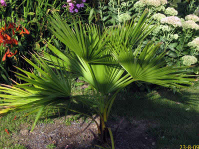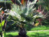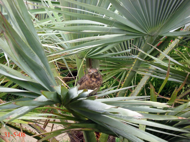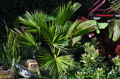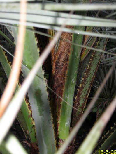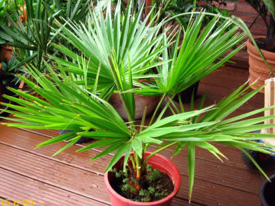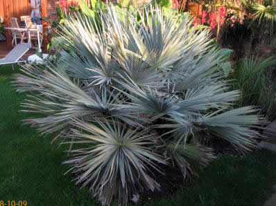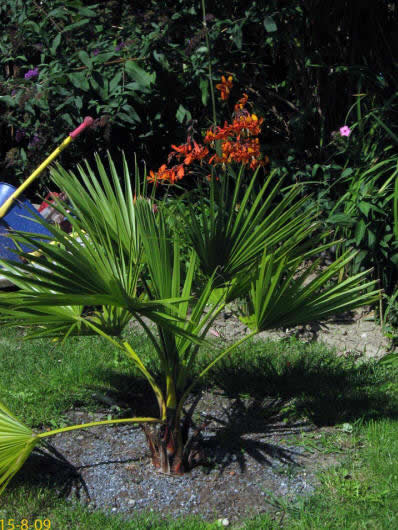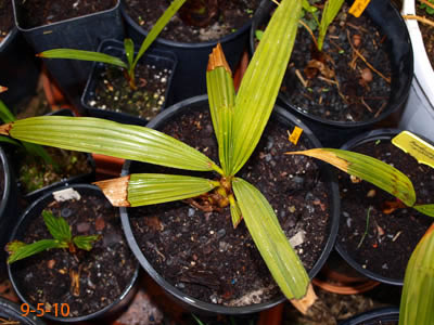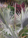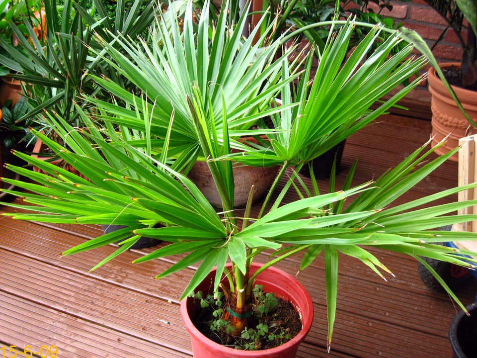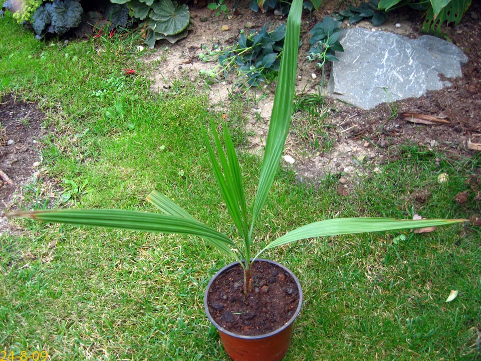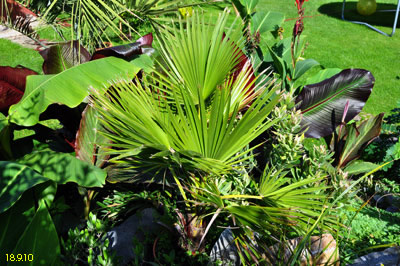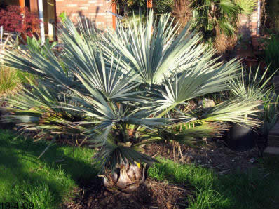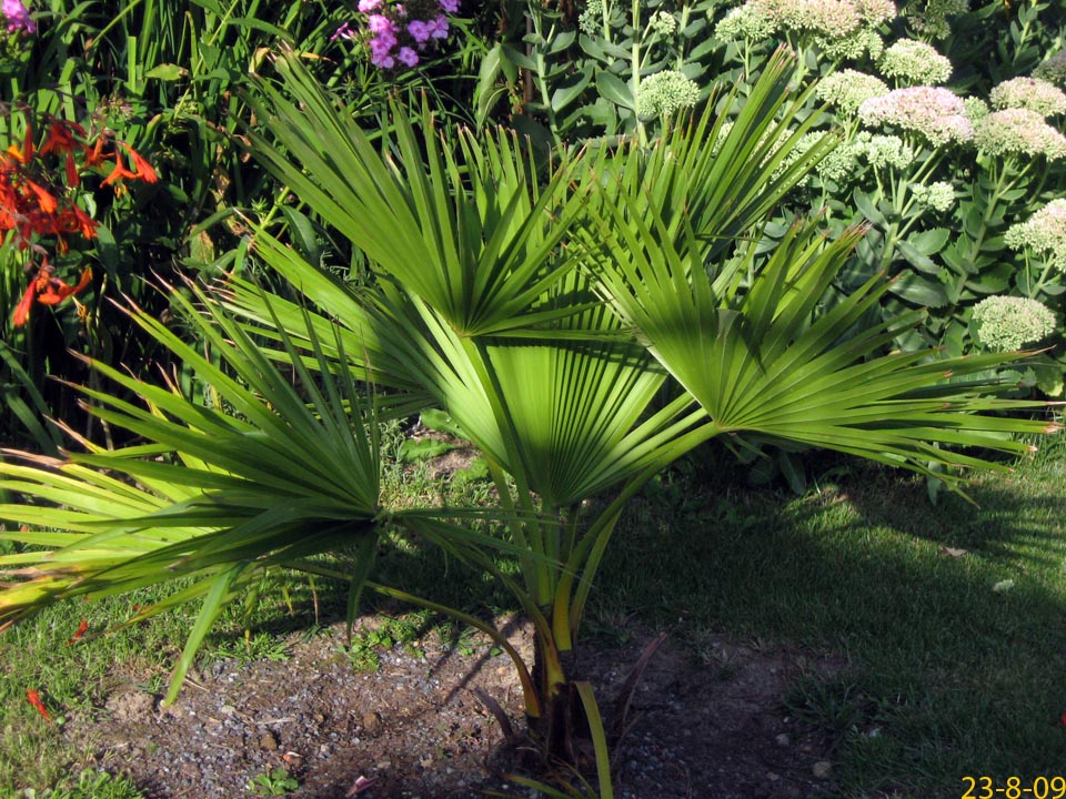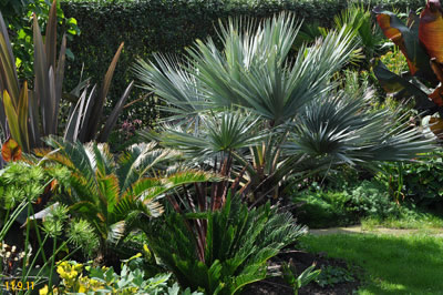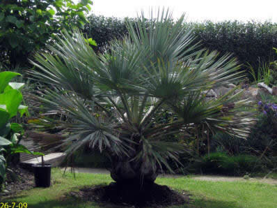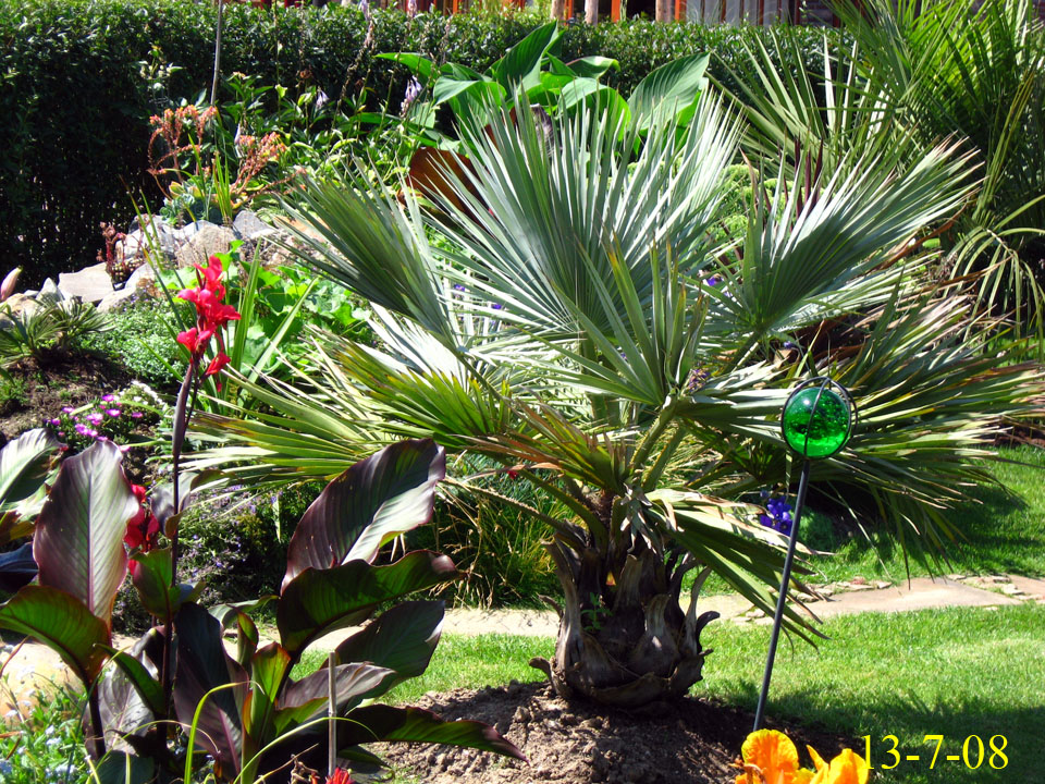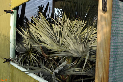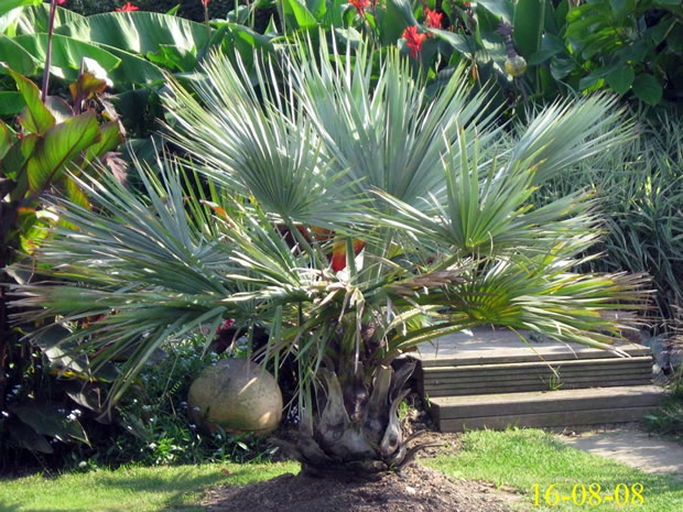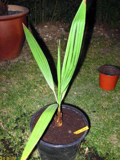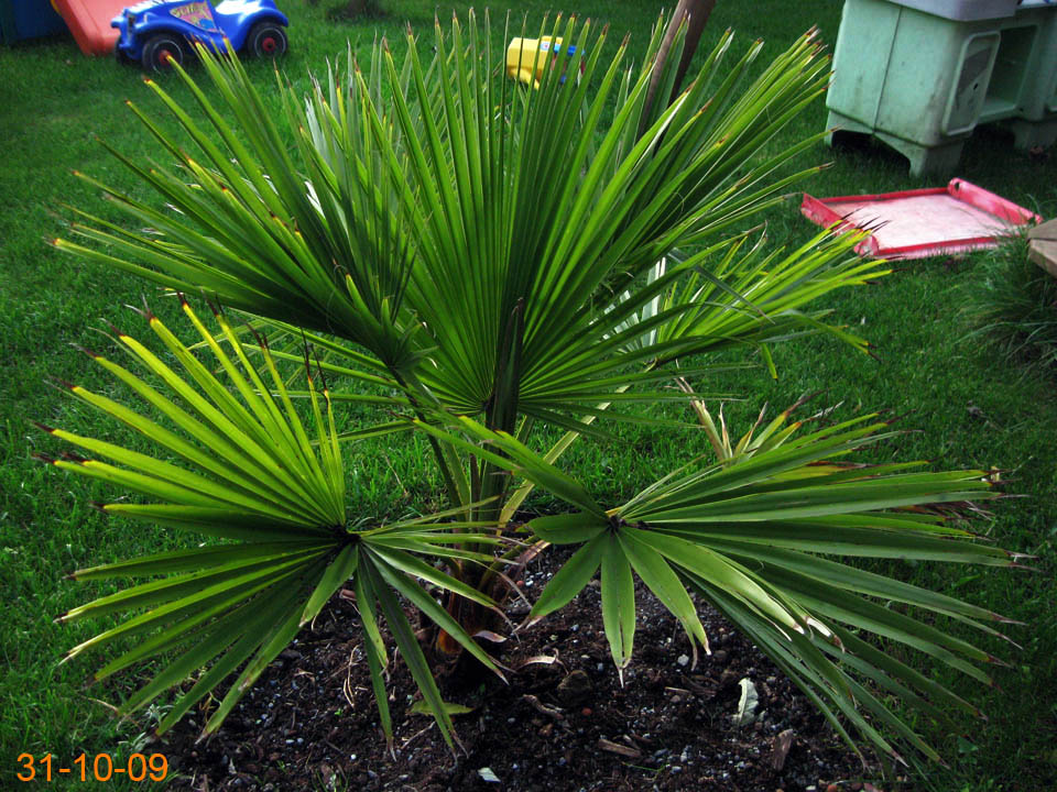 Brahea decumbensKlein bleibende Braheaart, die wenn überhaupt nur einen kleinen Stamm ausbildet. Während die Blätter der Jungpflanzen noch grün sind, entwickeln sie später mit zunehmendem Alter sehr schöne silberblaue Blätter. Diese Palme wächst überwiegend auf kalkhaltigen, steinigen Böden im Nordosten Mexikos und verträgt Kälte und Frost sehr gut (auf verschiedenen Internetseiten ist von bis zu -12°C die Rede). Wie alle Braheaarten bevorzugt sie volle Sonne. Das Wachstum soll sehr langsam sein. Fotos und Beschreibung siehe: http://www.pacsoa.org.au/palms/Brahea/decumbens.html 20092010Auch die B. decumbens hat bei -1,5°C überwintert. Auch ihr schadete ein Heizungsausfall mit kurzzeitig -11°C nicht. 2011Inzwischen habe ich die Decumbens ausgepflanzt Sie ist seitlich unter der großen Brahea gepflanzt und wird so künfig innerhalb des Winterschutzes stehen.