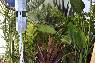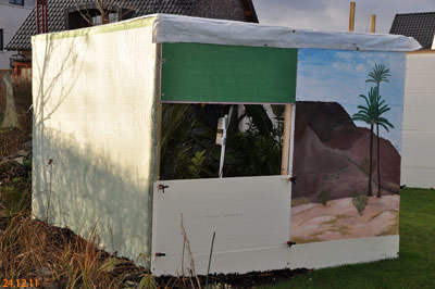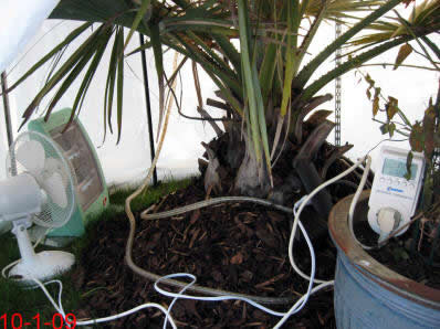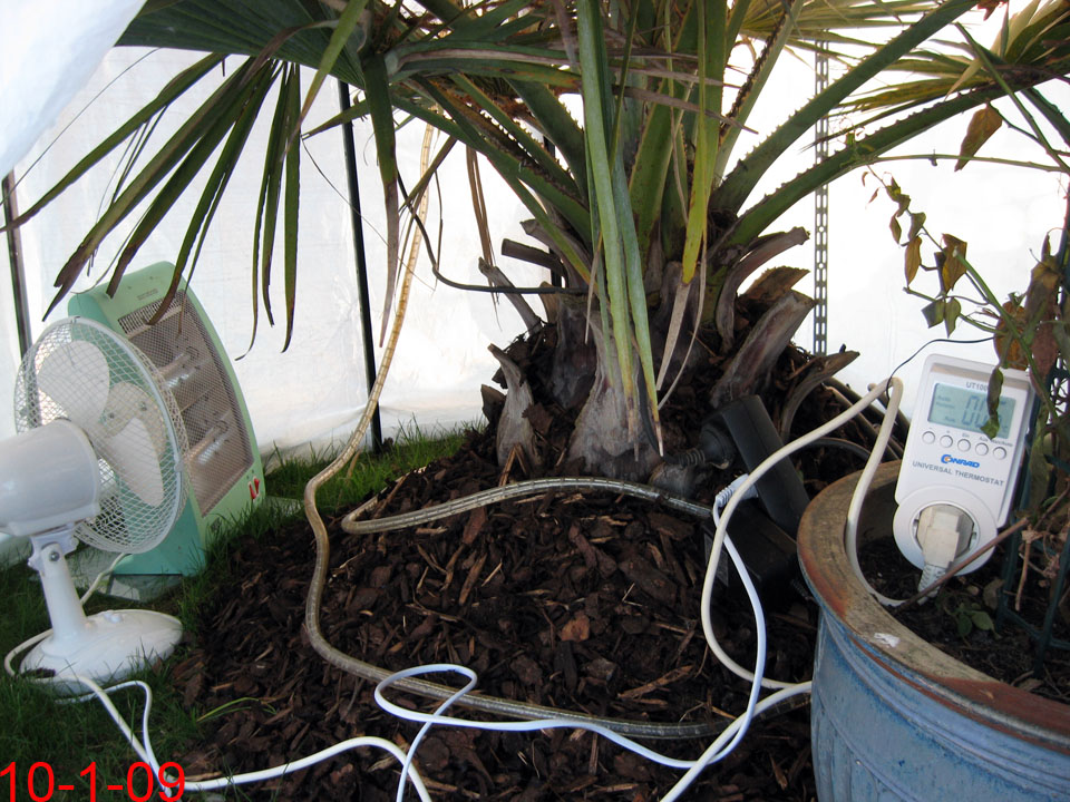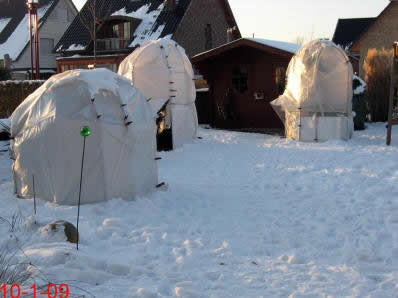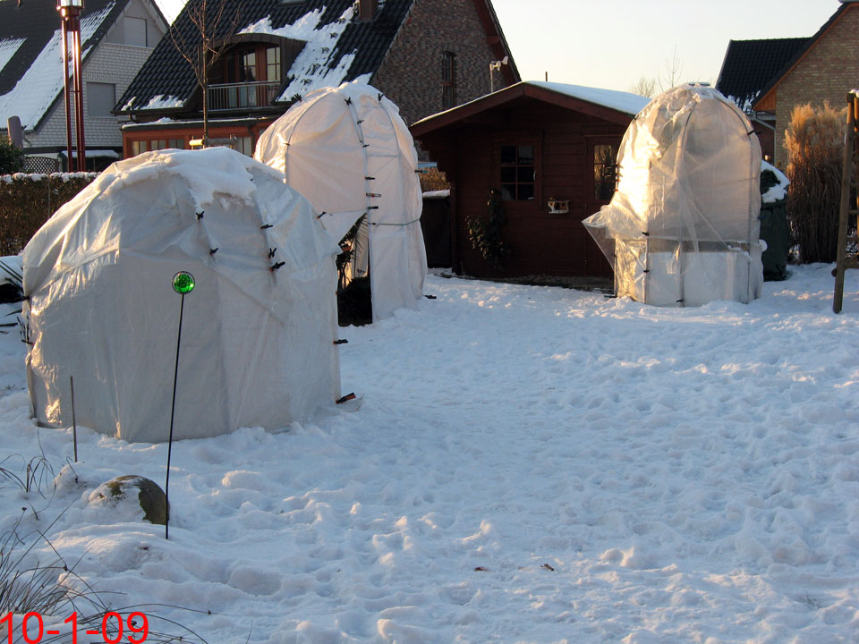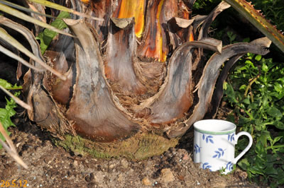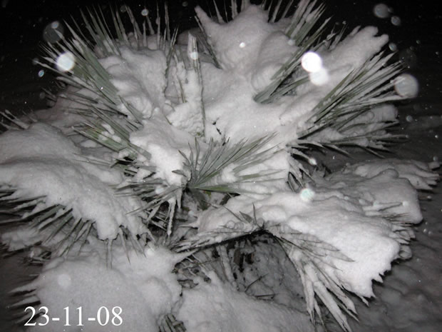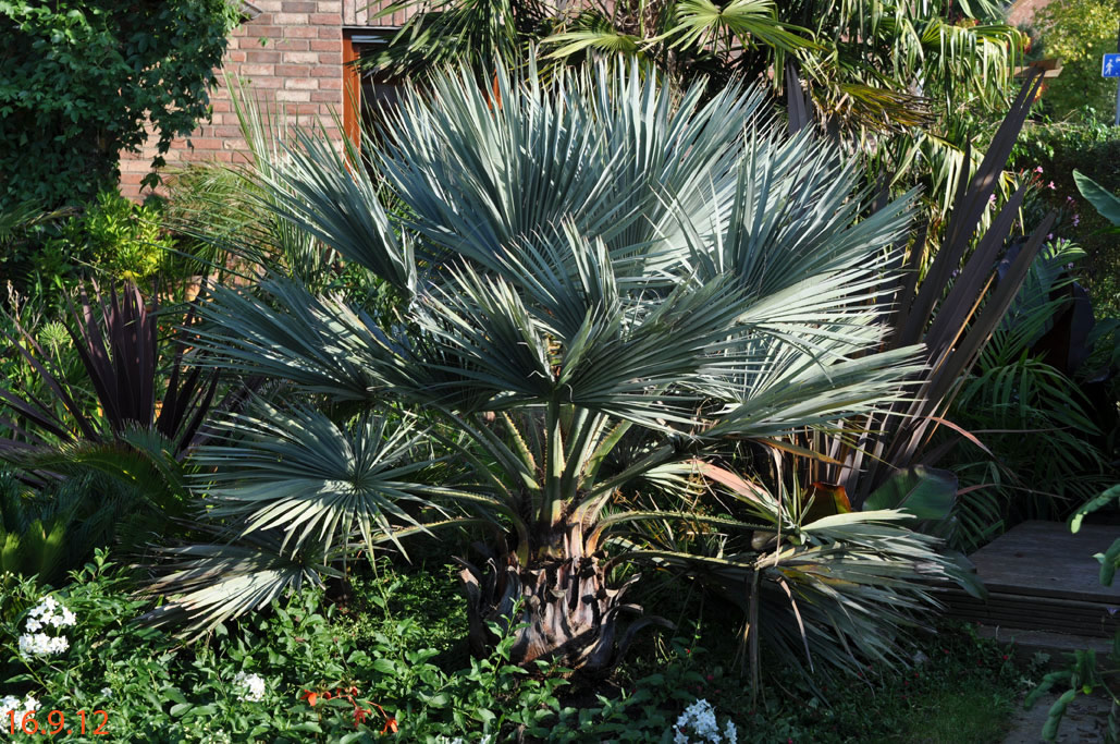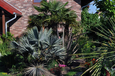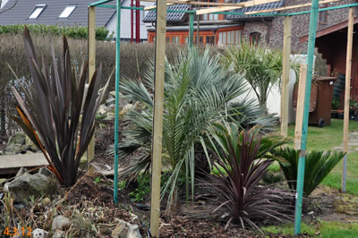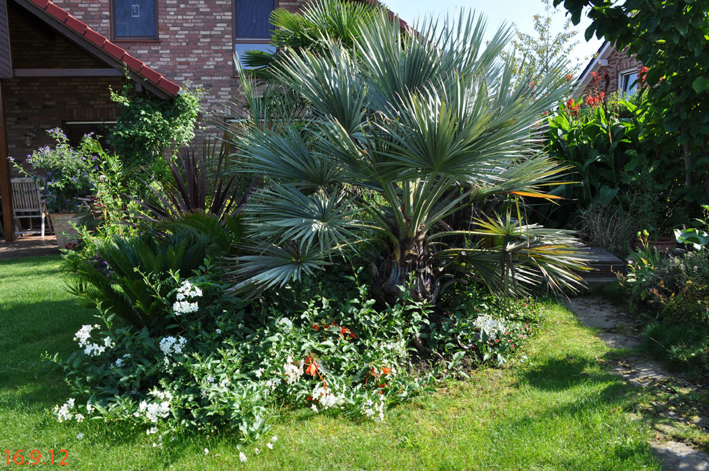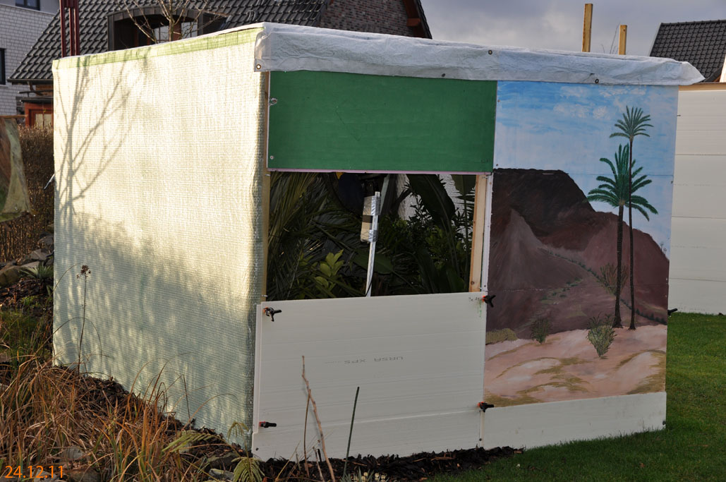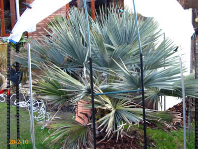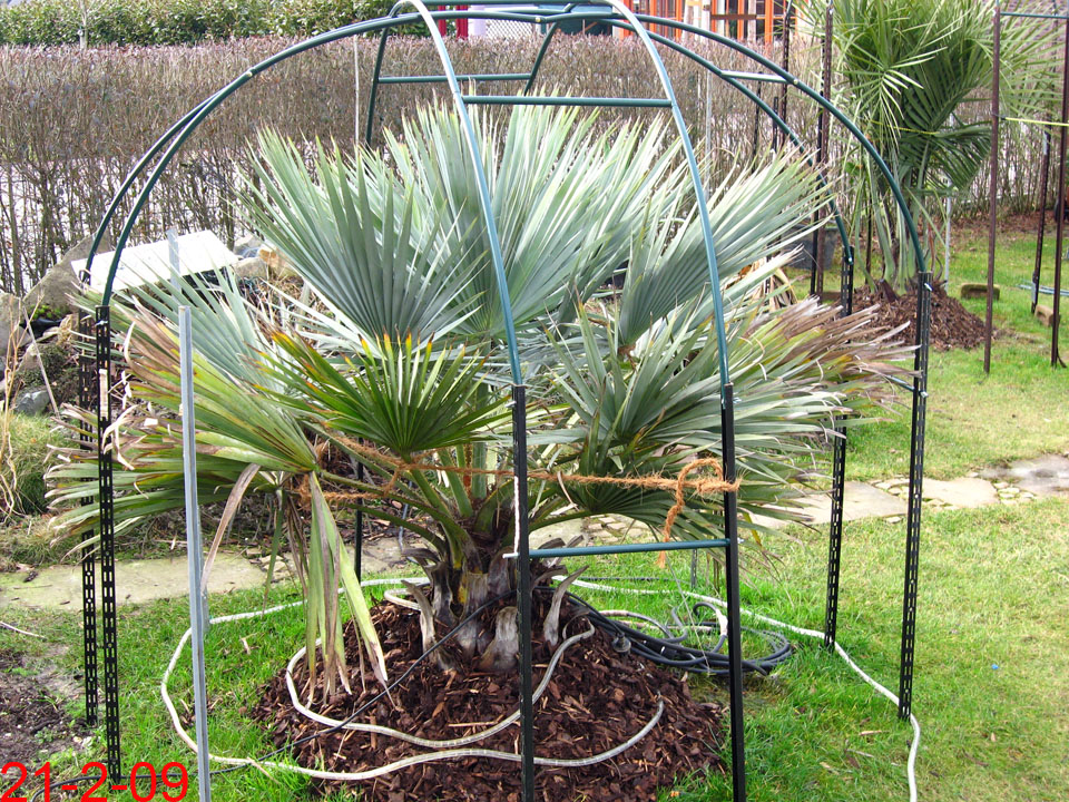 BRAHEAB.armata - B.edulis - B. clara - B. dulcis - B. decumbens - B."super silver"Brahea armata (S. Watson) – Blaue HesperidenpalmeBrahea armata ist m.E. eine der schönsten Fächerpalmen mit ihren silberblauen Blättern, die hier bei mir sogar die Färbung der Bismarckia nobilis verblassen lässt. Während Bismarckia sehr hohe Temperaturen und viel Sonne benötigt um eine wirklich schöne Färbung zu erreichen, behält Brahea auch bei kühleren Temperaturen ihre wunderschöne Färbung. Natürlich sollte man der Brahea, die in der Natur aus Wüstengebieten Nordwest-Mexikos stammt und dort häufig mit Washingtonien anzutreffen ist dennoch einen möglichst sonnigen und warmen Platz im Garten gönnen, damit sie sich auch wohl fühlt. So habe ich meine Brahea bewusst etwas erhöht gepflanzt, damit sich der Wurzelbereich im Frühjahr schneller erwärmen kann. Brahea armata kann bis zu 17m hoch werden, bleibt aber in der Regel deutlich kleiner (10-12m). Die Blattstiele sind gefährlich bedornt und dabei äußerst starr, so dass man beim Hantieren an dieser Palme sehr vorsichtig sein sollte. Ich habe ihr aus diesem Grund dieses Jahr einen extra großen Winterschutz gebaut, um die Blätter nicht zusammen binden zu müssen. Beeindruckend sind die gewaltigen, mehrere Meter langen Blütenstände großer Brahea, die kleine, weiße, zwittrige Blüten bilden. Bin gespannt, wann meine Brahea das erste Mal zur Blüte kommt…. Trotz ihrer Herkunft (Wüstenregion) und entgegen dem, was man allgemein über die Kultivierung von Brahea liest, denke ich, dass diese Palme oft unterschätzt wird. Meine Palme hat bevor ich sie bekam etwa 10 Jahre in Holland im Kübel versenkt im Freien gestanden und mehrmals Temperaturen unter -10°C schadlos überstanden. Auch mit Nässe hatten meine Braheas nie Probleme – weder von oben in Form von Regen, Nassschnee, oder auch durch Bodennässe, oder zu hohe Luftfeuchtigkeit. Bei mir hier liegt gerade im Winter die Luftfeuchtigkeit meist im Bereich zwischen 90 und 100%. Wichtig ist ein guter Wurzelschutz, da ihr Bodenfrost aus ihrer Heimat unbekannt sein dürfte, obwohl ich denke, dass sie auch in dieser Beziehung gut geschützt ist wenn sie erstmal etabliert ist, da sie ein sehr kräftiges und auch in die tiefe gehendes Wurzelsystem bildet. Bereits ein Jahr nach der Auspflanzung habe ich beim Graben in über einem Meter Entfernung kräftige Braheawurzeln entdeckt. 2014201225.9.12 - Die Saison neigt sich leider langsam dem Ende zu und so wirds Zeit für ein kleines Resümee. Die Brahea hat sich dieses Jahr wieder einmal toll entwickelt, obwohl der Sommer eher mäßig, teilweise zumindest im Frühsommer sehr kühl war. Ich denke, dass die positive Entwicklung auch auf meinen neuen Winterschutz zurückzuführen ist. Im Gegensatz zu den letzten Jahren wurde ab -4°C statt wie bisher ab -8°C geheizt, so dass es keinerlei Schäden gab. Der Schutz war hell und im Gegensatz zu den letzten Jahren habe ich den Schutz während kalter Phasen geschlossen gehalten. So konnte sich das Innere selbst im Winter tagsüber auf 20-25°C erwärmen. Ich denke, diese Tageserwärmung ist für diese Palme, wie auch für einige andere Arten wie z.B. Washingtonia, die auch im Winter kaum abhärten sehr vorteilhaft. Inzwischen fallen die untersten Blattbasen ab, so dass der echte Stamm sichtbar wird und die Brahea, die bisher sehr kompakt gewachsen ist gewinnt nun deutlich an Höhe. 26.5.12 - Die Brahea startet dieses Jahr wieder super. Die relativ milde Überwinterung im neuen Winterschutz hat ihr sichtlich gut gefallen. Momentan wächst sie sogar schneller als Washingtonia und öffnet aktuell drei Blätter gleichzeitig, wodurch es allerdings zu einem kleinen Blattstau kommt. ;-) Aktuell beginnt nun scheinbar die Bildung des echten Stamms 4.3.12 - Heute habe ich den Winterschutz abgebaut. Sämtliche Pflanzen im Beet sehen prima aus. Die Brahea macht einen sehr guten Eindruck und der neueste Speer steht bereits kurz davor sich zu öffnen. 28.2.12 Diesen Winter hat meine Brahea einen neuen Winterschutz bekommen, da ich ja zuvor rings um die Brahea ein neues Beet mit Parajubaea, zwei C. revoluta und einer roten Cordyline angelegt hatte. Dementsprechend mußte ein größerer Winterschutz her, der wegen der empfindlicheren Pflanzen auch besser isoliert sein sollte als bisher. Da ich aber dennoch unbedingt einen hellen Schutz wollte, habe ich mich für eine Kombination aus Styrodur und doppelter Lupofolie entschieden. Die Maße des Schutzes betragen zur Zeit 2,5m x 2,5m x 2m, so dass ich auch noch viele Kübelpflanzen im Schutz unterbringen konnte, insbesondere Citrus, da sie unbedingt hell überwintert werden wollen. Zusätzlich habe ich aber auch viele Palmen und versuchsweise auch eine Musella lasiocarpa und eine Strelitzie im ab -4°C beheizten Schutz untergestellt. Ein möglichst vollgepfropfter Winterschutz hält die Tageswärme besser und der Boden friert nie durch, nicht einmal oberflächlich. Beheizt habe ich den Schutz per 1500W Heizlüfter, der aber meist nur auf 750W eingestellt war. Zur besseren Wärmeverteilung und Durchlüftung habe ich zusätzlich einen größeren Ventilator in den Schutz gestellt, der mit dem Heizlüfter zusammengeschaltet war.