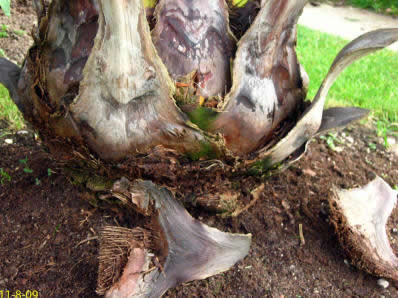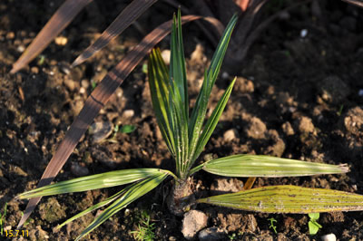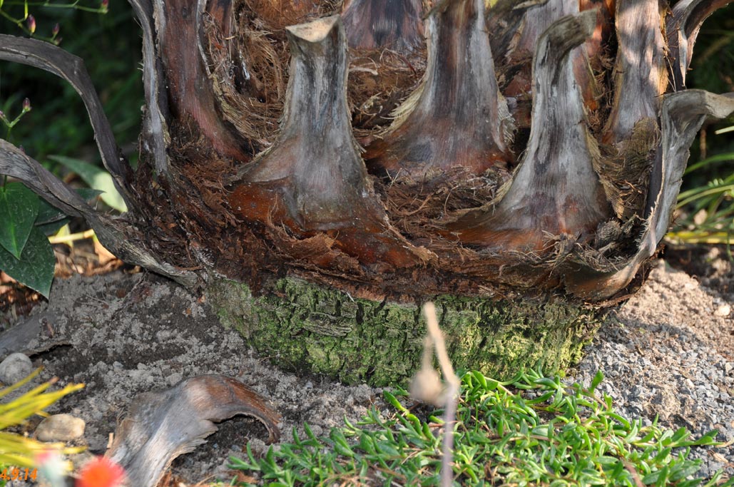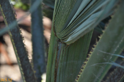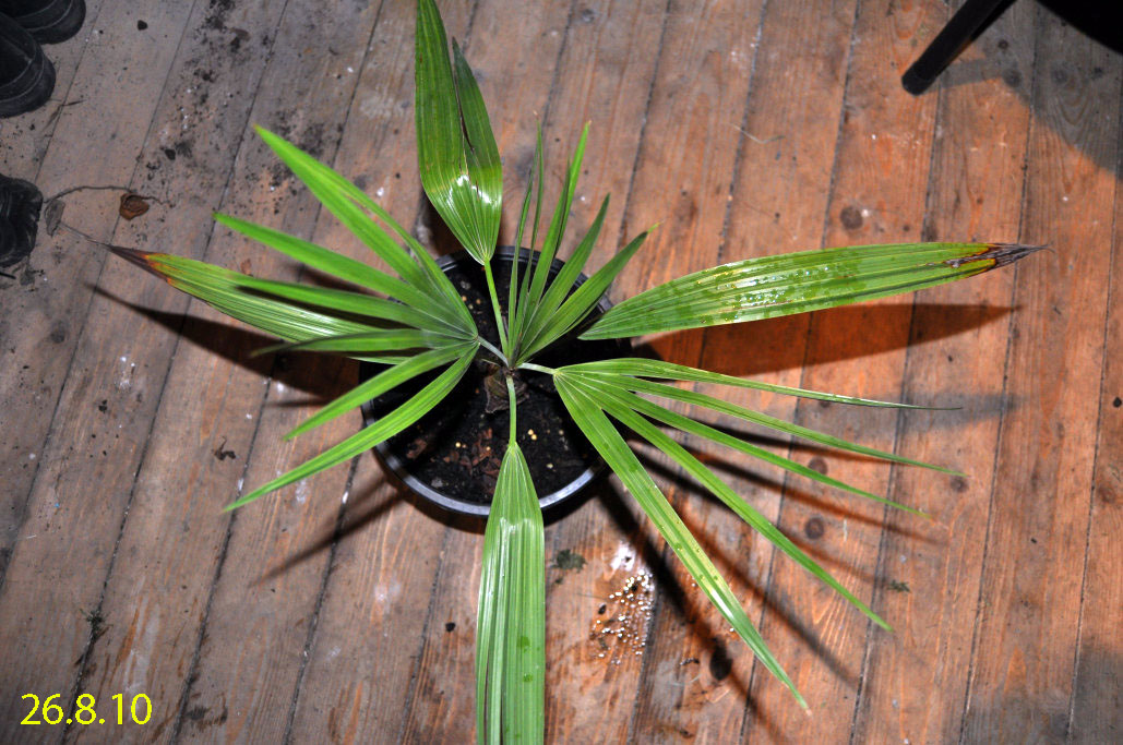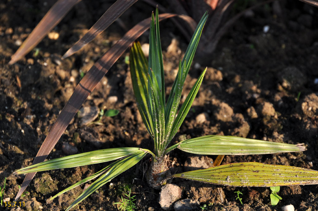 2011Ein großer Teil des Speers ist vertrocknet und ich musste einige Altwedel abschneiden. Rings um die Brahea ausgelegte Kartoffelhälften förderten einige Drahtwürmer zu Tage. Inzwischen habe ich die Drahtwümer durch Absammeln und per chem. Keule einigermaßen im Griff. Zumindest in den letzten Tagen konnte ich keine Drahtwürmer mehr finden. Da die Brahea inzwischen ganz gut wächst, hoffe ich, dass keine weiteren Schäden dazu kommen... Die Brahea sieht zwar an sich gut aus, auf den ersten Blick sind keine Frostschäden zu sehen. Allerdings täuscht das Bild, denn sie schiebt einen vertrockneten Speer. Tja, fragt sich woran es liegt? An einen Winterschaden mag ich nach dem eher milden Winter nicht glauben. Da ich dieses Jahr unzählige Dickmaulrüsslerlarven, Drahtwürmer und Engerlinge im Boden habe, denke ich eher, dass diese Schädlinge für den Schaden verantwortlich sind. Hoffentlich erholt sie sich wieder... 2010Viel besser als erwartet hat sich die Brahea armata während des Sommers, der ja nicht mal besonders palmenfreundlich war, erholt. Bis Anfang September hat sie nun inkl. der im Frühjahr beschädigten Wedel 13 Blätter geschafft. Ich tippe 1-2 werden noch folgen, wenn die Temperaturen noch ein wenig im moderaten Bereich bleiben. Allerdings habe ich dieses Jahr auch etwa 10 Altwedel entfernt, so viele wie nie zuvor. Anfang Oktober ist auch das vierzehnte Blatt komplett und ein dicker neuer Speer steht parat. Die Julihitze tut der Brahea sichtlich gut. Inzwischen hat sie Anfang des Jahres zwei intakte, dann drei verfaulte und anschließend noch ein zur Hälfte beschädigtes Blatt geschoben. Das letzte Blatt war dann etwas kleiner als normal. Nun hat sie aber wieder normal große Speere geschoben, von denen sich heute der erste zu öffnen begann. Ich denke nun geht es wieder aufwärts und bis zum Ende des Jahres kann sie noch ordentlich zulegen. Hab heute mal die vertrockneten Altfächer abgeschnitten. Nun sieht sie wieder ein bisschen besser aus, allerdings schiebt sich immernoch ein vertrockneter Speer aus dem Stamm. Nachdem die Brahea zunächst zwei gesunde Blätter geöffnet hat, schiebt sie nun das dritte Blatt, welches allerdings vertrocknet aussieht. Zudem bauen die Altfächer zur Zeit stark ab, so dass die Brahea momentan ein recht lädiertes Bild abgibt. Den Winter 09/10 hat die Brahea wie es aussieht ohne irgendwelche Schäden überstanden. Dann bin ich mal auf die neue Saison gespannt. Das erste Blatt ist am 18.4. bereits vollständig geöffnet... 20096.September, das zehnte Blatt beginnt sich zu entfächern. Am 27.9. ist das 10. Blatt fertig. Mal sehen, ob die Zeit noch reicht den Speer des 11. Blattes zu öffnen... ![]() ![]() ![]() ![]() ![]() ![]() 15. August und das achte Blatt ist bereits halb entfächert. Nur zwei Tage später ist das achte Blatt komplett und das neunte beginnt sich zu teilen. :-) Mitte Juli öffnet die Brahea in diesem Jahr bereits ihr siebtes Blatt, nachdem sie zuvor noch zwei leicht beschädigte Blätter entfächerte. Ganz problemlos war der Winter für die Brahea wie es scheint doch nicht. Inzwischen (Mitte Mai) schiebt sie bereits das fünfte Blatt (Wahnsinn!), dies hat aber nun plötzlich sichtbare Schäden, auch wenn der Schaden harmlos ist und nur optisch stören wird. Der warme April treibt die Brahea nach der problemlosen Überwinterung zu wahren Höchstleistungen an. Die Brahea hat den Winter bestens überstanden und hat Anfang April dank des milden Wetters bereits das erste Blatt entfächert. 2008Meine kleinere Brahea hatte ich im Frühjahr 2006 ausgepflanzt, nachdem sie im Topf nur rumkümmerte und einfach nicht wachsen wollte. Nachdem ich sie in die Freiheit entlassen hatte, hat sich sich innerhalb kürzester Zeit prima entwickelt. Außer Mulch hat sie keinen Winterschutz bekommen und selbst als kleines Pälmchen bereits -9°C schadlos überstanden. Leider fiel sie im Frühjahr 2008 Wühlmäusen zum Opfer, die ich zu spät bemerkte. Als die Blätter anfingen zu vertrocknen zog ich leicht an der Pflanze und hatte sie gleich komplett, allerdings ohne Wurzeln in der Hand. Erst dann bemerkte ich die Wühlmausgänge in der Erde... Ich hatte danach noch versucht sie mit Auxin zu neuem Wurzelwachstum zu überreden, was aber nicht funktioniert hat. Brahea edulis - H.Wendl. ex S.Watson - Guadalupe-PalmeDiese Fächerpalme kommt lediglich im Norden von Guadalupe vor der Küste Mexikos vor, wo sie an steilen, felsigen Hängen wächst. Auffallend sind die kräftig grünen costapalmaten Blätter. B. edulis benötigt einen vollsonnigen Standort und verträgt längere Dürreperioden, sowie auch Frost bis etwa -8°C gut. Probleme bereitet ihr scheinbar zu hohe Luftfeuchtigkeit. Sie ist die einzige Brahea, die ihre abgestorbenen Blätter abwirft. Infos und Bilder: http://www.pacsoa.org.au/palms/Brahea/edulis.html 2011Da beim Ausgraben im Vorjahr viele Wurzeln verletzt wurden (waren durch den Topf in die Erde gewachsen), verlor die B. edulis anschließend einige Blätter und ging angeschlagen in den Winter. Deshalb wurde sie dieses Jahr warm im Haus überwintert. Erst ab Januar/Februar erholte sie sich wieder und fing wieder zu wachsen an. Bin mir noch nicht im Klaren, ob und wo ich die Edulis auspflanzen könnte und habe sie deshalb vorläufig wieder mit Topf eingegraben. Allerdings habe ich diesmal das Abzugsloch im Topf mit Tonscherben verdeckt, so dass hoffentlich keine Wurzeln herauswachsen. Zur Sicherheit habe ich unter dem Topf ein tieferes Loch ausgegraben und mit Sand und Split aufgefüllt, damit einerseits überschüssiges Wasser ablaufen kann, zudem aber auch eventuell doch aus dem Topf herauswachsende Wurzeln sich nicht fest im Erdreich verwachsen. 2010Im Frühjahr 2010 habe ich die B. edulis nun im Topf in einem Hügel eingegraben. Während des Winters hat sie sich ganz gut erholt, aber bis zum entgültigen Auspflanzen möchte ich doch lieber noch ein Jahr warten. Dort am Hügel ist dazu ein schlechter Auspflanzplatz, da dort 