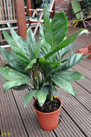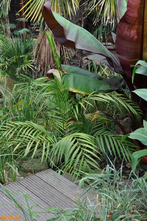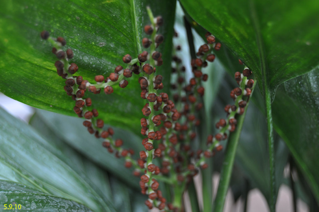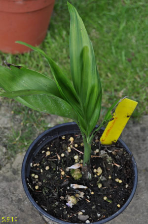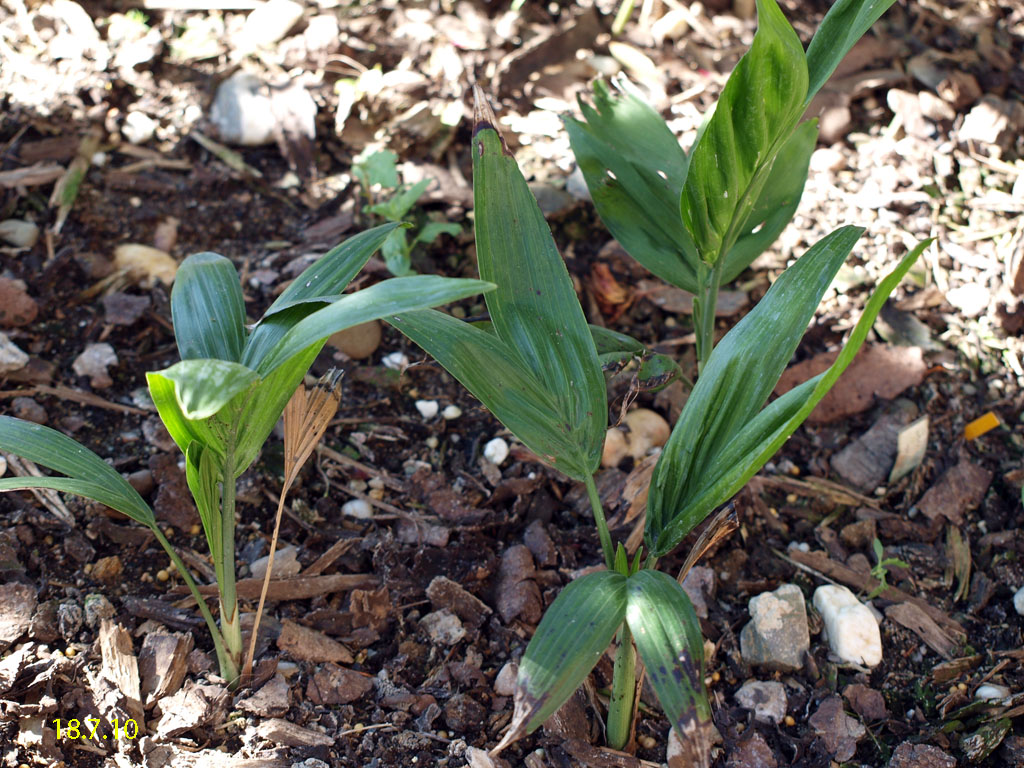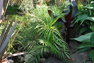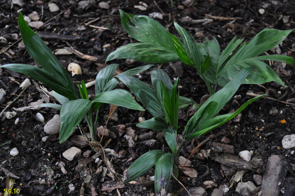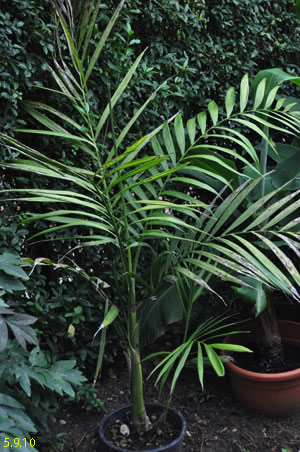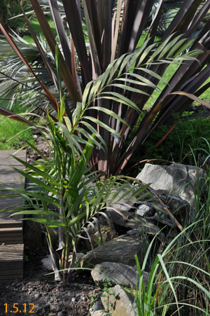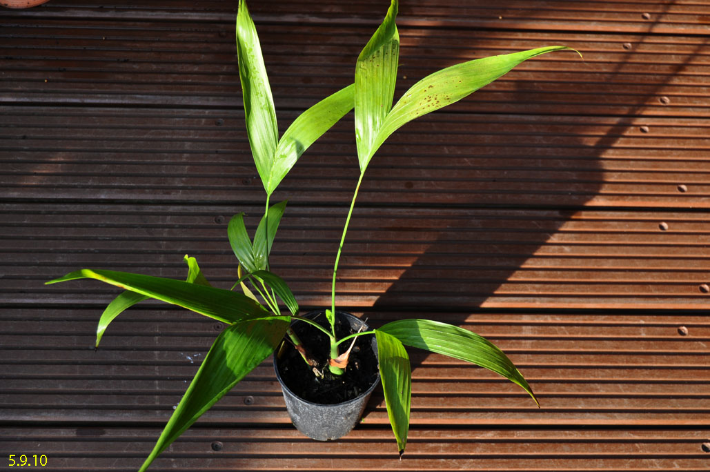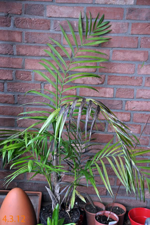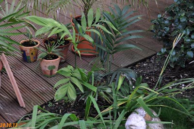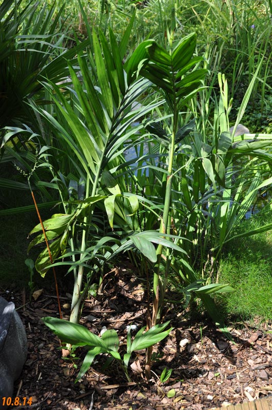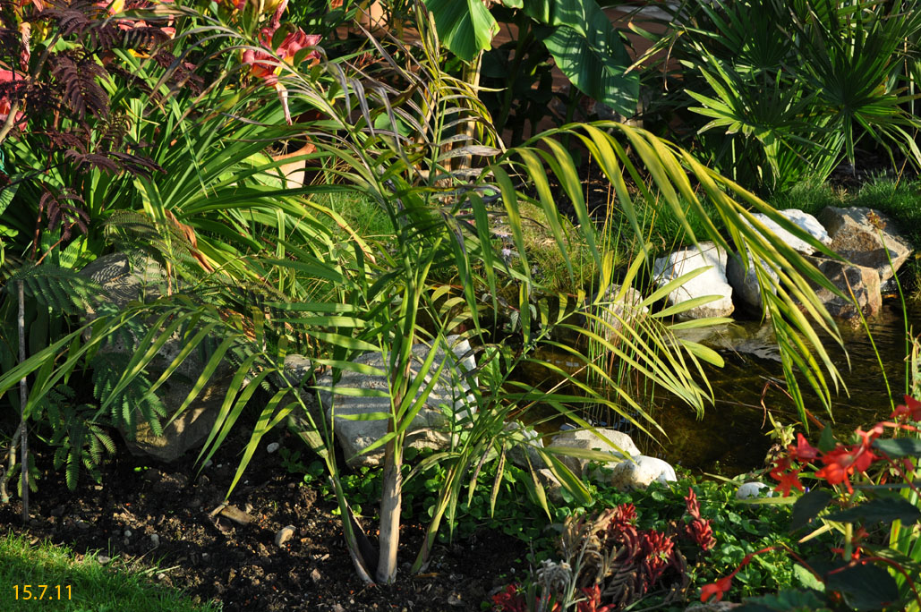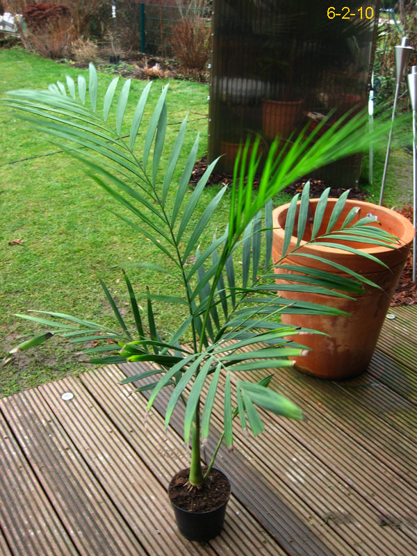 Chamaedorea microspadix -aus dem östlichen Mexiko stammende horstbildene Fiederpalme, die auf dünnen Stielen etwa knapp 3m Höhe erreicht. Die Blätter sind matt und recht hell grün. Chamaedorea costaricana -Diese aus Mittelamerika stammende Bergpalme ist horstbildend und kann bis zu 6m Höhe erreichen, bleibt aber meist wesentlich kleiner (etwa 3m). Sie bildet Bambus ähnliche Stämme und bildet ein Dickicht aus dunkelgrünen Fiederblättern. Wie andere Chamaedoreaarten mag sie schattige Plätze, verträgt aber auch mal Sonne. Die Temperaturen sollten zwischen 10 und 25°C liegen - große Hitze mag sie nicht. Aufgrund ihre Vorkommens in bis zu 2300m Höhe werden leichte Fröste kurzfristig vertragen. Chamaedorea hooperianaDiese aus mexikanischen Regenwäldern stammende Chamaedoreaart wurde erst 1992 entdeckt und gehört zu den schönsten Vertretern der Gattung. Sie wird bis zu 4m hoch und hat sehr schön gefiederte Blätter. Die Fruchtstände sind sehr hübsch rötlich. Sie mag feuchte aber durchlässige Böden und soll auch leichte Fröste überstehen. Ich habe diese Palme im Februar 2010 gekauft und gleich dem Härtetest unterzogen, in dem ich sie gleich im Winterschutz meiner W. robusta untergebracht habe. Dort wird sie ab -1,5°C beheizt. Ich bin gespannt, ob sie die Umstellung aus dem Gewächshaus ins Kalte verträgt... Ich habe sie nun im Frühjahr 2010 am Teich nach der Topf in Topf - Methode im Boden versenkt. So kann ich sie zum Winter leicht wieder dort herausnehmen und geschützt unterstellen. Dennoch hat sie gleich nach wenigen Tagen noch etwas Frost mitbekommen, was prompt zu Blattschäden führte. 2011 Auch dieses Jahr habe ich sie wieder mit Topf am Teich im Boden versenkt. Leider hat sie einen starken Sonnenbrand bekommen, der die Blätter sehr unansehnlich gemacht hat. Das Wachstum ist recht gut und die Pflanze bildet mehrere Seitentriebe. 4.3.12 - Die C. hooperiana wurde im Topf innerhalb meines ab -4°C beheizten Braheaschutzes überwintert. Den Winter hat sie dort gut überstanden. 6.5.12 - Inzwischen habe ich sie wieder mit Topf im Boden versenkt. Eine sehr lohnenswerte kleine Palme, die sich als sehr pflegeleicht und robust erweist. Hätte ich eine geeignete Stelle zur Verfügung würde ich eine Auspflanzung probieren. 28.9.12 - Inzwischen ist die Hooperiana gut gewachsen und hat mehrere Seitentriebe bekommen. 2013Chamaedorea metallicaDiese klein bleibende Palme stammt aus mexikanischen Regenwäldern und bildet nur ein etwa fingerdickes Stämmchen. Auffallend ist der metallische Glanz der V-förmig eingeschnittenen, ansonsten aber ungeteilten Fiederblätter. Sie kann sowohl im Schatten, wie auch in praller Sonne stehen und bevorzugt feuchtwarmes Klima. Wie alle Chamaedoreas blüht auch die Metallica sehr früh -diese hier bereits in ihrem ersten Sommer bei mir. Chamaedoreas sind diözisch, da man sie meist als Tuff bekommt ist die Chance recht groß männliche und weibliche Pflanzen im Topf zu haben. Chamaedorea seifriziiDiese Chamaedorea wird wegen ihrer etwa 1cm dicken an Bambus erinnernden "Stämme" auch oft als Bambuspalme bezeichnet. Sie wächst in Horsten in Regenwäldern und bevorzugt in der Jugend schattige Plätze, später kann sie auch sonnig stehen. Sie ist recht pflegeleicht, bevorzugt durchlässige Böden, möchte aber stets feucht gehalten werden und ist recht kältetolerant und kann leichte Fröste überstehen.