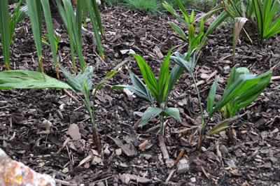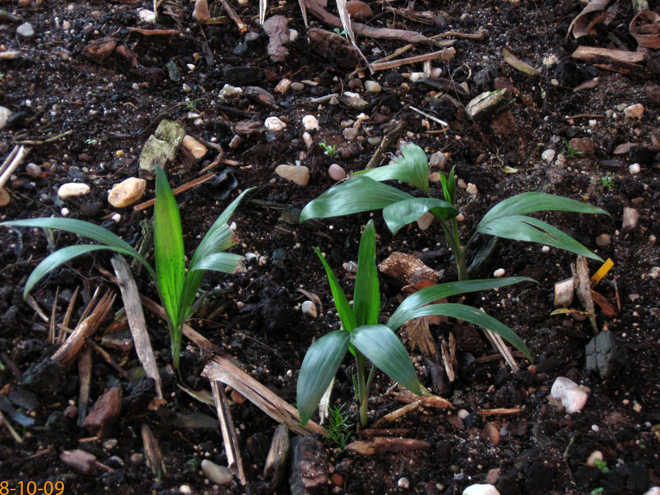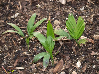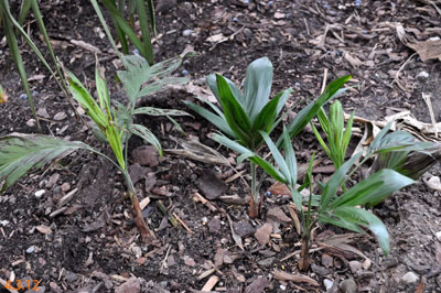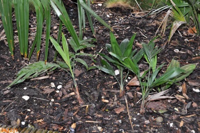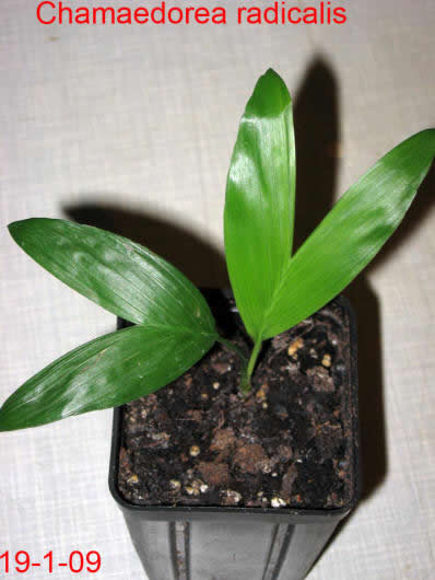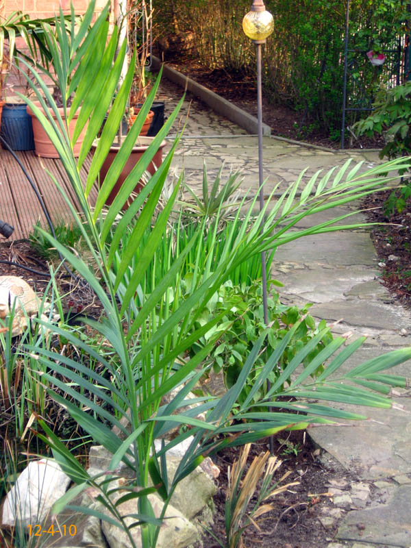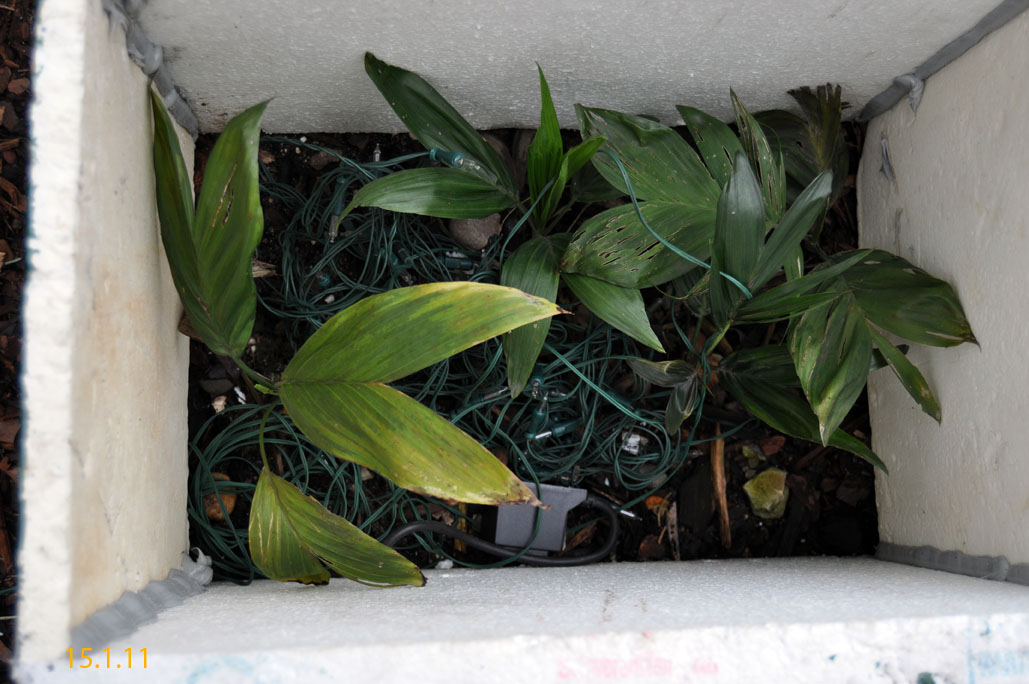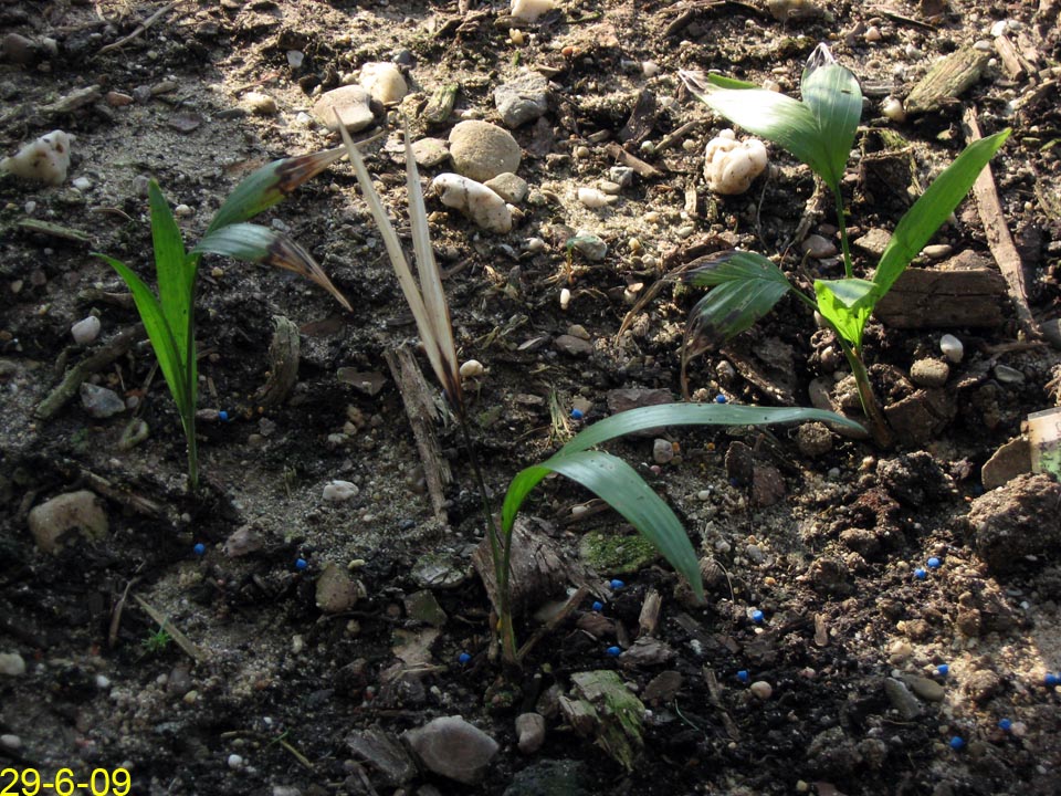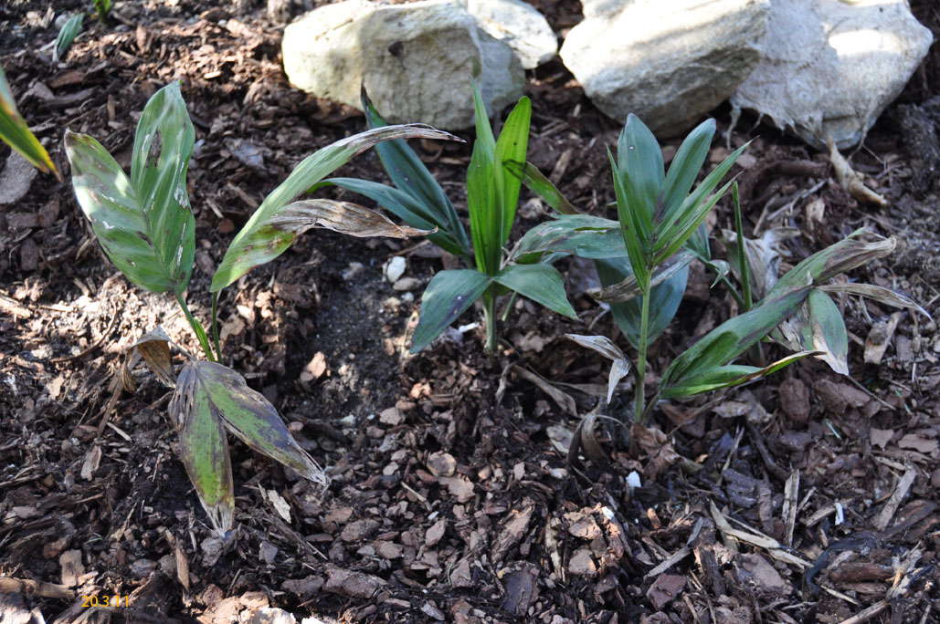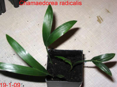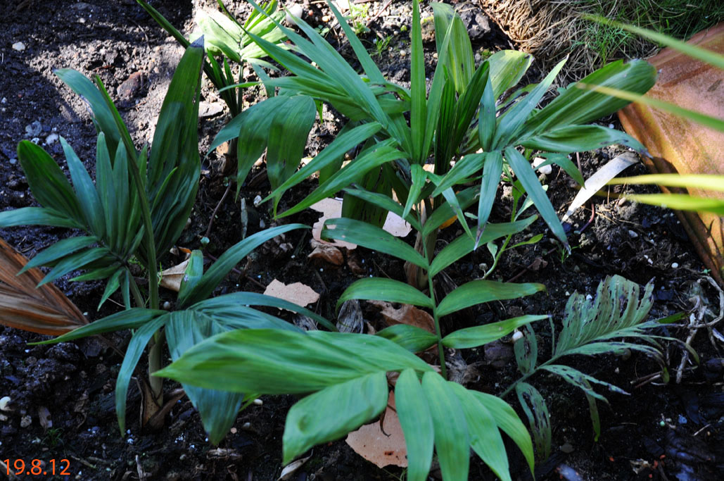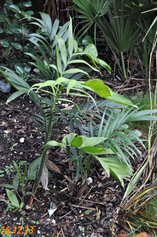 CHAMAEDOREAChamaedorea radicalis - Chamaedorea microspadix - Chamaedorea costericana- Chamaedorea hooperiana- Chamaedorea metallica - Chamaedorea seifritzii -Chamaedorea radicalis -hierbei handelt es sich um die frosttoleranteste Art ihrer Gattung, die bis zu -10°C überstehen können soll. Diese Palme stammt aus mittleren bis hoch gelegenen Regenwäldern im Bergland Zentralmexikos. Auffallend sind die aus dem Boden wachsenden Blütenstände mit ihren orangen Früchten. Da diese meist stammlos und nur bis zu 2m Höhe erreichende Palme eine eher lichte Erscheinung ist, empfiehlt es sich sie in Gruppen zu pflanzen, zumal sie keine Ausläufer bildet. 2009Winterschutz per Vlies und einer Windung eines Lichtschlauchs, der nur für wenige Minuten eingeschaltet wird. Bei einer Außentemperatur von -12,7°C wurde es -8°C kalt. 2010Erstaunlich gut haben die C. radicalis den Winter überstanden. Mal sehen, ob sie ausgepflanzt auch ordentlich wachsen... Ganz rechts scheint sich eine C. microspadix unter die Radicalis geschlichen zu haben. ;-) Im zweiten ausgepflanzten Winter stehen die Chamaedoreas in einer Styroporbox und werden notfalls mit einer kleinen Lichterkette (9,6W) beheizt, die aber nur leuchtet, wenn im Braheaschutz der UT einschaltet. Da die gesamte Box aber eingeschneit war, war bisher keinerlei Beheizung notwendig. 2011Nun wurden die Chamaedoreas während des Winters überhaupt nicht beheizt, sondern nur mit der Styroporbox abgedeckt. Natürlich war die gesamte Box eingeschneit. Die Chamaedoreas haben den Winter gut überstanden - wenn auch mit einigen Blattschäden. Das Wachstum der ausgepflanzten Chamaedoreas ist allerdings im Vergleich zu frostfrei überwinterten Pflanzen sehr langsam. 25.12.11 - Bisher war für die Chamaedoreas keinerlei Schutz nötig. Aber auch dieses Jahr war das Wachstum äußerst gering. 20124.3.12 - Chamaedorea radicalis und microspadix hatten dieses Jahr eine Styroporbox und eine Minilichterkette als Schutz. Sehen gut aus. Microspadix sieht immer ein bisschen zerfleddert aus. 6.9.12 - Habe dieses Jahr die Chamaedoreas ein Stückchen versetzt, so dass sie zumindest für einige Stunden ein wenig Sonne bekommen. Dadurch hat sich das bisher sehr mäßige Wachstum sofort beschleunigt. Mal sehen wie sie sich nun unter den neuen Bedingungen weiter entwickeln. Bisher schlagen sie sich im Winter erstaunlich gut und wenn sich das Wachstum nun weiter beschleunigt, dann ist das eine schöne, relativ klein bleibende Palme, die man evtl. als Beipflanzung zu einer anderen Palme setzen kann, für die man sowieso schon einen Winterschutz einrichten muss. 20132014