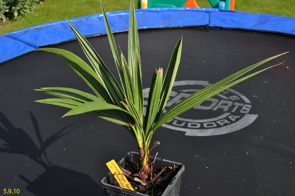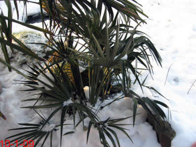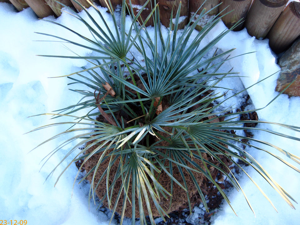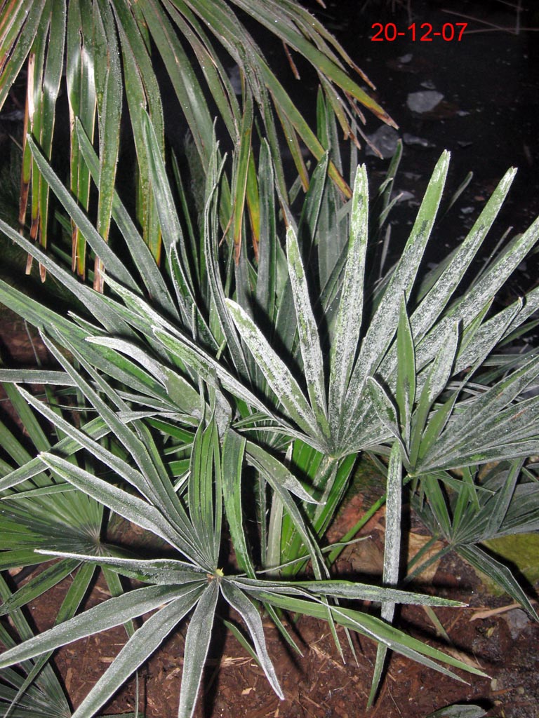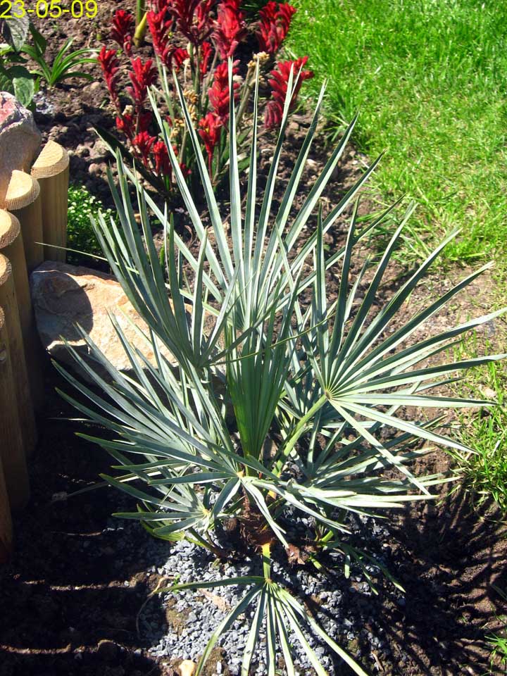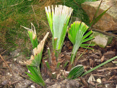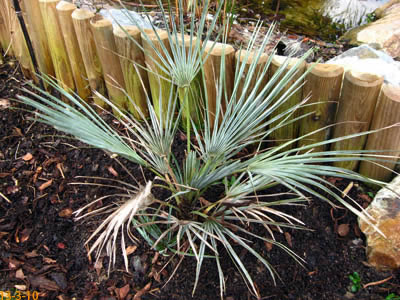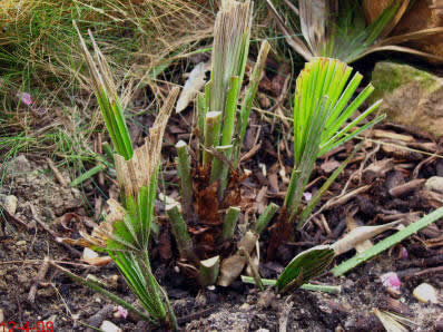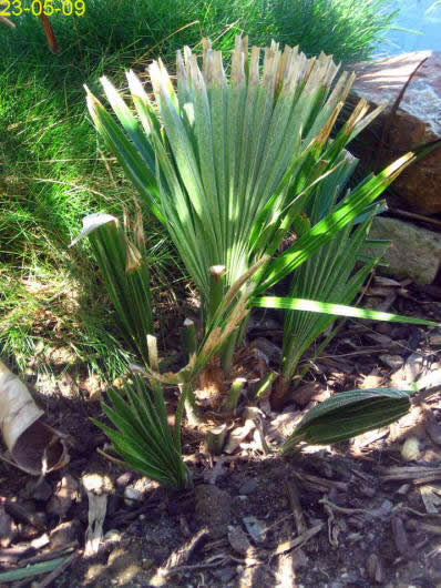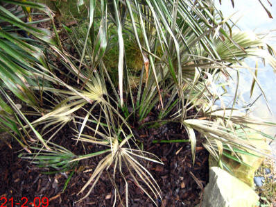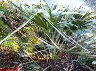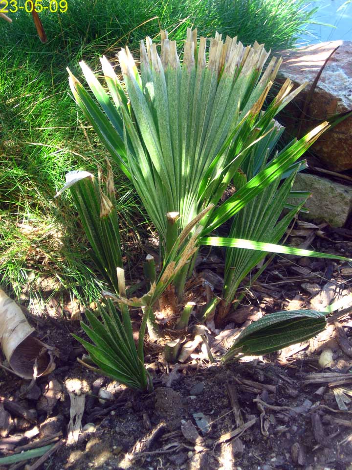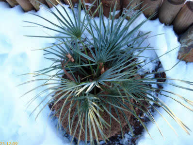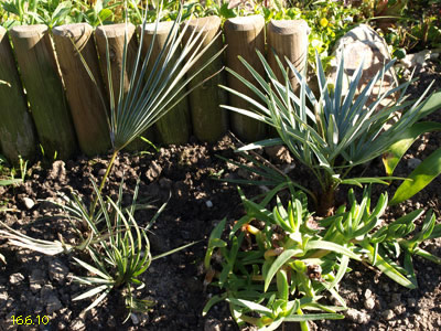 20082005 - 2006 - 2007Chamaerops humilis "cerifera" (Blaue Zwergpalme)2009Meine erste Neupflanzung 2009 Nur mit Mulch und einem übergestüpten umgedrehten Blumenkübel geschützt ging die Cerifera in den Winter 09/10. Nach Temperaturen von -12,7°C sind die Blätter etwas gefaltet. Ob bleibende Schäden vorhanden sind kann ich noch nicht abschätzen... 2010Enttäuscht hat mich diesen Winter die Cerifera, die nach einer ungeschützten Nacht bei -12,8°C bereits starke Blattschäden erlitt. Anschließend wurde sie in kalten Phasen per Minilichterkette und einem umgedrehten Pflanzenkübel geschützt. Einige Blätter sind bereits vertrocknet, aber auch die übrigen sind zusammengefaltet und öffnen sich nicht mehr. Ich denke auch diese Blätter werden nach und nach eintrocknen. Vom Haupttrieb ließ sich später der Speer ziehen und auch ein Seitentrieb verlor den Speer. Lediglich ein Seitentrieb blieb intakt. Habe der angeschlagenen Cerifera ein neues "Geschwisterchen" gegönnt. Mal sehen was draus wird.... Immerhin, die Cerifera treibt aus dem Haptstämmchen wieder aus. Zunächst ein Miniaturblättchen, aber dann folgt wieder ein Speerchen das gut aussieht. 2011Obwohl der Winter dieses Jahr doch recht mild war, haben beide Ceriferas wieder die Speere verloren. Irgendwie habe ich kein Glück mit dieser Palme. Andere berichten von der guten Winterhärte dieser Palme, bei mir kommt sie nicht ohne Schäden durch den Winter, selbst bei harmlosen Temperaturen. Diesen Winter lag die Tiefsttemperatur nur bei knapp -12°C. 2012Auch im Winter 11/12 wieder das gleiche Spiel. Die Ceriferas wurden wieder nur passiv geschützt, allerdings mit einer Plane ohne Blattkontakt großflächig abgedeckt und gut gemulcht. Aber auch dieses Jahr haben sie wieder erhebliche Schäden. Also mit diesen Exemplaren macht die Überwinterung ohne Beheizung bei mir scheinbar keinen Sinn. 28.9.12 - Habe die zwei angeschlagenen Ceriferas an unauffällige Stellen im Garten versetzt. Dort bekommen sie weiterhin eine Chance. Na ja, zwar trieben beide Ceriferas einge Blättchen, allerdings eher in Miniaturform. Chamaerops humilis "arborescens"Diese Variation der C humilis zeichnet sich dadurch aus, dass sie fast keine Seitentriebe entwickelt und so fast immer einen einzigen größeren Stamm bildet. Die Blätter haben oft eine silbrig/bläuliche Färbung. 200820102011-20122011 habe ich die C. humilis "arborescens" ausgepflanzt. Ihren ersten Winter hat sie prima überstanden. Einziger Schutz war ein übergestülpter umgedrehter Laubsammelbehälter aus Nylon. 28.9.12 - Enen schweren Stand hat die Arborescens, da sie von benachbarten Pflanzen überwuchert wurde. Dennoch entwickelt sie sich bisher ganz ordentlich.
