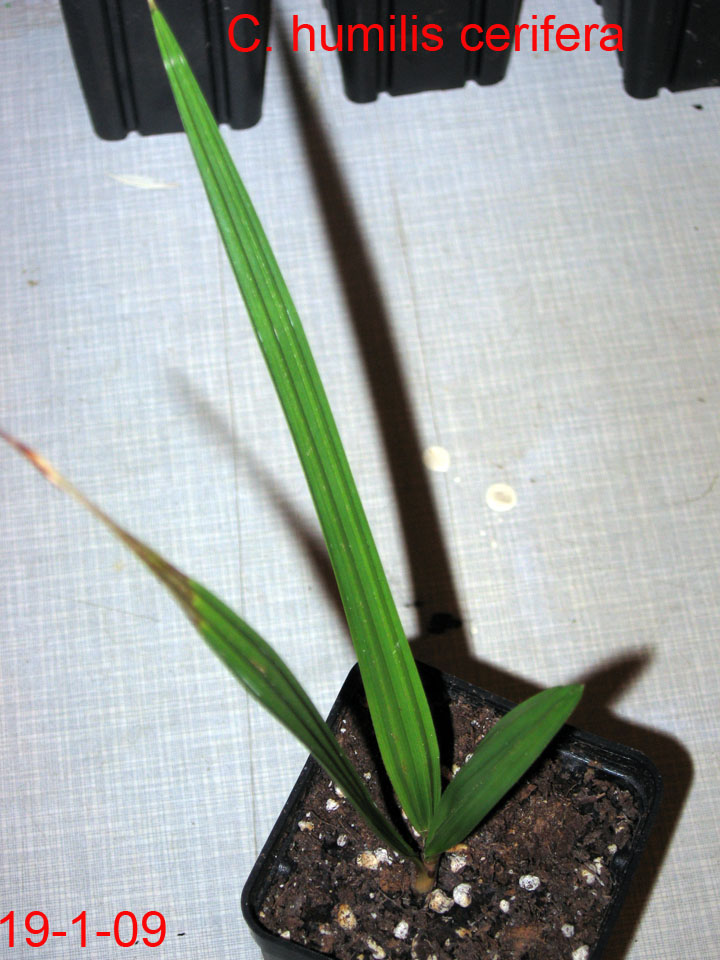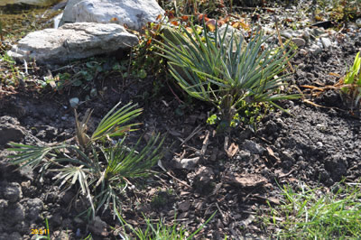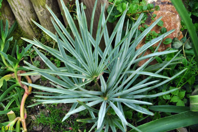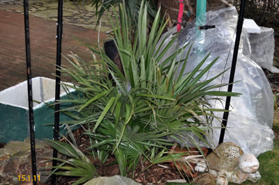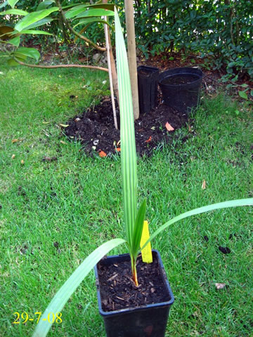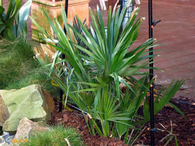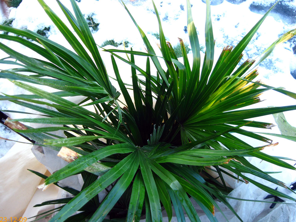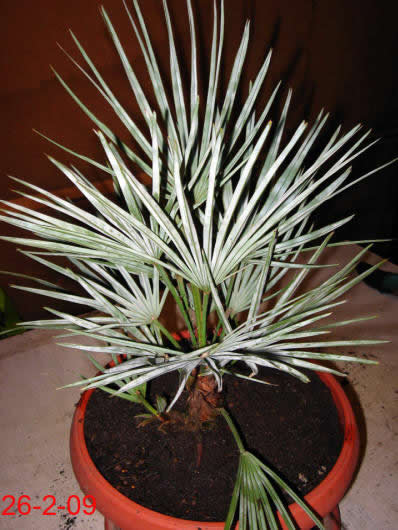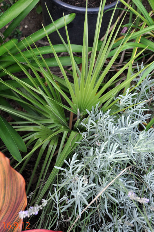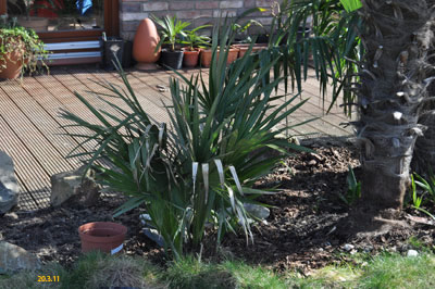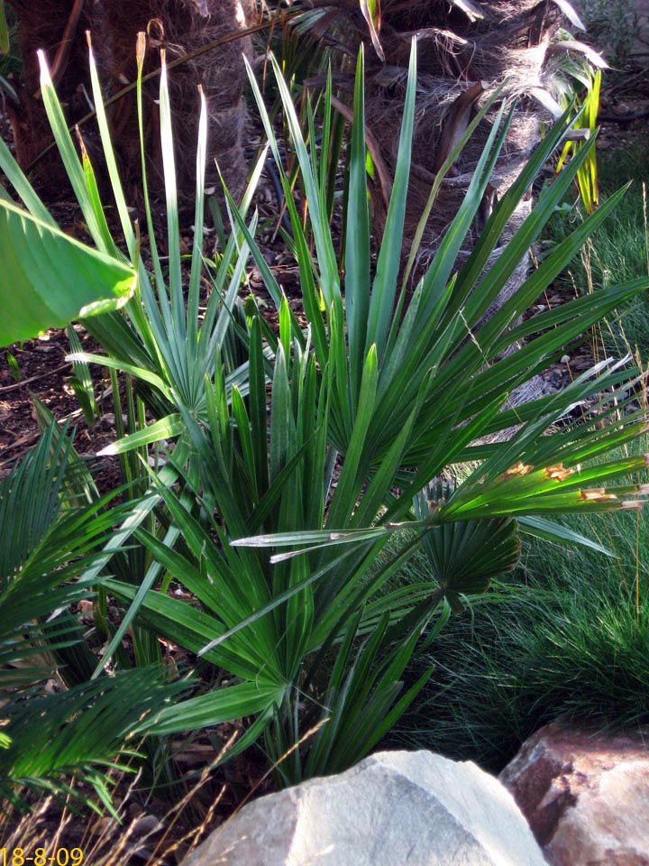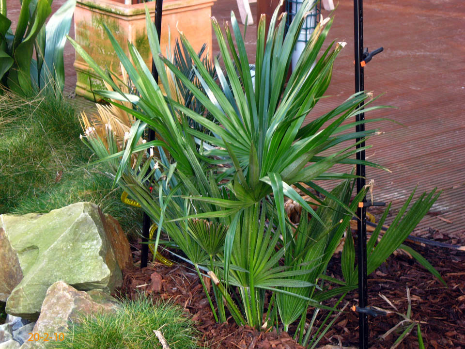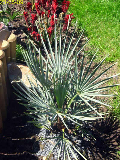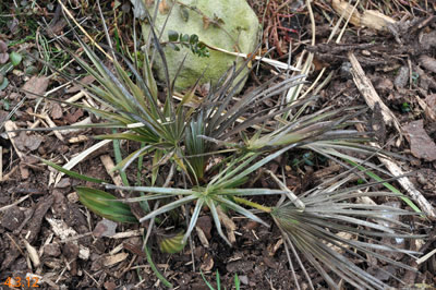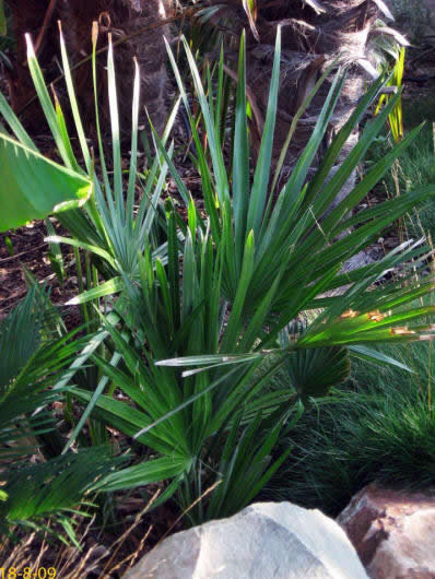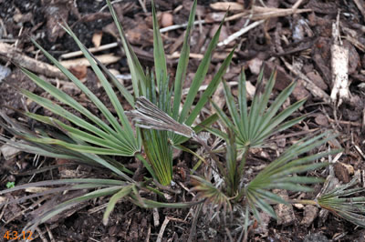 20082005 - 2006 - 2007Chamaerops humilis "cerifera" (Blaue Zwergpalme)2009Meine erste Neupflanzung 2009 Nur mit Mulch und einem übergestüpten umgedrehten Blumenkübel geschützt ging die Cerifera in den Winter 09/10. Nach Temperaturen von -12,7°C sind die Blätter etwas gefaltet. Ob bleibende Schäden vorhanden sind kann ich noch nicht abschätzen... 2010Enttäuscht hat mich diesen Winter die Cerifera, die nach einer ungeschützten Nacht bei -12,8°C bereits starke Blattschäden erlitt. Anschließend wurde sie in kalten Phasen per Minilichterkette und einem umgedrehten Pflanzenkübel geschützt. Einige Blätter sind bereits vertrocknet, aber auch die übrigen sind zusammengefaltet und öffnen sich nicht mehr. Ich denke auch diese Blätter werden nach und nach eintrocknen. Vom Haupttrieb ließ sich später der Speer ziehen und auch ein Seitentrieb verlor den Speer. Lediglich ein Seitentrieb blieb intakt. Habe der angeschlagenen Cerifera ein neues "Geschwisterchen" gegönnt. Mal sehen was draus wird.... Immerhin, die Cerifera treibt aus dem Haptstämmchen wieder aus. Zunächst ein Miniaturblättchen, aber dann folgt wieder ein Speerchen das gut aussieht. 2011Obwohl der Winter dieses Jahr doch recht mild war, haben beide Ceriferas wieder die Speere verloren. Irgendwie habe ich kein Glück mit dieser Palme. Andere berichten von der guten Winterhärte dieser Palme, bei mir kommt sie nicht ohne Schäden durch den Winter, selbst bei harmlosen Temperaturen. Diesen Winter lag die Tiefsttemperatur nur bei knapp -12°C. 2012Auch im Winter 11/12 wieder das gleiche Spiel. Die Ceriferas wurden wieder nur passiv geschützt, allerdings mit einer Plane ohne Blattkontakt großflächig abgedeckt und gut gemulcht. Aber auch dieses Jahr haben sie wieder erhebliche Schäden. Also mit diesen Exemplaren macht die Überwinterung ohne Beheizung bei mir scheinbar keinen Sinn. 28.9.12 - Habe die zwei angeschlagenen Ceriferas an unauffällige Stellen im Garten versetzt. Dort bekommen sie weiterhin eine Chance. Na ja, zwar trieben beide Ceriferas einge Blättchen, allerdings eher in Miniaturform. Chamaerops humilis "arborescens"Diese Variation der C humilis zeichnet sich dadurch aus, dass sie fast keine Seitentriebe entwickelt und so fast immer einen einzigen größeren Stamm bildet. Die Blätter haben oft eine silbrig/bläuliche Färbung. 200820102011-20122011 habe ich die C. humilis "arborescens" ausgepflanzt. Ihren ersten Winter hat sie prima überstanden. Einziger Schutz war ein übergestülpter umgedrehter Laubsammelbehälter aus Nylon. 28.9.12 - Enen schweren Stand hat die Arborescens, da sie von benachbarten Pflanzen überwuchert wurde. Dennoch entwickelt sie sich bisher ganz ordentlich.