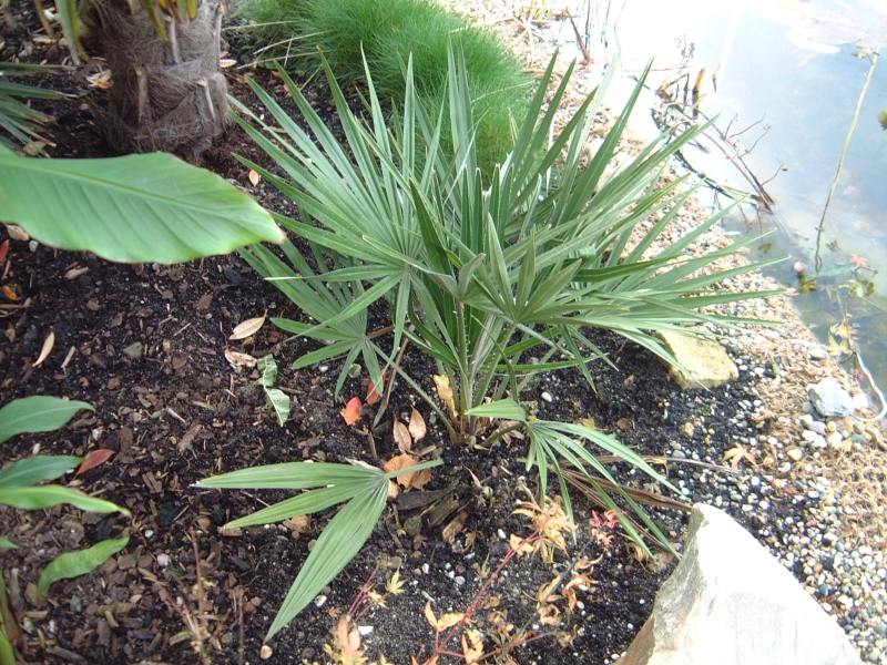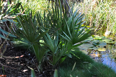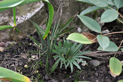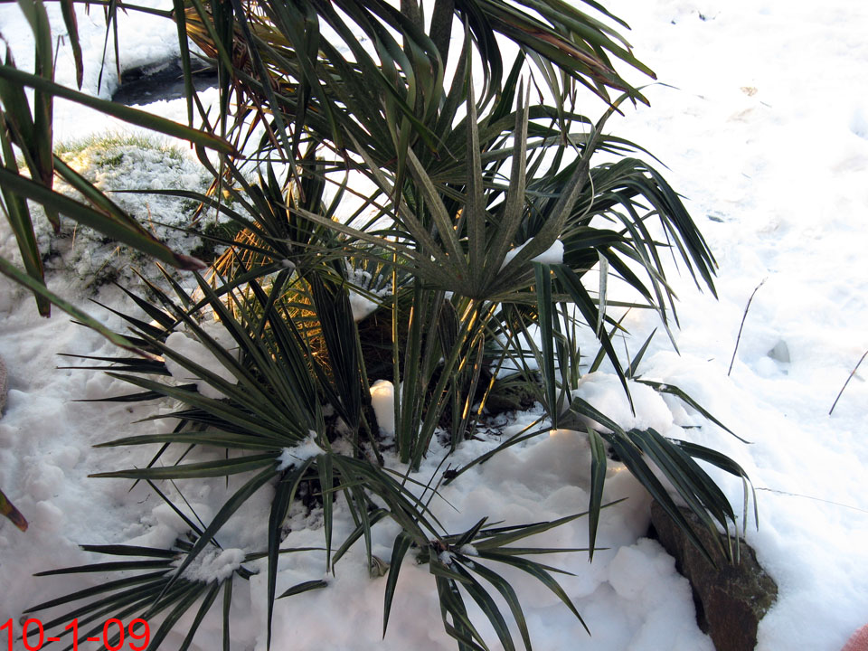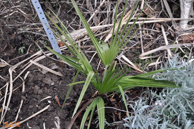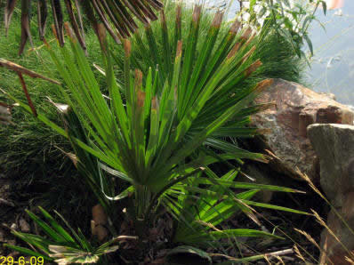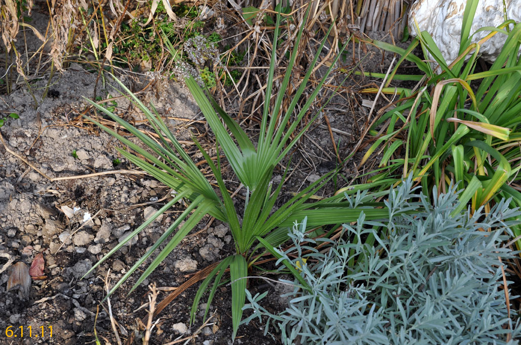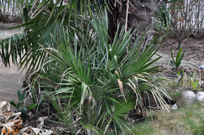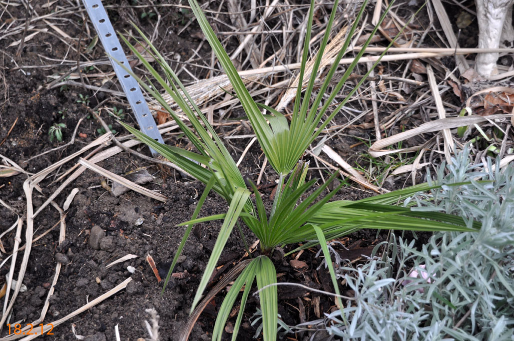 Chamaerops humilis var. humilis L. (Zwergpalme)C. humilis ist neben Phoenix theophrastii die einzige in Europa heimische Palmenart und kommt vor allem im westlichen Mittelmeerraum vor. Sie ist horstbildend und wächst meist eher buschig, wobei allerdings einzelne Stämme bis zu 8m Höhe erreichen können, sofern sie nicht vorher bereits vor allem durch Schafe und Ziegen abgeweidet werden. Auffällig sind die sehr spitzen in Blattrichtung zeigenden Dornen an den Blattstielen, die eine Unterscheidung zu anderen Palmen recht einfach machen. Bereits recht junge Chamaerops bilden oft bereits Blüten, die bei männlichen Pflanzen gelb, bei weiblichen eher grünlich sind. Erst die befruchteten, reifenden Samen werden später leuchtend gelb bis orange und in etwa olivengroß. C. humilis ist eine recht anspruchslose Palme, die keine besonderen Ansprüche an den Boden stellt – in der Natur wächst sie überwiegend auf steinigen, felsigen Böden. Sie kommt mit sehr wenig Wasser aus, wächst bei guter Bewässerung aber besser und sieht gesünder aus. Die Winterhärte wird meist zwischen -10 und -14°C angegeben und es wird ein trockener Standort empfohlen. Ich selbst hatte bisher mit Feuchtigkeit im Winter keine Probleme und bei Temperaturen bis -12°C auch keinerlei Blattschäden. Im Winter 2008/2009 bei -16,5°C sind allerdings alle oberirdischen Pflanzenteile zurückgefroren. Lediglich unter einer dicken Mulchschicht geschützte Triebe blieben unversehrt. Die Gattung Chamaerops ist ähnlich der Gattung Trachycarpus sehr variabel im Erscheinungsbild und so ist es nicht verwunderlich, dass unzählige Bezeichnungen von „Arten“, oder „Variationen“ in Umlauf sind…. In Wirklichkeit besteht die Gattung Chamaerops aber nur aus einer einzigen Art – humilis – sowie zwei anerkannten Variationen, nämlich var. humilis und var. argentea. Alle übrigen Bezeichnungen wie „vulcano“, oder „cerifera“, oder arborescens u.s.w. sind nicht anerkannt. Dennoch sind diese Bezeichnungen inzwischen derart verbreitet, dass jeder weiß, was darunter zu verstehen ist und ich denke eine Einteilung in diese „Sorten“, oder „Formen“ ist auch durchaus sinnvoll. 2012Den Winter 11/12 blieb die Humi ungeschützt. Lediglich zwei kalte Wochen anfang Februar bekam sie einen Minimalschutz in Form eines Vlieses und einer Minilichterkette im Wurzelbereich da ich nicht gemulcht hatte. Resultat sind einige Blattschäden mit denen ich aber leben kann. Insgesamt wächst die Humi unter der Trachy von der sie bis auf die Abendstunden beschattet wird recht langsam, was mir aber an diesem Standort sehr recht ist. 2011Im Winter 2011 wurde die Chamaerops lediglich während einiger Tage in der Weihnachtszeit kurzfristig per Schlauchfolie und Lichterschlauch geschützt, da tiefere Temperaturen angekündigt waren. Wie sich herausstellte war der Schutz jedoch nicht nötig. Insgesamt hat die Humi ein paar leichtere Blattschäden, ist ansonsten aber gut durch den Winter gekommen. 2010Den Winter 09/10 hat die Humi bestens geschafft. Dank leichtem Schutz hat sie keinerlei Schäden und so kann sie sich in der neuen Saison weiter von den Schäden des Vorwinters erholen. 2009Um die angeschlagene Chamaerops zu schonen habe ich sie während des Wintereinbruchs im Dezember mit Vlies und per Lichtschlauch geschützt. Tiefsttemperatur war dadurch bisher nur -8°C, was kein Problem für die Palme bedeutet. Meine Chamaerops hat im letzten Winter alle Blätter verloren, treibt aber bereits wieder neu aus. Mehrere gesunde Seitentriebe wachsen aus dem Boden, sogar der Hauptstamm treibt wieder...