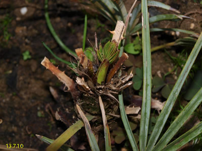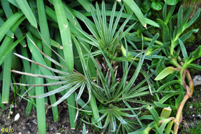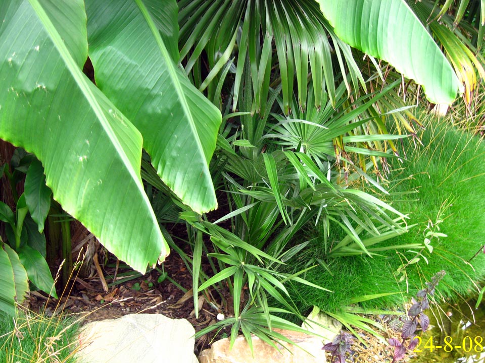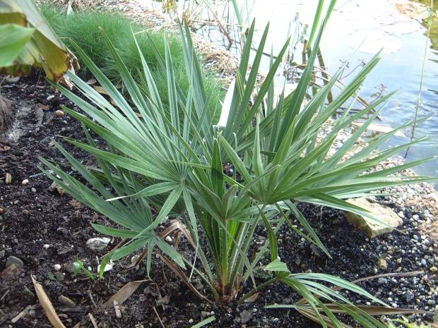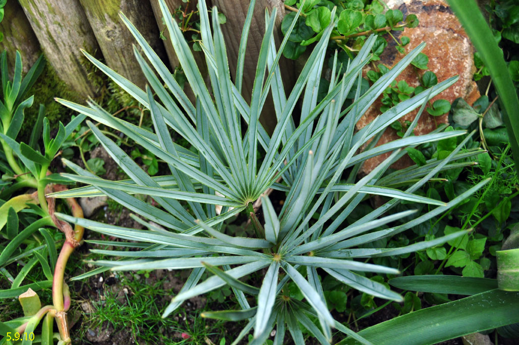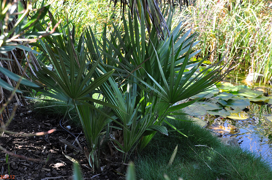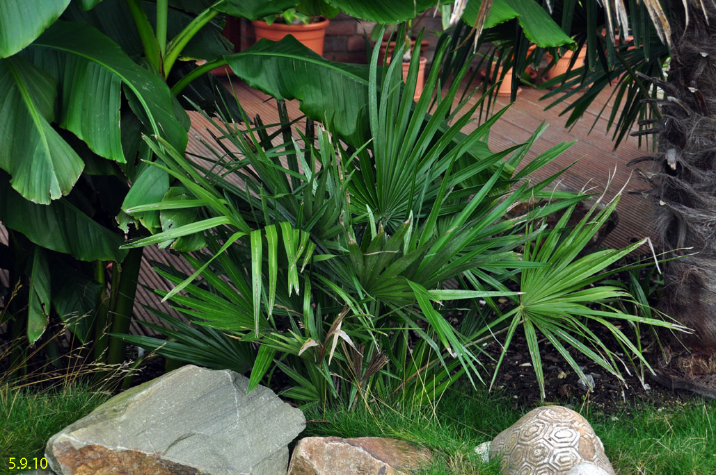 Chamaerops humilis var. humilis L. (Zwergpalme)C. humilis ist neben Phoenix theophrastii die einzige in Europa heimische Palmenart und kommt vor allem im westlichen Mittelmeerraum vor. Sie ist horstbildend und wächst meist eher buschig, wobei allerdings einzelne Stämme bis zu 8m Höhe erreichen können, sofern sie nicht vorher bereits vor allem durch Schafe und Ziegen abgeweidet werden. Auffällig sind die sehr spitzen in Blattrichtung zeigenden Dornen an den Blattstielen, die eine Unterscheidung zu anderen Palmen recht einfach machen. Bereits recht junge Chamaerops bilden oft bereits Blüten, die bei männlichen Pflanzen gelb, bei weiblichen eher grünlich sind. Erst die befruchteten, reifenden Samen werden später leuchtend gelb bis orange und in etwa olivengroß. C. humilis ist eine recht anspruchslose Palme, die keine besonderen Ansprüche an den Boden stellt – in der Natur wächst sie überwiegend auf steinigen, felsigen Böden. Sie kommt mit sehr wenig Wasser aus, wächst bei guter Bewässerung aber besser und sieht gesünder aus. Die Winterhärte wird meist zwischen -10 und -14°C angegeben und es wird ein trockener Standort empfohlen. Ich selbst hatte bisher mit Feuchtigkeit im Winter keine Probleme und bei Temperaturen bis -12°C auch keinerlei Blattschäden. Im Winter 2008/2009 bei -16,5°C sind allerdings alle oberirdischen Pflanzenteile zurückgefroren. Lediglich unter einer dicken Mulchschicht geschützte Triebe blieben unversehrt. Die Gattung Chamaerops ist ähnlich der Gattung Trachycarpus sehr variabel im Erscheinungsbild und so ist es nicht verwunderlich, dass unzählige Bezeichnungen von „Arten“, oder „Variationen“ in Umlauf sind…. In Wirklichkeit besteht die Gattung Chamaerops aber nur aus einer einzigen Art – humilis – sowie zwei anerkannten Variationen, nämlich var. humilis und var. argentea. Alle übrigen Bezeichnungen wie „vulcano“, oder „cerifera“, oder arborescens u.s.w. sind nicht anerkannt. Dennoch sind diese Bezeichnungen inzwischen derart verbreitet, dass jeder weiß, was darunter zu verstehen ist und ich denke eine Einteilung in diese „Sorten“, oder „Formen“ ist auch durchaus sinnvoll. 2012Den Winter 11/12 blieb die Humi ungeschützt. Lediglich zwei kalte Wochen anfang Februar bekam sie einen Minimalschutz in Form eines Vlieses und einer Minilichterkette im Wurzelbereich da ich nicht gemulcht hatte. Resultat sind einige Blattschäden mit denen ich aber leben kann. Insgesamt wächst die Humi unter der Trachy von der sie bis auf die Abendstunden beschattet wird recht langsam, was mir aber an diesem Standort sehr recht ist. 2011Im Winter 2011 wurde die Chamaerops lediglich während einiger Tage in der Weihnachtszeit kurzfristig per Schlauchfolie und Lichterschlauch geschützt, da tiefere Temperaturen angekündigt waren. Wie sich herausstellte war der Schutz jedoch nicht nötig. Insgesamt hat die Humi ein paar leichtere Blattschäden, ist ansonsten aber gut durch den Winter gekommen. 2010Den Winter 09/10 hat die Humi bestens geschafft. Dank leichtem Schutz hat sie keinerlei Schäden und so kann sie sich in der neuen Saison weiter von den Schäden des Vorwinters erholen. 2009Um die angeschlagene Chamaerops zu schonen habe ich sie während des Wintereinbruchs im Dezember mit Vlies und per Lichtschlauch geschützt. Tiefsttemperatur war dadurch bisher nur -8°C, was kein Problem für die Palme bedeutet. Meine Chamaerops hat im letzten Winter alle Blätter verloren, treibt aber bereits wieder neu aus. Mehrere gesunde Seitentriebe wachsen aus dem Boden, sogar der Hauptstamm treibt wieder...