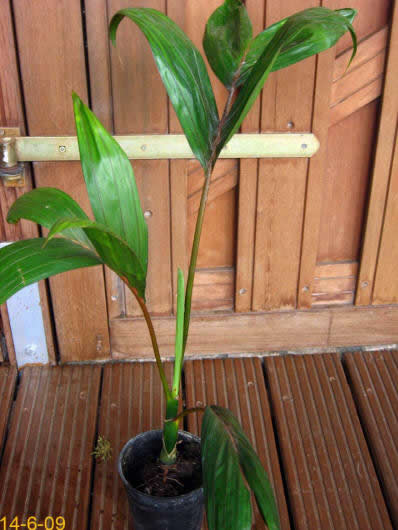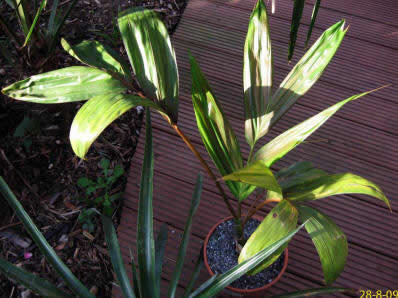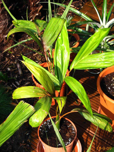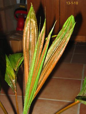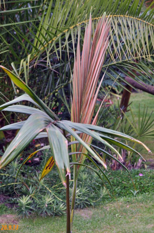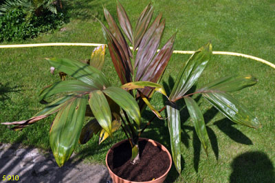 ChambeyroniaChambeyronia macrocarpaEine bis zu 20m hoch werdende Fiederpalme aus Neukaledonien, die dort in den Bergregenwäldern zuhause ist. Obwohl das Naturhabitat etwas anderes vermuten läßt, handelt es sich um eine recht pflegeleichte, allerdings sehr langsam wachsende Fiederpalme, deren Blätter dunkelgrün und wachsartig überzogen sind. Spektakulär ist der Neutrieb, der für etwa 10 Tage leuchtend rot gefärbt ist, bevor er dann grün wird. Die Palme benötigt nährstoffreiches Substrat, das gerne auch sehr feucht sein darf. Sie akzeptiert sonnige oder auch halbschattige Standorte. Berichten nach soll sie sogar kurzfristig leichte Fröste verkraften können. Nähere Infos und Bilder unter: http://www.pacsoa.org.au/palms/Chambeyronia/macrocarpa.html Nach dem Kauf im Juni 09 ist die Palme schön gewachsen und fühlt sich draußen auf der Terrasse sonnig sichtlich wohl. Zur Überwinterung habe ich sie kurz vor dem ersten Frost ins Haus geholt und im Wohnzimmer an ein NW-Fenster gestellt. Dort wächst sie bei Temperaturen von 20-22°C auf einer Fußbodenheizung weiter und öffnet im Januar ein neues Blatt, das erste rötliche, das in diesem Fall aber eher bräunlich ausfiel. Mit Ungeziefer hat sie keinerlei Probleme bei einer LF von 40-55%. Besprüht wurde sie nicht, allerdings hab ich ab und zu die Blätter abgespritzt um Staub zu entfernen.