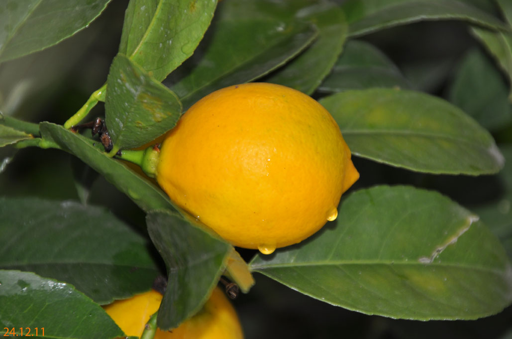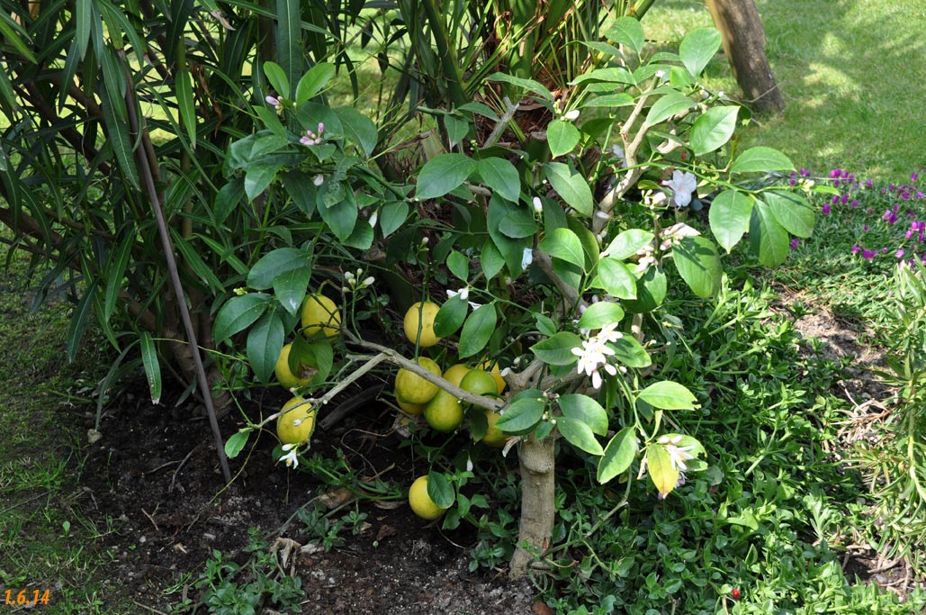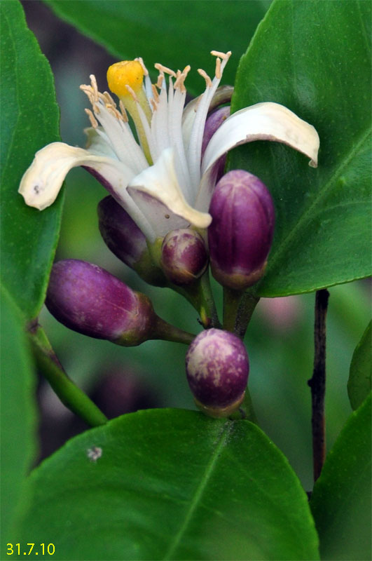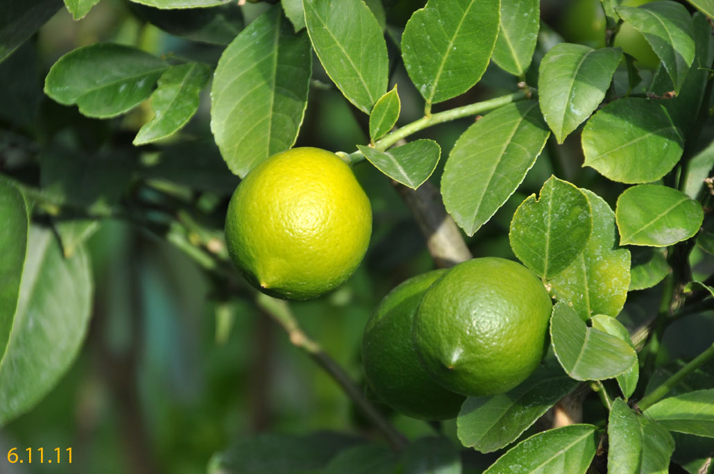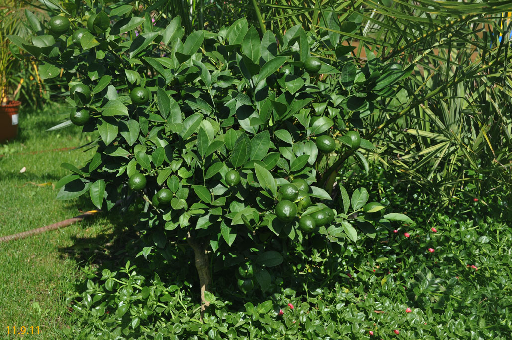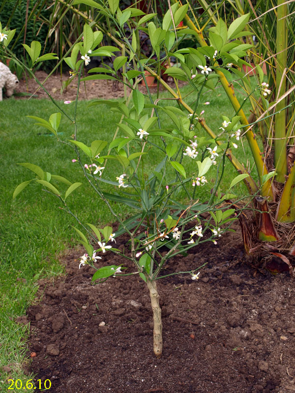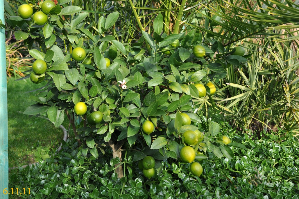Etwa 4m Höhe erreichende immergrüne Citrus, die im Frühjahr weiße Blüten belommt und sehr schön duftet. Die Früchte sehen aus wie Zitronen, bleiben aber kleiner und schmecken eher nach Limetten als nach Zitrone.