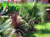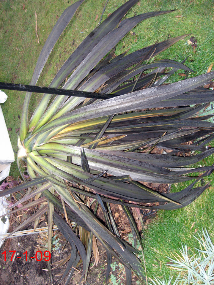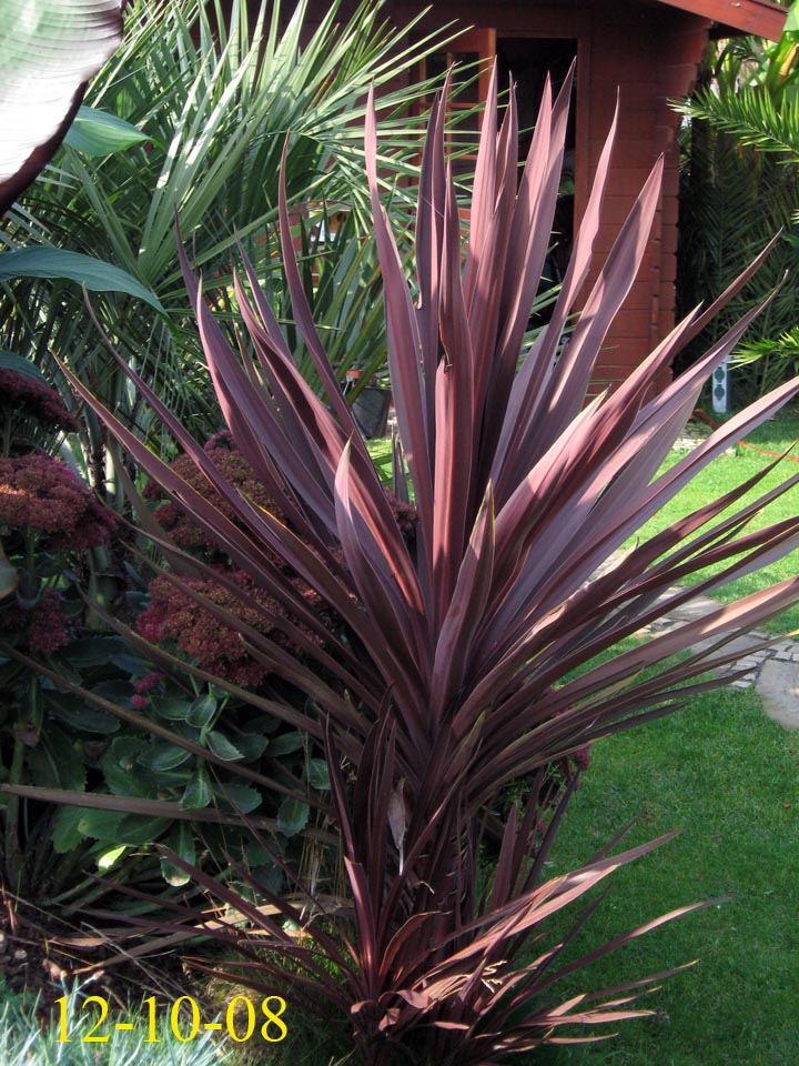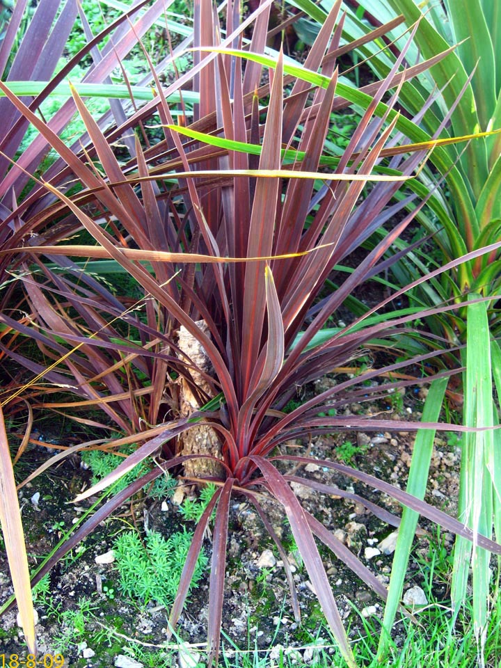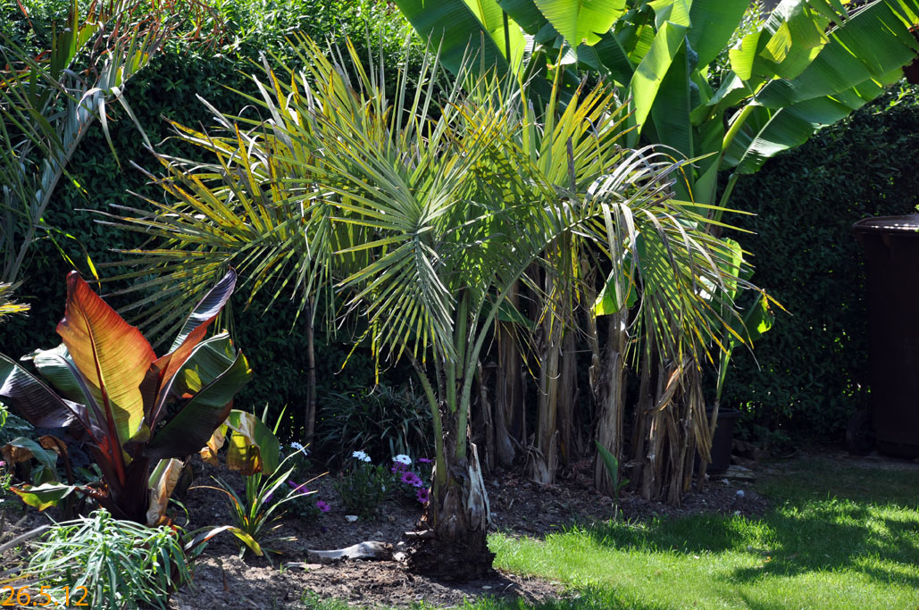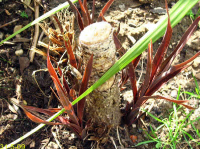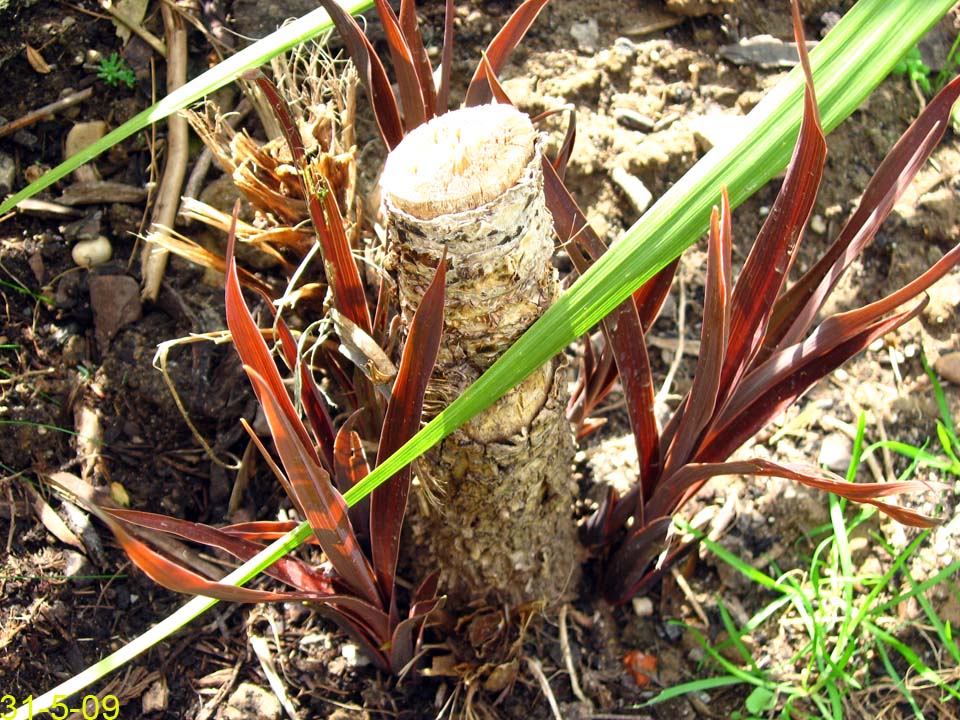 CordylineCordyline australis "Red Star" (Rote Keulenlilie)diese rote Form der Keulenlilie stammt aus Neuseeland und ist völlig unproblematisch zu halten. In Neuseeland gibt es mehrere hundert Jahre alte Exemplare, die gigantische Ausmaße annehmen können. Ihre Winterhärte liegt unterhalb der der grünen Cordyline und wird meist mit -5 bis -8°C angegeben.Hier ein Link zu Cordylines in Neuseeland: http://www.nzplantpics.com/sfeature_galleries/cordyline_gallery.htm Meine Cordyline australis "Red star" habe ich im Frühjahr 2007 in Holland für sage und schreibe 3€ gekauft und gleich im Garten ausgepflanzt, obwohl ich natürlich schon wusste, dass dies ein gewisses Risiko darstellen würde, da sie doch um einiges weniger Frost vertragen sollte, als z.B. die grüne Cordyline. Dennoch dachte ich mir, zu diesem Preis könne man das ruhig probieren... So habe ich sie nicht einmal im ersten Winter geschützt, obwohl die Blätter zum Teil sicher aus einem Gewächshaus stammten. Lediglich in den kältesten Nächten (kurzzeitig -9°C in den Morgenstunden) habe ich sie mit einem Vlies umwickelt, Nächte mit -4 bis -5°C musste sie ohne Schutz überstehen und hat das auch blendend geschafft, lediglich einige Risse in den Blättern waren zu sehen. Im Frühjahr 2008 habe ich sie einmalig mit Auxin gegossen, worauf sie prompt mit vielen kleinen Ablegern reagierte. Den Winter 2008/2009 hat die Cordyline leider nicht überstanden, da sie bei Temperaturen bis -16,5°C und mehreren Tagen Dauerfrost im zweistelligen Minusbereich lediglich in ein Vlies eingewickelt war. Mal sehen ob sie im Frühjahr noch einmal austreibt, aber ich denke, die Chancen stehen nicht gut. Da ich mir die Stummel nicht länger ansehen wollte habe ich neue Cordies neben den alten gepflanzt. So haben die erfrorenen Cordies weiter die Chance neu auszutreiben... Und siehe da, Anfang Mai zeigt sich an der roten Cordyline wieder Leben. Mehrere Triebe sind zu sehen... Die rote Cordyline wurde gleichzeitig in gleicher Größe mit der grünen Cordyline gepflanzt, wollte aber nicht so recht wachsen. Nun weiß ich auch warum, allerdings nicht wie es dazu kam..., bemerkt habe ich es erst jetzt, weil der Stamm unter Bärenfellgras normalerweise nicht zu sehen ist. 2010Im Winter 09/10 wurden die Cordies dick gemulcht und per Vlies geschützt. Als Beheizung diente etwa ein halber Lichtschlauch, der am UT-100 der Butia angeschlossen war, die ab -6°C beheizt wurde. Als es unter -10°C kalt wurde, habe ich zusätzlich eine Gewebeplane über das Vlies geworfen. Resultat ist, dass die rote Cordy auch dieses Jahr wieder bodeneben zurückgefroren ist- mein Fazit: Rote Cordies sind nur mit einem beheizten Vollschutz zu überwintern. Mehr als -6°C sollte man ihr bei länger anhaltenden Kaltphasen nicht zumuten. Dennoch entpuppen sich die Cordies (sowohl red wie auch green) als Stehaufmännchen. Auch dieses Jahr treiben sie wieder aus. Da sie aber auf diese Weise nur vor sich hindümpeln, habe ich die Auspflanzung von Cordyline erst einmal auf Eis gelegt bis ich einen geeigneteren Standort zur Verfügung habe. 4.10.12 - Im Sommer 2011 habe ich dann mein Braheabeet neu gestaltet und dadurch wurde dann ein Plätzchen für einen neuen Versuch mit der roten Corsy frei. An dieser Stelle wird das komplette Beet im Winter geschützt, da dort die Brahea, eine Parajubaea und zwei C. revoluta gepflanzt wurden. Also ein gutes Plätzchen für die rote Cordy. Die rote Cordy steht ein wenig im Schatten der Brahea und wächst deshalb nicht ganz so kräftig wie mein früheres Exemplar am Bachlauf. Nicht schlimm, von mir aus kann sie sich Zeit lassen... Winterschäden gab es bei Beheizung ab -4°C natürlich keine. Cordyline australis (green)20082009Die grüne Cordyline hat den Winter 2008/2009 nicht geschafft - wurde allerdings auch nicht geschützt. Vielleicht treibt sie ja wieder aus, aber auch hier mache ich mir keine großen Hoffnungen. 2010Auch die grüne Cordyline hat den langen Winter 09/10 wieder nicht geschafft. Zunächst sah sie noch ganz gut aus, später knickte die Spitze ein und man konnte die Neutriebe aus dem Wachstumszentrum herausziehen. Ich denke allerdings, dass sie sich wieder erholen wird. 5.10.12 - Die grüne Cory hat einige Seitentriebe gebildet und führt nun seit 2010 ein Schattendasein hinter der Butia. Ich hatte sie dort so gepflanzt, dass sie gerade eben noch mit in den Winterschutz der Butia passt, andererseits aber dort recht unauffällig bleibt bis sie wieder einigermaßen aussieht. Die Regeneration dauert nun bereits recht lange, aber immerhin, sie wächst und sieht zumindest immer besser aus.