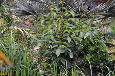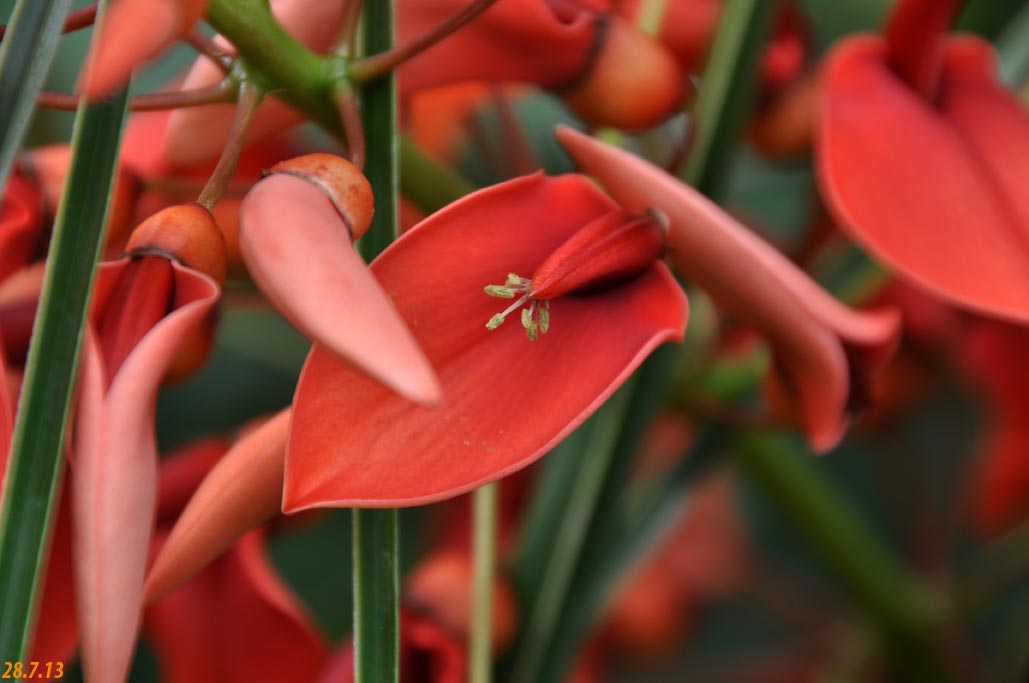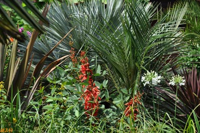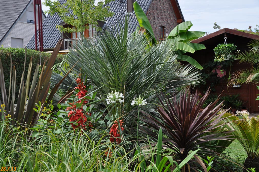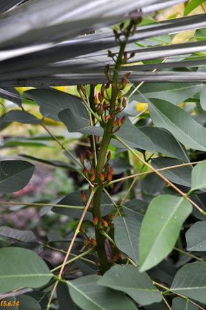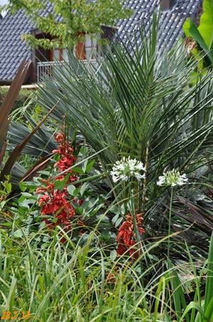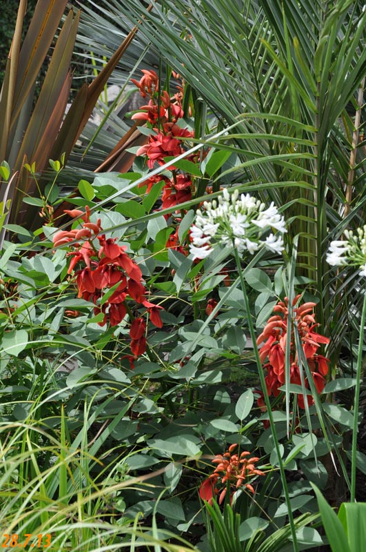 Erythrina crista-galli C.v. Linné (Korallenbaum)E. crista galli ist wohl der bekannteste Korallenbaum. Seine Heimat liegt in Brasilien, Paraguay, Uruguay und Argentinien (Nationalbaum). Er gehört zur Unterfamilie der Schmetterlingsblütler (Fabaoideae) in der Familie der Hülsenfrüchtler ( Fabacae). Oft wird er auch als Korallenstrauch bezeichnet, was wahrscheinlich daran liegt, dass er hier in unserem Klima fast ausschließlich als Kübelpflanze gehalten wird und dann auch nur etwa eine maximale Höhe von 3m erreicht, obwohl es sich in Wirklichkeit um einen Baum handelt. Oder handelt es sich bei der im Handel meist angebotenden Sorte "compacta" tatsächlich um eine kleinbleibende Zuchtform? Nicht nur die Blüten, die dem Baum den Namen gegeben haben (crista-galli= Hahnenkamm) sind wegen ihrer intensiv roten Färbung sehr auffallend, sondern auch der Rest der Pflanze. Die Wurzeln sind stark verdickt und knollig, ebenso wird der Stamm mit zunehmendem Alter dick und knorrig, so dass er an Weinstöcke erinnert. Aus dem Stamm bilden sich an "schlafenden Knospen" Zweige von denen die Blatttriebe abgehen aus denen sich dreifiedrige Blätter entwickeln. Die Zweige sind stark bedornt, so dass man dem Korallenbaum besser nicht zu nahe kommt. Erwähnen sollte man vielleicht auch, dass alle Pflanzenteile, insbesondere die Samen, stark giftig sind! Im Herbst werfen die Bäume ihre Blätter ab und auch die Zweige trocknen recht weit zurück. Nun kann der Baum recht einfach fast trocken (das Substrat sollte lediglich eine minimale Restfeuchte haben) auch dunkel überwintern. Als Kübelpflanze sollte man ihn frostfrei halten, ausgepflanzt soll er auch leichte Fröste aushalten. An manchen Stellen wird sogar von einer Frosthärte von -10°C berichtet, was mich auf den Gedanken bringt es eventuell mal mit einer Auspflanzung zu versuchen, sobald der Stamm gut verholzt ist. Meinen Korallenbaum habe ich 2011 bekommen und entgegen der Empfehlungen relativ warm überwintert. Zwar trockneten auch bei dieser Überwinterung zunächst Blätter und Zweige ein, jedoch begann die Pflanze bereits im Januar wieder auszutreiben und im April blühte der Baum bereits im Haus. Anschließend wurde die Crista-galli im Mai ausgepflanzt und wuchs dort bis etwa Juli recht unscheinbar vor sich hin, bis sich dann endlich wieder die ersten Blüten zeigten. Da ich neugierig war wie sich die Wurzeln entwickelt haben, grub ich die Crista-galli Ende September wieder aus um sie einzutopfen. Nicht schlecht für ein Jahr im Garten und die auf dem Foto sichtbaren Wurzeln sind nicht komplett, denn ein riesiges Stück ist beim Ausgraben leider ein Opfer des Spatens geworden. Na ja, nun steht sie im Kübel auf der Terasse und wird dann sobald Frost in Sicht ist zur Überwinterung ins Haus gestellt - dieses Jahr allerdings kalt und nächtes Jahr schauen wir dann vielleicht schonmal ob wir noch einen geeigneten Dauerplatz im Garten finden... Dieses Jahr habe ich den Korallenbaum ausgepflanzt. Dazu wählte ich wegen der Verletzungsgefahr, insbesondere für die im Garten spielenden Kinder, einen unzugänglichen Platz zwischen Teich und Brahea. Der Standort ist so gewählt, dass die Erythrina innerhalb des Brahea-Winterschutzes steht, der ab ca. -4°C beheizt wird. Ob die Pflanze das aushält wird sich dann im kommenden Winter zeigen. Leider ist dieser Platz nicht vollsonnig, aber ich hoffe, dass das Lichtangebot für den Korallenbaum ausreicht. 2014