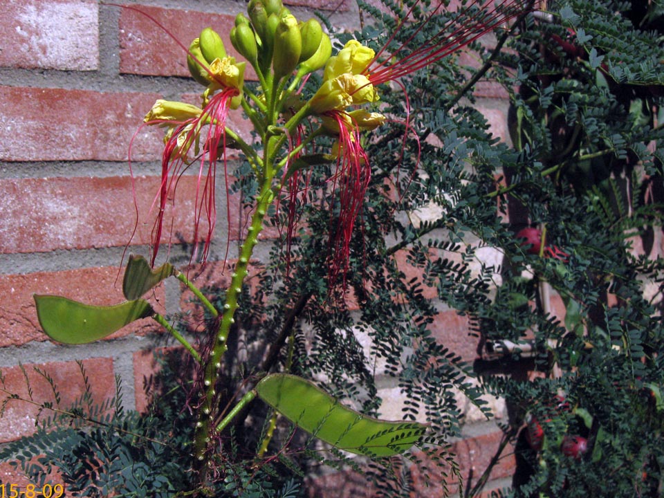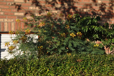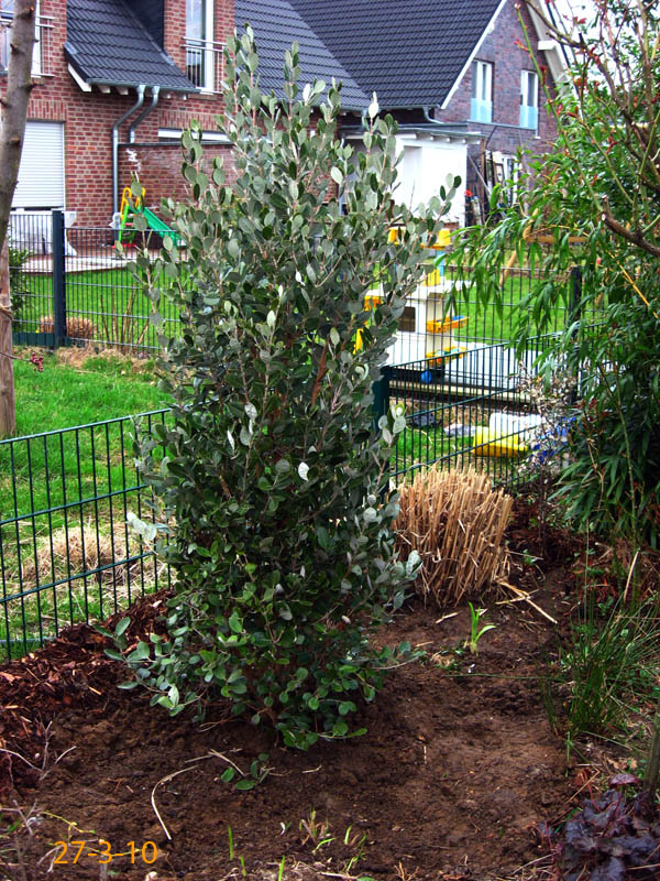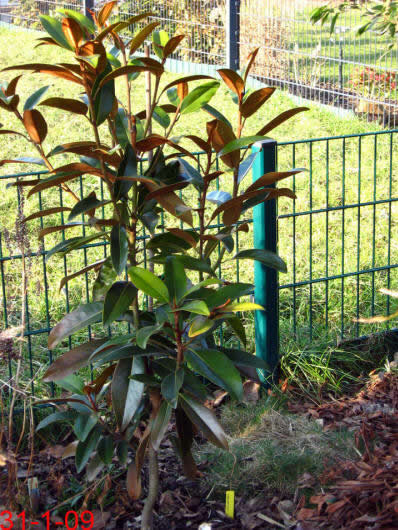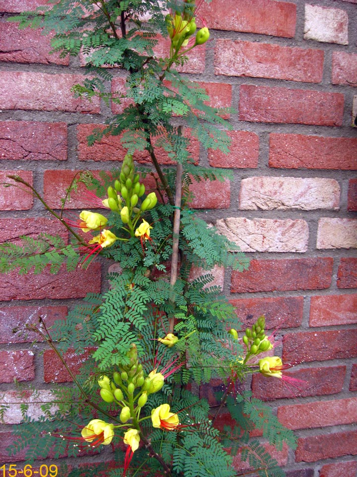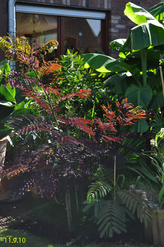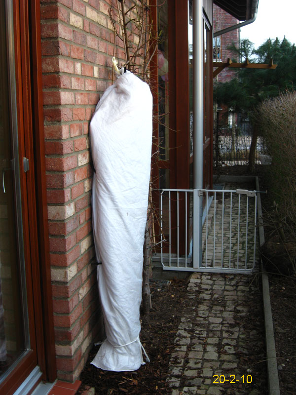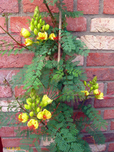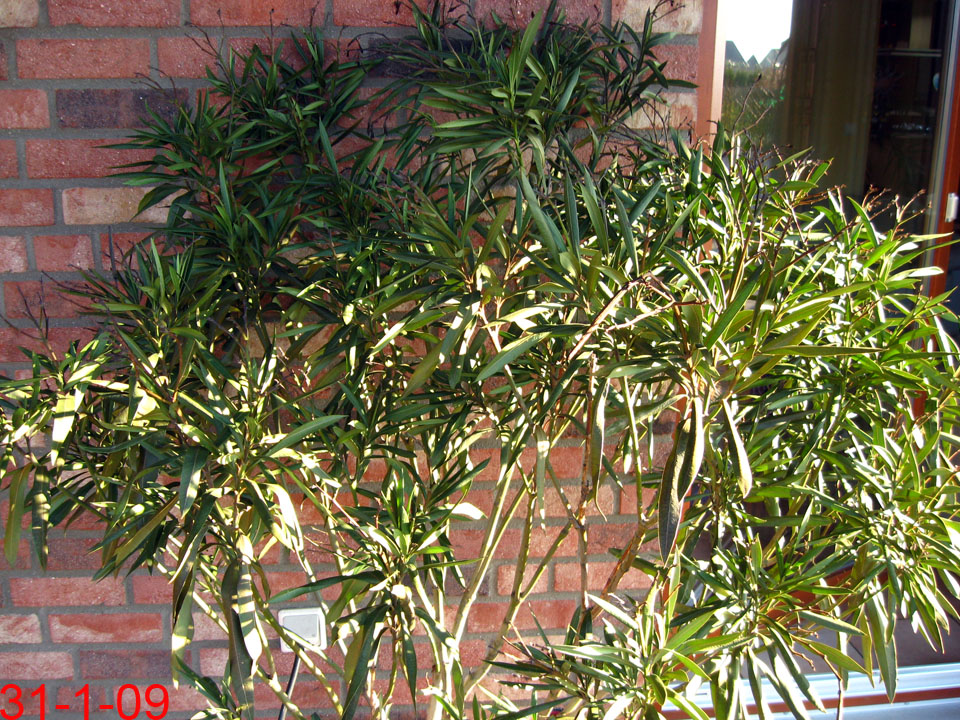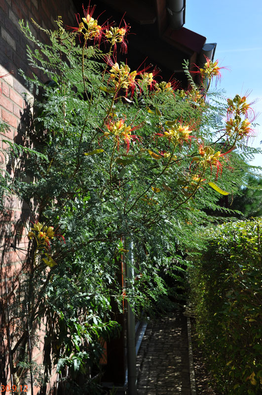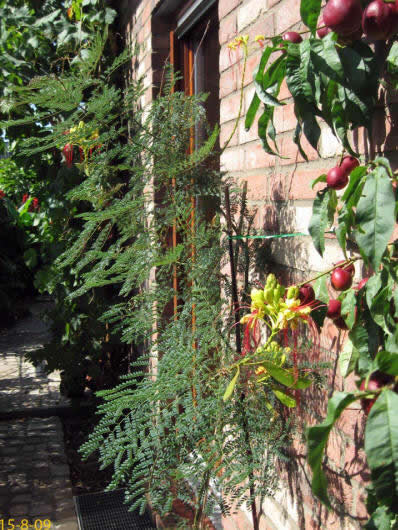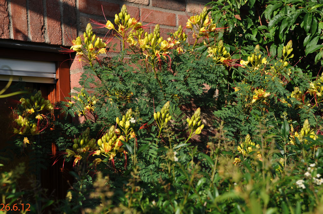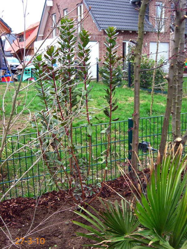 Caesalpina gilliesii hat den Winter 08/09 im Topf bei -6°C überlebt und wurde nun an der Hauswand ausgepflanzt. Seit einigen Tagen treibt die Pflanze nun - Ende April - aus... Samenschoten der Caesalpinia. Von diesen Samen habe ich im November 09 vier Samen in einen Topf mit Erde gesetzt. Bereits einen Tag später waren die ersten Wurzeln zu sehen und die Keimlinge legen trotz kühler Temperaturen (tagsüber 15-18°C, nachts etwa 10°C) ein ordentliches Wachstum an den Tag. Die Überwinterung draußen hat im Winter 09/10 wie es bisher aussieht super funktioniert. Natürlich hatte sie einen idealen Standort an der Westseite des Hauses und profitierte sicher auch von der Wärme der Kellerwand, so dass der Boden sicher nicht gefroren war, da zusäzlich obenrum noch eine dicke Mulchschicht lag. Ich hatte die Caesalpinia mehrlagig in ein gewöhnliches Winterschutzvlies eingewickelt (etwa drei Lagen) und als es dann immer kälter wurde zusätzlich eine Vliesdecke aus dem Rettungsdienst um die Pflanze gewickelt. Als ich die Vliese nun Ende Februar entfernte traute ich meinen Augen kaum, dass die Blätter zwar vertrocknet, aber immernoch grün waren. Auch die Ästchen sind bis in die Spitzen grün, es sind keine Erfrierungen zu erkennen. Da der Winter 09/10 sehr lange dauerte und das Frühjahr ebenfalls sehr lange sehr kalt war trieb die Caesalpinia erst relativ spät aus. Dadurch, dass es dann Ende Juni sehr heiß wurde, holte sie aber schnell auf und begann schnell zu blühen. Bereits Mitte Juli gibts die ersten Samenschoten. Beim Winterschutz zeigt sich wie sehr die Caesalpinia dieses Jahr gewachsen ist. Die Vliesdecke reichte nicht mehr aus. Inzwischen hat die Caesalpinia ordentlich an Volumen gewonnen und ich denke, dieses Jahr komme ich um einen Rückschnitt nicht drumrum um sie noch einigermaßen in Vlies packen zu können. Dieses Jahr scheint ein außerordentlich gutes Caesalpinia-Jahr gewesen zu sein, denn sie blüht nun bereits seit Anfang Juni unaufhörlich und ein Ende ist nicht abzusehen. Wer diesen wunderschönen Dauerblüher nicht pflanzt ist selbst schuld! ;-) Magnolia grandiflora "Alta"Nerium oleander2011"Villa romaine" 2010Von Michael aus Oberhausen habe ich drei Oleander "Villa romaine, Italia und Lluteum plenum" geschenkt bekommen. Den "Villa romaine" und "Luteum plenum" habe ich nahe der Phoenix ausgepflanzt, so dass sie im Winter durch den beheizten Phoenixschutz ebenfalls geschützt werden. Der Italia bleibt vorerst im Kübel. 2009Oleander der Sorte "Italia" sind im Winter 08/09 erfroren. Bisher sieht es nicht so aus, als würde er noch einmal austreiben. Eucalyptus gunniiGleich im ersten Winter 09/10 erfroren.. :-( Strelitzia reginaeAcer palmatumPrunus persica nucipersicaVitus "Himrod"