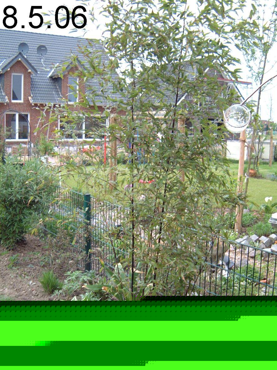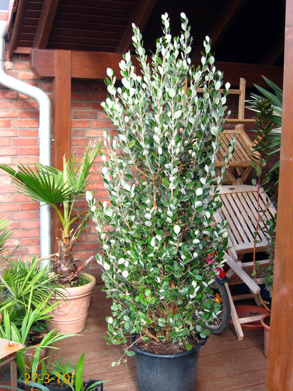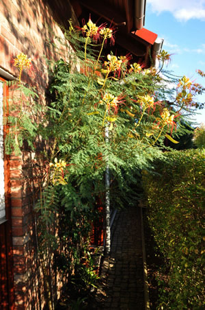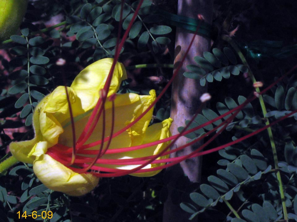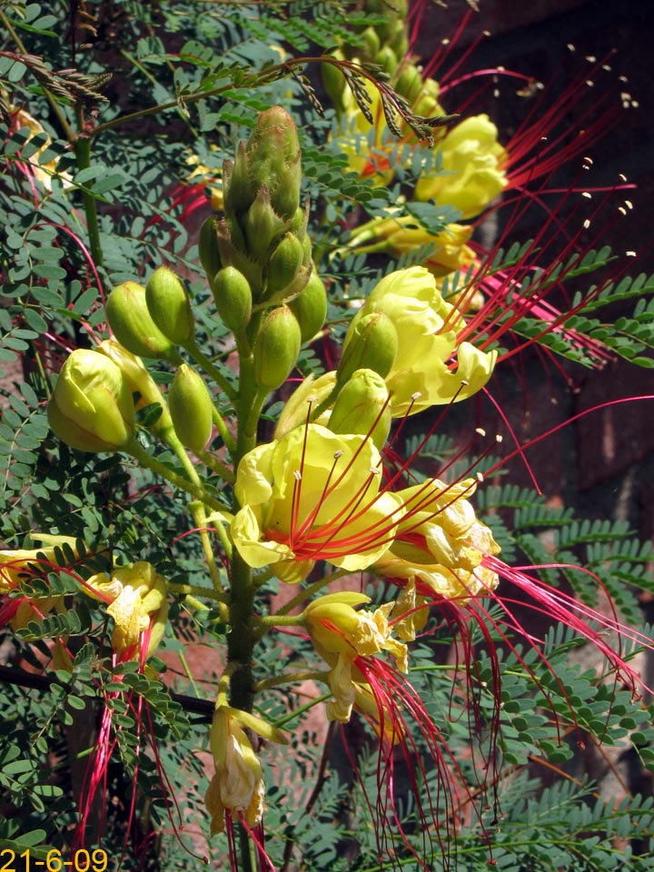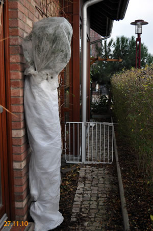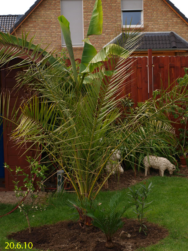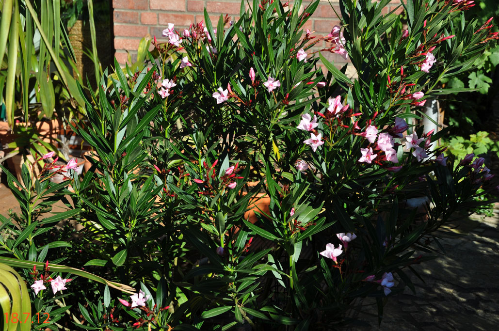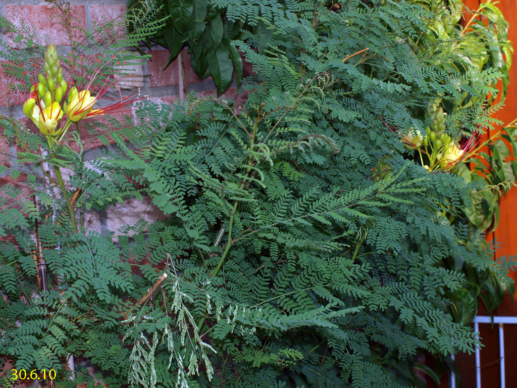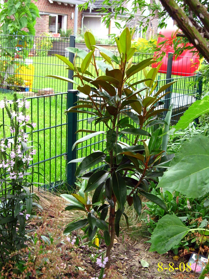 Caesalpina gilliesii hat den Winter 08/09 im Topf bei -6°C überlebt und wurde nun an der Hauswand ausgepflanzt. Seit einigen Tagen treibt die Pflanze nun - Ende April - aus... Samenschoten der Caesalpinia. Von diesen Samen habe ich im November 09 vier Samen in einen Topf mit Erde gesetzt. Bereits einen Tag später waren die ersten Wurzeln zu sehen und die Keimlinge legen trotz kühler Temperaturen (tagsüber 15-18°C, nachts etwa 10°C) ein ordentliches Wachstum an den Tag. Die Überwinterung draußen hat im Winter 09/10 wie es bisher aussieht super funktioniert. Natürlich hatte sie einen idealen Standort an der Westseite des Hauses und profitierte sicher auch von der Wärme der Kellerwand, so dass der Boden sicher nicht gefroren war, da zusäzlich obenrum noch eine dicke Mulchschicht lag. Ich hatte die Caesalpinia mehrlagig in ein gewöhnliches Winterschutzvlies eingewickelt (etwa drei Lagen) und als es dann immer kälter wurde zusätzlich eine Vliesdecke aus dem Rettungsdienst um die Pflanze gewickelt. Als ich die Vliese nun Ende Februar entfernte traute ich meinen Augen kaum, dass die Blätter zwar vertrocknet, aber immernoch grün waren. Auch die Ästchen sind bis in die Spitzen grün, es sind keine Erfrierungen zu erkennen. Da der Winter 09/10 sehr lange dauerte und das Frühjahr ebenfalls sehr lange sehr kalt war trieb die Caesalpinia erst relativ spät aus. Dadurch, dass es dann Ende Juni sehr heiß wurde, holte sie aber schnell auf und begann schnell zu blühen. Bereits Mitte Juli gibts die ersten Samenschoten. Beim Winterschutz zeigt sich wie sehr die Caesalpinia dieses Jahr gewachsen ist. Die Vliesdecke reichte nicht mehr aus. Inzwischen hat die Caesalpinia ordentlich an Volumen gewonnen und ich denke, dieses Jahr komme ich um einen Rückschnitt nicht drumrum um sie noch einigermaßen in Vlies packen zu können. Dieses Jahr scheint ein außerordentlich gutes Caesalpinia-Jahr gewesen zu sein, denn sie blüht nun bereits seit Anfang Juni unaufhörlich und ein Ende ist nicht abzusehen. Wer diesen wunderschönen Dauerblüher nicht pflanzt ist selbst schuld! ;-) Magnolia grandiflora "Alta"Nerium oleander2011"Villa romaine" 2010Von Michael aus Oberhausen habe ich drei Oleander "Villa romaine, Italia und Lluteum plenum" geschenkt bekommen. Den "Villa romaine" und "Luteum plenum" habe ich nahe der Phoenix ausgepflanzt, so dass sie im Winter durch den beheizten Phoenixschutz ebenfalls geschützt werden. Der Italia bleibt vorerst im Kübel. 2009Oleander der Sorte "Italia" sind im Winter 08/09 erfroren. Bisher sieht es nicht so aus, als würde er noch einmal austreiben. Eucalyptus gunniiGleich im ersten Winter 09/10 erfroren.. :-( Strelitzia reginaeAcer palmatumPrunus persica nucipersicaVitus "Himrod"