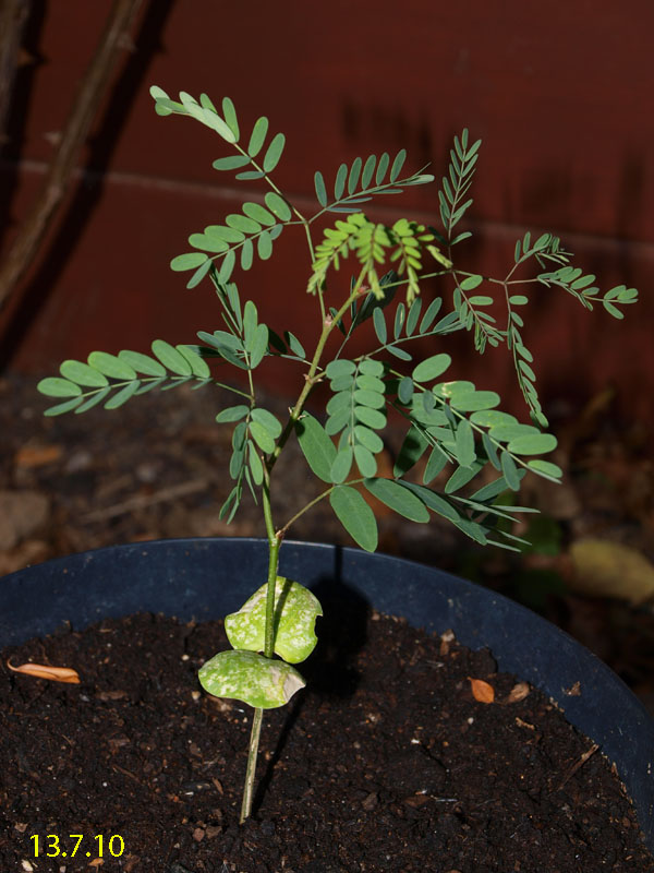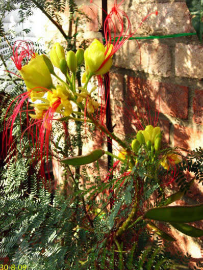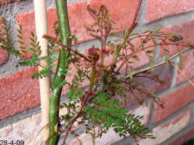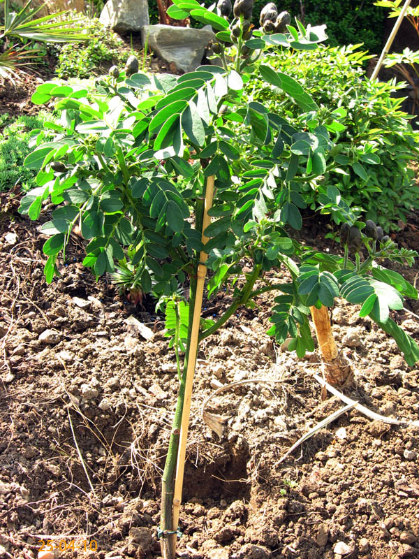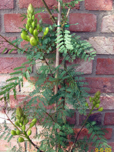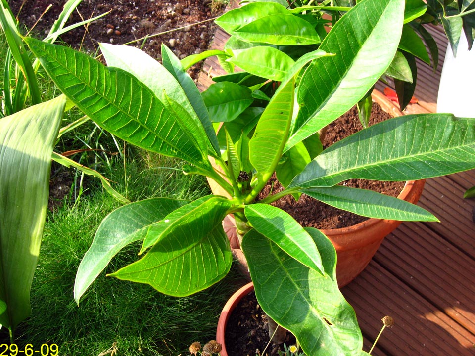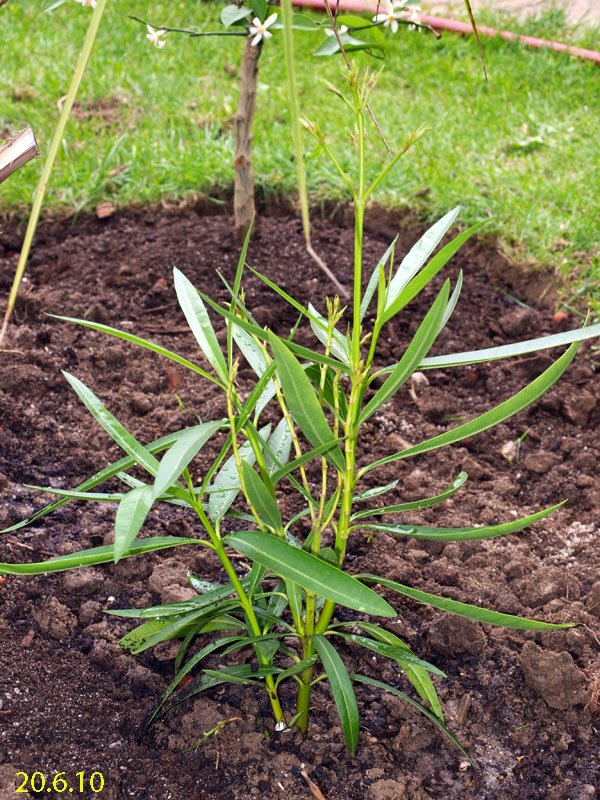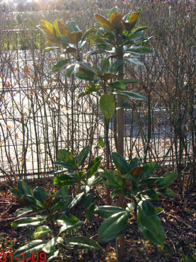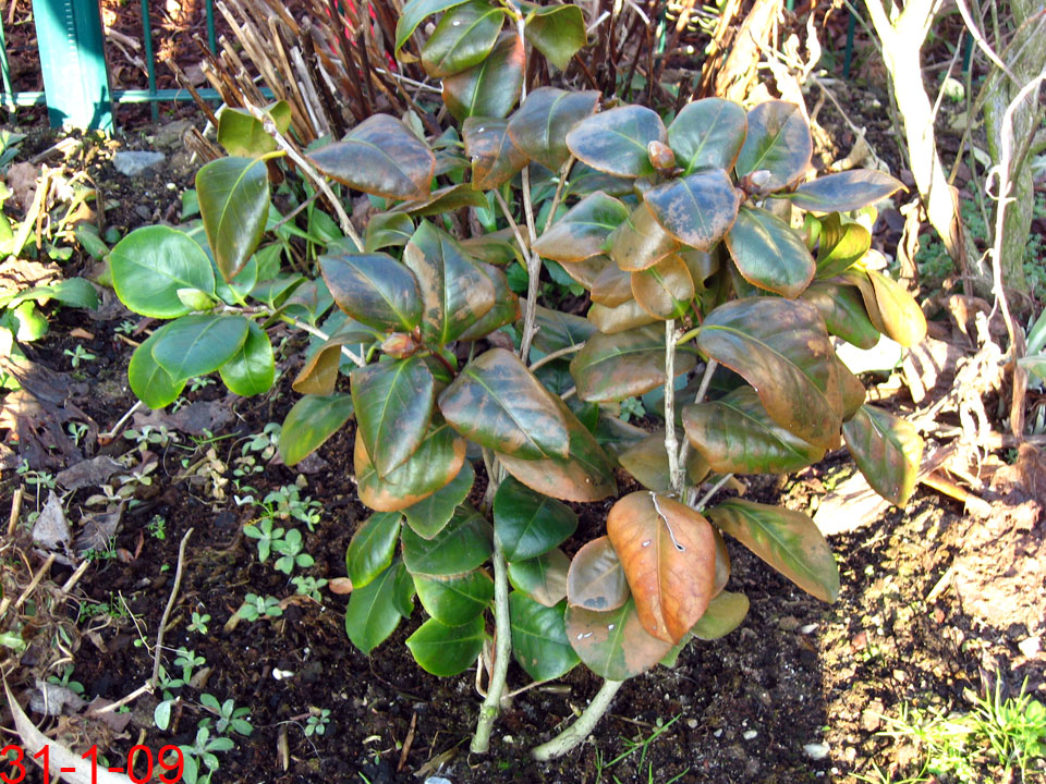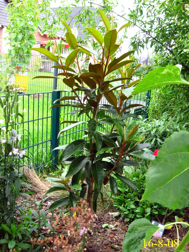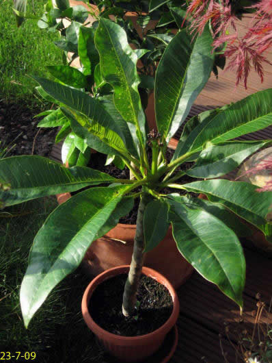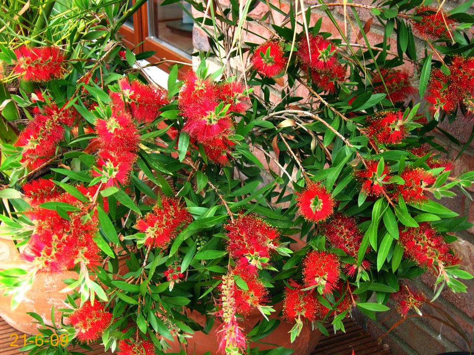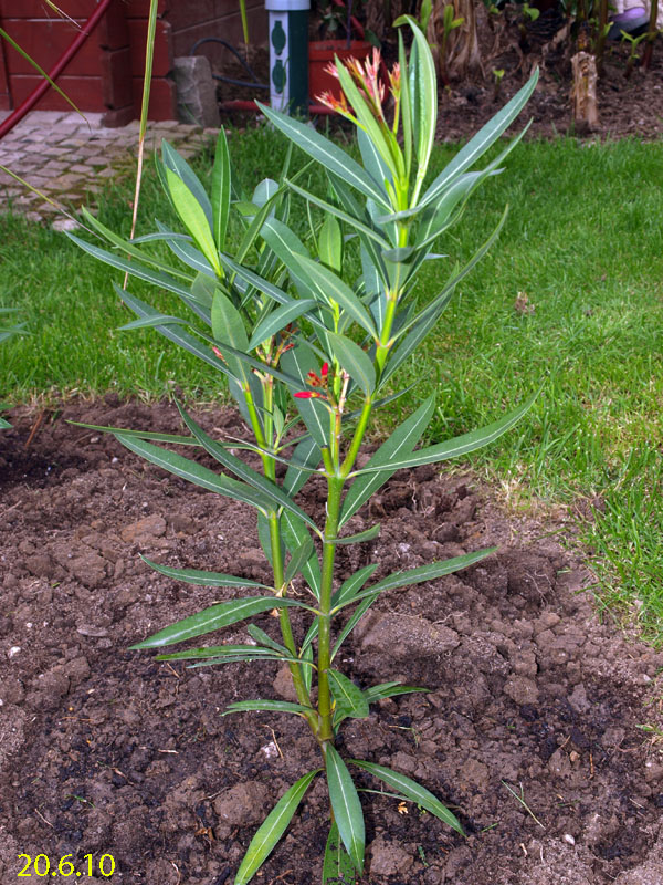Caesalpina gilliesii hat den Winter 08/09 im Topf bei -6°C überlebt und wurde nun an der Hauswand ausgepflanzt. Seit einigen Tagen treibt die Pflanze nun - Ende April - aus... Samenschoten der Caesalpinia. Von diesen Samen habe ich im November 09 vier Samen in einen Topf mit Erde gesetzt. Bereits einen Tag später waren die ersten Wurzeln zu sehen und die Keimlinge legen trotz kühler Temperaturen (tagsüber 15-18°C, nachts etwa 10°C) ein ordentliches Wachstum an den Tag. Die Überwinterung draußen hat im Winter 09/10 wie es bisher aussieht super funktioniert. Natürlich hatte sie einen idealen Standort an der Westseite des Hauses und profitierte sicher auch von der Wärme der Kellerwand, so dass der Boden sicher nicht gefroren war, da zusäzlich obenrum noch eine dicke Mulchschicht lag. Ich hatte die Caesalpinia mehrlagig in ein gewöhnliches Winterschutzvlies eingewickelt (etwa drei Lagen) und als es dann immer kälter wurde zusätzlich eine Vliesdecke aus dem Rettungsdienst um die Pflanze gewickelt. Als ich die Vliese nun Ende Februar entfernte traute ich meinen Augen kaum, dass die Blätter zwar vertrocknet, aber immernoch grün waren. Auch die Ästchen sind bis in die Spitzen grün, es sind keine Erfrierungen zu erkennen. Da der Winter 09/10 sehr lange dauerte und das Frühjahr ebenfalls sehr lange sehr kalt war trieb die Caesalpinia erst relativ spät aus. Dadurch, dass es dann Ende Juni sehr heiß wurde, holte sie aber schnell auf und begann schnell zu blühen. Bereits Mitte Juli gibts die ersten Samenschoten. Beim Winterschutz zeigt sich wie sehr die Caesalpinia dieses Jahr gewachsen ist. Die Vliesdecke reichte nicht mehr aus. Inzwischen hat die Caesalpinia ordentlich an Volumen gewonnen und ich denke, dieses Jahr komme ich um einen Rückschnitt nicht drumrum um sie noch einigermaßen in Vlies packen zu können. Dieses Jahr scheint ein außerordentlich gutes Caesalpinia-Jahr gewesen zu sein, denn sie blüht nun bereits seit Anfang Juni unaufhörlich und ein Ende ist nicht abzusehen. Wer diesen wunderschönen Dauerblüher nicht pflanzt ist selbst schuld! ;-) Magnolia grandiflora "Alta"Nerium oleander2011"Villa romaine" 2010Von Michael aus Oberhausen habe ich drei Oleander "Villa romaine, Italia und Lluteum plenum" geschenkt bekommen. Den "Villa romaine" und "Luteum plenum" habe ich nahe der Phoenix ausgepflanzt, so dass sie im Winter durch den beheizten Phoenixschutz ebenfalls geschützt werden. Der Italia bleibt vorerst im Kübel. 2009Oleander der Sorte "Italia" sind im Winter 08/09 erfroren. Bisher sieht es nicht so aus, als würde er noch einmal austreiben. Eucalyptus gunniiGleich im ersten Winter 09/10 erfroren.. :-( Strelitzia reginaeAcer palmatumPrunus persica nucipersicaVitus "Himrod"