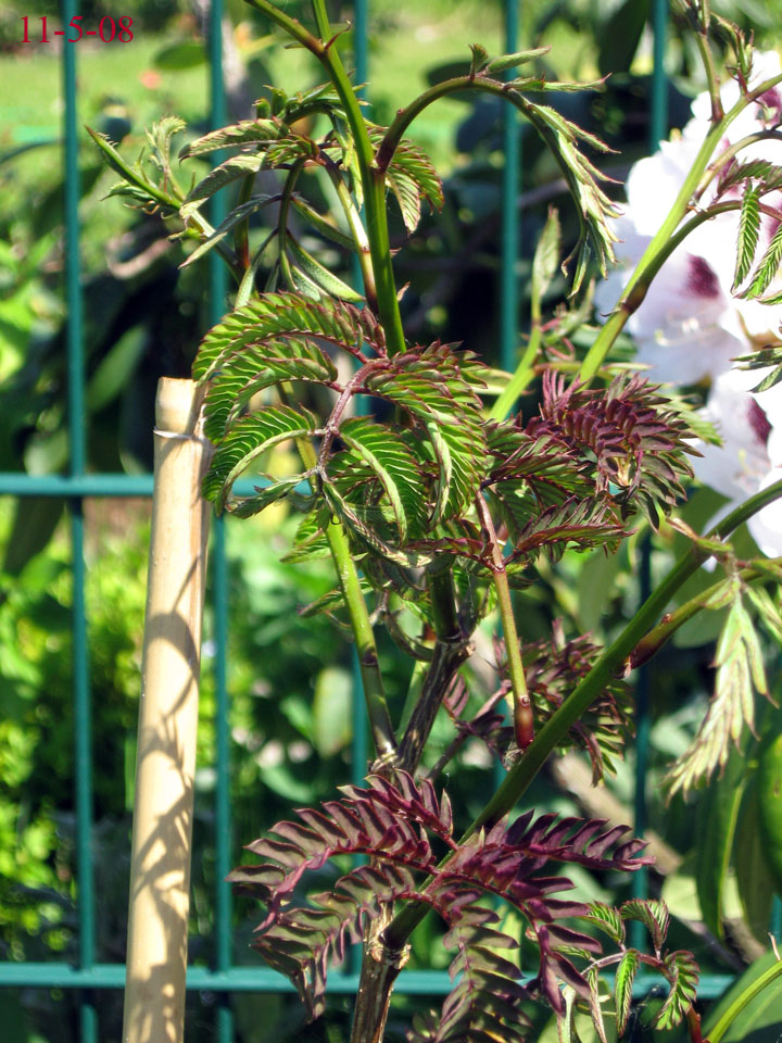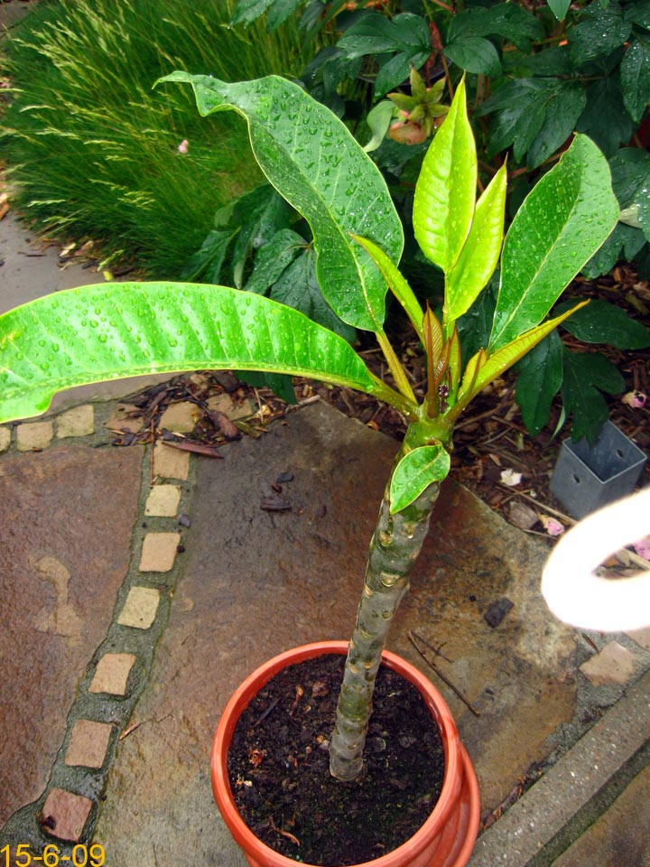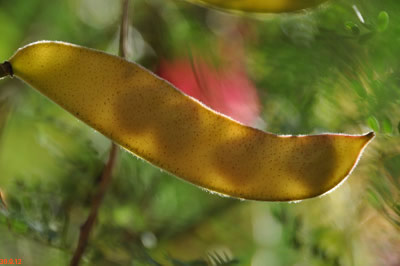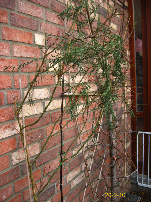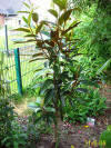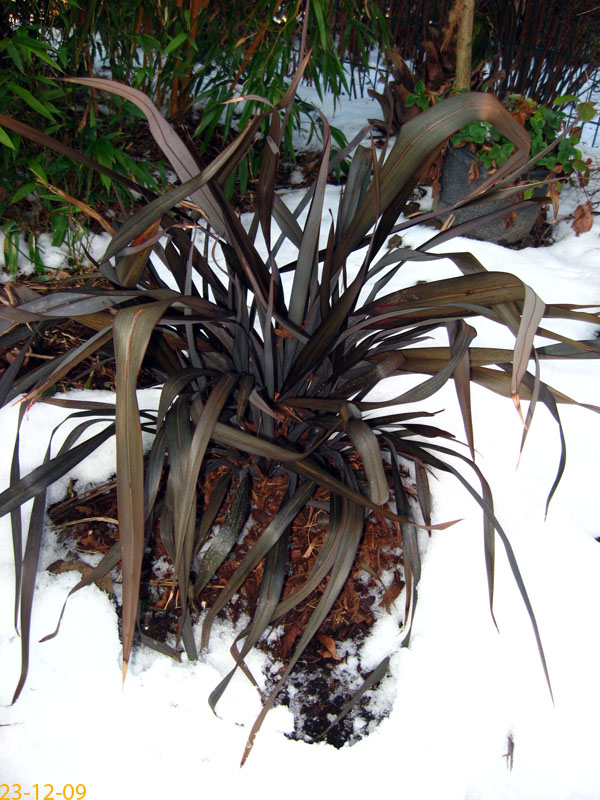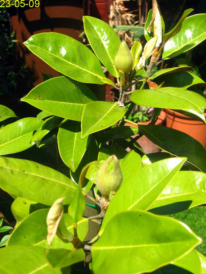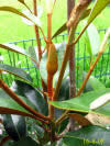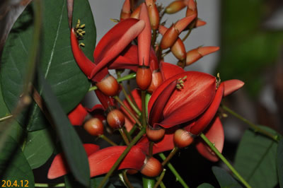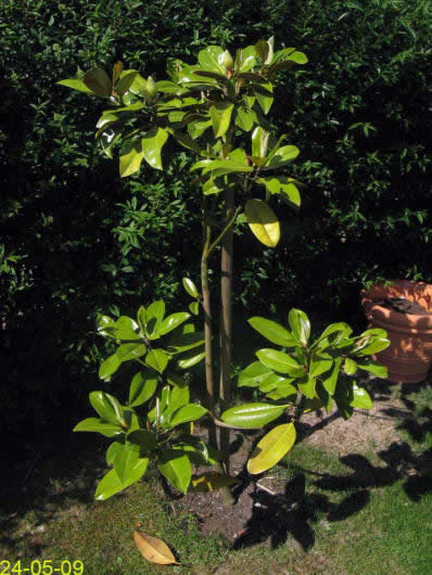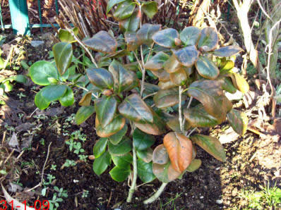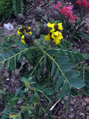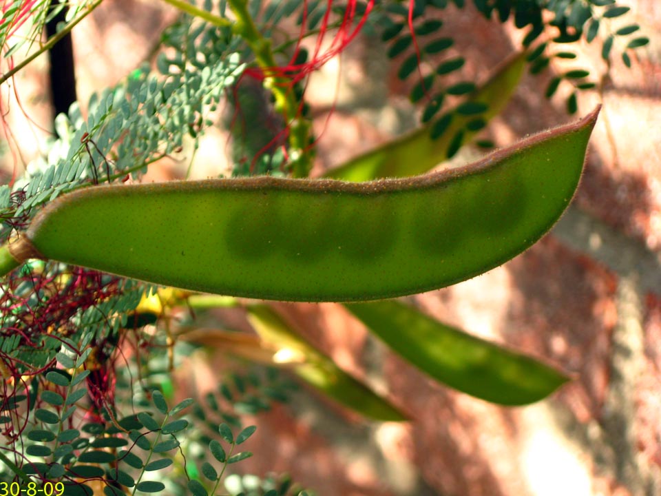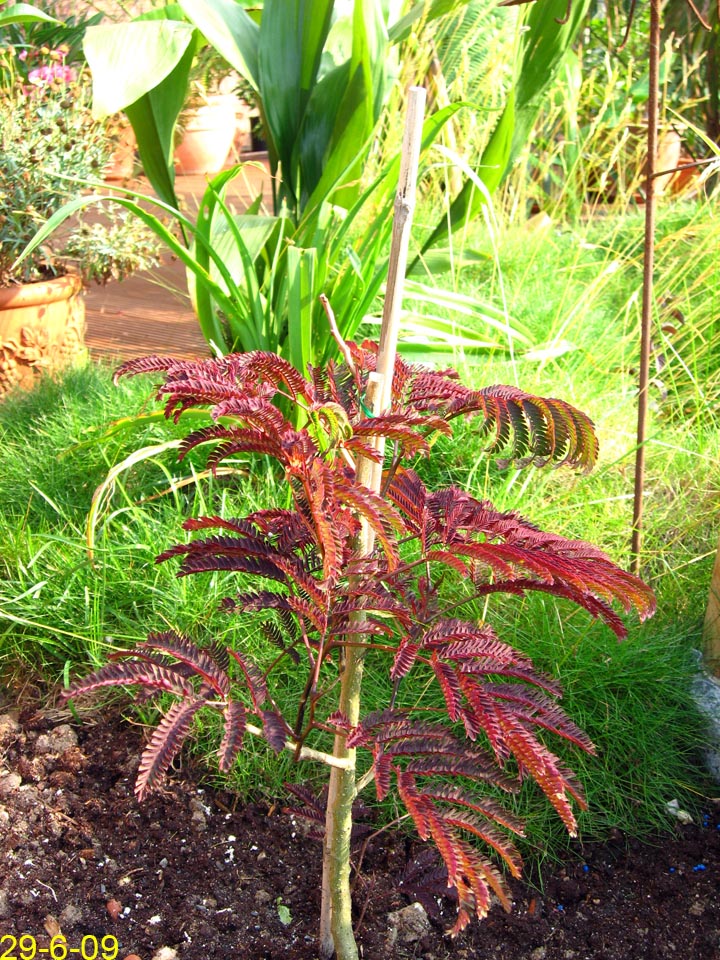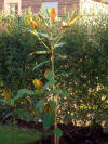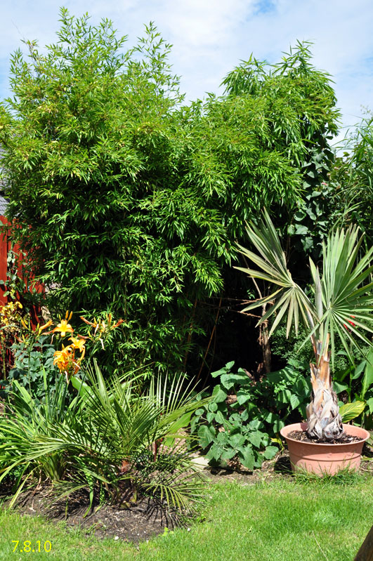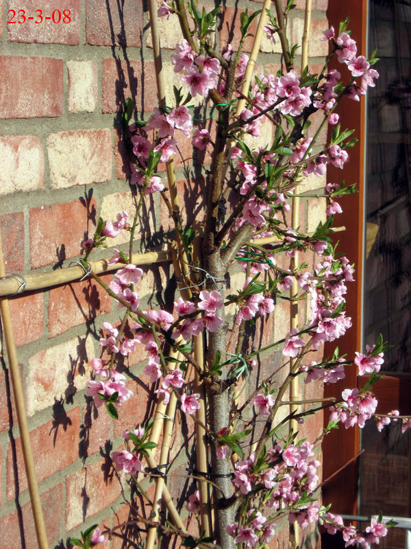 Caesalpina gilliesii hat den Winter 08/09 im Topf bei -6°C überlebt und wurde nun an der Hauswand ausgepflanzt. Seit einigen Tagen treibt die Pflanze nun - Ende April - aus... Samenschoten der Caesalpinia. Von diesen Samen habe ich im November 09 vier Samen in einen Topf mit Erde gesetzt. Bereits einen Tag später waren die ersten Wurzeln zu sehen und die Keimlinge legen trotz kühler Temperaturen (tagsüber 15-18°C, nachts etwa 10°C) ein ordentliches Wachstum an den Tag. Die Überwinterung draußen hat im Winter 09/10 wie es bisher aussieht super funktioniert. Natürlich hatte sie einen idealen Standort an der Westseite des Hauses und profitierte sicher auch von der Wärme der Kellerwand, so dass der Boden sicher nicht gefroren war, da zusäzlich obenrum noch eine dicke Mulchschicht lag. Ich hatte die Caesalpinia mehrlagig in ein gewöhnliches Winterschutzvlies eingewickelt (etwa drei Lagen) und als es dann immer kälter wurde zusätzlich eine Vliesdecke aus dem Rettungsdienst um die Pflanze gewickelt. Als ich die Vliese nun Ende Februar entfernte traute ich meinen Augen kaum, dass die Blätter zwar vertrocknet, aber immernoch grün waren. Auch die Ästchen sind bis in die Spitzen grün, es sind keine Erfrierungen zu erkennen. Da der Winter 09/10 sehr lange dauerte und das Frühjahr ebenfalls sehr lange sehr kalt war trieb die Caesalpinia erst relativ spät aus. Dadurch, dass es dann Ende Juni sehr heiß wurde, holte sie aber schnell auf und begann schnell zu blühen. Bereits Mitte Juli gibts die ersten Samenschoten. Beim Winterschutz zeigt sich wie sehr die Caesalpinia dieses Jahr gewachsen ist. Die Vliesdecke reichte nicht mehr aus. Inzwischen hat die Caesalpinia ordentlich an Volumen gewonnen und ich denke, dieses Jahr komme ich um einen Rückschnitt nicht drumrum um sie noch einigermaßen in Vlies packen zu können. Dieses Jahr scheint ein außerordentlich gutes Caesalpinia-Jahr gewesen zu sein, denn sie blüht nun bereits seit Anfang Juni unaufhörlich und ein Ende ist nicht abzusehen. Wer diesen wunderschönen Dauerblüher nicht pflanzt ist selbst schuld! ;-) Magnolia grandiflora "Alta"Nerium oleander2011"Villa romaine" 2010Von Michael aus Oberhausen habe ich drei Oleander "Villa romaine, Italia und Lluteum plenum" geschenkt bekommen. Den "Villa romaine" und "Luteum plenum" habe ich nahe der Phoenix ausgepflanzt, so dass sie im Winter durch den beheizten Phoenixschutz ebenfalls geschützt werden. Der Italia bleibt vorerst im Kübel. 2009Oleander der Sorte "Italia" sind im Winter 08/09 erfroren. Bisher sieht es nicht so aus, als würde er noch einmal austreiben. Eucalyptus gunniiGleich im ersten Winter 09/10 erfroren.. :-( Strelitzia reginaeAcer palmatumPrunus persica nucipersicaVitus "Himrod"