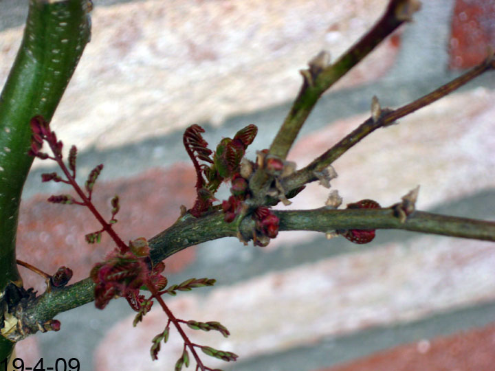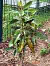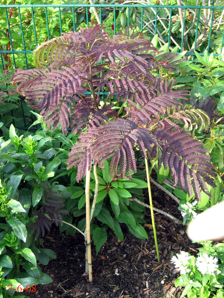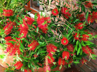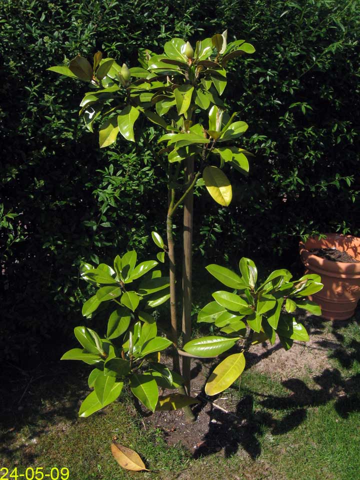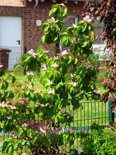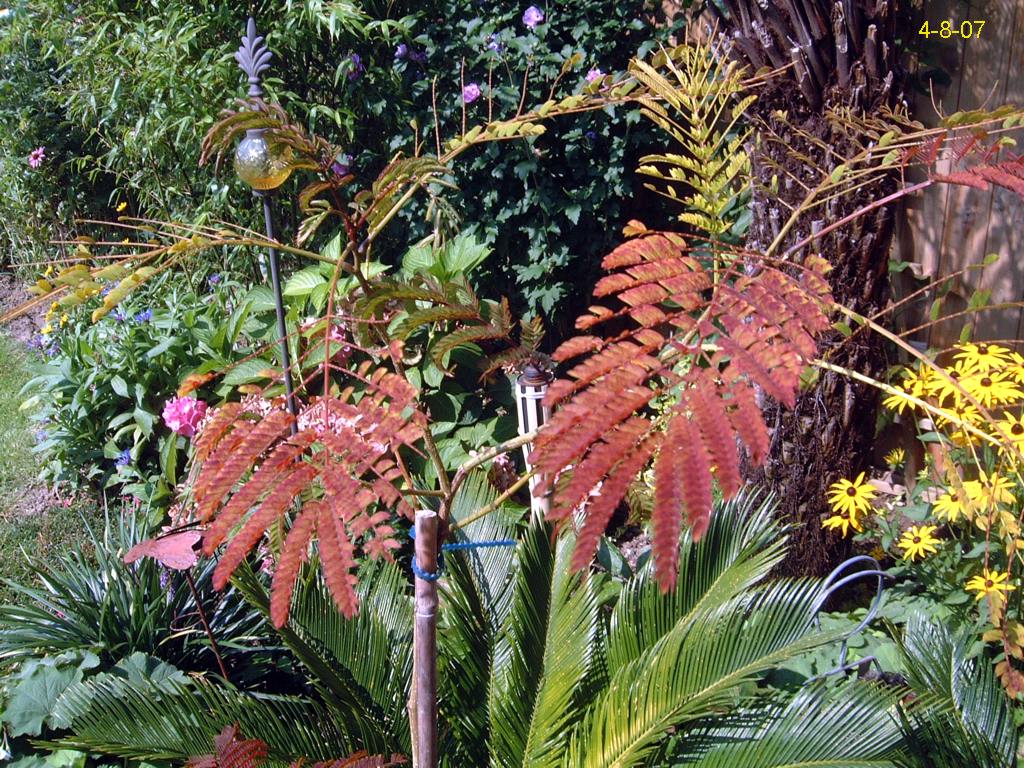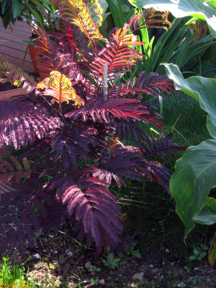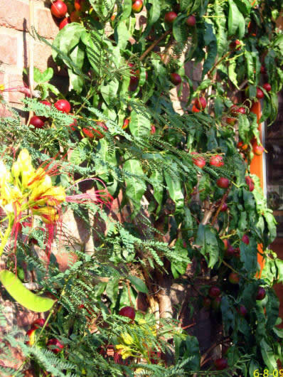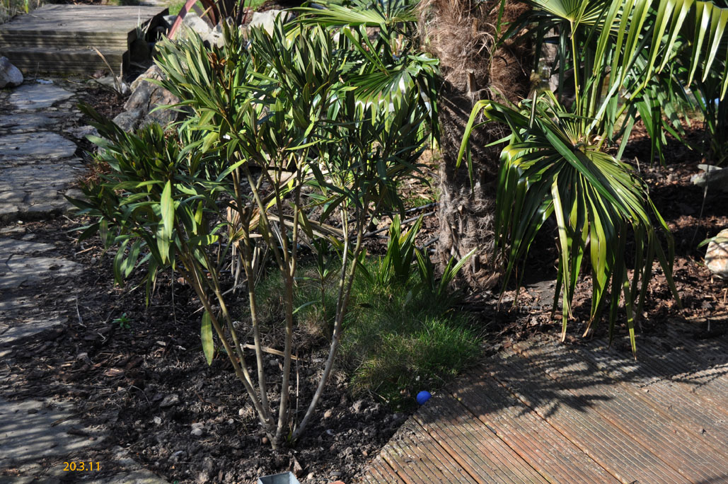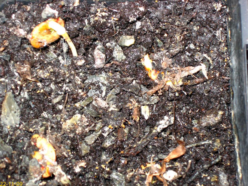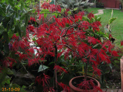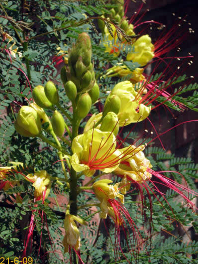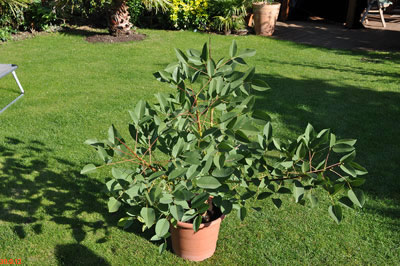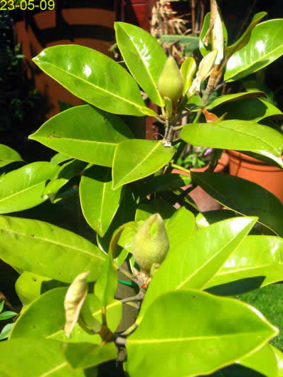 Caesalpina gilliesii hat den Winter 08/09 im Topf bei -6°C überlebt und wurde nun an der Hauswand ausgepflanzt. Seit einigen Tagen treibt die Pflanze nun - Ende April - aus... Samenschoten der Caesalpinia. Von diesen Samen habe ich im November 09 vier Samen in einen Topf mit Erde gesetzt. Bereits einen Tag später waren die ersten Wurzeln zu sehen und die Keimlinge legen trotz kühler Temperaturen (tagsüber 15-18°C, nachts etwa 10°C) ein ordentliches Wachstum an den Tag. Die Überwinterung draußen hat im Winter 09/10 wie es bisher aussieht super funktioniert. Natürlich hatte sie einen idealen Standort an der Westseite des Hauses und profitierte sicher auch von der Wärme der Kellerwand, so dass der Boden sicher nicht gefroren war, da zusäzlich obenrum noch eine dicke Mulchschicht lag. Ich hatte die Caesalpinia mehrlagig in ein gewöhnliches Winterschutzvlies eingewickelt (etwa drei Lagen) und als es dann immer kälter wurde zusätzlich eine Vliesdecke aus dem Rettungsdienst um die Pflanze gewickelt. Als ich die Vliese nun Ende Februar entfernte traute ich meinen Augen kaum, dass die Blätter zwar vertrocknet, aber immernoch grün waren. Auch die Ästchen sind bis in die Spitzen grün, es sind keine Erfrierungen zu erkennen. Da der Winter 09/10 sehr lange dauerte und das Frühjahr ebenfalls sehr lange sehr kalt war trieb die Caesalpinia erst relativ spät aus. Dadurch, dass es dann Ende Juni sehr heiß wurde, holte sie aber schnell auf und begann schnell zu blühen. Bereits Mitte Juli gibts die ersten Samenschoten. Beim Winterschutz zeigt sich wie sehr die Caesalpinia dieses Jahr gewachsen ist. Die Vliesdecke reichte nicht mehr aus. Inzwischen hat die Caesalpinia ordentlich an Volumen gewonnen und ich denke, dieses Jahr komme ich um einen Rückschnitt nicht drumrum um sie noch einigermaßen in Vlies packen zu können. Dieses Jahr scheint ein außerordentlich gutes Caesalpinia-Jahr gewesen zu sein, denn sie blüht nun bereits seit Anfang Juni unaufhörlich und ein Ende ist nicht abzusehen. Wer diesen wunderschönen Dauerblüher nicht pflanzt ist selbst schuld! ;-) Magnolia grandiflora "Alta"Nerium oleander2011"Villa romaine" 2010Von Michael aus Oberhausen habe ich drei Oleander "Villa romaine, Italia und Lluteum plenum" geschenkt bekommen. Den "Villa romaine" und "Luteum plenum" habe ich nahe der Phoenix ausgepflanzt, so dass sie im Winter durch den beheizten Phoenixschutz ebenfalls geschützt werden. Der Italia bleibt vorerst im Kübel. 2009Oleander der Sorte "Italia" sind im Winter 08/09 erfroren. Bisher sieht es nicht so aus, als würde er noch einmal austreiben. Eucalyptus gunniiGleich im ersten Winter 09/10 erfroren.. :-( Strelitzia reginaeAcer palmatumPrunus persica nucipersicaVitus "Himrod"