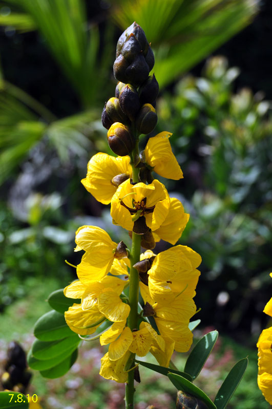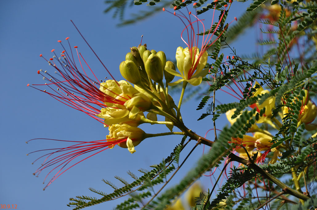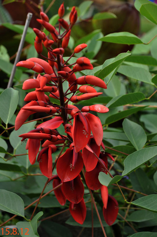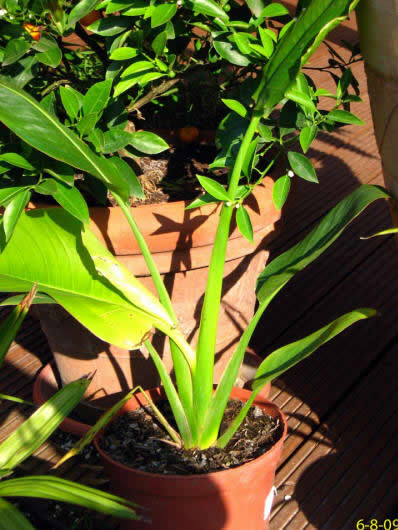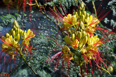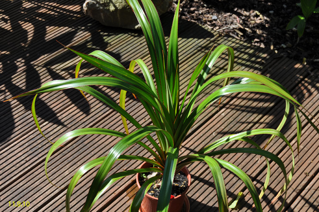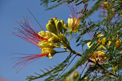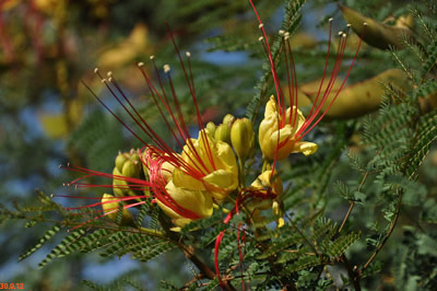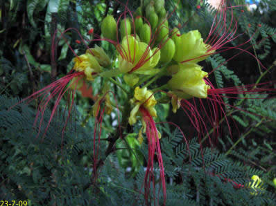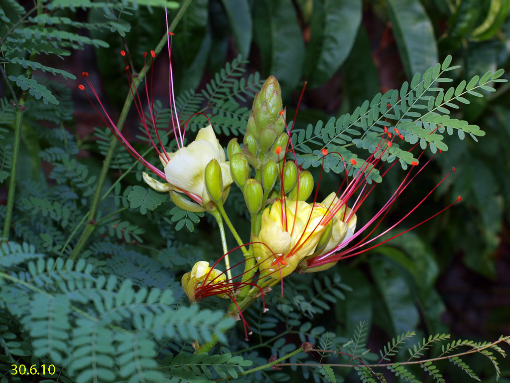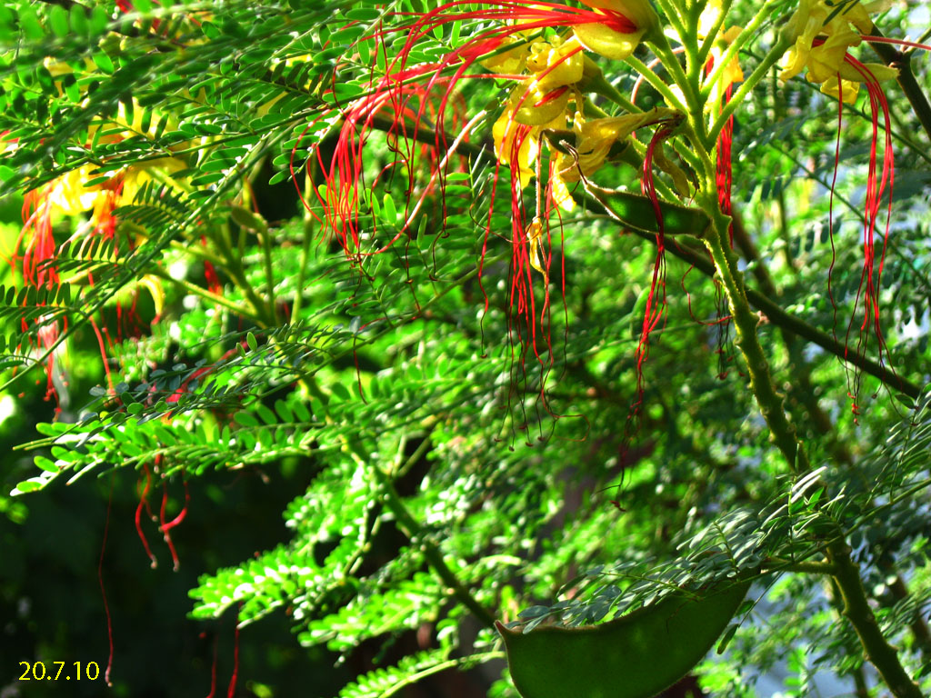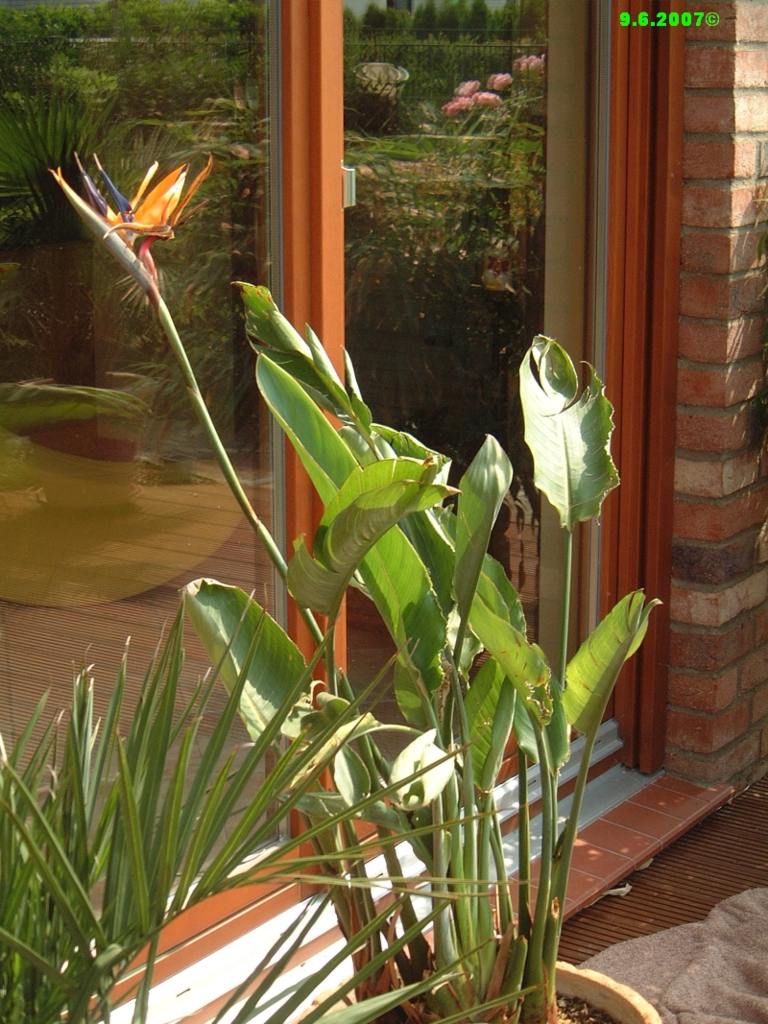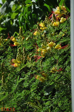 PassifloraPandanus utilis (Bory)Eine bereits 1804 beschriebene Art aus der Familie der Schraubenbäume (Pandanus). Die Pflanze entwickelt einen bis zu 6m hohen Stamm, der mit zunehmendem Alter immer mehr auf Stelzwurzeln steht. Die immergrüne Pflanze bildet eine dichte Krone aus spiralförmig gedrehten, rot geränderten, stacheligen Blättern. Heimisch ist diese Pflanze im westl. Indischen Ozean auf Madagaskar und den Maskarenen. Dementsprechend liebt sie tropisches, oder auch subtropisches warmes Klima (USDA 10-12). Sie sollte hell bei Temperaturen um 15-20°C überwintert werden. Das Temperaturminimum sollte nicht unter +5°C fallen. Infos siehe auch: http://de.wikipedia.org/wiki/Pandanus_utilis Cornus cousa "Satomi"Plumeria frangipaniCaesalpinia gilliesii (Wall. ex Hook.) D. Dietr. - ParadiesvogelbuschDiese hübsche, sehr exotisch wirkende Pflanze aus Uruguay, Argentienien und Chile wächst buschförmig. Die Caesalpinia ist sehr pflegeleicht und stellt keine besonderen Ansprüche an den Boden. Bei mir steht sie in einem Gemisch aus etwa 50% sandigem Lehm, 25% Spielsand und 25% gewöhnliche Blumenerde. Auch mit Wasser und Dünger darf man sparsam sein. Sie ist laubabwerfend, deshalb kann sie problemlos auch dunkel überwintert werden. Da sie mit leichten Frösten bis etwa -8°C zurechtkommen soll, hab ich sie im ersten Winter in einem ab -6°C beheizten Palmenschutz untergebracht. Im Folgejahr wurde sie dann an einer Hauswand ausgepflanzt. Ein Rückschnitt im Frühjahr, sowie nach der Blüte soll vorteilhaft sein. Ich bin mir aber noch nicht sicher, ob ich sie nicht lieber einfach so weiterwachsen lasse wie sie eben von Natur aus wächst.
