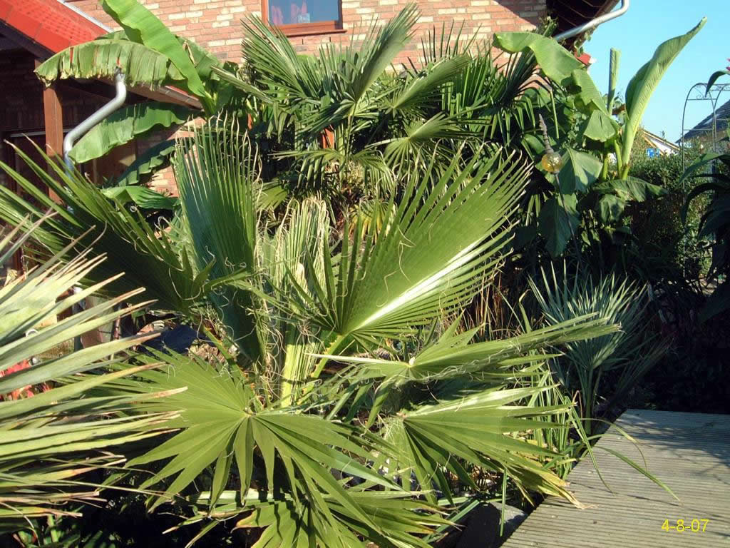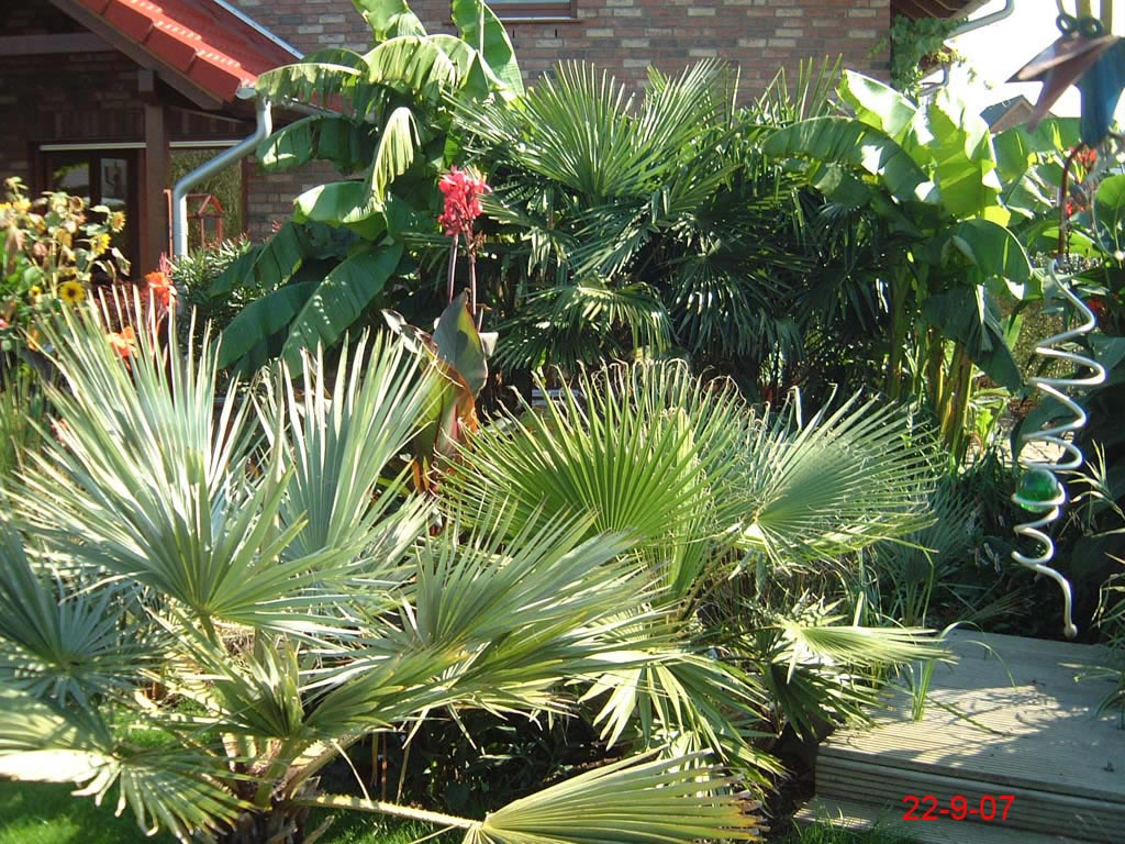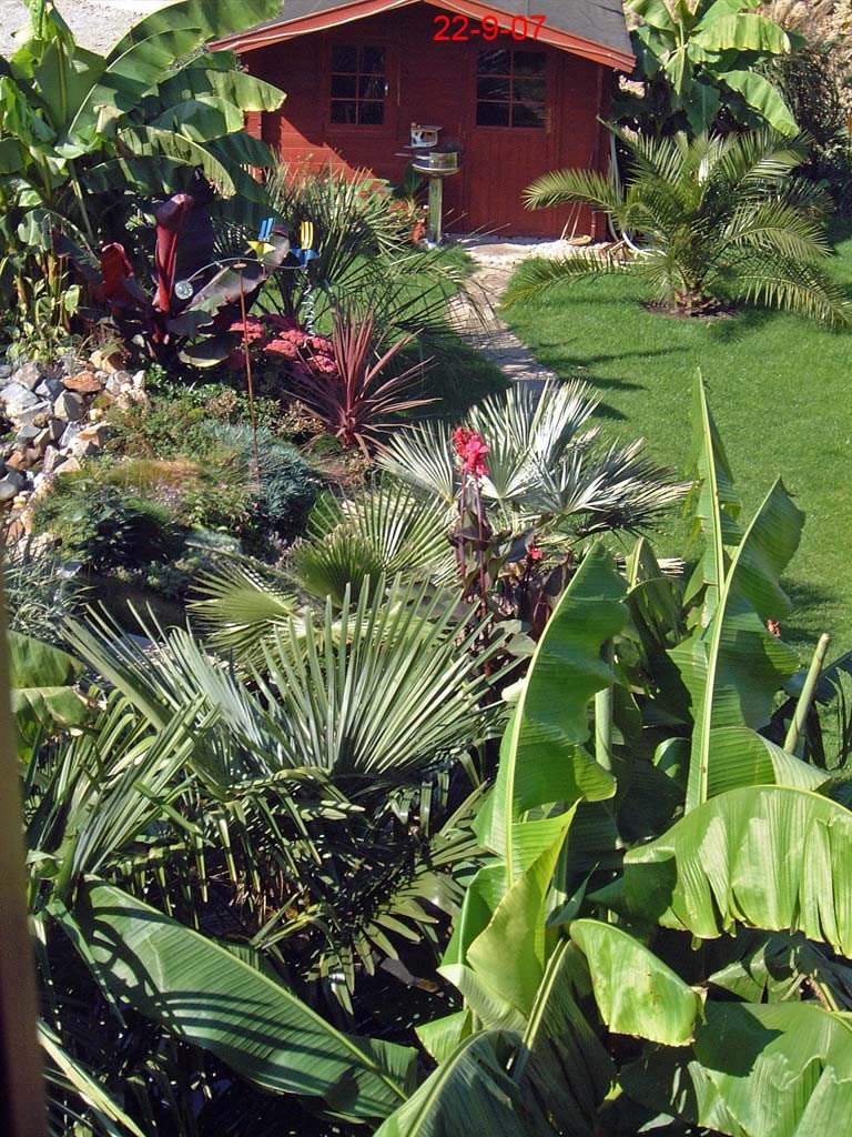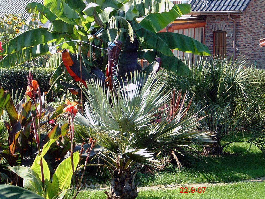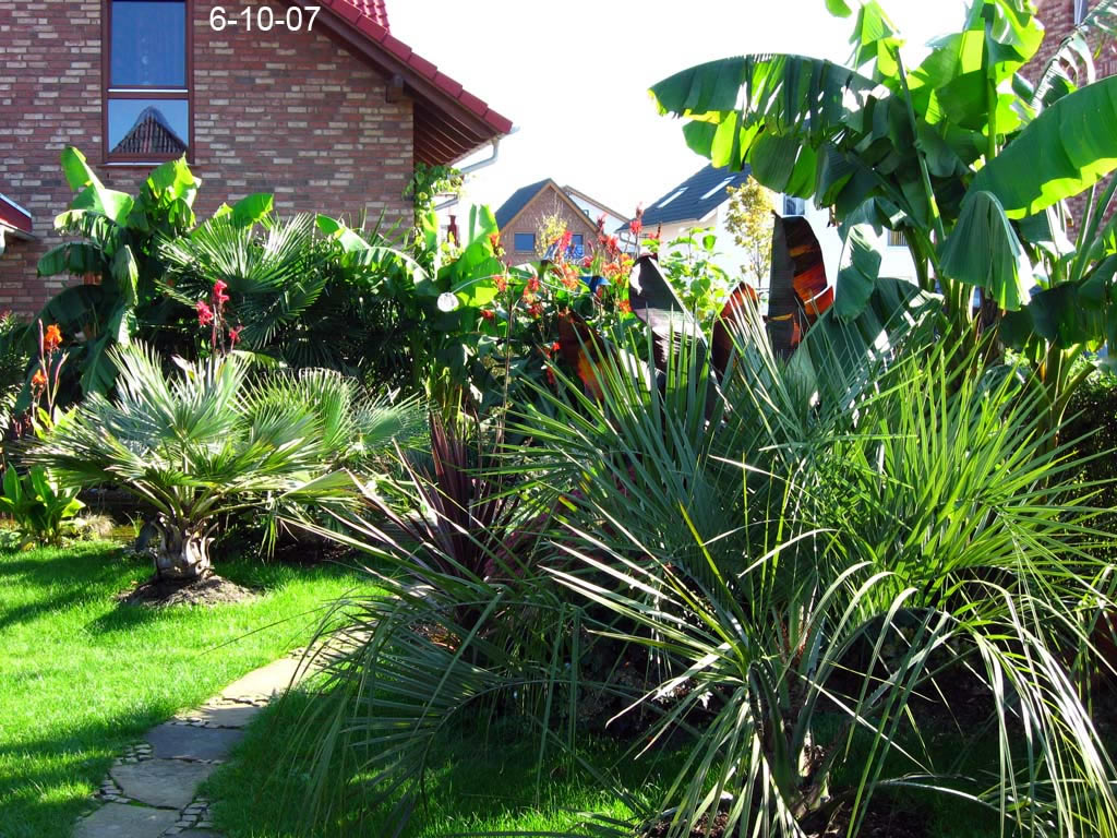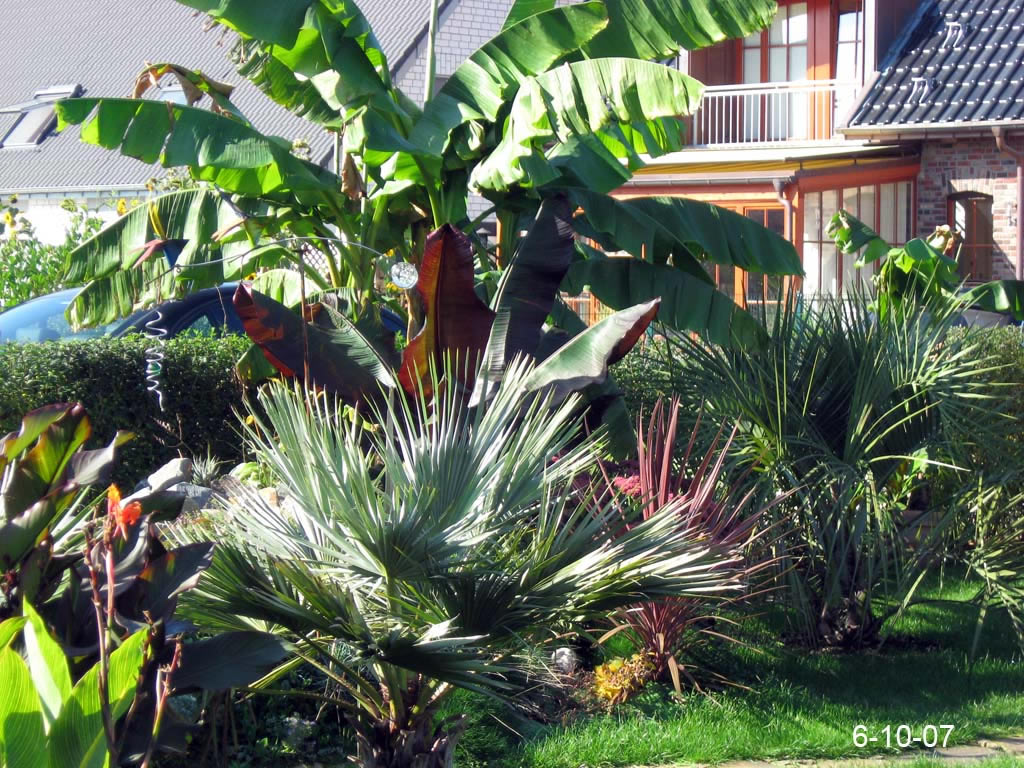 Unser Garten 20072007 - Alles wächst und gedeiht!Im Jahr 2007 pflanzte ich eine größere Brahea armata, die ich von einem guten Freund geschenkt bekommen habe aus, sowie einen Baumfarn - Dicksonia antarctica - sowie Cordyline red, weitere Trachycarpus fortunei und einiges mehr.... Der Garten entwickelte sich nach einem milden Winter prima und die Palmen, Bananen und andere Exoten legten nun ordentlich los. Im Hintergrund das Terrassenbeet mit den Trachies, Musa Basjoo, Chamaerops humilis. Davor Brahea armata, rechts im Hintergrund Canna indica als schöne bunte Blühpflanze für einen Exotengarten ein absolutes Muss! Im Vordergrund Butia capitata, dahinter Coryline red und Ensete ventricosum maurellii, sowie eine weitere Musa Basjoo. Hier eine Übersicht meiner Gartenhälfte aus dem oberen Stockwerk des Hauses. Aber auch auf der Seite meiner Frau begann ich mich nun auszubreiten, weil bei mir bereits der Platz eng wurde. Und obwohl sie es offiziell nicht zugeben wollte, so konnte ich sehen, dass auch sie langsam immer mehr Spaß und Freude an den Exoten bekam. Schließlich willigte sie ein, auf "ihrer" Hälfte des Gartens eine weitere Trachycarpus fortunei, den Baumfarn Dicksonia antarctica, sowie einen Phyllostachys nigra zu pflanzen. Auf meiner Seite pflanzte ich noch eine neue Washingtonia robusta aus, weil ich es nach dem traurigen Erlebnis im Winter 05/06 nun doch noch einmal versuchen wollte. Bunte Mischung: Nun ja, und dann wurde es wieder Winter...