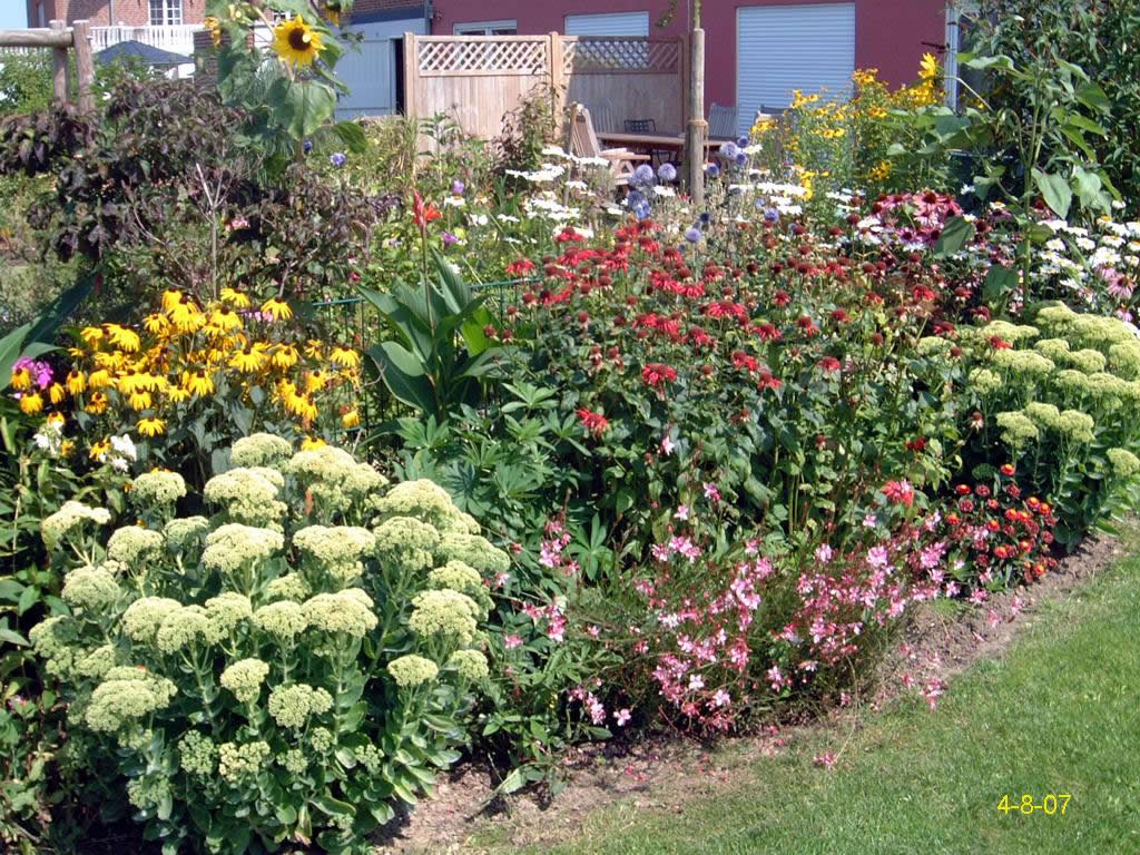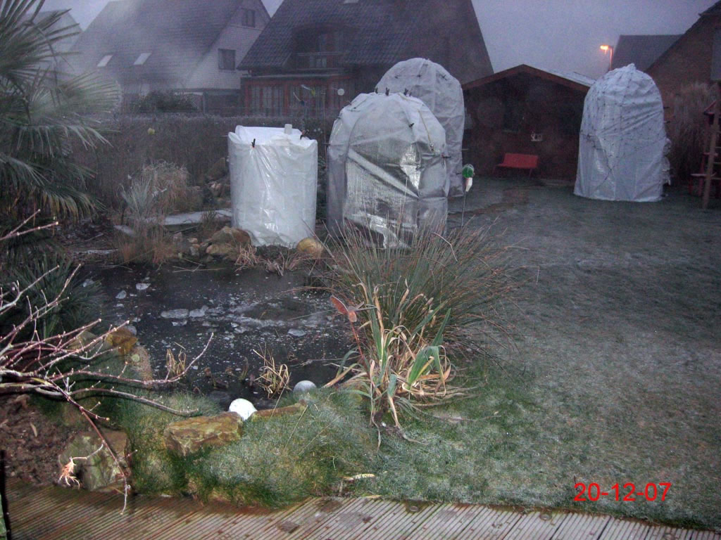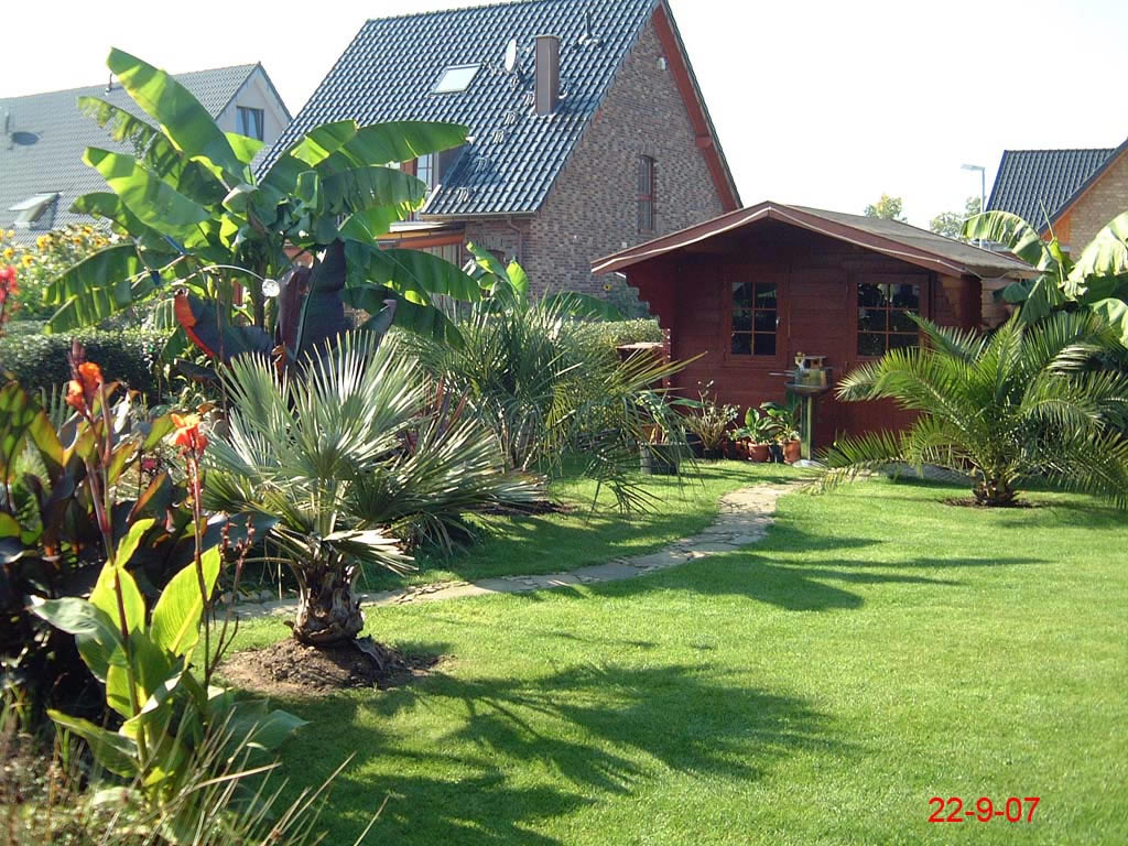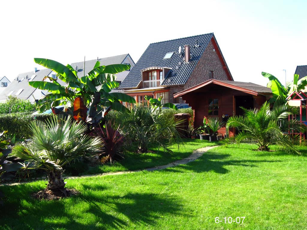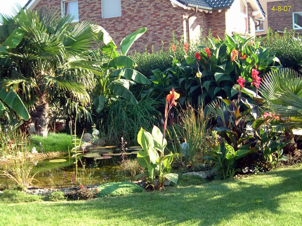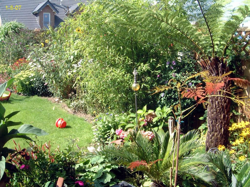 Unser Garten 20072007 - Alles wächst und gedeiht!Im Jahr 2007 pflanzte ich eine größere Brahea armata, die ich von einem guten Freund geschenkt bekommen habe aus, sowie einen Baumfarn - Dicksonia antarctica - sowie Cordyline red, weitere Trachycarpus fortunei und einiges mehr.... Der Garten entwickelte sich nach einem milden Winter prima und die Palmen, Bananen und andere Exoten legten nun ordentlich los. Im Hintergrund das Terrassenbeet mit den Trachies, Musa Basjoo, Chamaerops humilis. Davor Brahea armata, rechts im Hintergrund Canna indica als schöne bunte Blühpflanze für einen Exotengarten ein absolutes Muss! Im Vordergrund Butia capitata, dahinter Coryline red und Ensete ventricosum maurellii, sowie eine weitere Musa Basjoo. Hier eine Übersicht meiner Gartenhälfte aus dem oberen Stockwerk des Hauses. Aber auch auf der Seite meiner Frau begann ich mich nun auszubreiten, weil bei mir bereits der Platz eng wurde. Und obwohl sie es offiziell nicht zugeben wollte, so konnte ich sehen, dass auch sie langsam immer mehr Spaß und Freude an den Exoten bekam. Schließlich willigte sie ein, auf "ihrer" Hälfte des Gartens eine weitere Trachycarpus fortunei, den Baumfarn Dicksonia antarctica, sowie einen Phyllostachys nigra zu pflanzen. Auf meiner Seite pflanzte ich noch eine neue Washingtonia robusta aus, weil ich es nach dem traurigen Erlebnis im Winter 05/06 nun doch noch einmal versuchen wollte. Bunte Mischung: Nun ja, und dann wurde es wieder Winter...