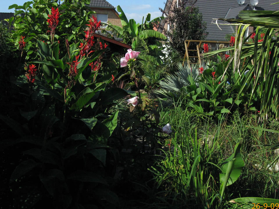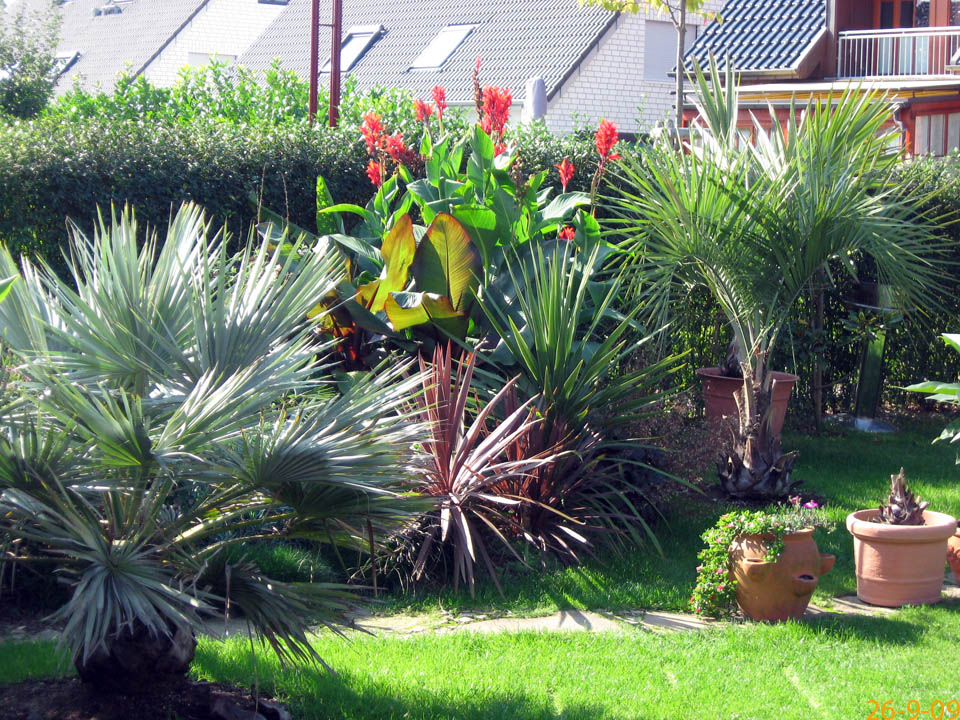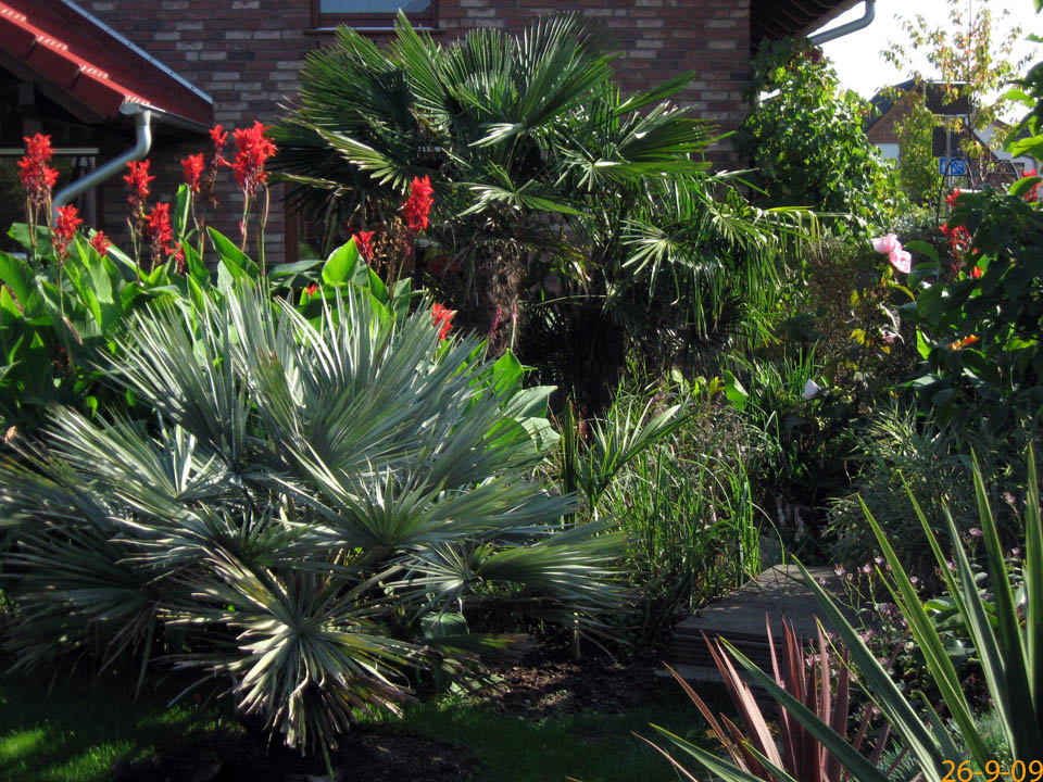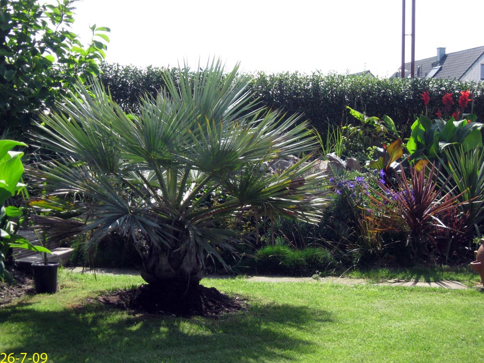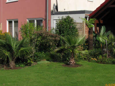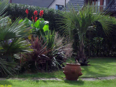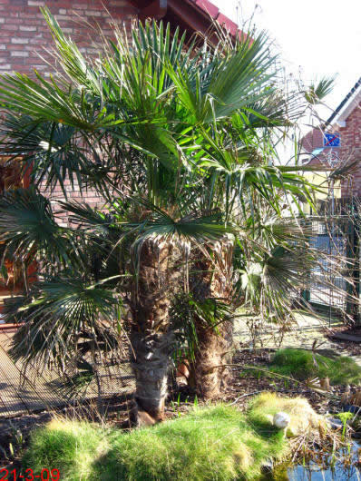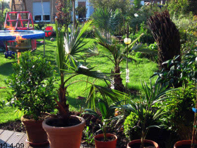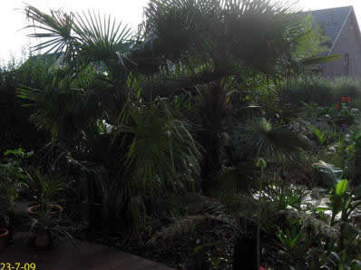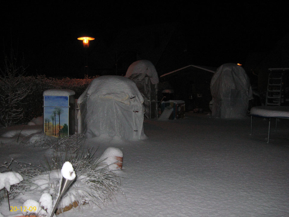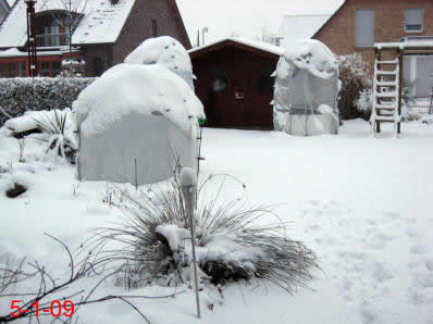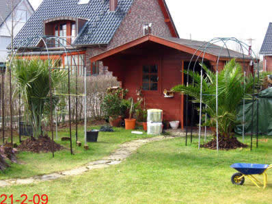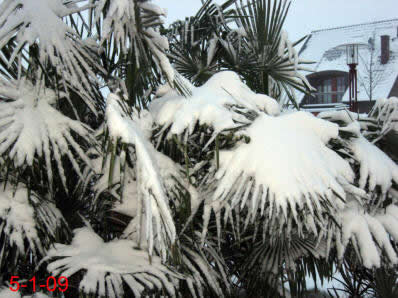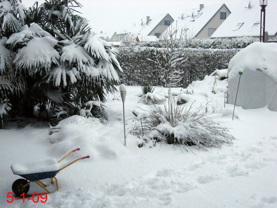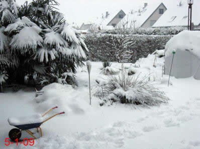 Unser Garten 2009Früher Wintereinbruch bereits Mitte Dezember mit -12,7°C (unter freiem Himmel -15,3°C) Mit zunehmend wärmer werdenden Temperaturen werden die Schäden deutlicher. Der Winter hat einiges an Pflanzen dahingerafft, viele sind stark beschädigt. Momentan ein eher trostloser Anblick im Garten. Na ja, nach vorne schauen -- das wird schon wieder. Die meisten Pflanzen werden sich über den Sommer wieder erholen. Bleibt zu hoffen, dass der Winter ein Ausnahmefall war und uns nun wieder einige mildere Winter bevorstehen. Die nach dem Auspacken so vital wirkende Phoenix hat anschließend stark abgebaut und ich konnte sämtliche Speere entfernen - ein Jammer! Die Trachies haben schwere Schäden, scheinen aber alle überlebt zu haben. Brahea, Butia und Washi sehen noch am besten aus, aber die waren ja auch geschützt. Mit Kälte und reichlich Schnee began das Jahr 2009 wie das Jahr 2008 endete. So schön die weiße Pracht, die man am Niederhein nur selten bewundern kann auch war, so katastrophal war diese Kältewelle allerdings auch für einige meiner Exoten, da ich gerade in diesem Jahr viel riskiert hatte und viele Pflanzen nicht, oder nicht ausreichend geschützt hatte. So gab es nach dieser Kältewelle einige Schäden (siehe unter den einzelnen Pflanzen), die durch bessere Winterschutzmaßnahmen vermeidbar gewesen wären.