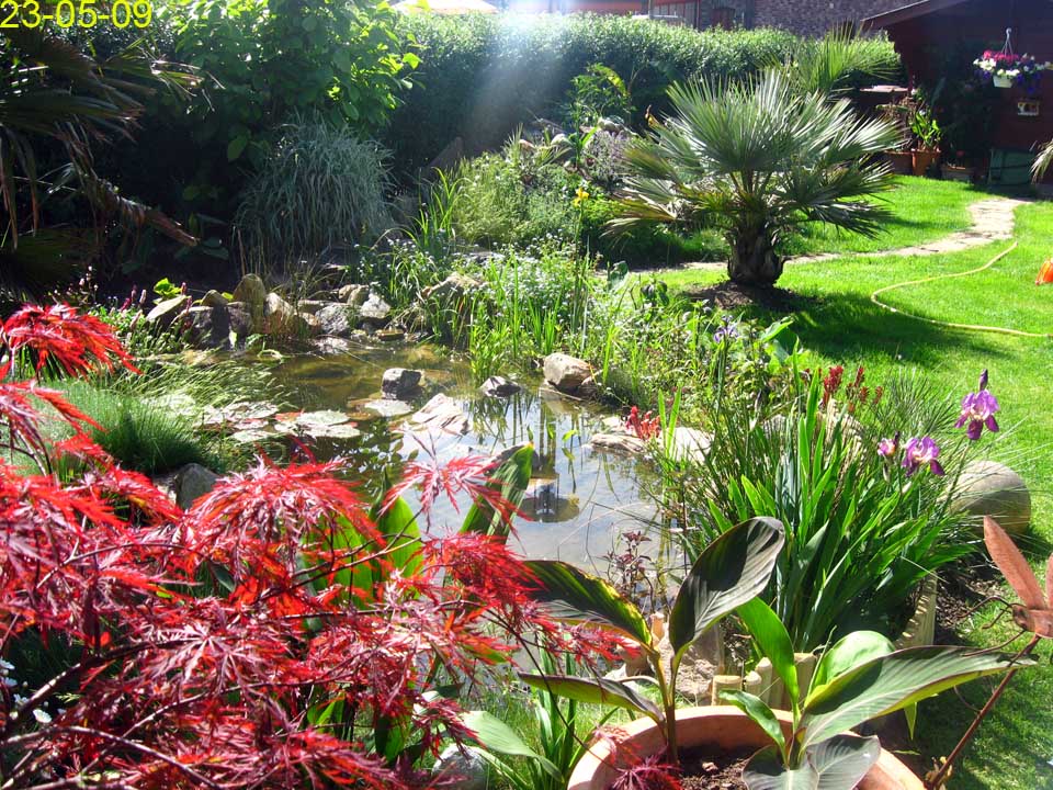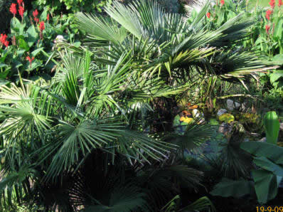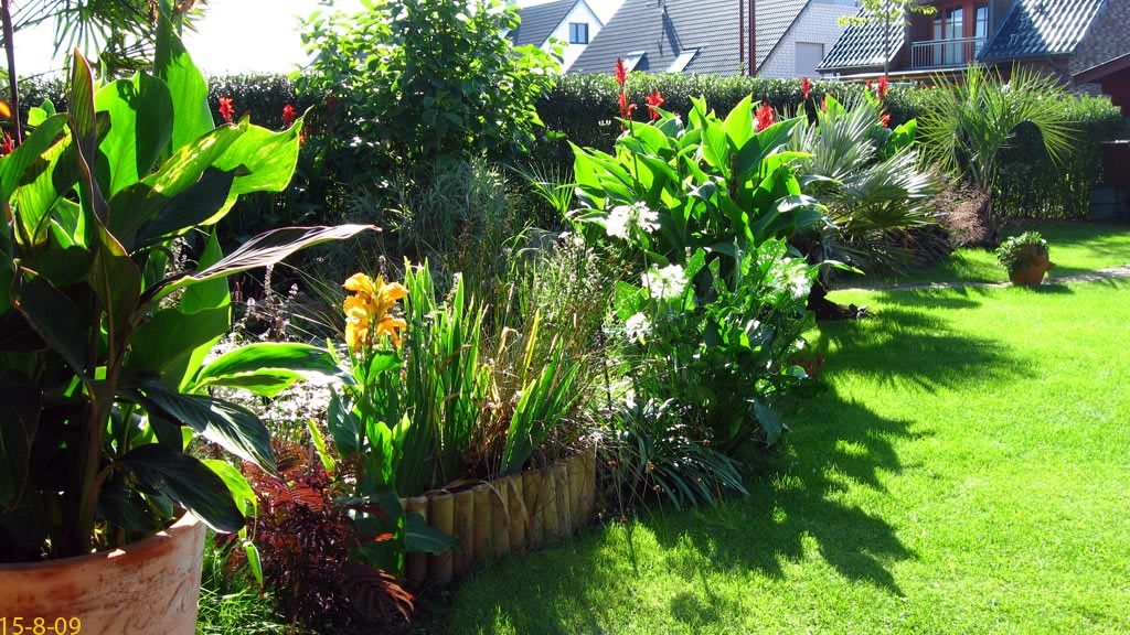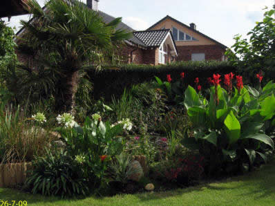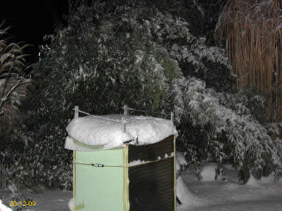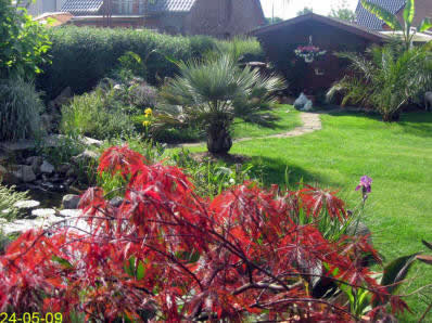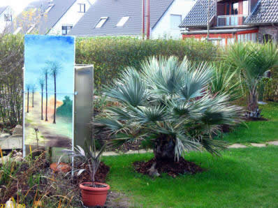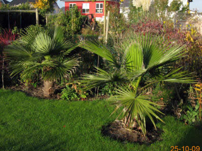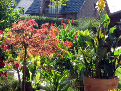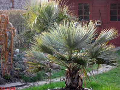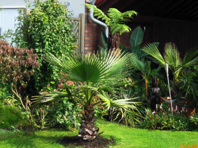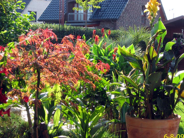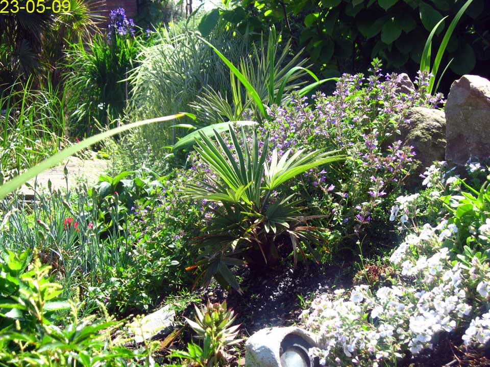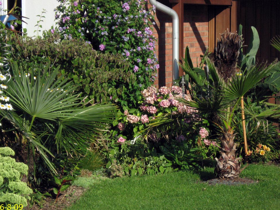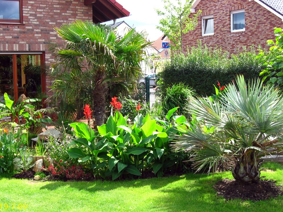 Unser Garten 2009Früher Wintereinbruch bereits Mitte Dezember mit -12,7°C (unter freiem Himmel -15,3°C) Mit zunehmend wärmer werdenden Temperaturen werden die Schäden deutlicher. Der Winter hat einiges an Pflanzen dahingerafft, viele sind stark beschädigt. Momentan ein eher trostloser Anblick im Garten. Na ja, nach vorne schauen -- das wird schon wieder. Die meisten Pflanzen werden sich über den Sommer wieder erholen. Bleibt zu hoffen, dass der Winter ein Ausnahmefall war und uns nun wieder einige mildere Winter bevorstehen. Die nach dem Auspacken so vital wirkende Phoenix hat anschließend stark abgebaut und ich konnte sämtliche Speere entfernen - ein Jammer! Die Trachies haben schwere Schäden, scheinen aber alle überlebt zu haben. Brahea, Butia und Washi sehen noch am besten aus, aber die waren ja auch geschützt. Mit Kälte und reichlich Schnee began das Jahr 2009 wie das Jahr 2008 endete. So schön die weiße Pracht, die man am Niederhein nur selten bewundern kann auch war, so katastrophal war diese Kältewelle allerdings auch für einige meiner Exoten, da ich gerade in diesem Jahr viel riskiert hatte und viele Pflanzen nicht, oder nicht ausreichend geschützt hatte. So gab es nach dieser Kältewelle einige Schäden (siehe unter den einzelnen Pflanzen), die durch bessere Winterschutzmaßnahmen vermeidbar gewesen wären.