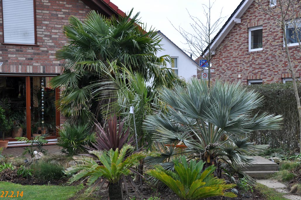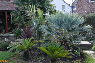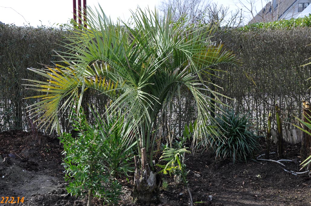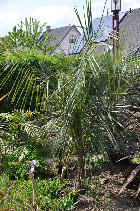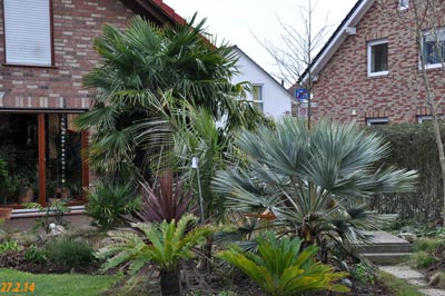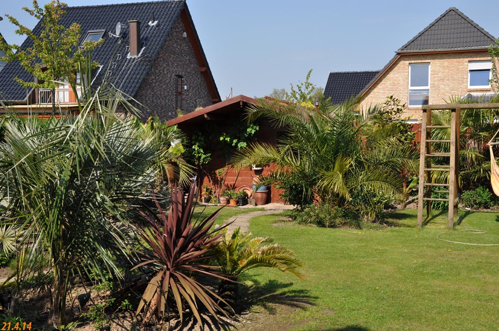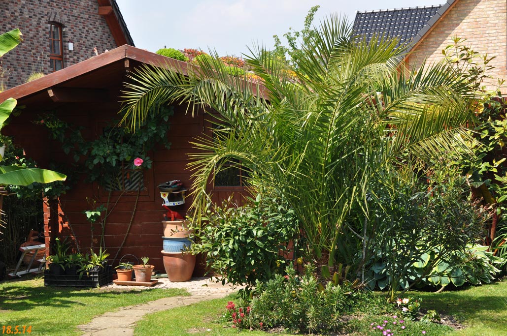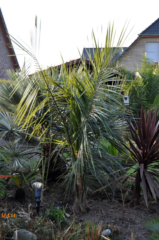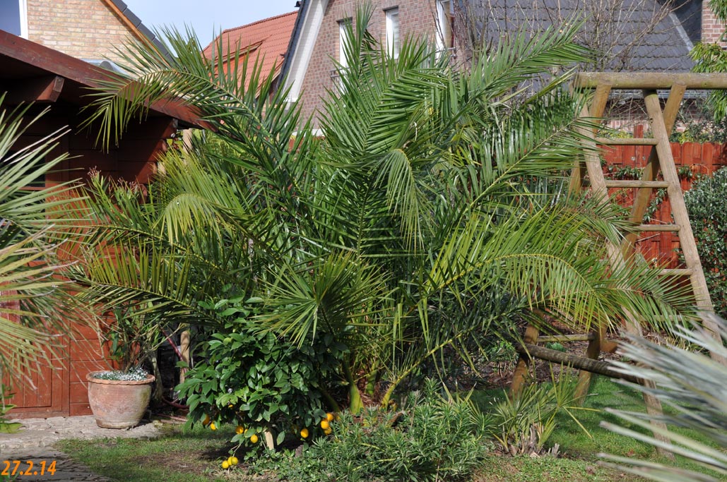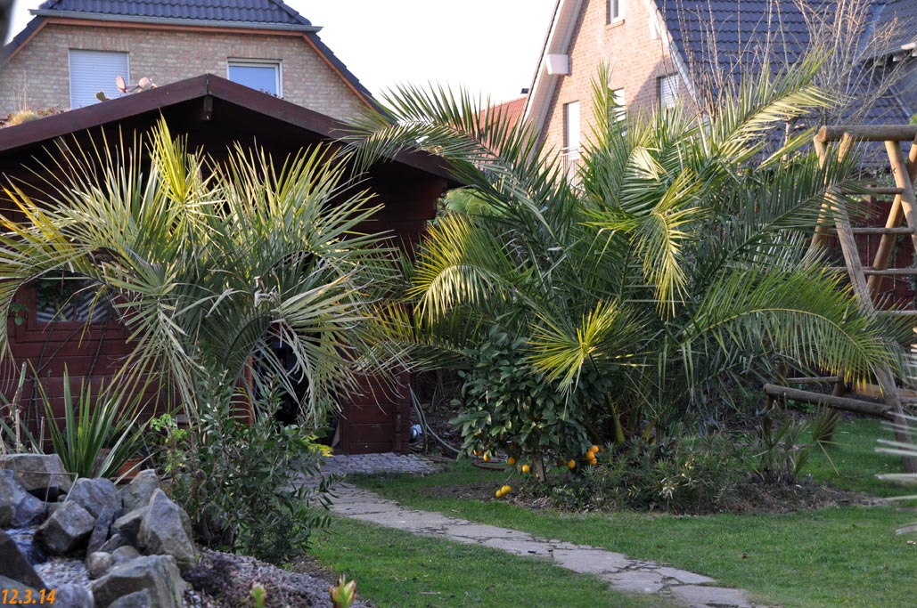 19.5.2014 Traumhaftes Wetter, da ließ Renate (wie sich letztens herausstellte ist unsere Schildkröte ein Weibchen) sich nicht lumpen und genoss ein Sonnenbad. 4.5.14 Heute habe ich die Parajubaea versetzt und dabei gleich noch einige Fotos gemacht. 21.4.14 Es gab zwar letzte Woche noch leichten Nachtfrost, aber das war selbst für die empfindlichsten Pflanzen kaum ein Problem, da es tagsüber bei Sonnenschein wieder knapp an die 20°C ging. Inzwischen blüht es überall im Garten, viel früher als in normalen Jahren, und inzwischen habe ich selbst tropische Palmen, Bananen etc. rausgestellt. 12.3.14 Kein Winter, Temperaturen über 20°C Anfang März.... So darf es jedes Jahr sein. Na ja, bevor es zum WE etwas abkühlen soll noch schnell ein paar aktuelle Fotos. 27.2.2014 Das war der mildeste Winter an den ich mich erinnern kann. Hoffentlich bleibt es dabei - nicht, dass es wie im letzten Jahr im März nochmal richtig kalt wird, denn inzwischen habe ich den Winterschutz komplett abgebaut. Ach ja. die Grünlandtemperatur hat heute den magischen Wert von 200 überschritten, deutlich früher als letztes Jahr. Hier nun einige Bilder von heute - kreuz und quer .... Natürlich sieht es noch ein bisschen wüst aus, die Ränder der Winterschutzhäuser auf dem Rasen, geknickte Blätter vom Zusammenbinden etc. , aber das gibt sich schnell wieder. Endlich sind wieder Palmen statt Winterschutzhäuser zu sehen... Die Bananen, erst vor einigen Tagen ausgepackt, wachsen deutlich sichtbar. Clematis armandii wird wohl schon bald einem Blütenmeer gleichen... Nektarine treibt bereits aus... Albizzia lophantha, die inzwischen aber wohl Paraserianthes lophantha heißt ist immergrün. Bin mal gespannt wie die sich schlägt... Sie soll recht invasiv sein, allerdings denke ich, dass dies in unseren Breiten wohl eher kein Problem sein wird. Bin gespannt, ob sie auch künftige Winter unbeschadet übersteht. Die Baumpaeonie ist bereits voll belaubt und entwickelt erste Blüten. Erythrina crista-galli habe ich letztes Jahr innerhalb des Braheaschutzes ausgepflanzt. Dieser Winter war offensichtlich kein wirklicher Test, denn sie ist nicht einmal komplett eingetrocknet... Citrus x meyeri ist eine wahre Freude seit sie ausgepflanzt ist und liefert täglich frische Zitronen die besser schmecken als alles was man zu kaufen bekommt. Leucospermum glabrum X tottum versuchsweise innerhalb des Phoenixschutzes ausgepflanzt. Dieser Winter war sicher kein Test, aber immerhin hat sie leichte Fröste unbeeindruckt überstanden. Eine andere Leucospermum die im Topf im Washingtoniaschutz stand ist allerdings vertrocknet.Mal sehen, ob sie sich noch erholt. Auch dieser innerhalb des Butiaschutzes ausgepflanzte Callistemon ist ein Versuch. Da es sich um Baumarktware handelt weiß ich leider die Sorte nicht. Dieser Winter war jedenfalls kein Problem.
