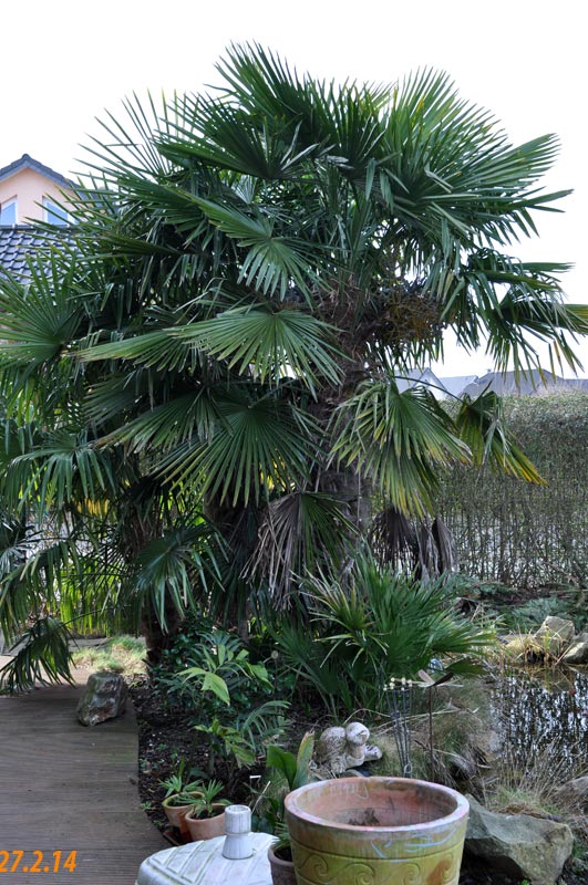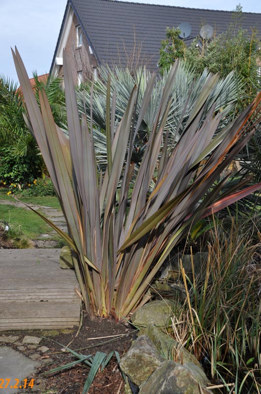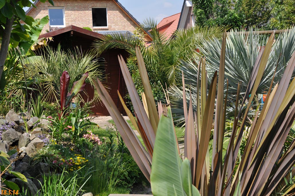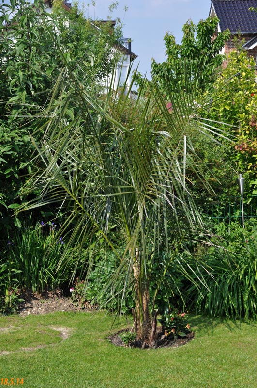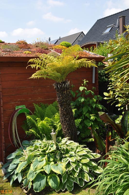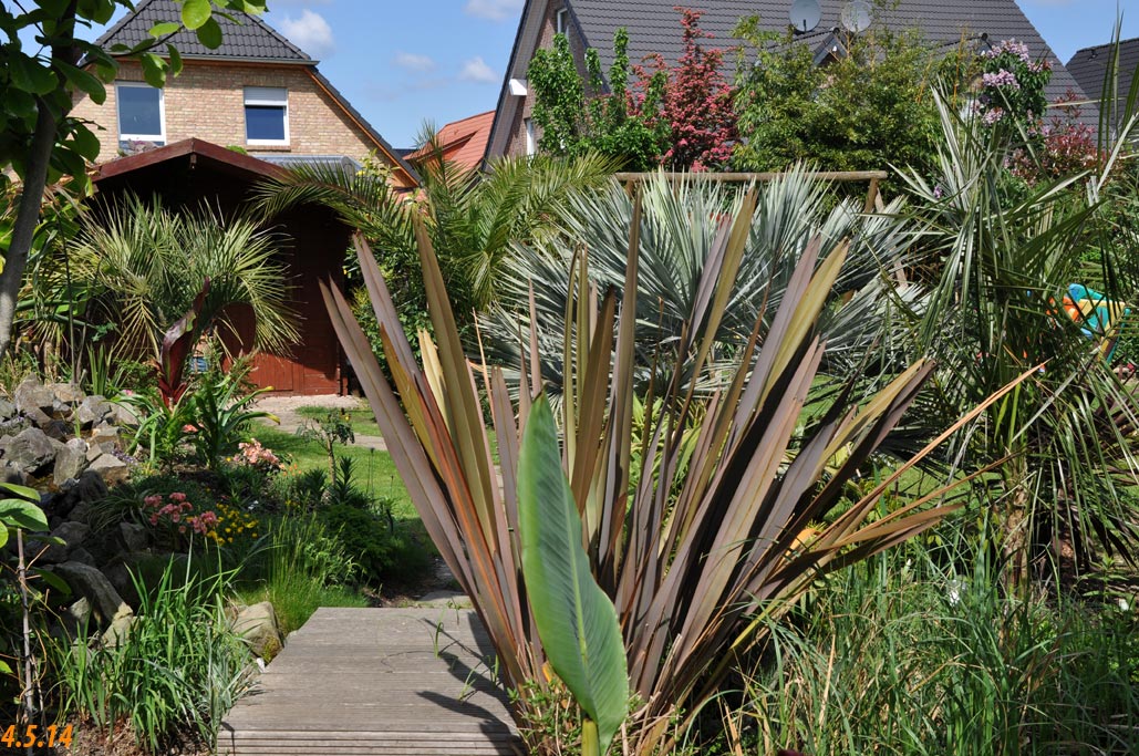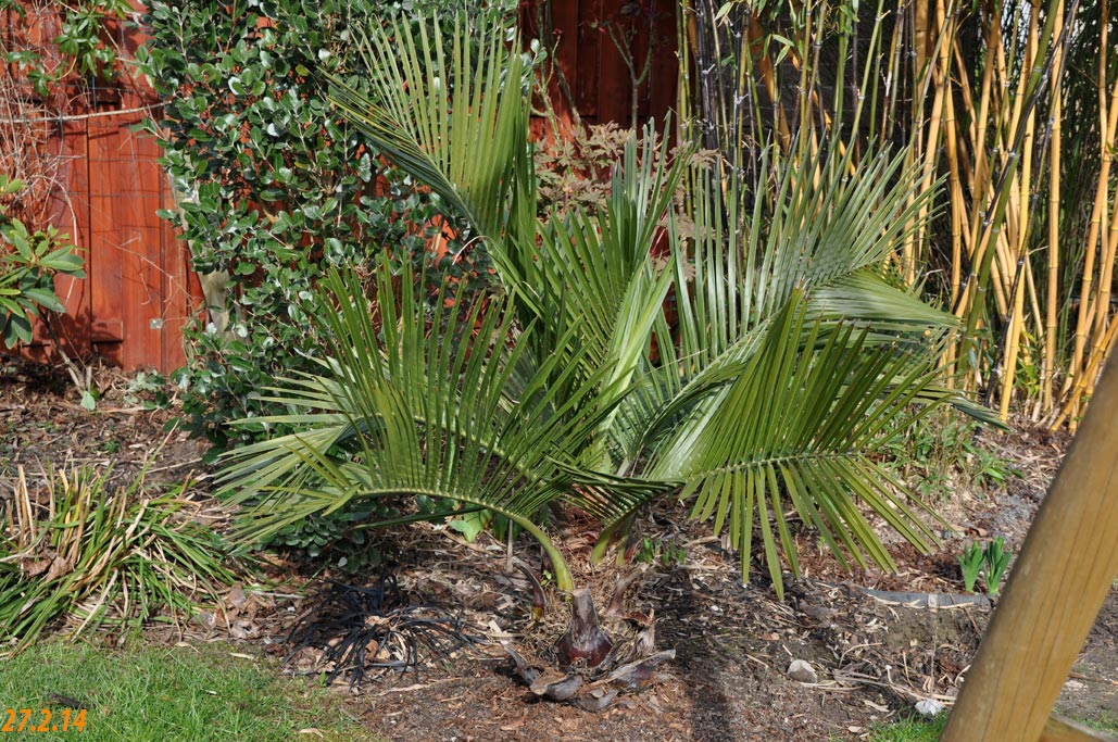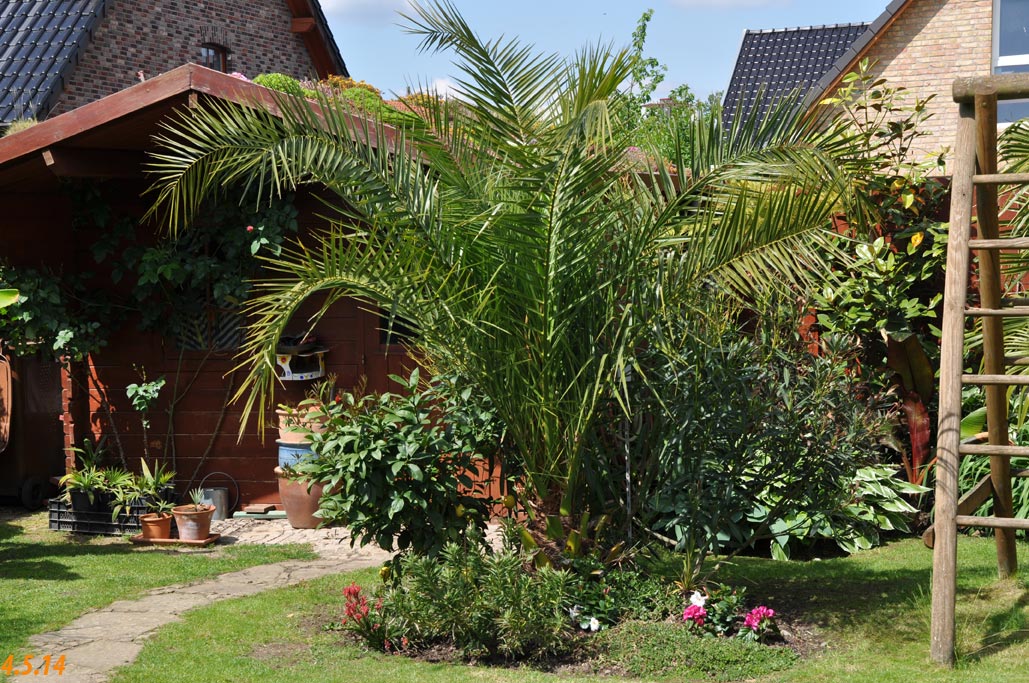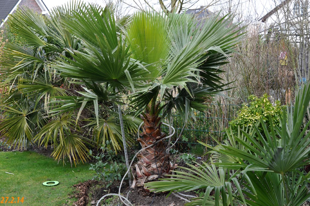 19.5.2014 Traumhaftes Wetter, da ließ Renate (wie sich letztens herausstellte ist unsere Schildkröte ein Weibchen) sich nicht lumpen und genoss ein Sonnenbad. 4.5.14 Heute habe ich die Parajubaea versetzt und dabei gleich noch einige Fotos gemacht. 21.4.14 Es gab zwar letzte Woche noch leichten Nachtfrost, aber das war selbst für die empfindlichsten Pflanzen kaum ein Problem, da es tagsüber bei Sonnenschein wieder knapp an die 20°C ging. Inzwischen blüht es überall im Garten, viel früher als in normalen Jahren, und inzwischen habe ich selbst tropische Palmen, Bananen etc. rausgestellt. 12.3.14 Kein Winter, Temperaturen über 20°C Anfang März.... So darf es jedes Jahr sein. Na ja, bevor es zum WE etwas abkühlen soll noch schnell ein paar aktuelle Fotos. 27.2.2014 Das war der mildeste Winter an den ich mich erinnern kann. Hoffentlich bleibt es dabei - nicht, dass es wie im letzten Jahr im März nochmal richtig kalt wird, denn inzwischen habe ich den Winterschutz komplett abgebaut. Ach ja. die Grünlandtemperatur hat heute den magischen Wert von 200 überschritten, deutlich früher als letztes Jahr. Hier nun einige Bilder von heute - kreuz und quer .... Natürlich sieht es noch ein bisschen wüst aus, die Ränder der Winterschutzhäuser auf dem Rasen, geknickte Blätter vom Zusammenbinden etc. , aber das gibt sich schnell wieder. Endlich sind wieder Palmen statt Winterschutzhäuser zu sehen... Die Bananen, erst vor einigen Tagen ausgepackt, wachsen deutlich sichtbar. Clematis armandii wird wohl schon bald einem Blütenmeer gleichen... Nektarine treibt bereits aus... Albizzia lophantha, die inzwischen aber wohl Paraserianthes lophantha heißt ist immergrün. Bin mal gespannt wie die sich schlägt... Sie soll recht invasiv sein, allerdings denke ich, dass dies in unseren Breiten wohl eher kein Problem sein wird. Bin gespannt, ob sie auch künftige Winter unbeschadet übersteht. Die Baumpaeonie ist bereits voll belaubt und entwickelt erste Blüten. Erythrina crista-galli habe ich letztes Jahr innerhalb des Braheaschutzes ausgepflanzt. Dieser Winter war offensichtlich kein wirklicher Test, denn sie ist nicht einmal komplett eingetrocknet... Citrus x meyeri ist eine wahre Freude seit sie ausgepflanzt ist und liefert täglich frische Zitronen die besser schmecken als alles was man zu kaufen bekommt. Leucospermum glabrum X tottum versuchsweise innerhalb des Phoenixschutzes ausgepflanzt. Dieser Winter war sicher kein Test, aber immerhin hat sie leichte Fröste unbeeindruckt überstanden. Eine andere Leucospermum die im Topf im Washingtoniaschutz stand ist allerdings vertrocknet.Mal sehen, ob sie sich noch erholt. Auch dieser innerhalb des Butiaschutzes ausgepflanzte Callistemon ist ein Versuch. Da es sich um Baumarktware handelt weiß ich leider die Sorte nicht. Dieser Winter war jedenfalls kein Problem.