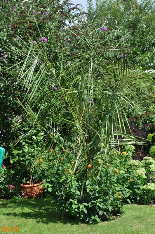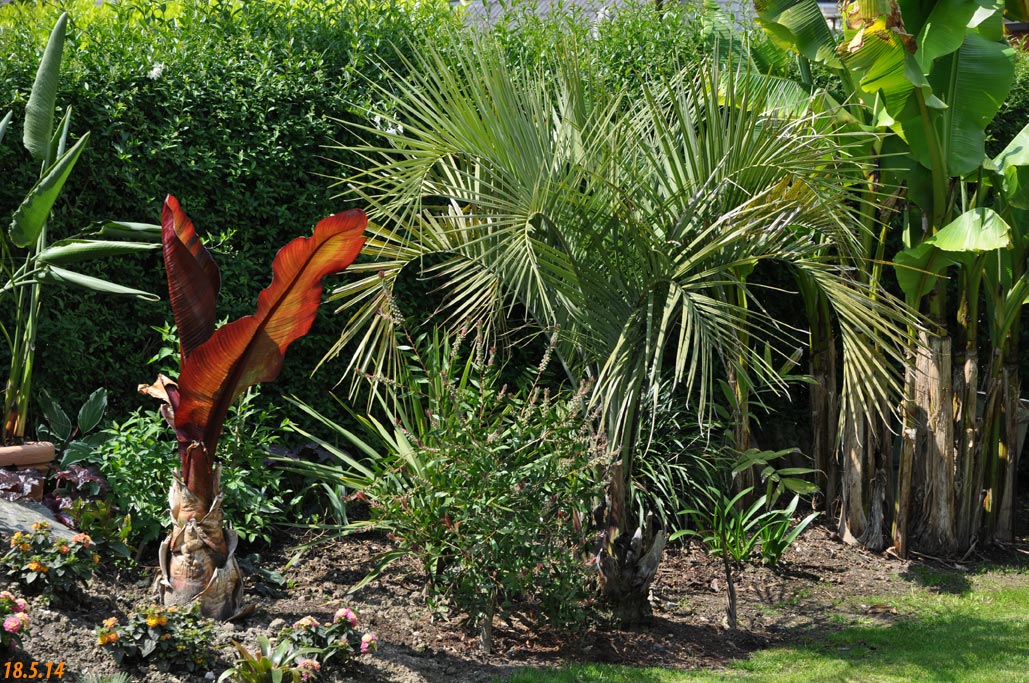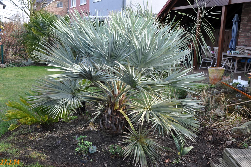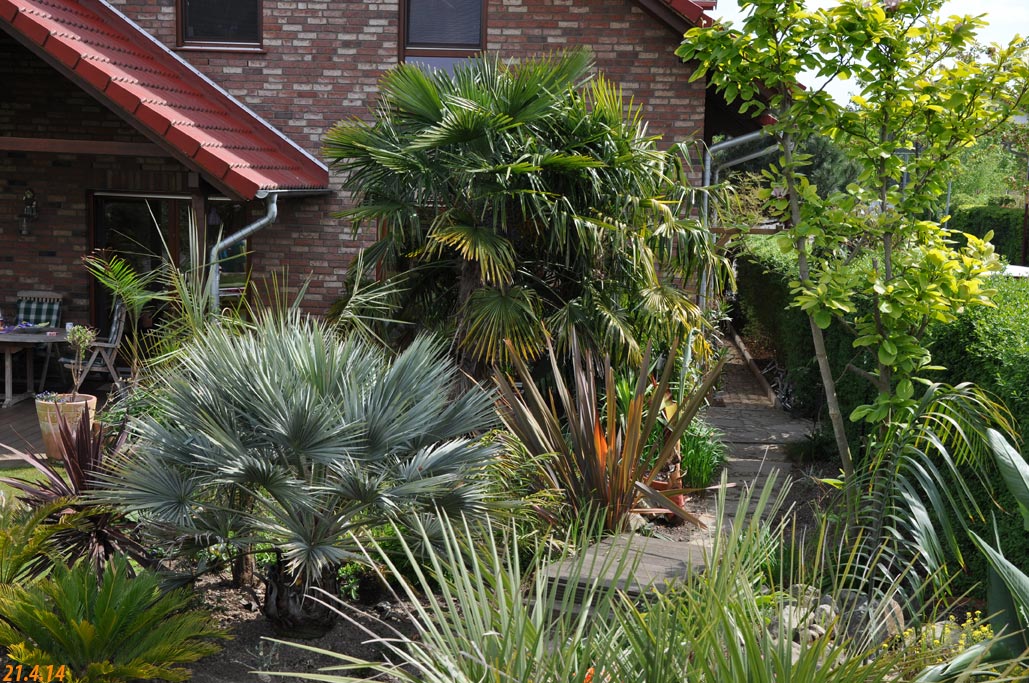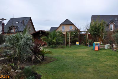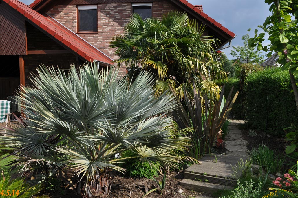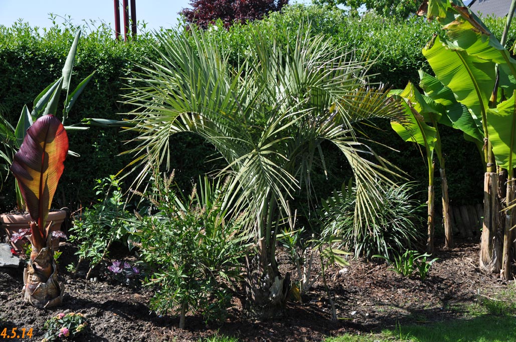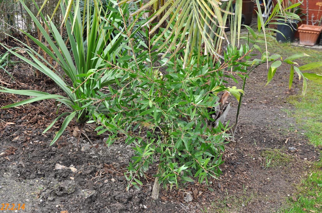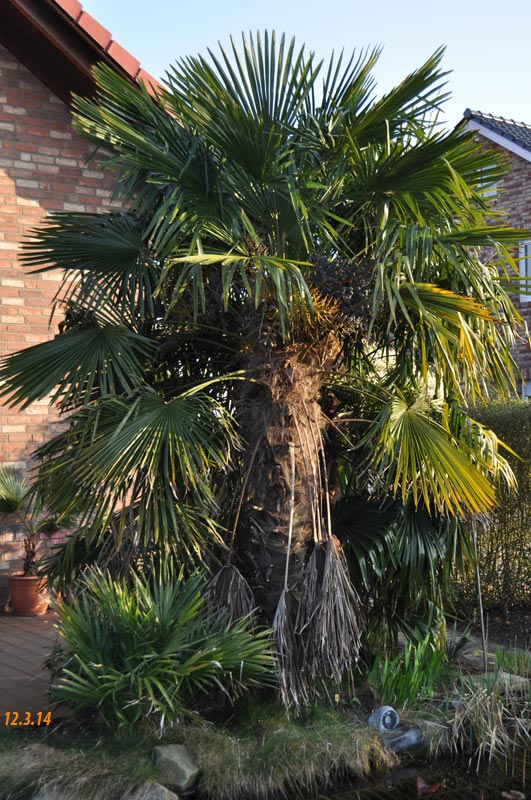 19.5.2014 Traumhaftes Wetter, da ließ Renate (wie sich letztens herausstellte ist unsere Schildkröte ein Weibchen) sich nicht lumpen und genoss ein Sonnenbad. 4.5.14 Heute habe ich die Parajubaea versetzt und dabei gleich noch einige Fotos gemacht. 21.4.14 Es gab zwar letzte Woche noch leichten Nachtfrost, aber das war selbst für die empfindlichsten Pflanzen kaum ein Problem, da es tagsüber bei Sonnenschein wieder knapp an die 20°C ging. Inzwischen blüht es überall im Garten, viel früher als in normalen Jahren, und inzwischen habe ich selbst tropische Palmen, Bananen etc. rausgestellt. 12.3.14 Kein Winter, Temperaturen über 20°C Anfang März.... So darf es jedes Jahr sein. Na ja, bevor es zum WE etwas abkühlen soll noch schnell ein paar aktuelle Fotos. 27.2.2014 Das war der mildeste Winter an den ich mich erinnern kann. Hoffentlich bleibt es dabei - nicht, dass es wie im letzten Jahr im März nochmal richtig kalt wird, denn inzwischen habe ich den Winterschutz komplett abgebaut. Ach ja. die Grünlandtemperatur hat heute den magischen Wert von 200 überschritten, deutlich früher als letztes Jahr. Hier nun einige Bilder von heute - kreuz und quer .... Natürlich sieht es noch ein bisschen wüst aus, die Ränder der Winterschutzhäuser auf dem Rasen, geknickte Blätter vom Zusammenbinden etc. , aber das gibt sich schnell wieder. Endlich sind wieder Palmen statt Winterschutzhäuser zu sehen... Die Bananen, erst vor einigen Tagen ausgepackt, wachsen deutlich sichtbar. Clematis armandii wird wohl schon bald einem Blütenmeer gleichen... Nektarine treibt bereits aus... Albizzia lophantha, die inzwischen aber wohl Paraserianthes lophantha heißt ist immergrün. Bin mal gespannt wie die sich schlägt... Sie soll recht invasiv sein, allerdings denke ich, dass dies in unseren Breiten wohl eher kein Problem sein wird. Bin gespannt, ob sie auch künftige Winter unbeschadet übersteht. Die Baumpaeonie ist bereits voll belaubt und entwickelt erste Blüten. Erythrina crista-galli habe ich letztes Jahr innerhalb des Braheaschutzes ausgepflanzt. Dieser Winter war offensichtlich kein wirklicher Test, denn sie ist nicht einmal komplett eingetrocknet... Citrus x meyeri ist eine wahre Freude seit sie ausgepflanzt ist und liefert täglich frische Zitronen die besser schmecken als alles was man zu kaufen bekommt. Leucospermum glabrum X tottum versuchsweise innerhalb des Phoenixschutzes ausgepflanzt. Dieser Winter war sicher kein Test, aber immerhin hat sie leichte Fröste unbeeindruckt überstanden. Eine andere Leucospermum die im Topf im Washingtoniaschutz stand ist allerdings vertrocknet.Mal sehen, ob sie sich noch erholt. Auch dieser innerhalb des Butiaschutzes ausgepflanzte Callistemon ist ein Versuch. Da es sich um Baumarktware handelt weiß ich leider die Sorte nicht. Dieser Winter war jedenfalls kein Problem.