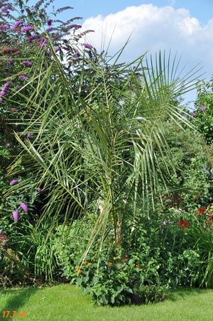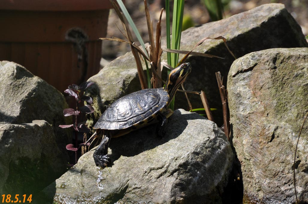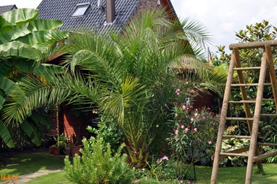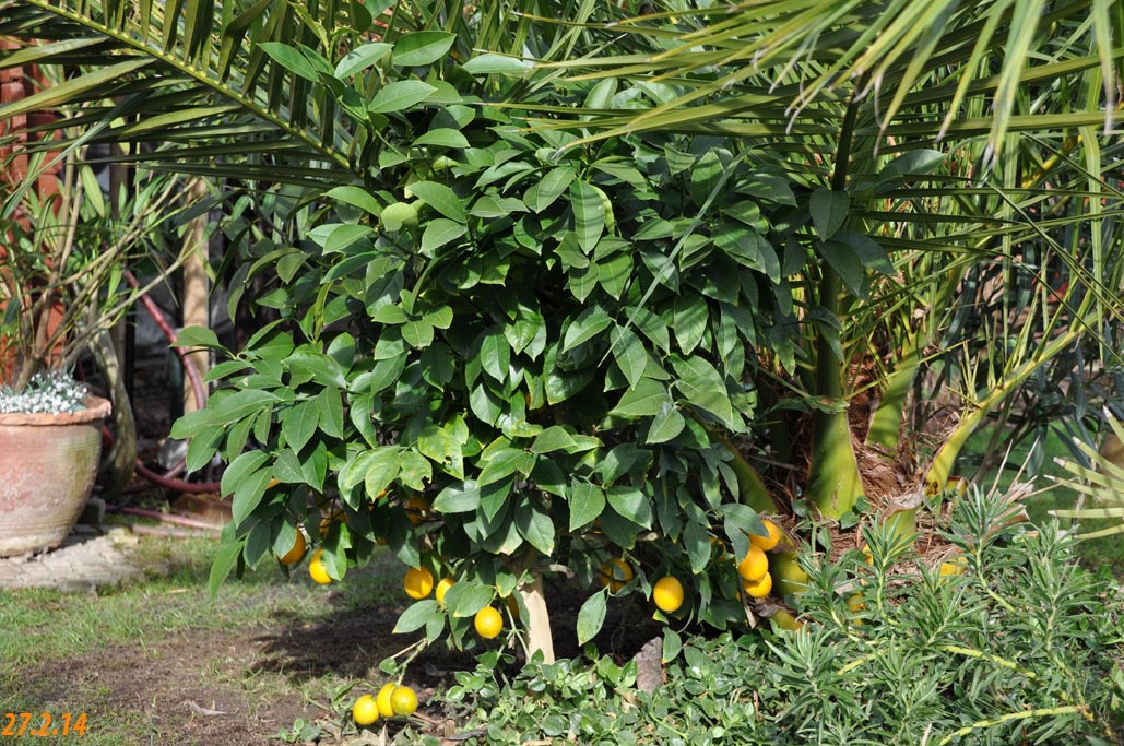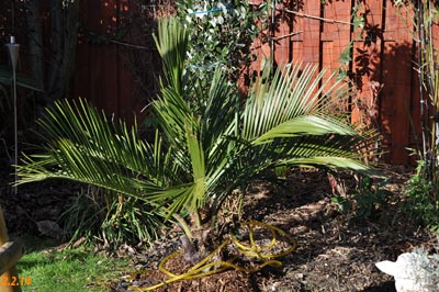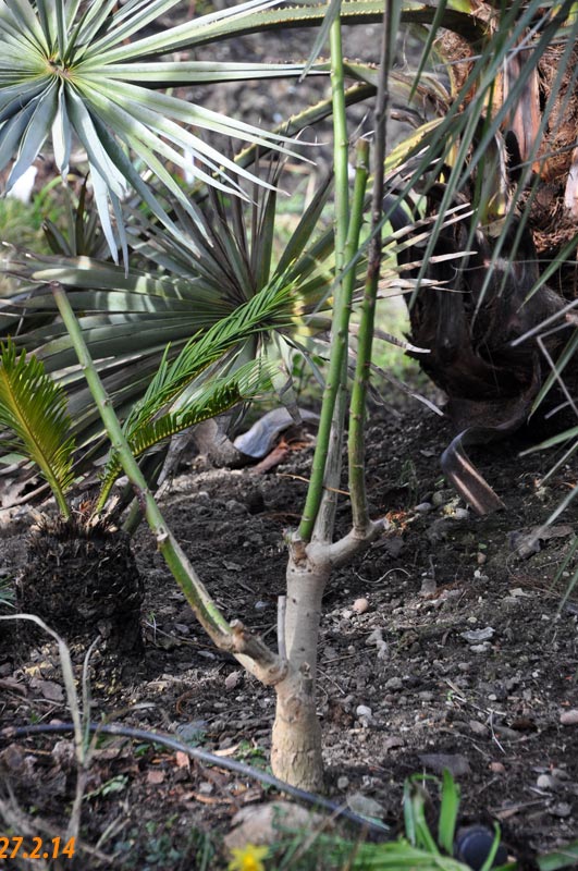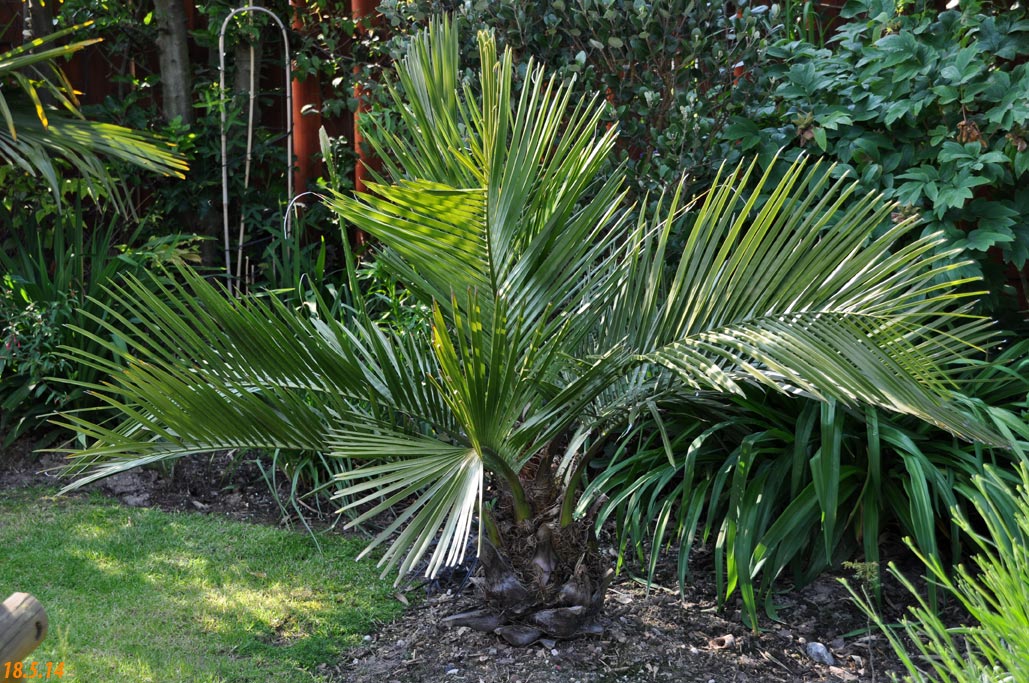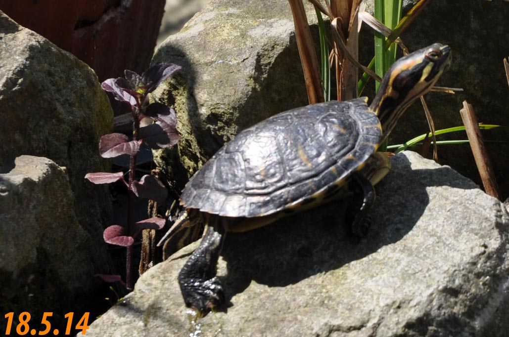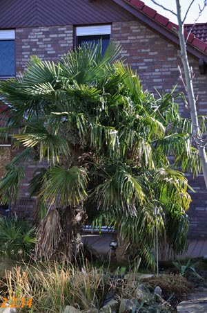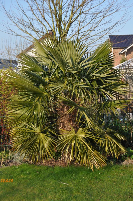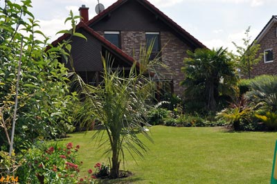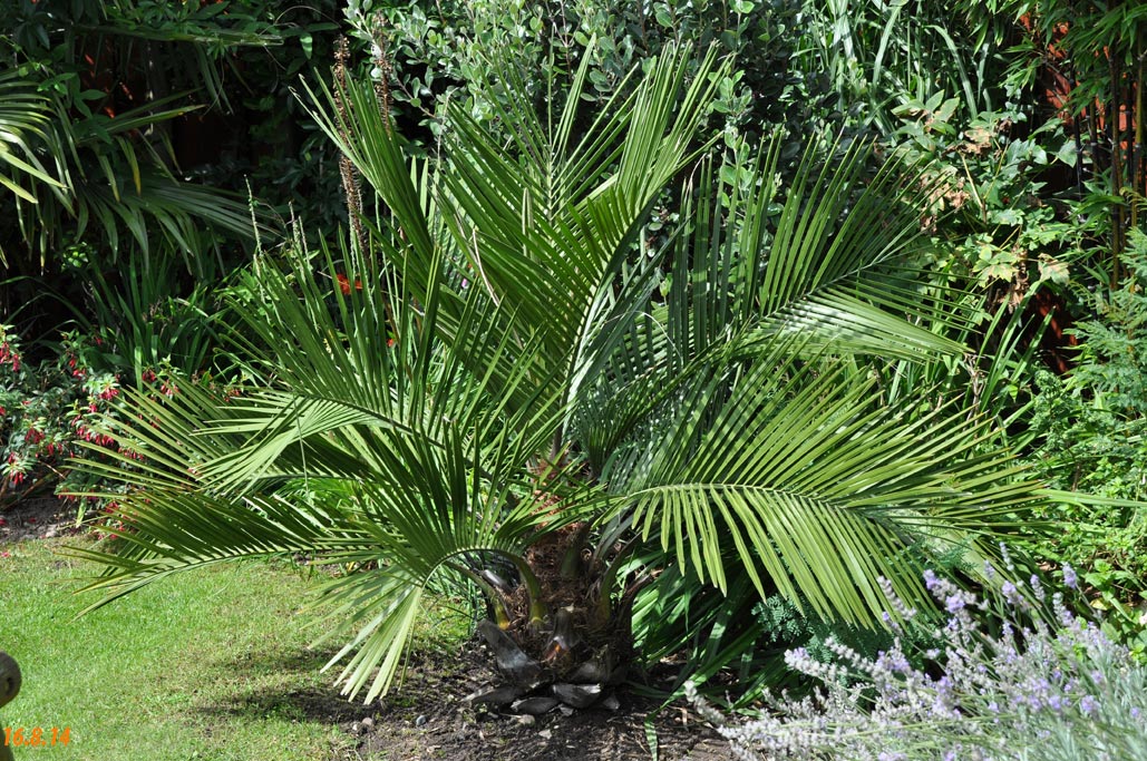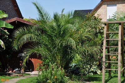 19.5.2014 Traumhaftes Wetter, da ließ Renate (wie sich letztens herausstellte ist unsere Schildkröte ein Weibchen) sich nicht lumpen und genoss ein Sonnenbad. 4.5.14 Heute habe ich die Parajubaea versetzt und dabei gleich noch einige Fotos gemacht. 21.4.14 Es gab zwar letzte Woche noch leichten Nachtfrost, aber das war selbst für die empfindlichsten Pflanzen kaum ein Problem, da es tagsüber bei Sonnenschein wieder knapp an die 20°C ging. Inzwischen blüht es überall im Garten, viel früher als in normalen Jahren, und inzwischen habe ich selbst tropische Palmen, Bananen etc. rausgestellt. 12.3.14 Kein Winter, Temperaturen über 20°C Anfang März.... So darf es jedes Jahr sein. Na ja, bevor es zum WE etwas abkühlen soll noch schnell ein paar aktuelle Fotos. 27.2.2014 Das war der mildeste Winter an den ich mich erinnern kann. Hoffentlich bleibt es dabei - nicht, dass es wie im letzten Jahr im März nochmal richtig kalt wird, denn inzwischen habe ich den Winterschutz komplett abgebaut. Ach ja. die Grünlandtemperatur hat heute den magischen Wert von 200 überschritten, deutlich früher als letztes Jahr. Hier nun einige Bilder von heute - kreuz und quer .... Natürlich sieht es noch ein bisschen wüst aus, die Ränder der Winterschutzhäuser auf dem Rasen, geknickte Blätter vom Zusammenbinden etc. , aber das gibt sich schnell wieder. Endlich sind wieder Palmen statt Winterschutzhäuser zu sehen... Die Bananen, erst vor einigen Tagen ausgepackt, wachsen deutlich sichtbar. Clematis armandii wird wohl schon bald einem Blütenmeer gleichen... Nektarine treibt bereits aus... Albizzia lophantha, die inzwischen aber wohl Paraserianthes lophantha heißt ist immergrün. Bin mal gespannt wie die sich schlägt... Sie soll recht invasiv sein, allerdings denke ich, dass dies in unseren Breiten wohl eher kein Problem sein wird. Bin gespannt, ob sie auch künftige Winter unbeschadet übersteht. Die Baumpaeonie ist bereits voll belaubt und entwickelt erste Blüten. Erythrina crista-galli habe ich letztes Jahr innerhalb des Braheaschutzes ausgepflanzt. Dieser Winter war offensichtlich kein wirklicher Test, denn sie ist nicht einmal komplett eingetrocknet... Citrus x meyeri ist eine wahre Freude seit sie ausgepflanzt ist und liefert täglich frische Zitronen die besser schmecken als alles was man zu kaufen bekommt. Leucospermum glabrum X tottum versuchsweise innerhalb des Phoenixschutzes ausgepflanzt. Dieser Winter war sicher kein Test, aber immerhin hat sie leichte Fröste unbeeindruckt überstanden. Eine andere Leucospermum die im Topf im Washingtoniaschutz stand ist allerdings vertrocknet.Mal sehen, ob sie sich noch erholt. Auch dieser innerhalb des Butiaschutzes ausgepflanzte Callistemon ist ein Versuch. Da es sich um Baumarktware handelt weiß ich leider die Sorte nicht. Dieser Winter war jedenfalls kein Problem.
