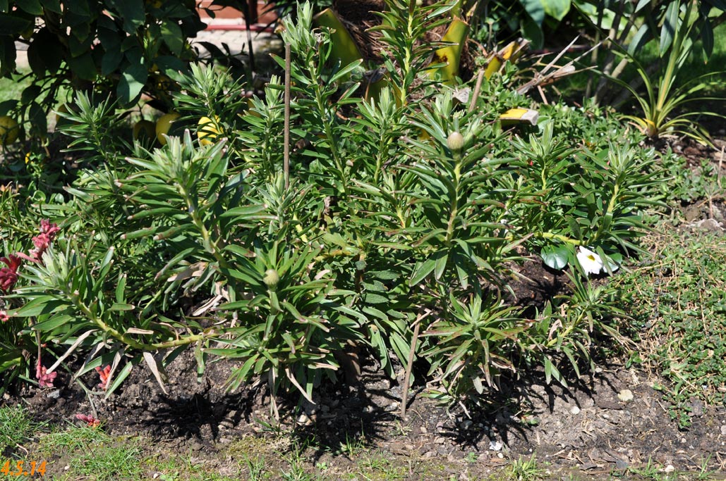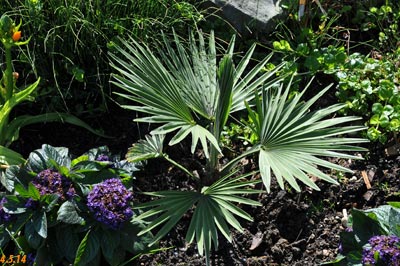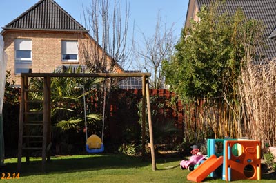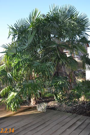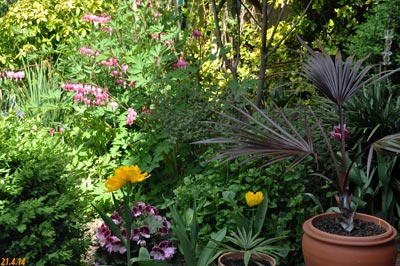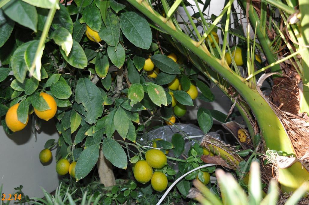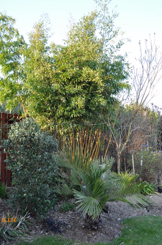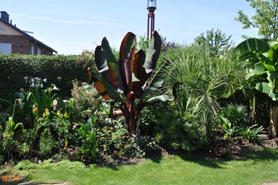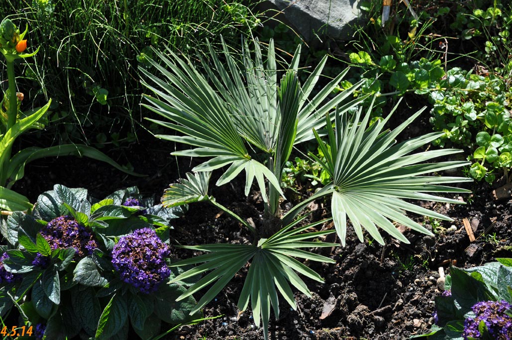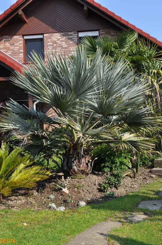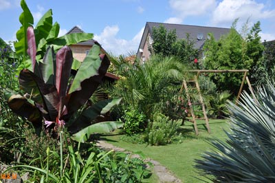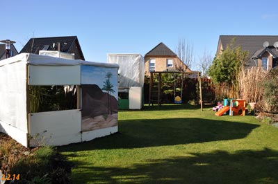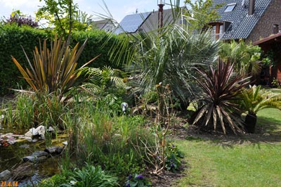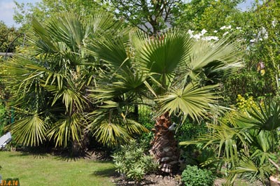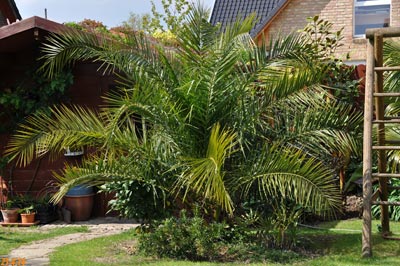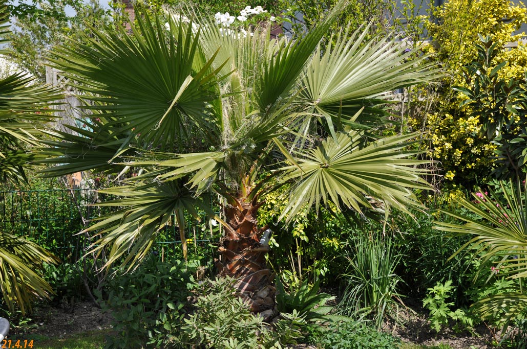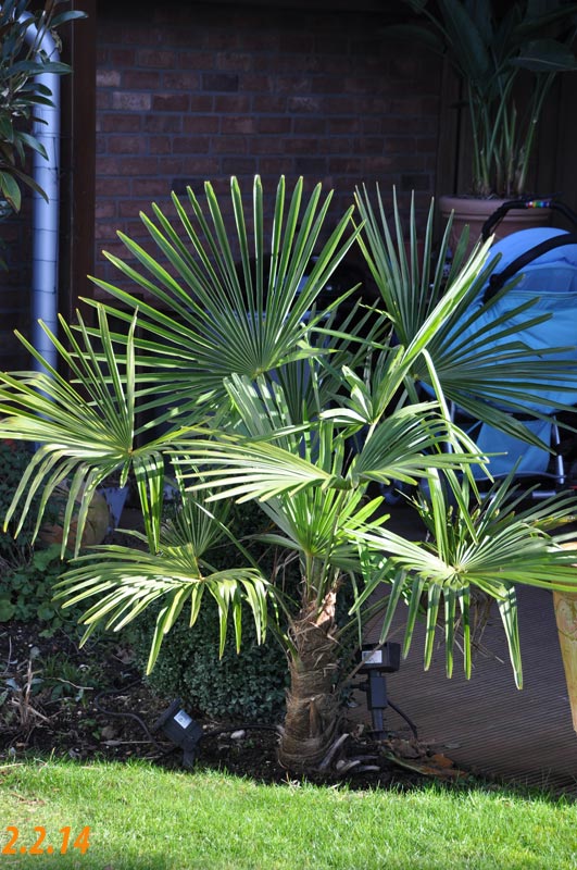 19.5.2014 Traumhaftes Wetter, da ließ Renate (wie sich letztens herausstellte ist unsere Schildkröte ein Weibchen) sich nicht lumpen und genoss ein Sonnenbad. 4.5.14 Heute habe ich die Parajubaea versetzt und dabei gleich noch einige Fotos gemacht. 21.4.14 Es gab zwar letzte Woche noch leichten Nachtfrost, aber das war selbst für die empfindlichsten Pflanzen kaum ein Problem, da es tagsüber bei Sonnenschein wieder knapp an die 20°C ging. Inzwischen blüht es überall im Garten, viel früher als in normalen Jahren, und inzwischen habe ich selbst tropische Palmen, Bananen etc. rausgestellt. 12.3.14 Kein Winter, Temperaturen über 20°C Anfang März.... So darf es jedes Jahr sein. Na ja, bevor es zum WE etwas abkühlen soll noch schnell ein paar aktuelle Fotos. 27.2.2014 Das war der mildeste Winter an den ich mich erinnern kann. Hoffentlich bleibt es dabei - nicht, dass es wie im letzten Jahr im März nochmal richtig kalt wird, denn inzwischen habe ich den Winterschutz komplett abgebaut. Ach ja. die Grünlandtemperatur hat heute den magischen Wert von 200 überschritten, deutlich früher als letztes Jahr. Hier nun einige Bilder von heute - kreuz und quer .... Natürlich sieht es noch ein bisschen wüst aus, die Ränder der Winterschutzhäuser auf dem Rasen, geknickte Blätter vom Zusammenbinden etc. , aber das gibt sich schnell wieder. Endlich sind wieder Palmen statt Winterschutzhäuser zu sehen... Die Bananen, erst vor einigen Tagen ausgepackt, wachsen deutlich sichtbar. Clematis armandii wird wohl schon bald einem Blütenmeer gleichen... Nektarine treibt bereits aus... Albizzia lophantha, die inzwischen aber wohl Paraserianthes lophantha heißt ist immergrün. Bin mal gespannt wie die sich schlägt... Sie soll recht invasiv sein, allerdings denke ich, dass dies in unseren Breiten wohl eher kein Problem sein wird. Bin gespannt, ob sie auch künftige Winter unbeschadet übersteht. Die Baumpaeonie ist bereits voll belaubt und entwickelt erste Blüten. Erythrina crista-galli habe ich letztes Jahr innerhalb des Braheaschutzes ausgepflanzt. Dieser Winter war offensichtlich kein wirklicher Test, denn sie ist nicht einmal komplett eingetrocknet... Citrus x meyeri ist eine wahre Freude seit sie ausgepflanzt ist und liefert täglich frische Zitronen die besser schmecken als alles was man zu kaufen bekommt. Leucospermum glabrum X tottum versuchsweise innerhalb des Phoenixschutzes ausgepflanzt. Dieser Winter war sicher kein Test, aber immerhin hat sie leichte Fröste unbeeindruckt überstanden. Eine andere Leucospermum die im Topf im Washingtoniaschutz stand ist allerdings vertrocknet.Mal sehen, ob sie sich noch erholt. Auch dieser innerhalb des Butiaschutzes ausgepflanzte Callistemon ist ein Versuch. Da es sich um Baumarktware handelt weiß ich leider die Sorte nicht. Dieser Winter war jedenfalls kein Problem.