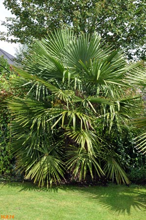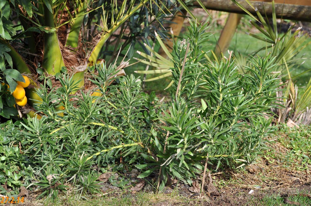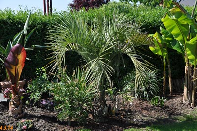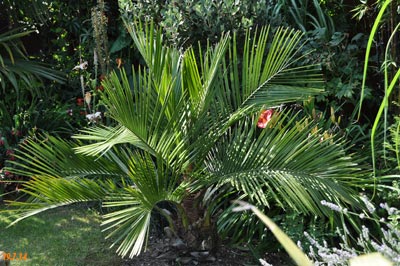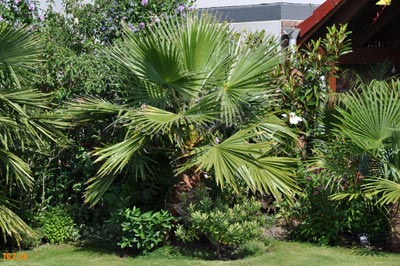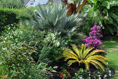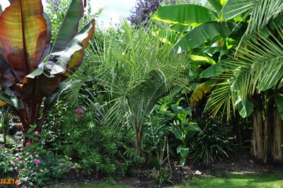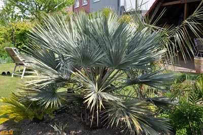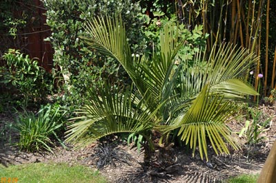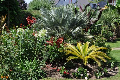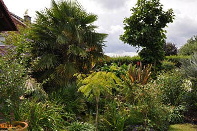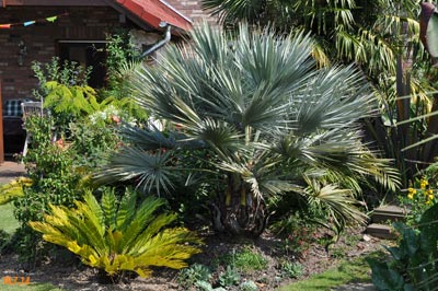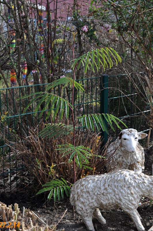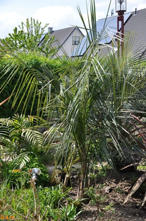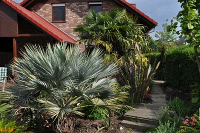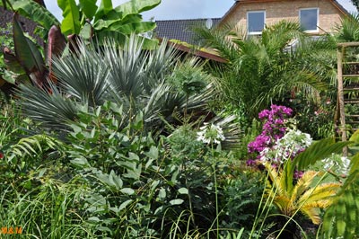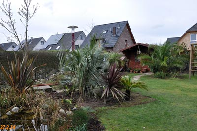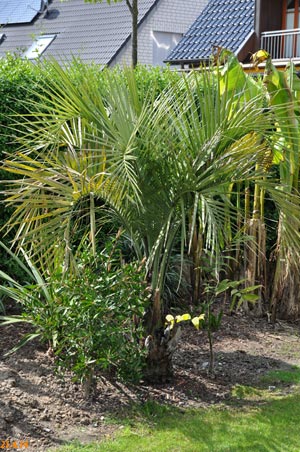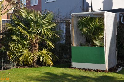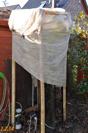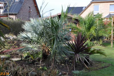 Tja, schön unverpackte Palmen zu sehen, leider funktioniert das aber nicht mit allen Exoten. Obwohl..., bisher wäre diesen Winter kein Schutz nötig gewesen, aber weiß man es vorher? Nun also Bilder der geschützten Pflanzen... Vorne links im Bild das geschützte Brahea-Beet, mit roter Cordy, mehreren Cycadeen, Parajubaea torallyi var. torallyi, Erythrina crista-galli, Sabal domingensis und unzähligen Kübelpflanzen, u.a. dieses Jahr auch zu Testzwecken eine Kentia. Links dahinter der Schutz mit Butia, Oleander, Callistemon, grüner Cordy und Chamaedorea microspadix. Rechts davon der Phoenixschutz mit Serenoa, Oleander, Citrus meyeri und Leucospermum. Rechts im Bild die geschützte Washingtonia robusta mit ausgepflanztem Citrus und diversen Töpfen, u.a. hier auch Leucospermum im Topf sowie einer ausgepflanzten E. maurelii, die allerdings nicht sehr glücklich aussieht. Meine Basjoos habe ich dieses Jahr recht kurz abgesägt und einfach mit einer Plane, dann einer Lage Mulch und noch einer Abdeckplane geschützt. Der Baumfarn Dicksonia antarctica brauchte bisher auch keinen stärkeren Schutz. Bisher habe ich lediglich ein Vlies über die Krone gezogen um ihn vor Unterkühlung durch Abstrahlung zu schützen.
