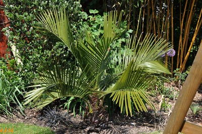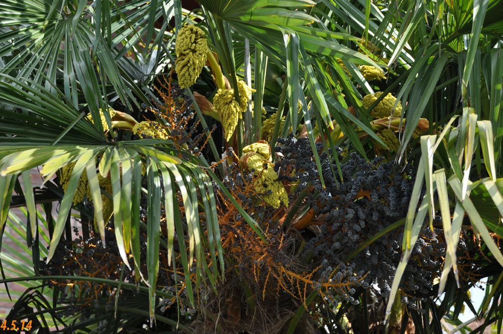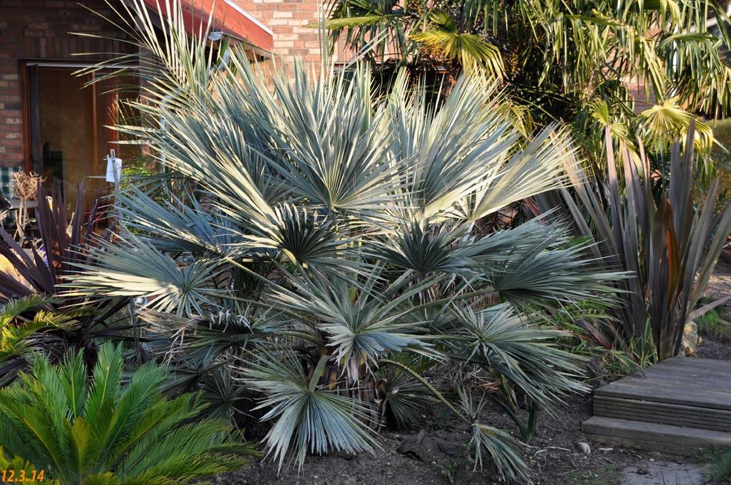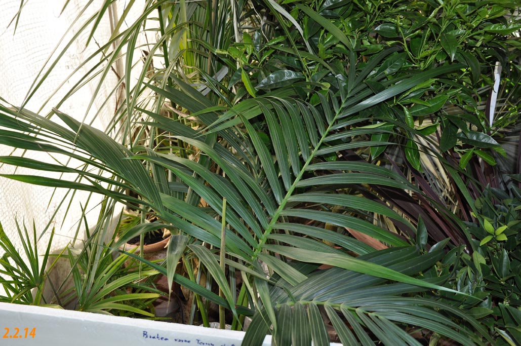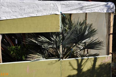 Braheaschutz - Natürlich sind alle Schutzbauten recht großzügig geöffnet, damit die Pflanzen möglichst viel Licht und Frischluft bekommen. Überall sind mehrere Seiten offen, damit ordentlich Wind durchpusten kann. Links im Bild ist die Kentia im Winterschutz zu sehen. Bisher kein Kratzer zu sehen.Allerdings war hier bisher kein Winter und auch ohne Heizung wurde es innerhalb des Braheaschutzes nicht sehr kalt. Die Tiefsttemperatur lag nur bei -1,9°C. Immerhin aber interessant zu sehen, dass die Kentia durchaus mit Temperaturen im einstelligen Bereich dauerhaft zurecht zu kommen scheint. Im Phoenixschutz färben sich die Früchte der C. x meyeri ... Lecker!!!!