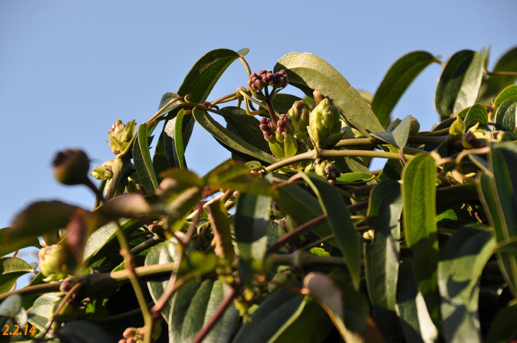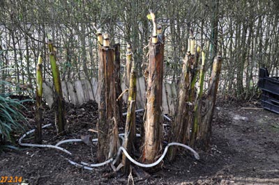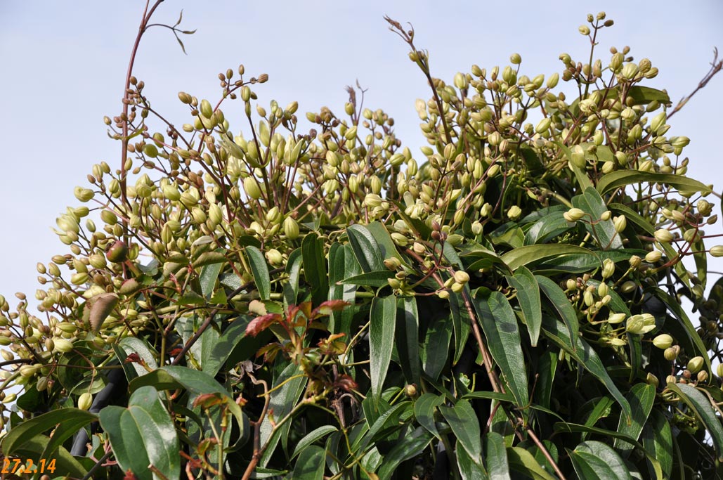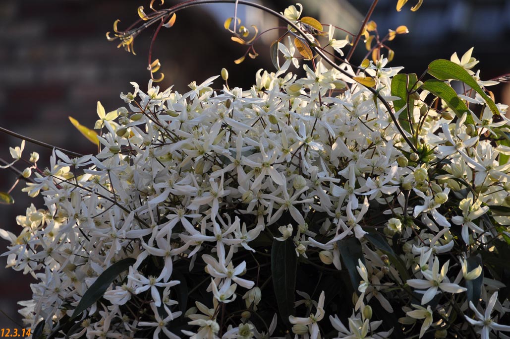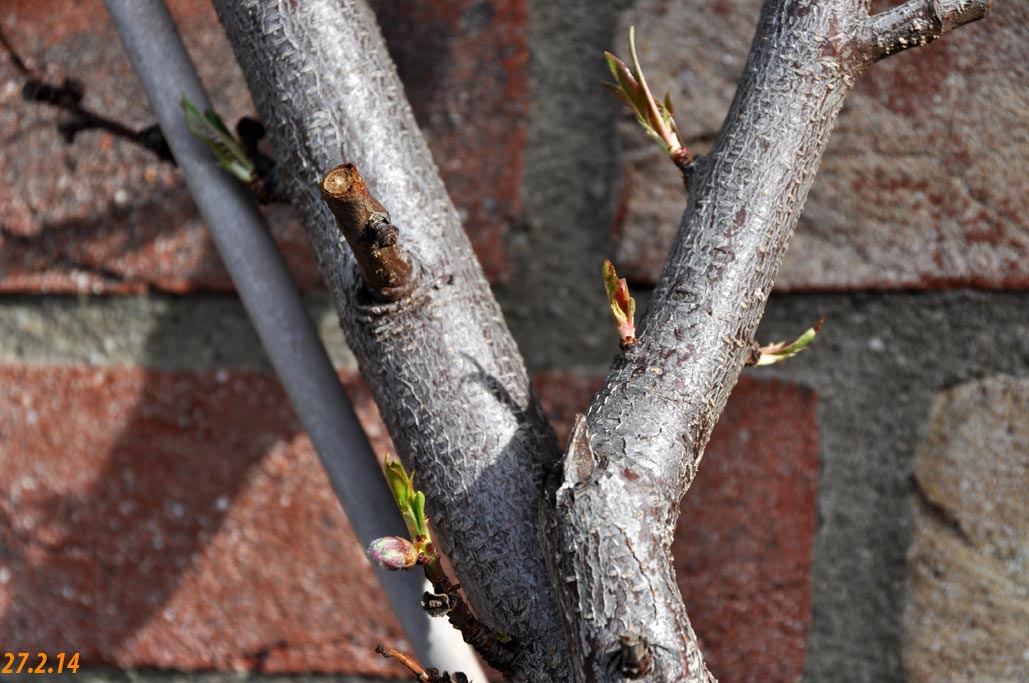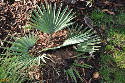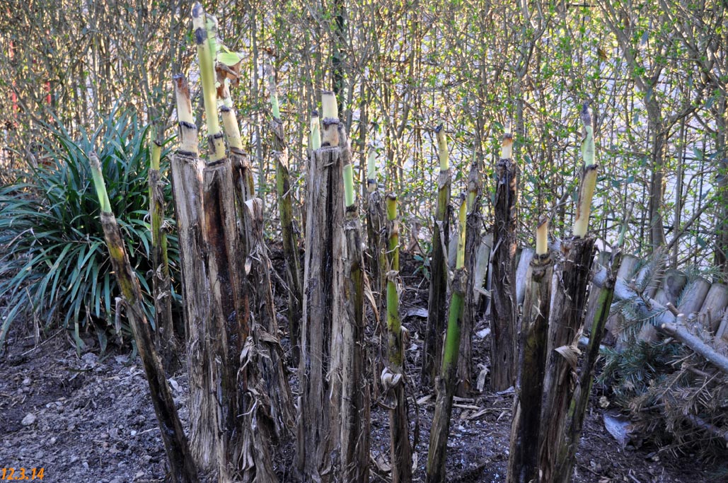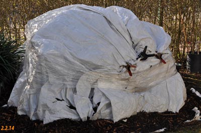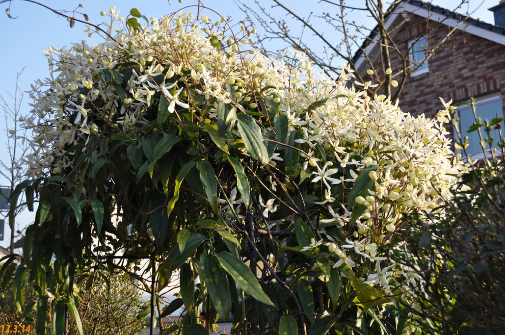 2.2.14 Der bisherige Winter war keiner. Die Tiefsttemperatur im Dezember lag bei -3,2°C und die diesjährige bei -2,6°C, So etwas kommt auch nicht oft vor. Mir soll es recht sein und es kann gerne dabei bleiben. Vielen Pflanzen würde ein solch milder Winter mal richtig gut tun. Vieles im Garten treibt bereits aus, die Vegetation ist etwa einen Monat früher dran als sonst üblich. Ein später Kälteeinbruch hätte nun sicher ziemlich schlimme Folgen. Auch heute hatten wir einen wunderschönen milden Tag bei knapp über 10°C und strahlend blauem Himmel. Da würde man am liebsten sofort sämtliche Winterschutzhäuser sofort abbauen, aber ich denke, dieses Risiko sollte man vernünftiger Weise nicht eingehen, auch wenn selbst in der 14-Tage -Vorschau keinerlei frostige Temperaturen zu sehen sind. Wie wir voriges Jahr gesehen haben, kann es selbst im März noch ordentlich kalt werden und dann würde man sich über den bereits abgebauten Winterschutz gehörig ärgern. Einige Bilder von heute: T. princeps dick gemulcht. Wäre bisher nicht nötig gewesen... Clematis armandii kann sich nicht mehr zurückhalten - hoffentlich kommt kein Frost mehr...