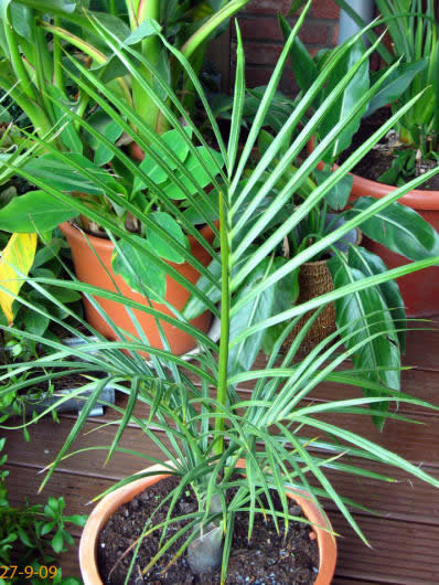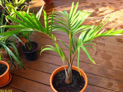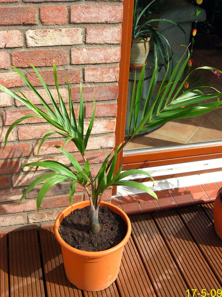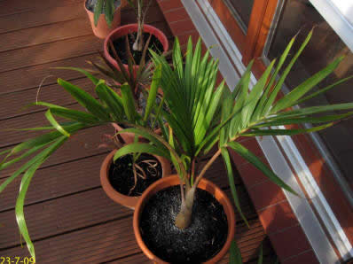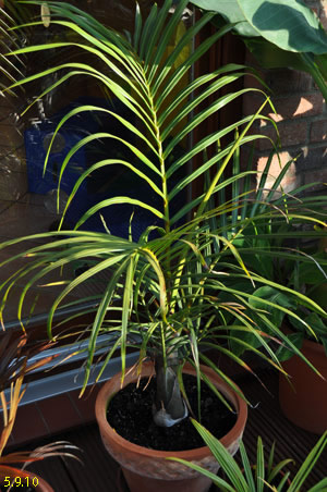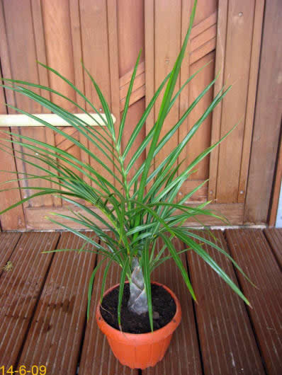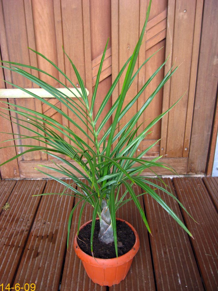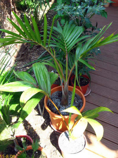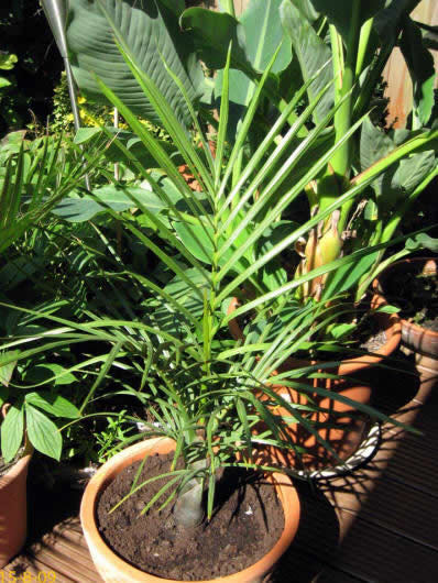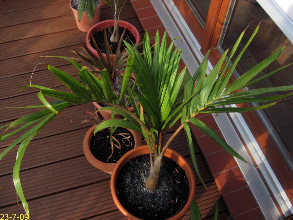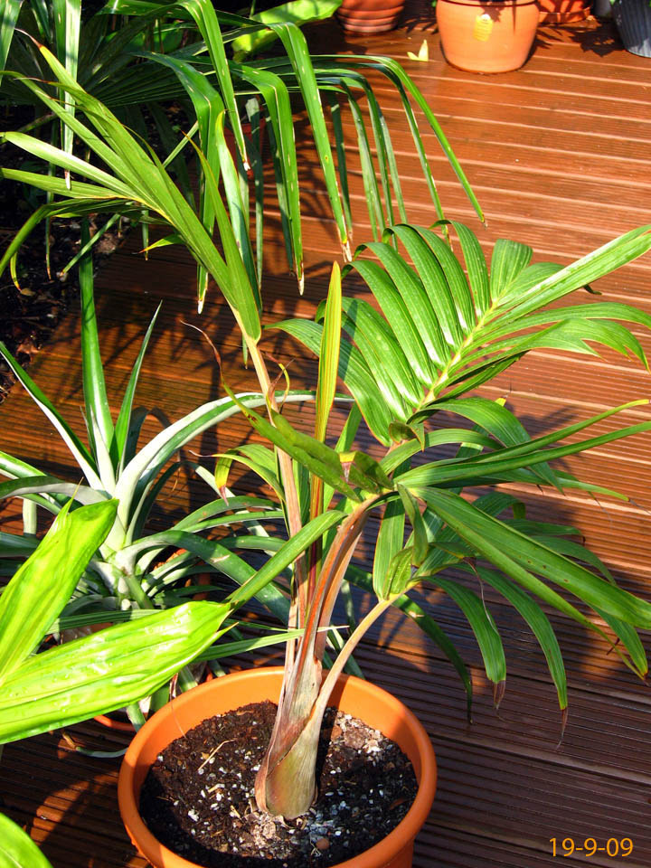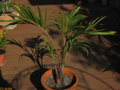 HyophorbeHyophorbe verschaffeltii (H.Wendl.) SpindelpalmeDiese von Rodriguez lsland (Maskarenen) stammende Fiederpalme ist in der Natur akut vom Aussterben bedroht, während sie sich in Kultur immer größerer Beliebtheit erfreut. Als Jungpflanze bildet sie sehr schöne gelb und violett gestreifte Blätter. Obwohl sie kurzfristig Temperaturen um den Gefrierpunkt vertragen soll, sollte die Durchschnittstemperatur nicht unter etwa 20°C liegen. Sie wächst recht zügig und benötigt einen hellen Standort und verträgt bei mir auch volle Sonne, obwohl sie als Jungpflanze eher halbschattig stehen sollte. Sie bevorzugt leicht alkalisches Substrat, welches gut wasserdurchlässig sein sollte. Nähere Infos unter: http://de.wikipedia.org/wiki/Spindelpalme oder auch: http://www.pacsoa.org.au/palms/Hyophorbe/verschaffeltii.html