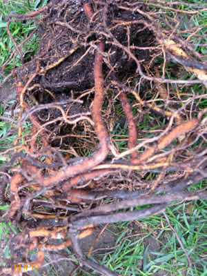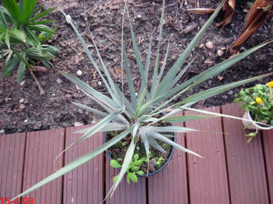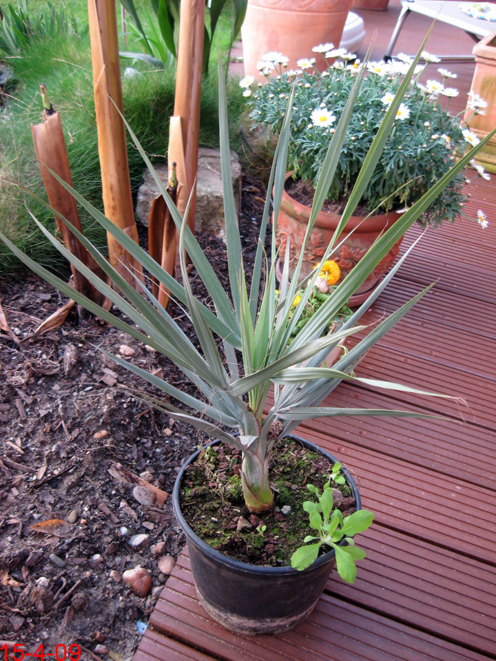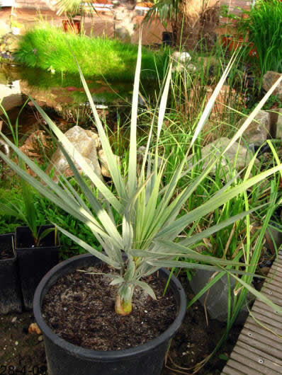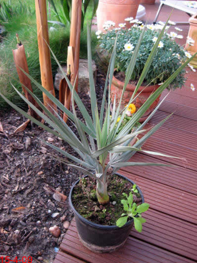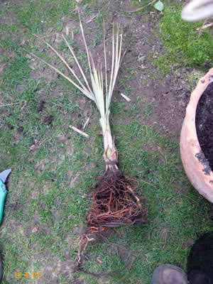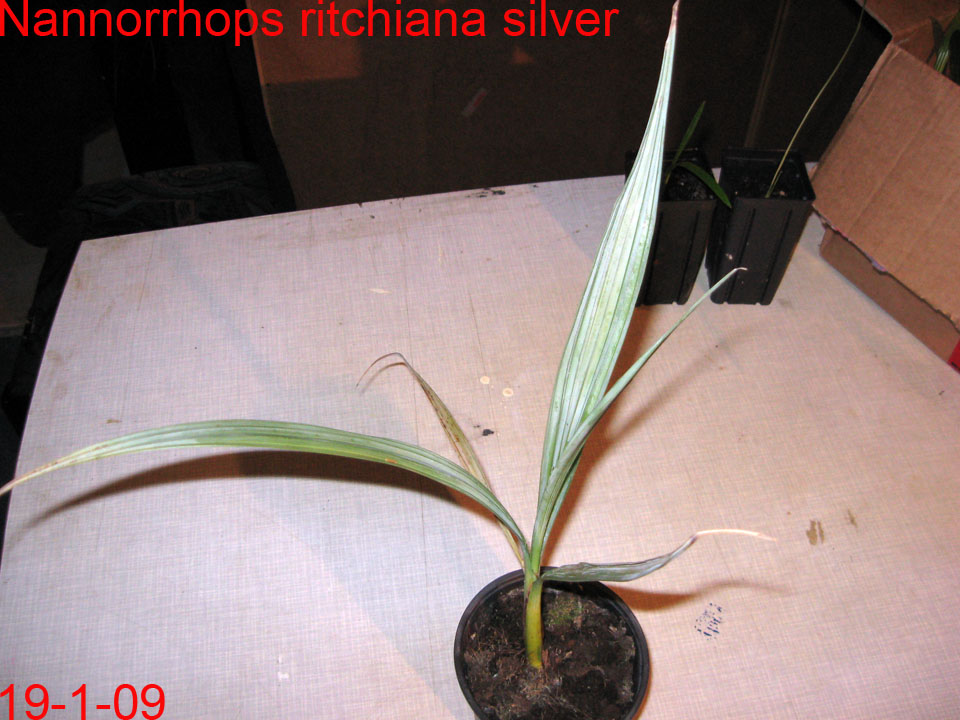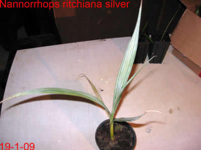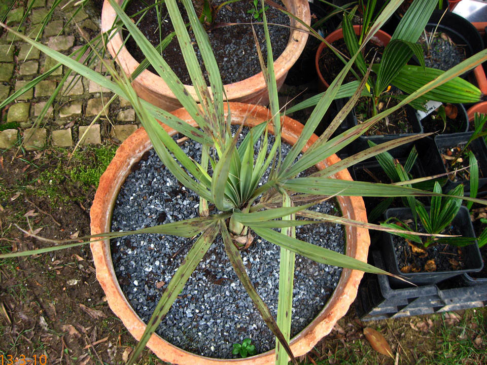 Nannorrhops ritchieanadiese Ausläufer treibende, niedrig wachsende Fächerpalme stammt aus dem östlichen Afghanistan, Iran, Pakistan und Arabien, wo es im Sommer sehr heiß, im Winter dagegen sehr kalt werden kann. Sie kommt dort immer an sehr steinigen und in nährstoffarmen Böden vor. Nannorrhops ritchieana "silver" oder var. "Stocksiana "ob es sich hierbei um eine eigene Art, oder lediglich um eine Variation der o.g. Nannorrhops handelt ist noch nicht ganz klar. Die silberne Form mit ihren viel helleren Blättern kommt im Iran, Südpakistan und im Oman vor. Ihre Frosthärte liegt wesentlich unter der der grünen Nannorhops und sie verträgt winterliche Nässe noch weitaus schlechter. 2010Enttäuschendes Bild nach dem Winter, den die Nannorhops im Winterschutz der Phoenix verbracht hat. Dort stand sie trocken und wurde bereits ab -3°C, später -4°C beheizt. Dennoch hat sie jede Menge Blattflecken. Nach und nach vertrockneten nun die bereits beschädigten Blätter, so dass nicht viel von der Palme übrig blieb. Die Wurzeln weisen auf Schäden hin, der untere Teil der Wurzeln scheint erfroren zu sein - bei nicht mehr als max. -4°C!